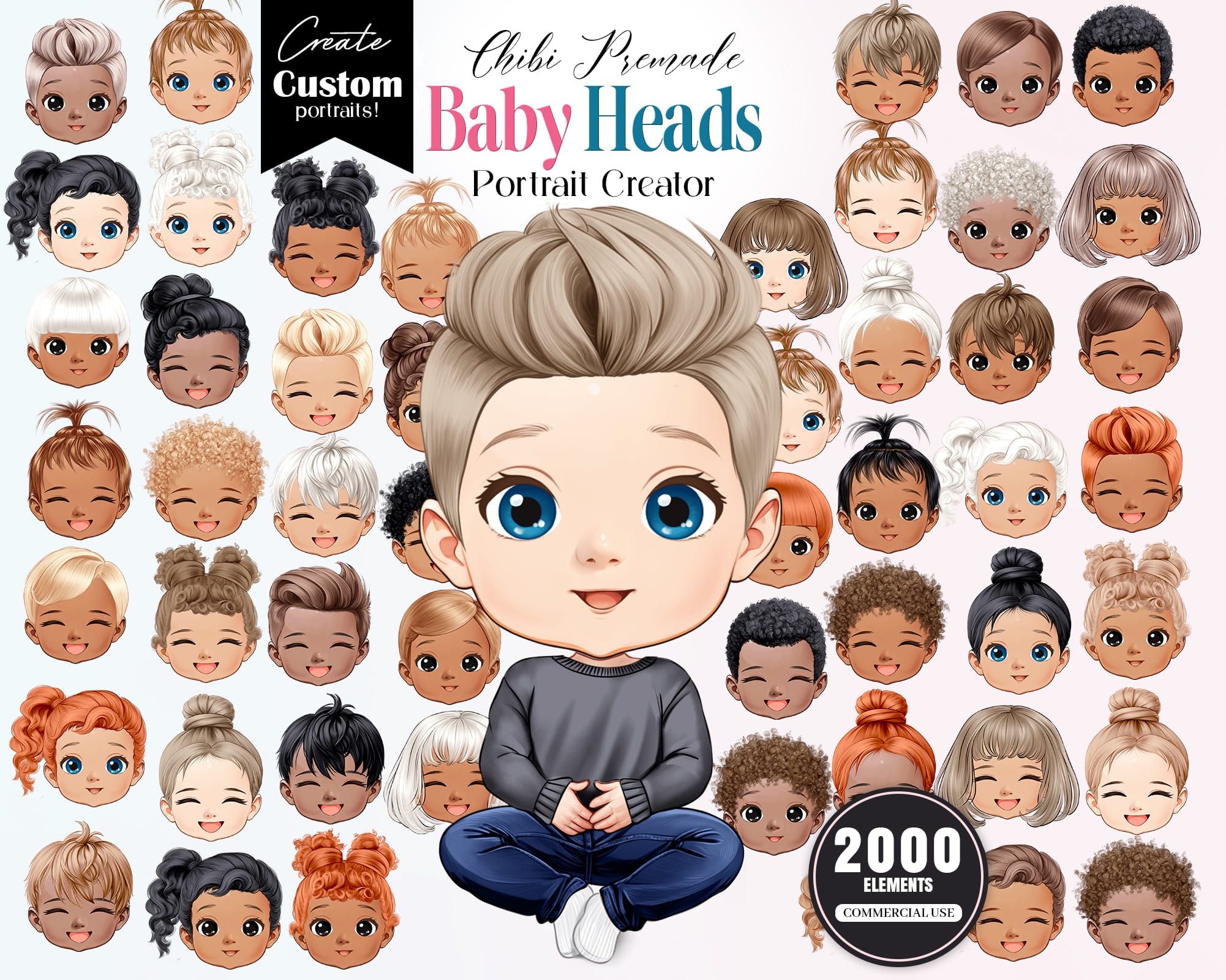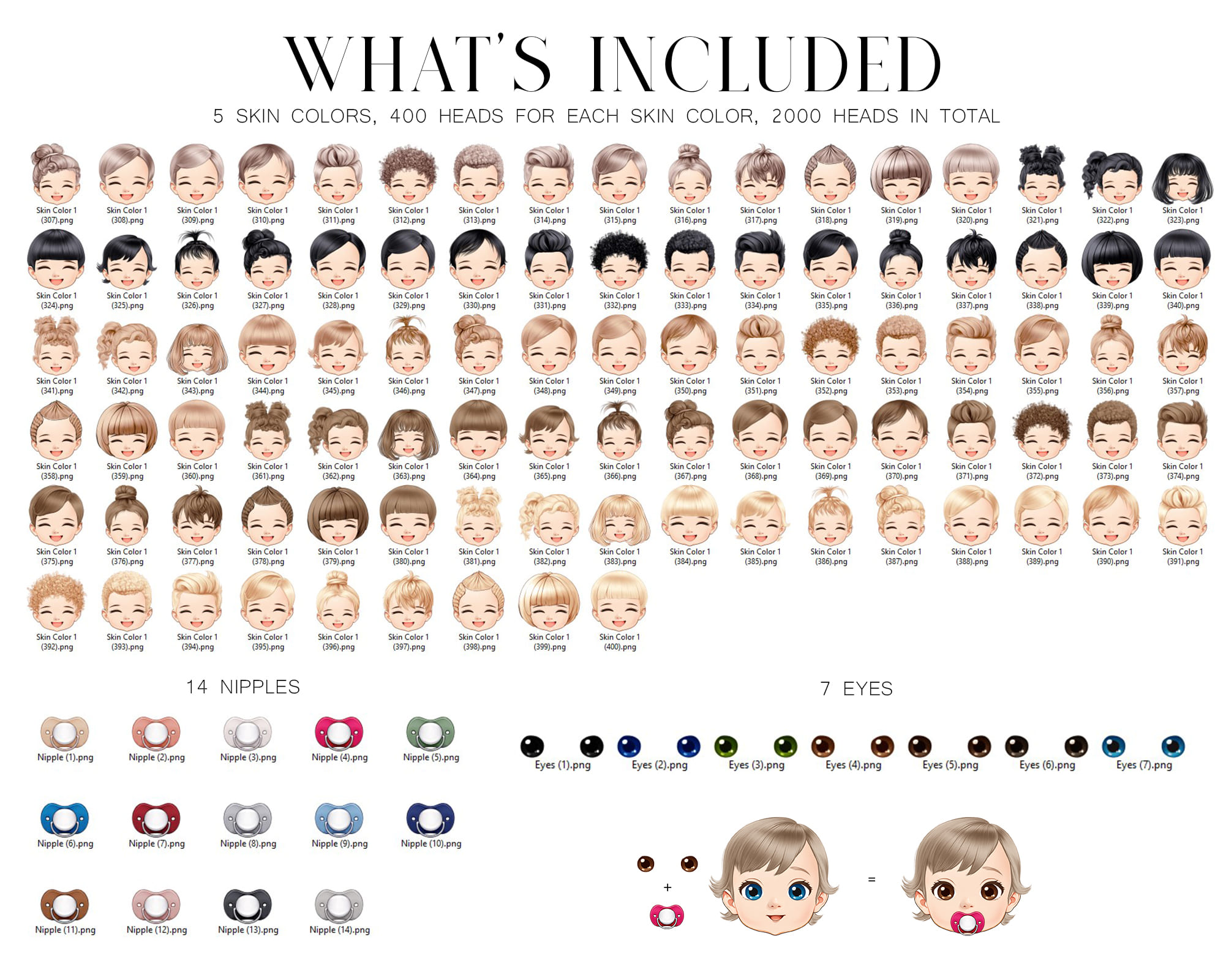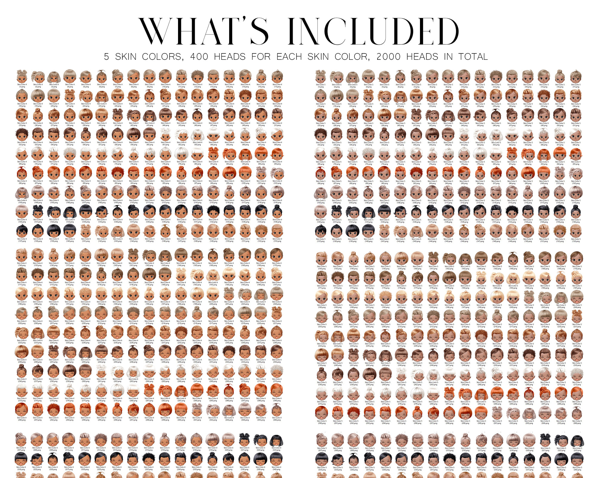 This pack includes 2000 baby heads, 5 skin tones, multiple hairstyles, facial expressions, eyes, and accessories. Perfect for personalized portraits, family illustrations, stickers, invitations, nursery prints, scrapbooking, and more.