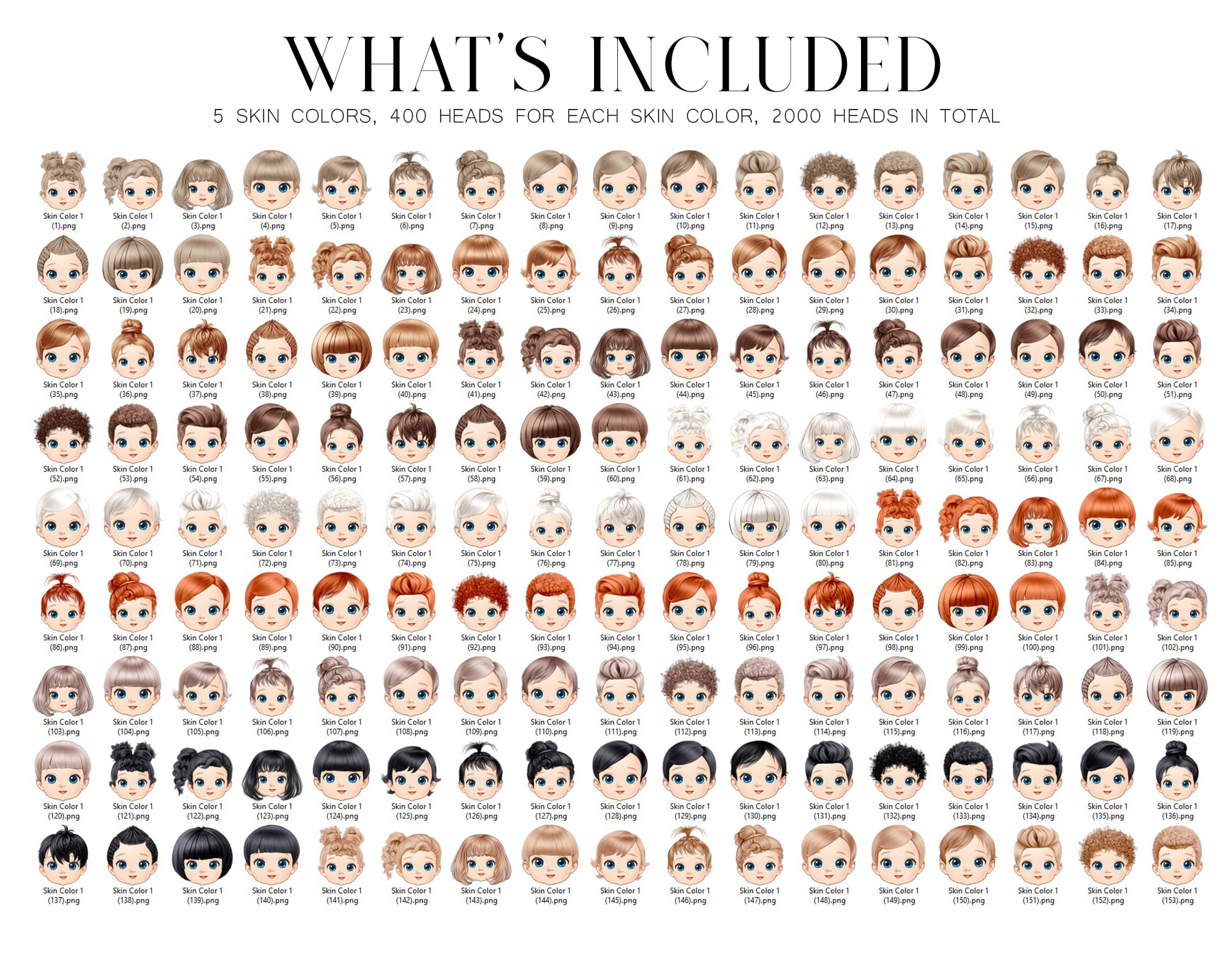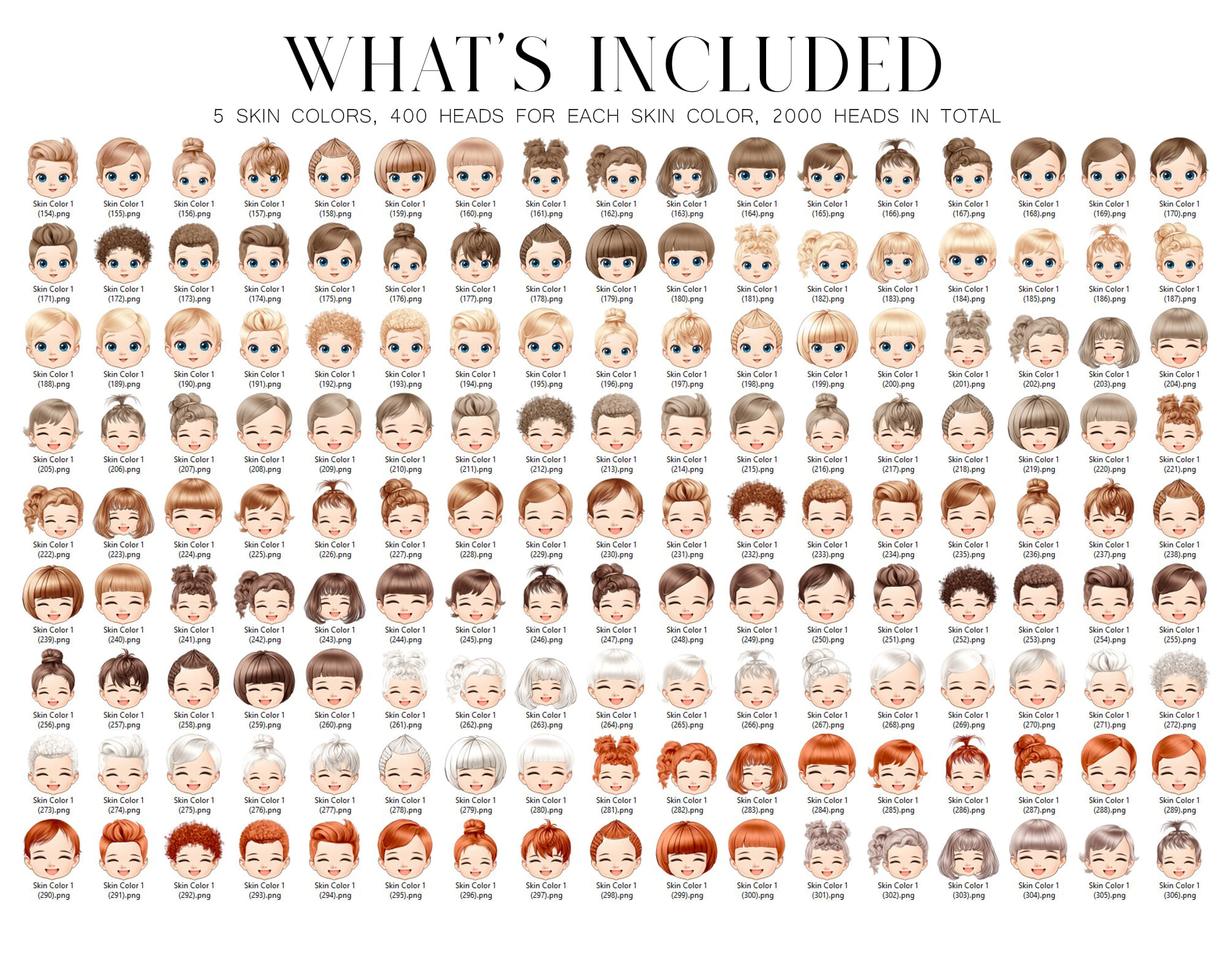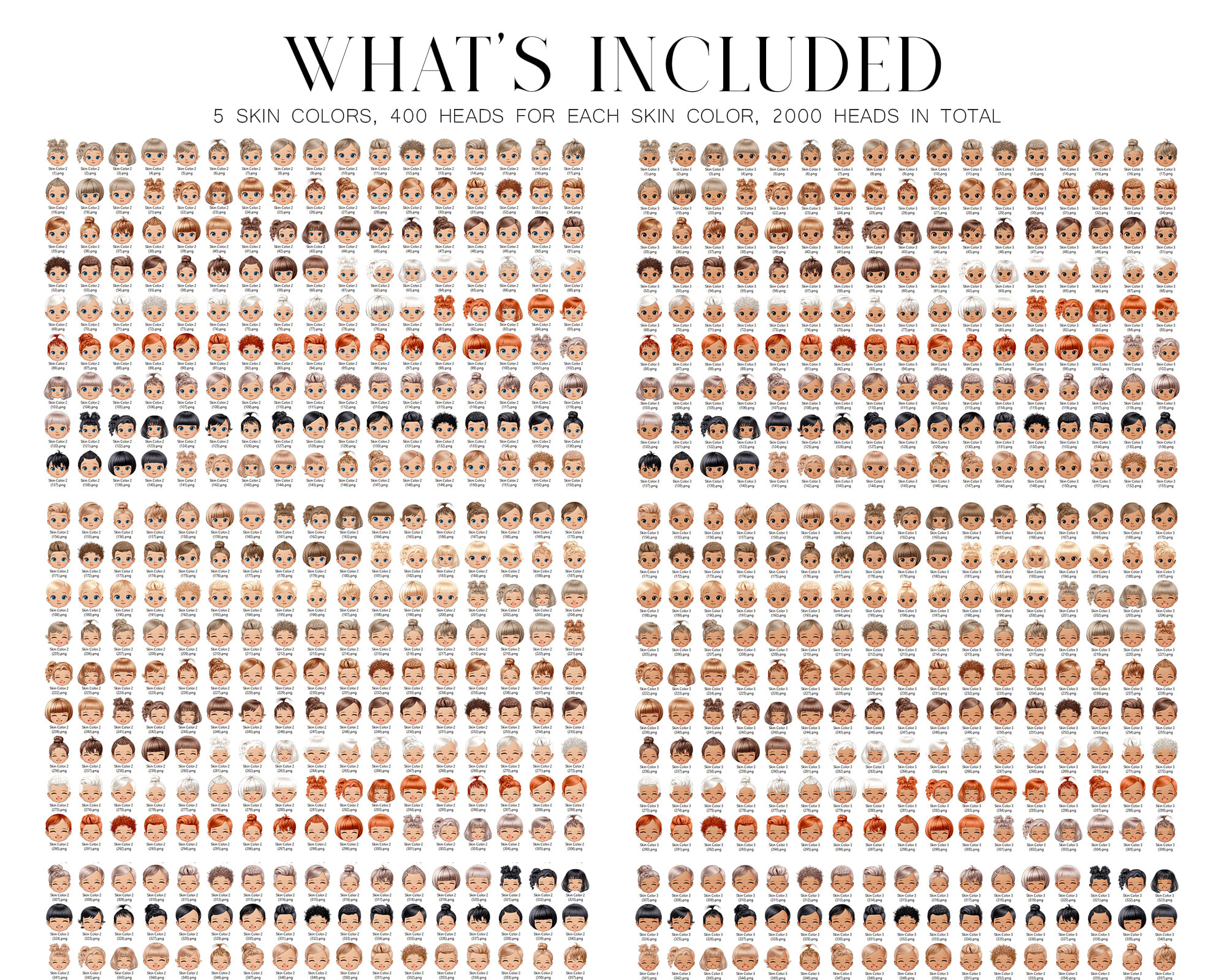 This pack includes 2000 baby heads, 5 skin tones, multiple hairstyles, facial expressions, eyes, and accessories. Perfect for personalized portraits, family illustrations, stickers, invitations, nursery prints, scrapbooking, and more.