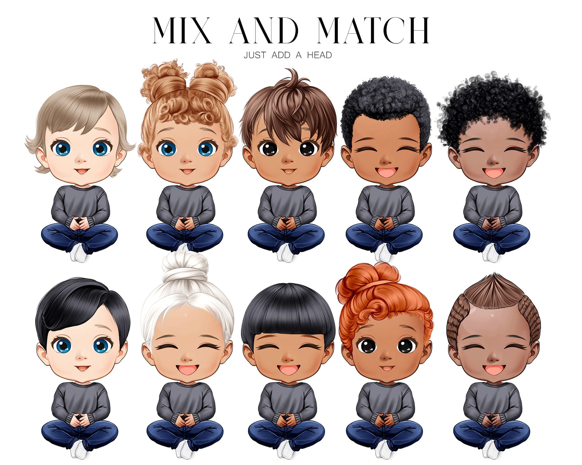 Create adorable custom portraits with this Chibi Baby Heads Clipart Set — a huge portrait-creator addon designed for building unique children’s illustrations.