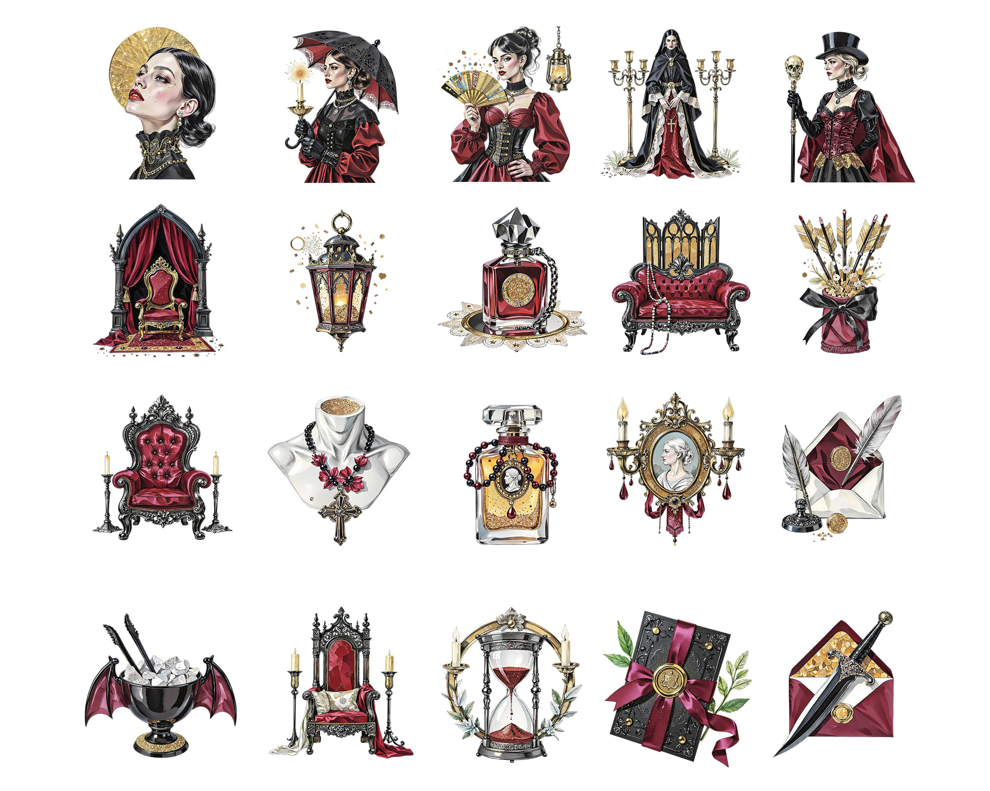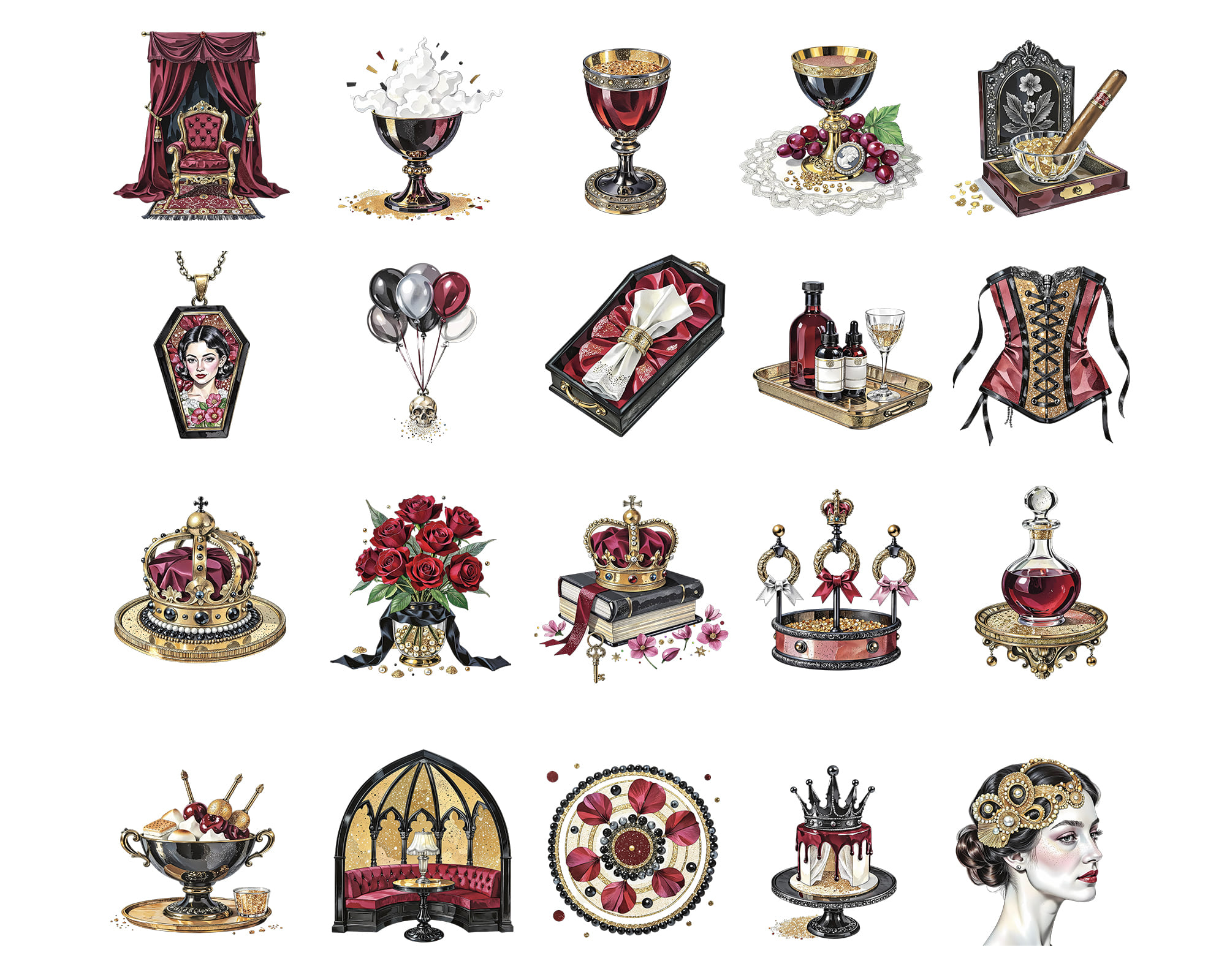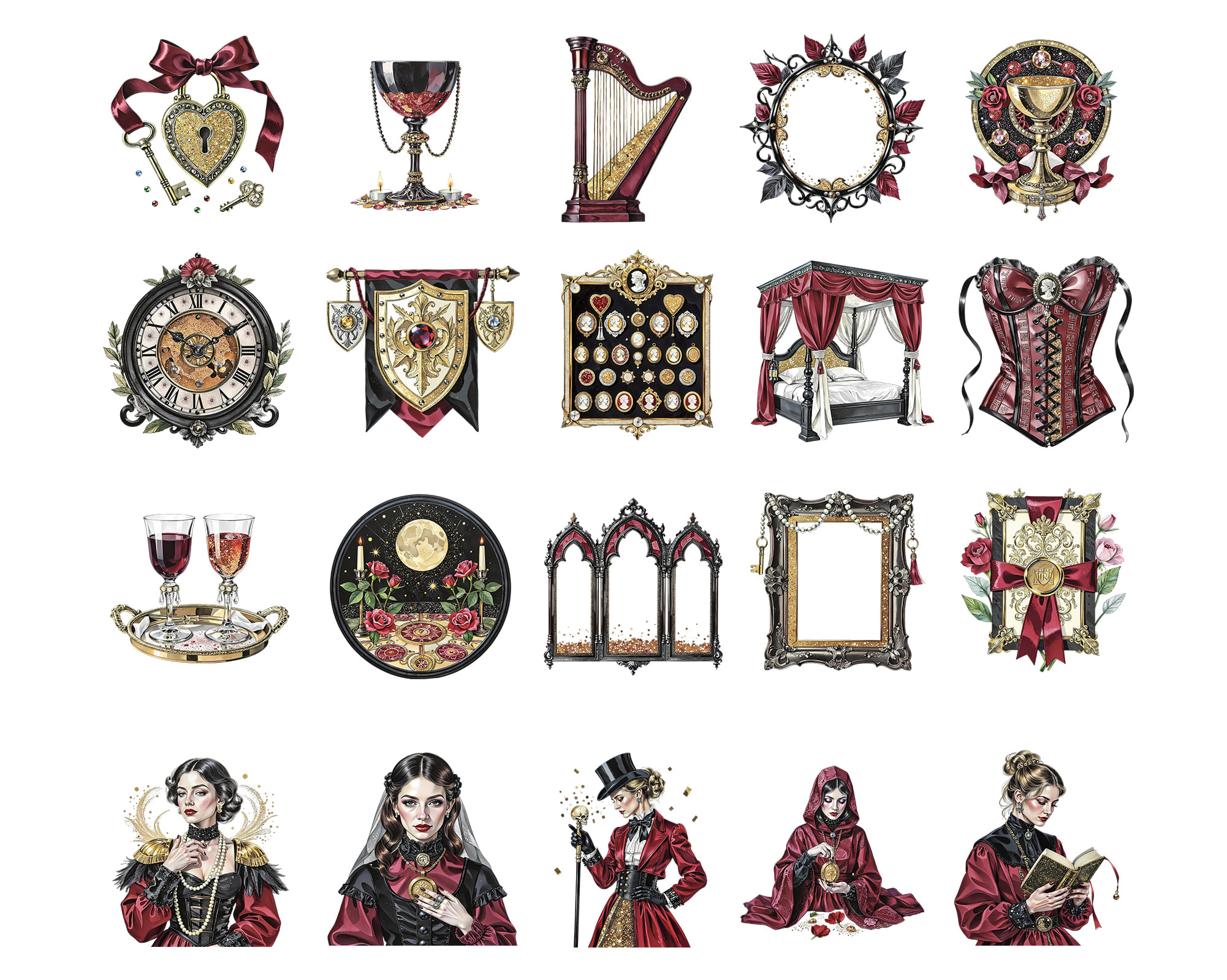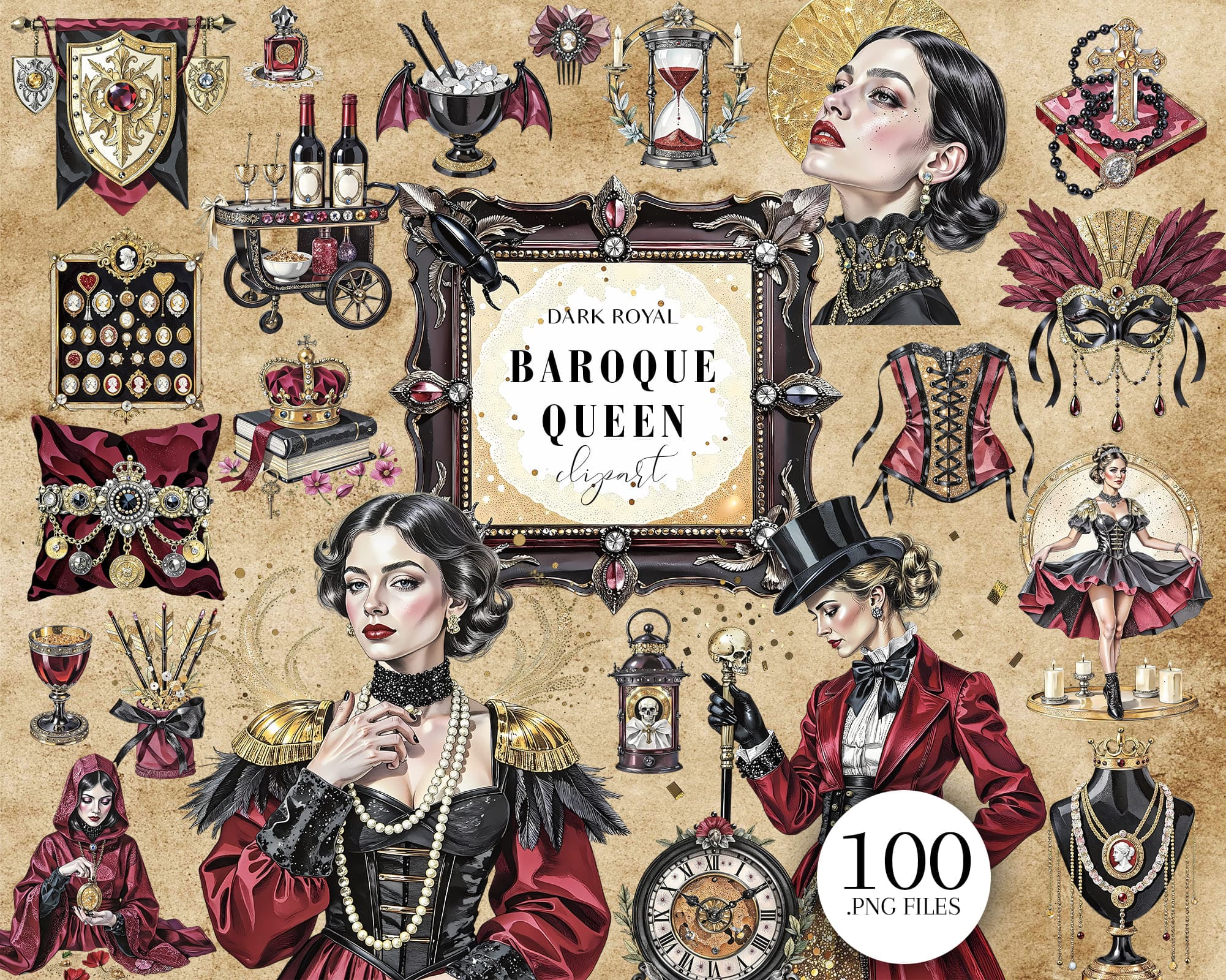 A richly detailed baroque-inspired clipart set featuring royal women, corsets, crowns, vintage jewelry, ballroom fashion, gold frames, banners, shields, accessories, wine goblets, velvet cushions, ornate clocks, and theatrical elements. Created for artists, designers, and crafters seeking elegant, historical, dramatic aesthetics.