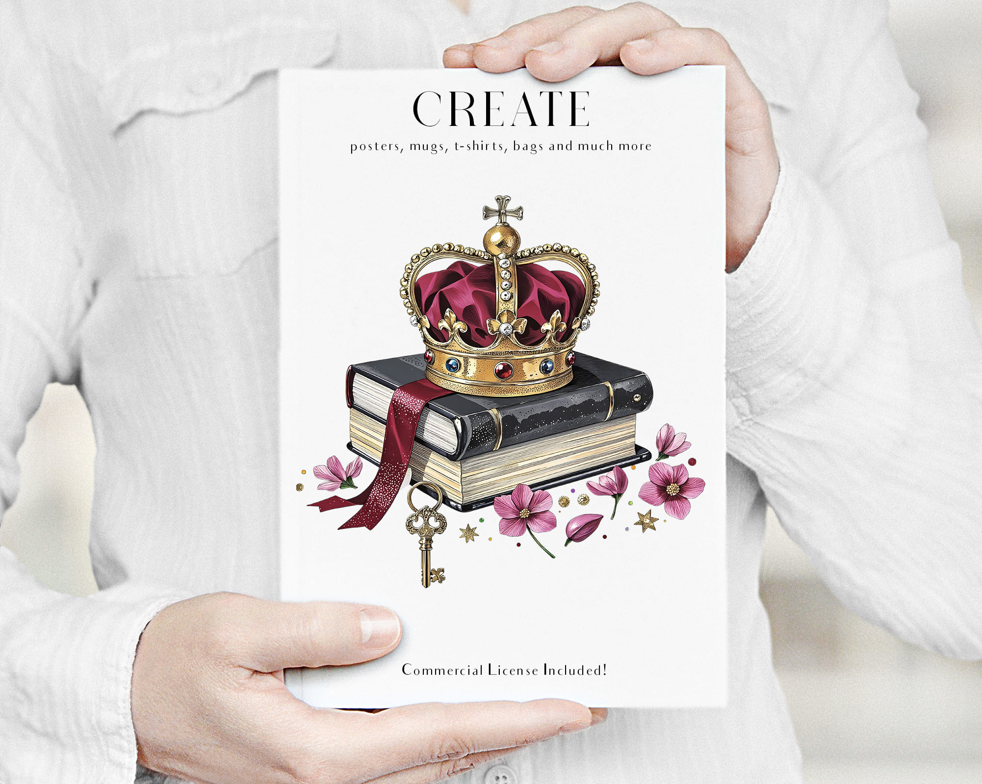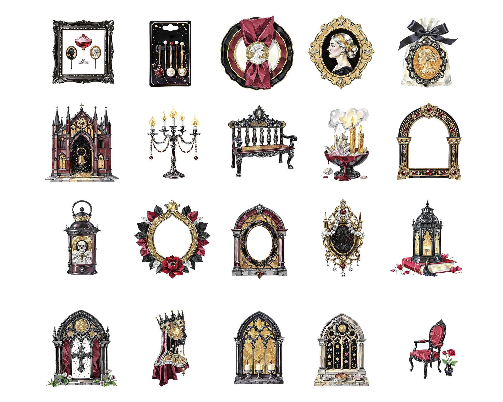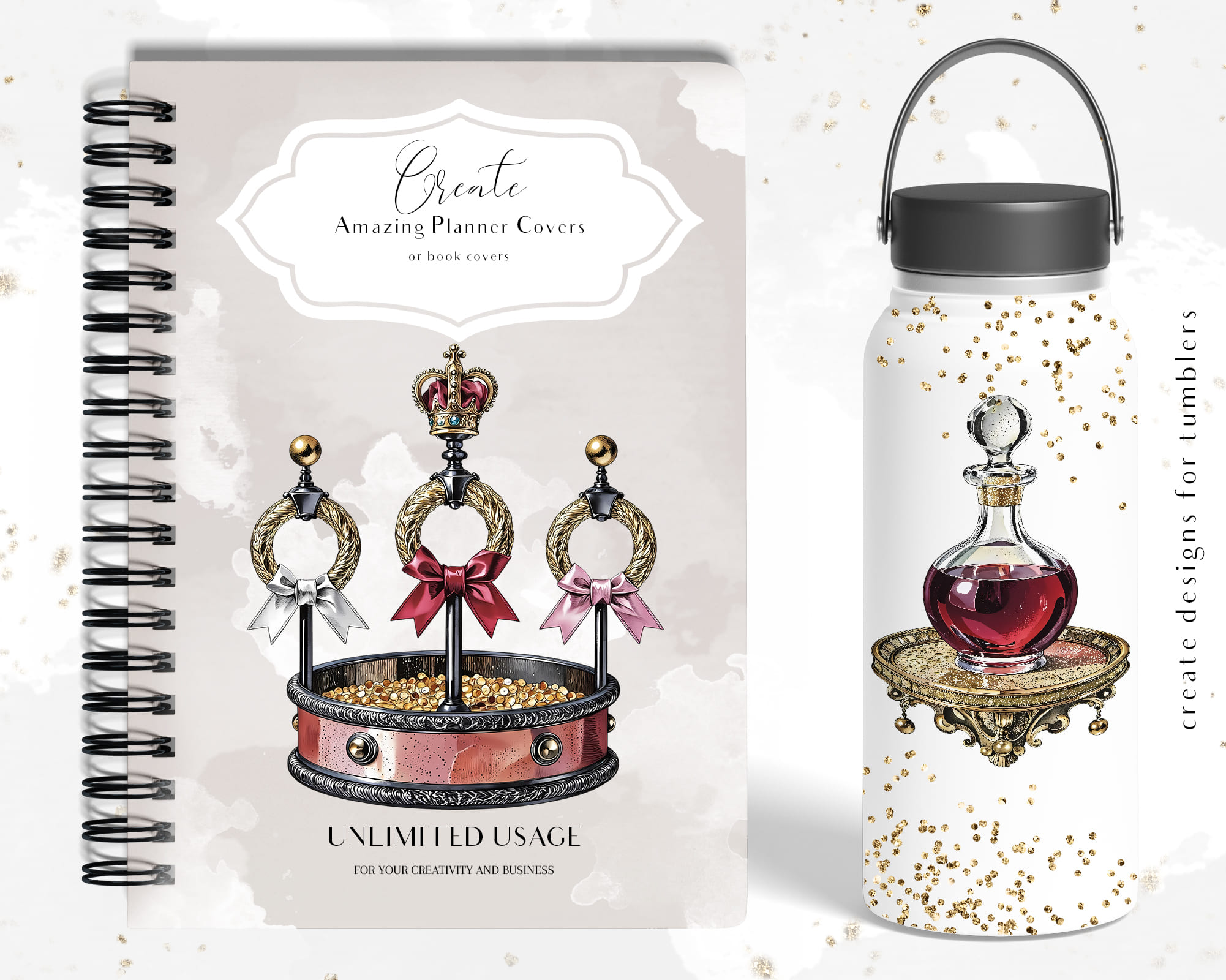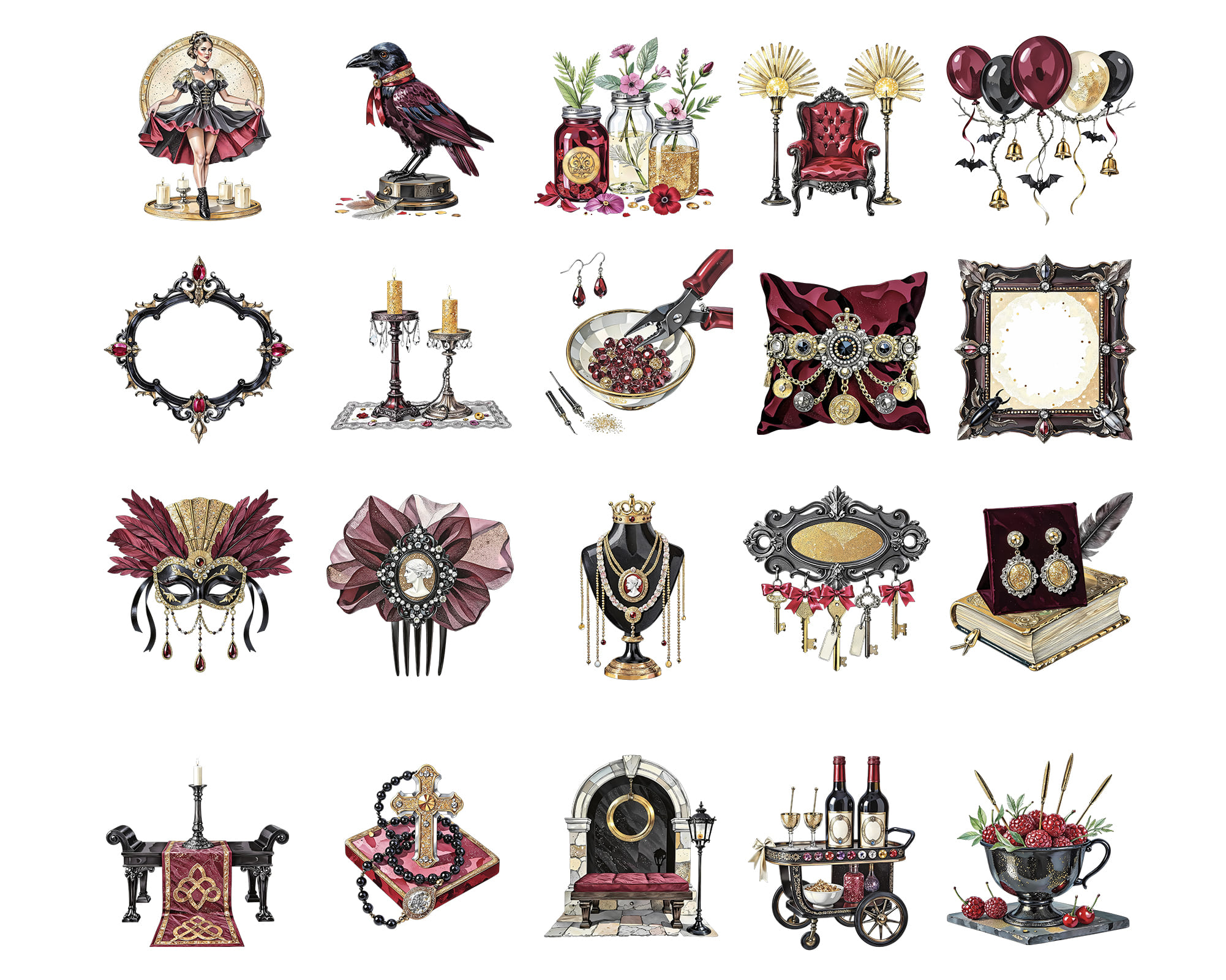 A richly detailed baroque-inspired clipart set featuring royal women, corsets, crowns, vintage jewelry, ballroom fashion, gold frames, banners, shields, accessories, wine goblets, velvet cushions, ornate clocks, and theatrical elements. Created for artists, designers, and crafters seeking elegant, historical, dramatic aesthetics.
