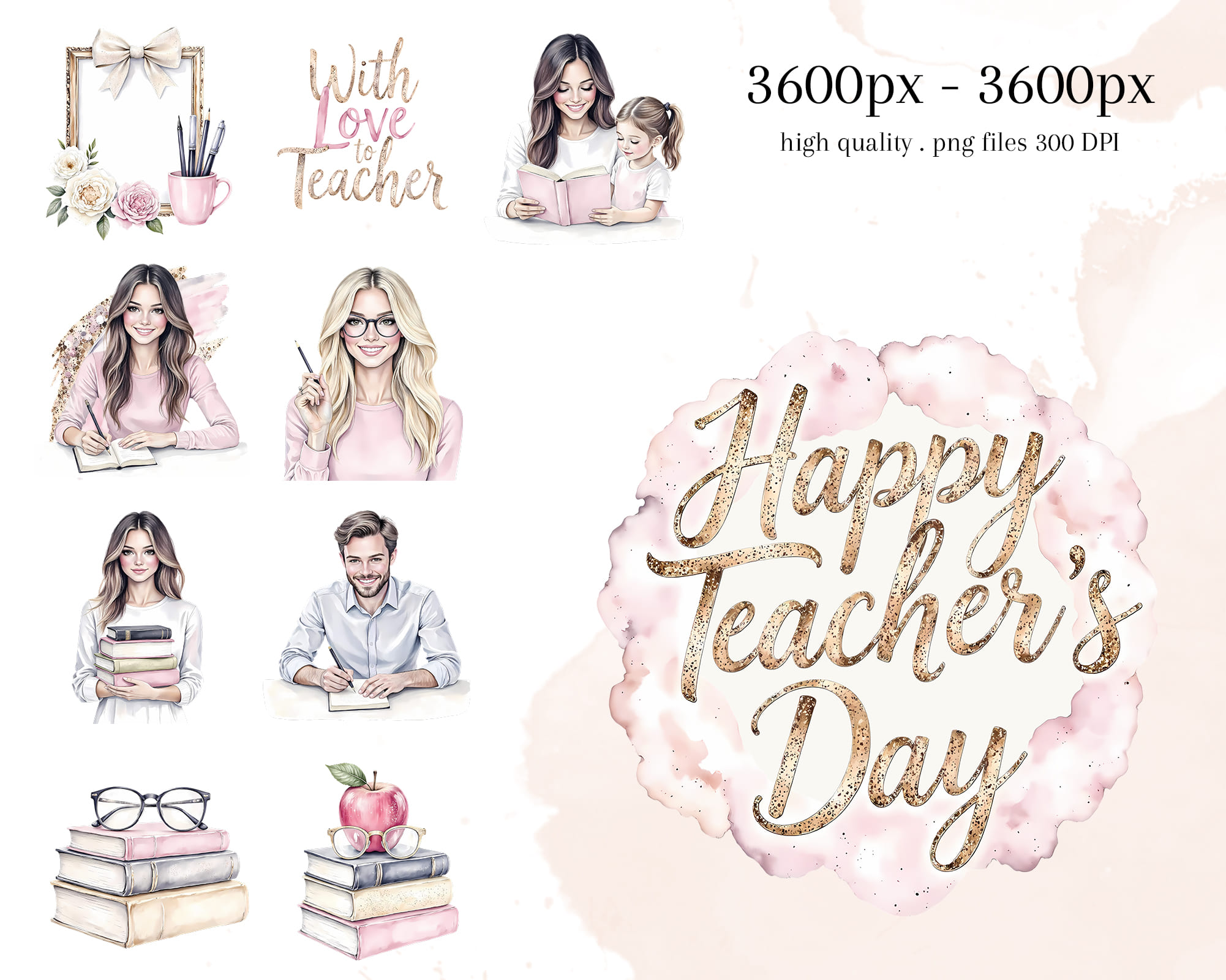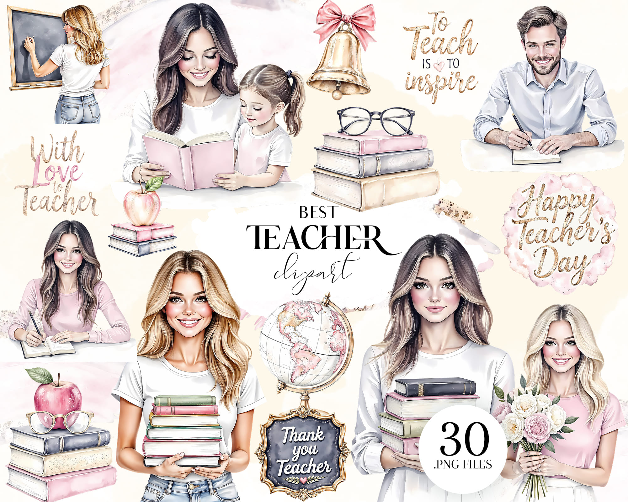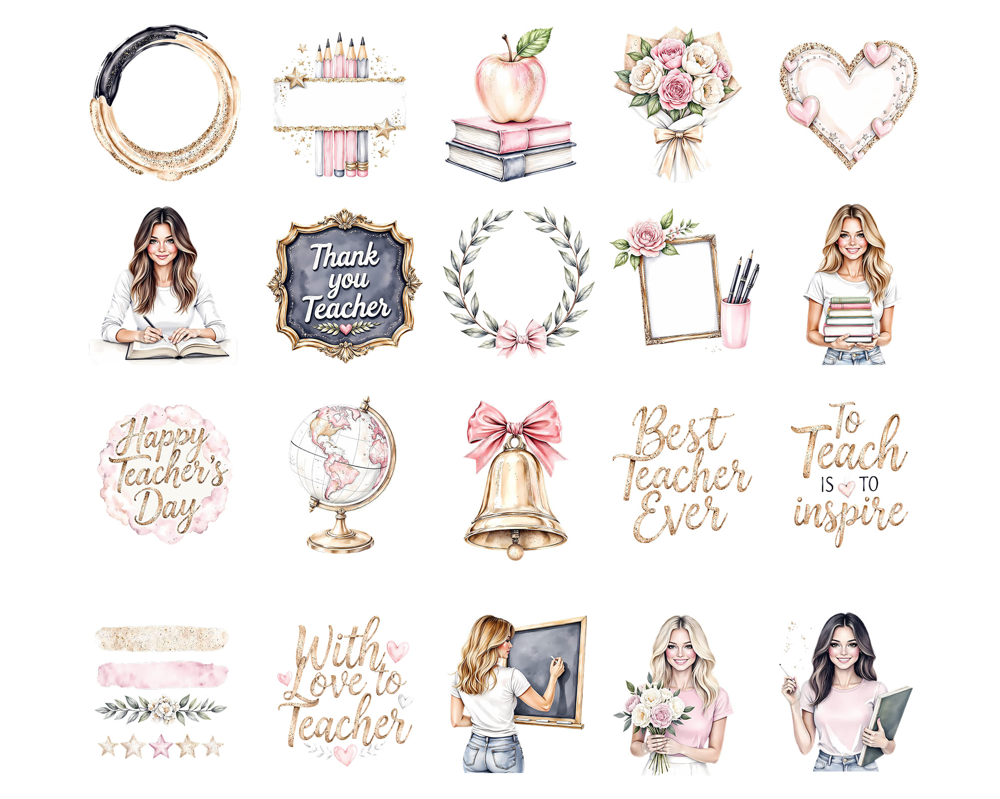 Celebrate your favorite teacher with this elegant pastel clipart collection! Featuring books, flowers, thank-you quotes, and a stylish female teacher illustration, this set is perfect for teacher appreciation cards, classroom posters, planners, and gift tags. Includes 30 PNG files with transparent backgrounds for creative projects.