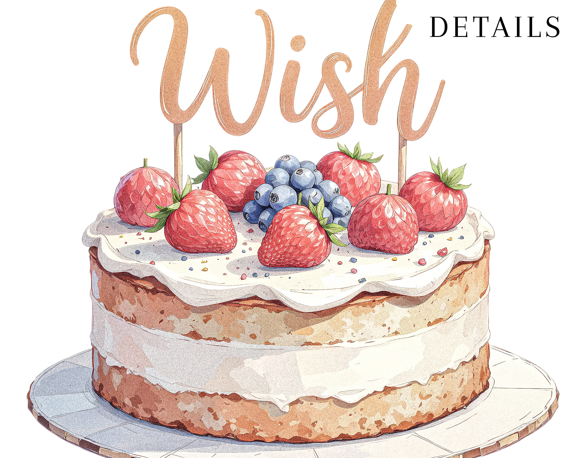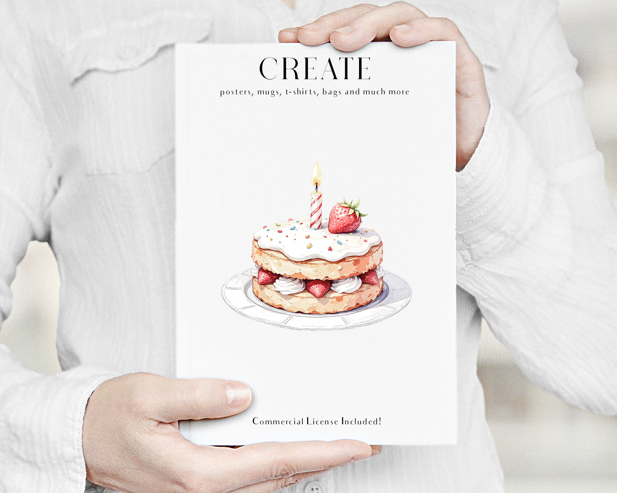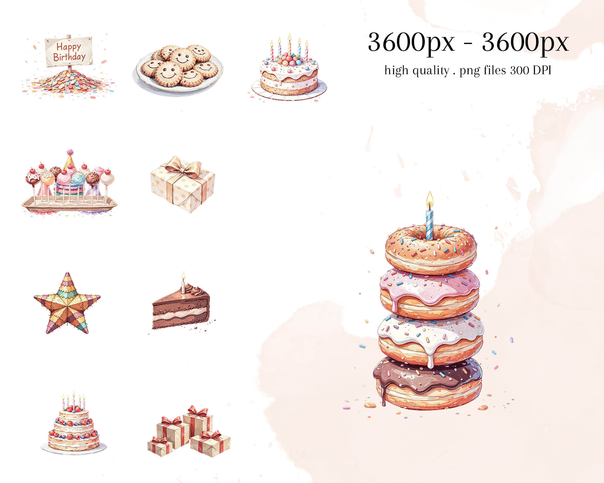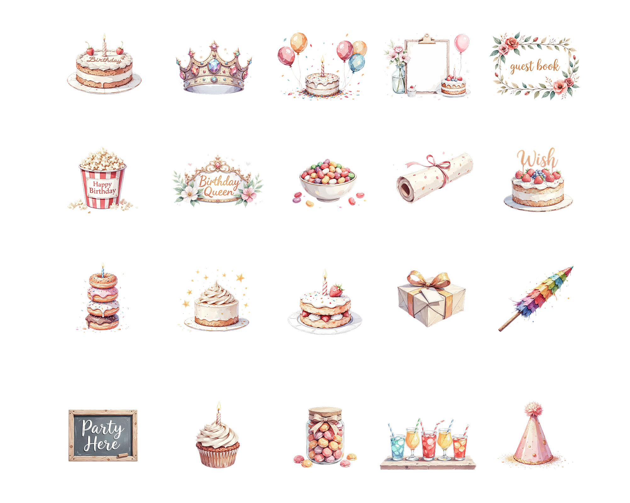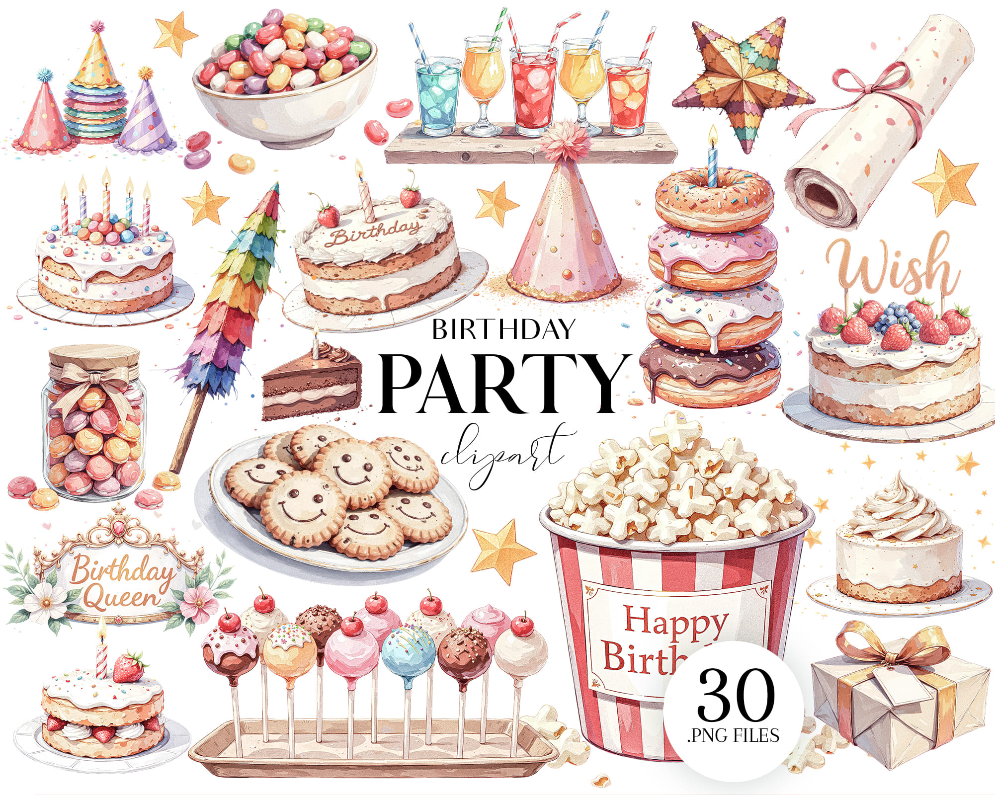 Birthday Party Clipart includes 30 festive PNG illustrations — cakes, balloons, crowns, guest book, and party details. Transparent background, 300 DPI.