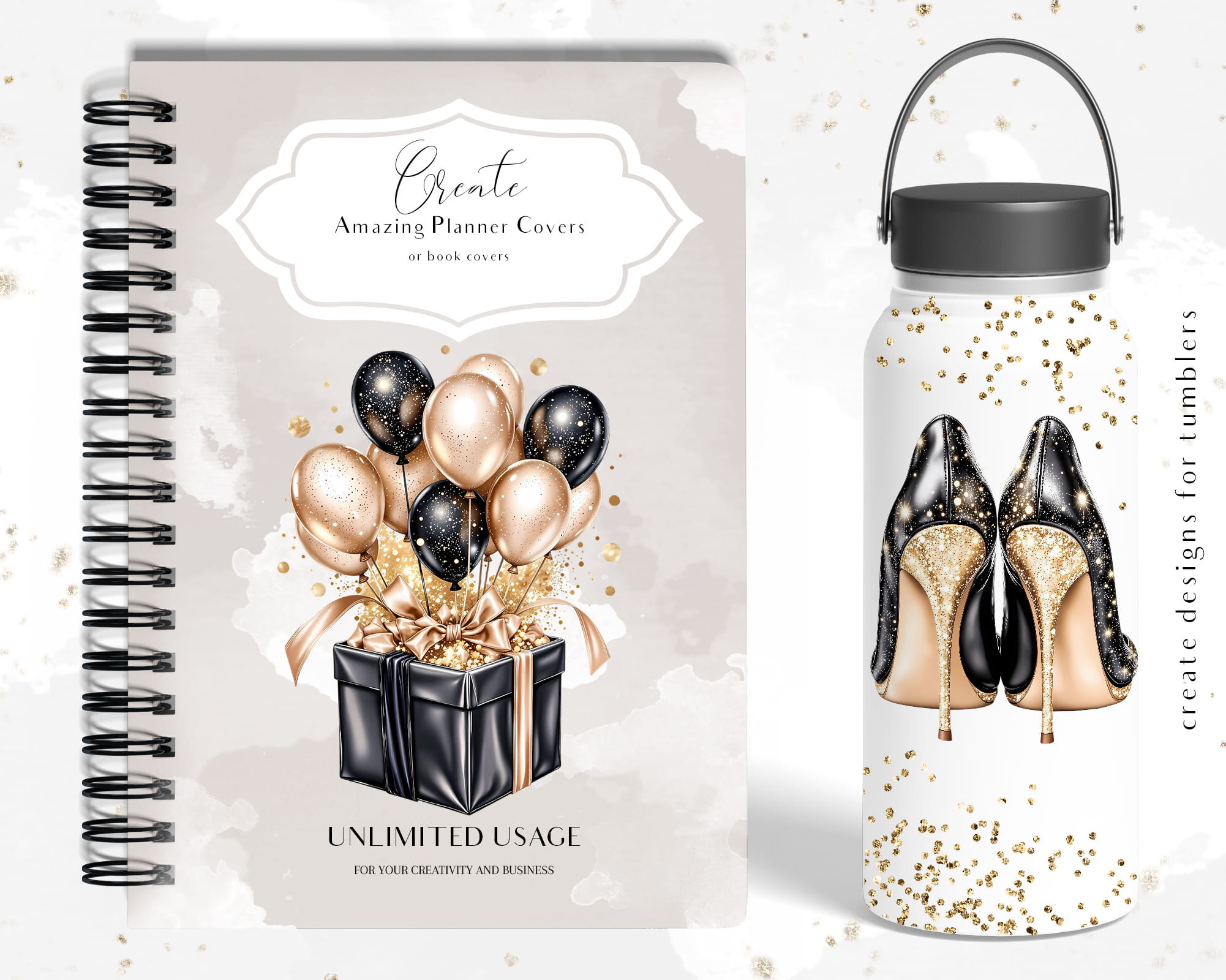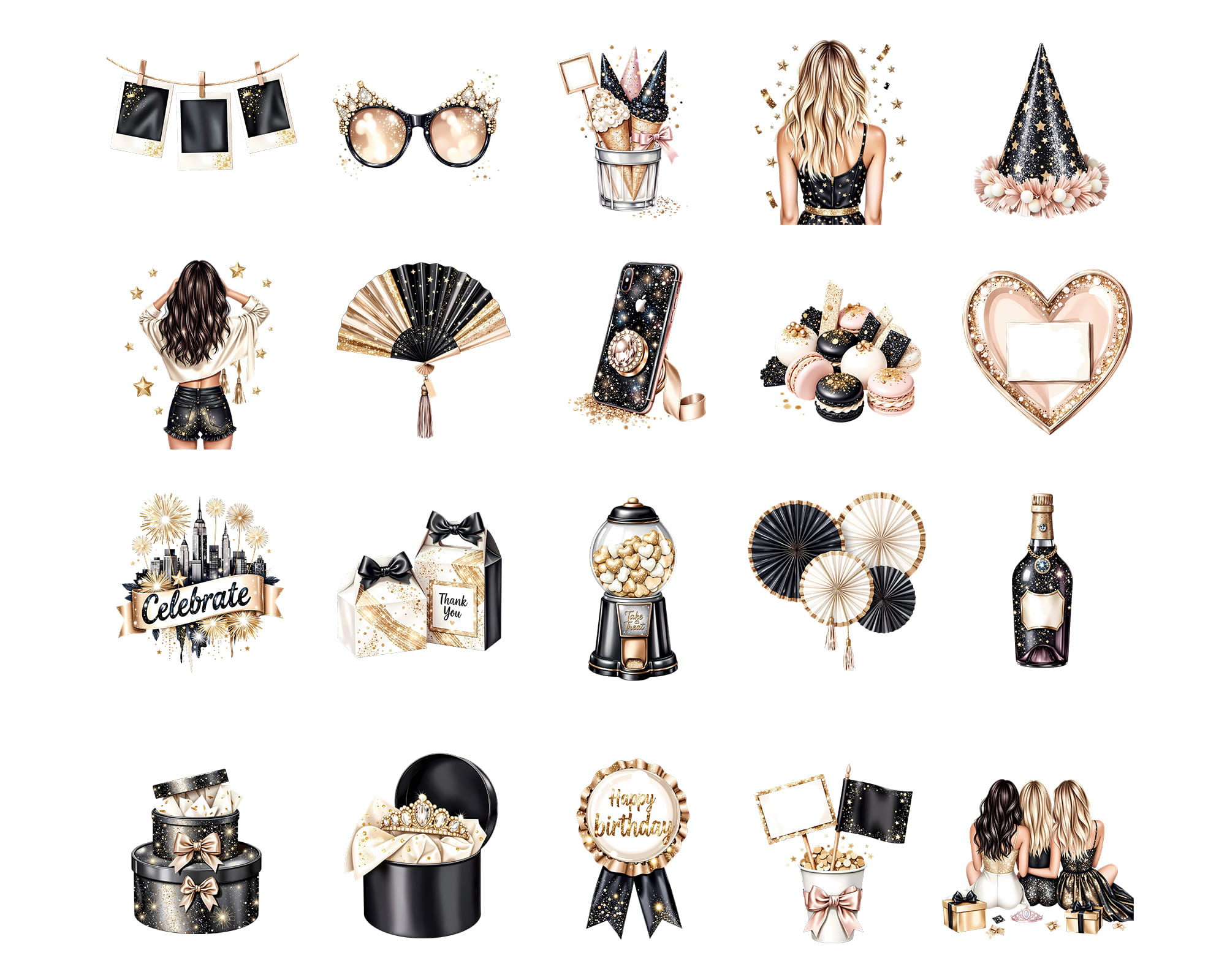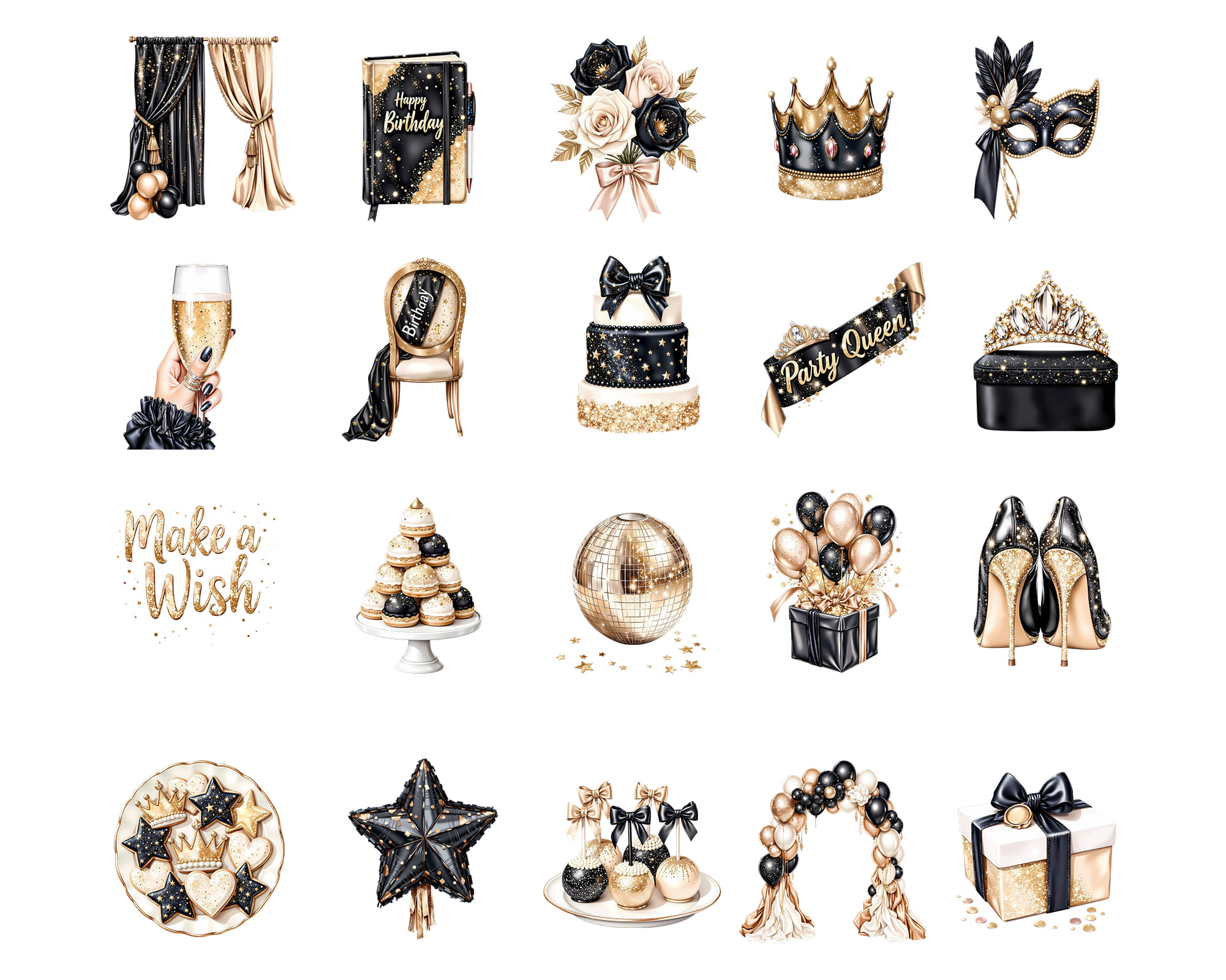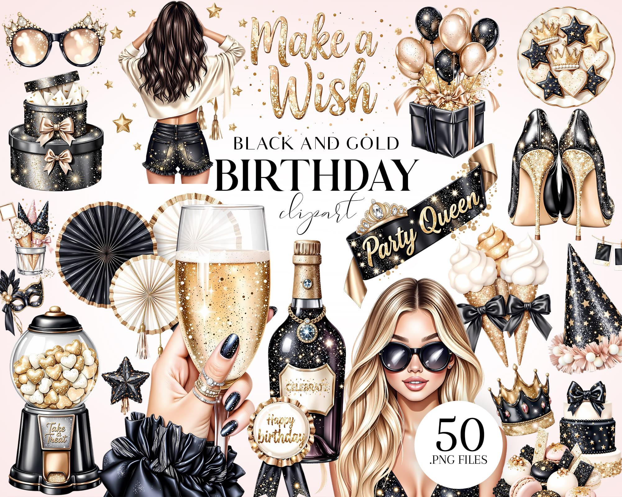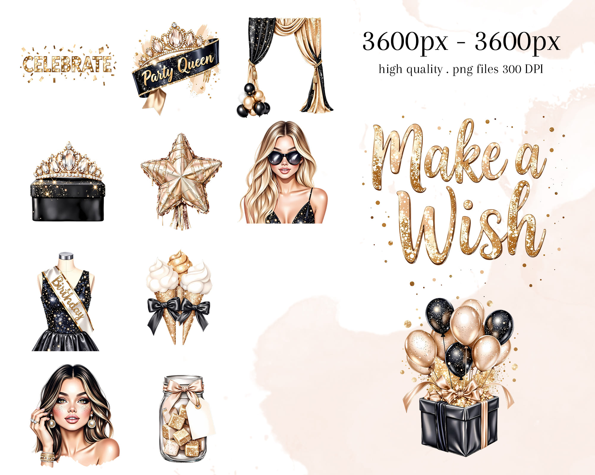 Celebrate in style with this Black & Gold Birthday Clipart Set! Featuring 50 PNG illustrations of glamorous party décor, birthday girl portraits, cakes, crowns, balloons, and luxury details in chic black and gold tones. Perfect for invitations, party décor, scrapbooking, and branding.