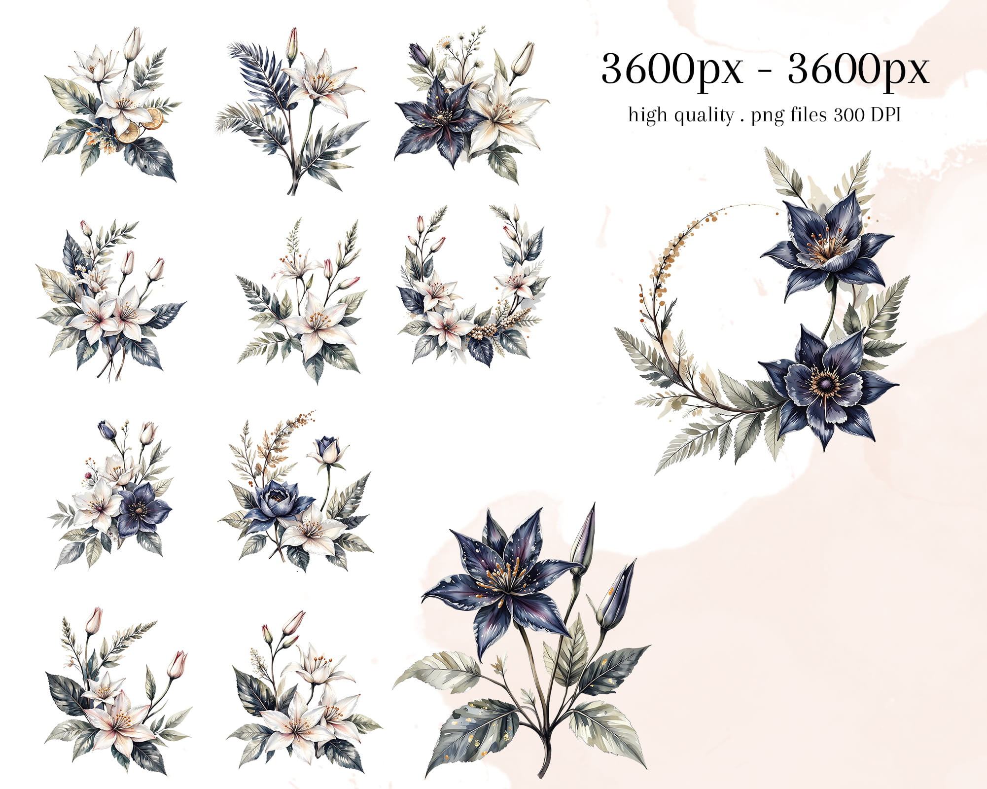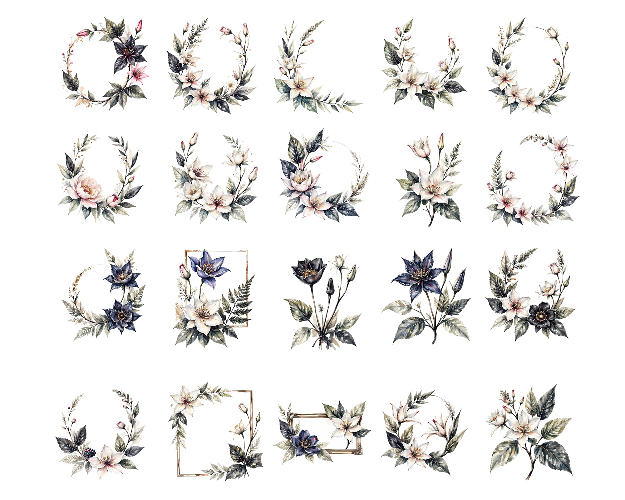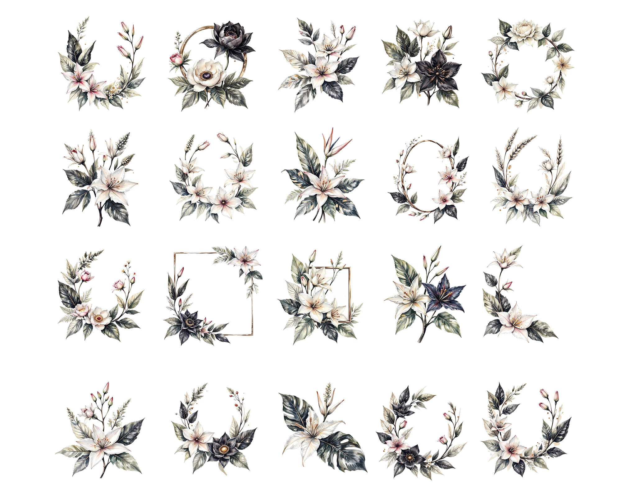 A sophisticated collection of 50 PNG floral illustrations in timeless black-and-white tones. This set features elegant lilies, buds, leaves, and botanical compositions — perfect for modern branding, wedding signage, aesthetic wall art, scrapbooking projects, invitations, and minimalist stationery.