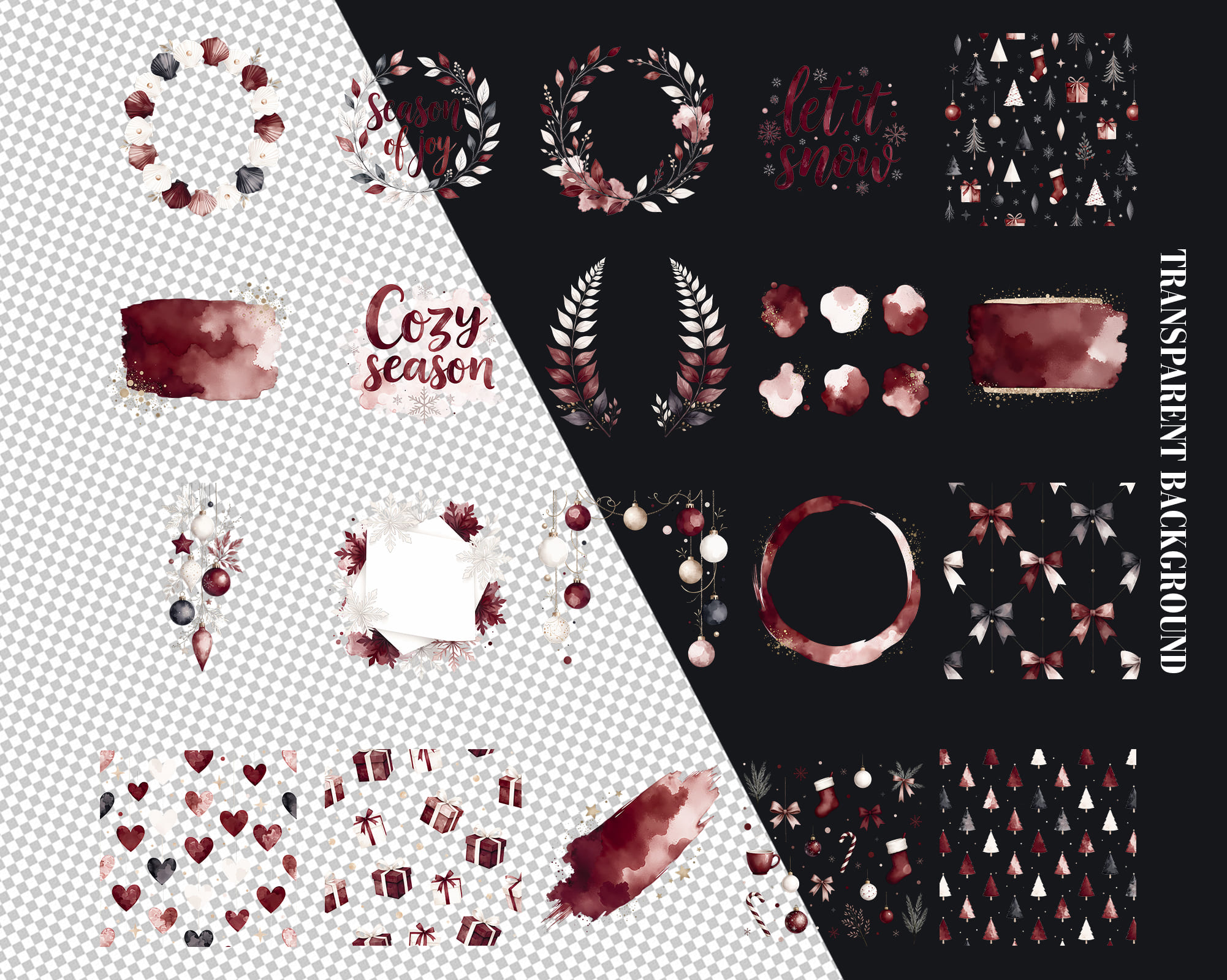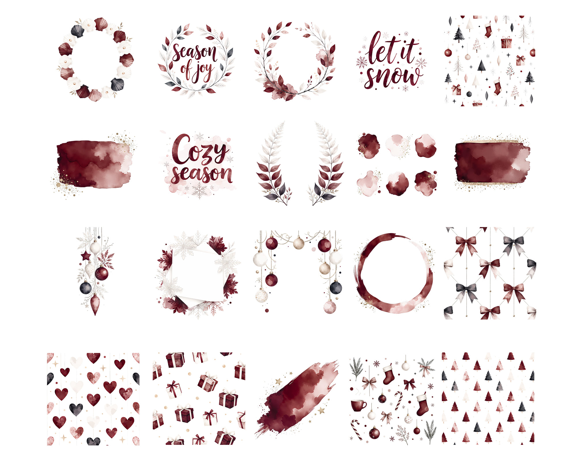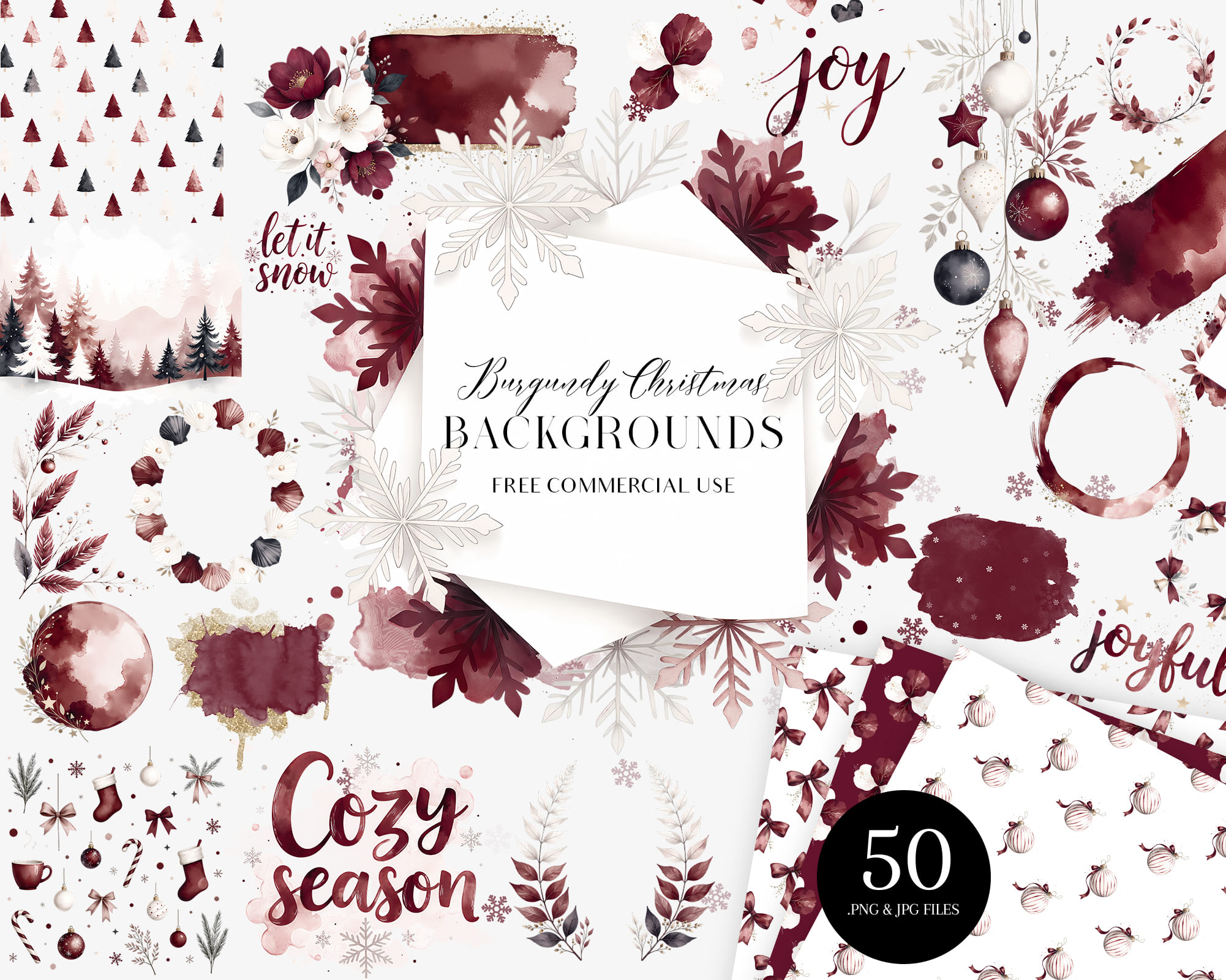 A cozy Burgundy Christmas Backgrounds collection featuring 50 JPG and PNG files in warm wine-red tones. This set includes seamless patterns, snowy landscapes, watercolor splashes, wreaths, branches, baubles, snowflakes, lettering and frames perfect for elegant festive designs. Ideal for holiday cards, wrapping paper, invitations, planners, sublimation, wall art and printable decor. All graphics come as high-quality JPG and transparent PNG files.