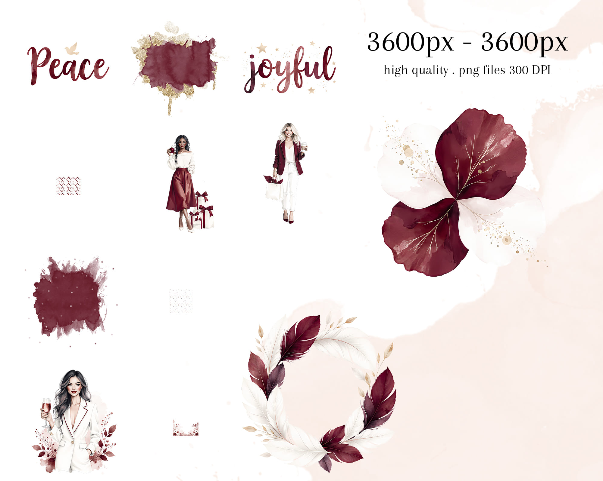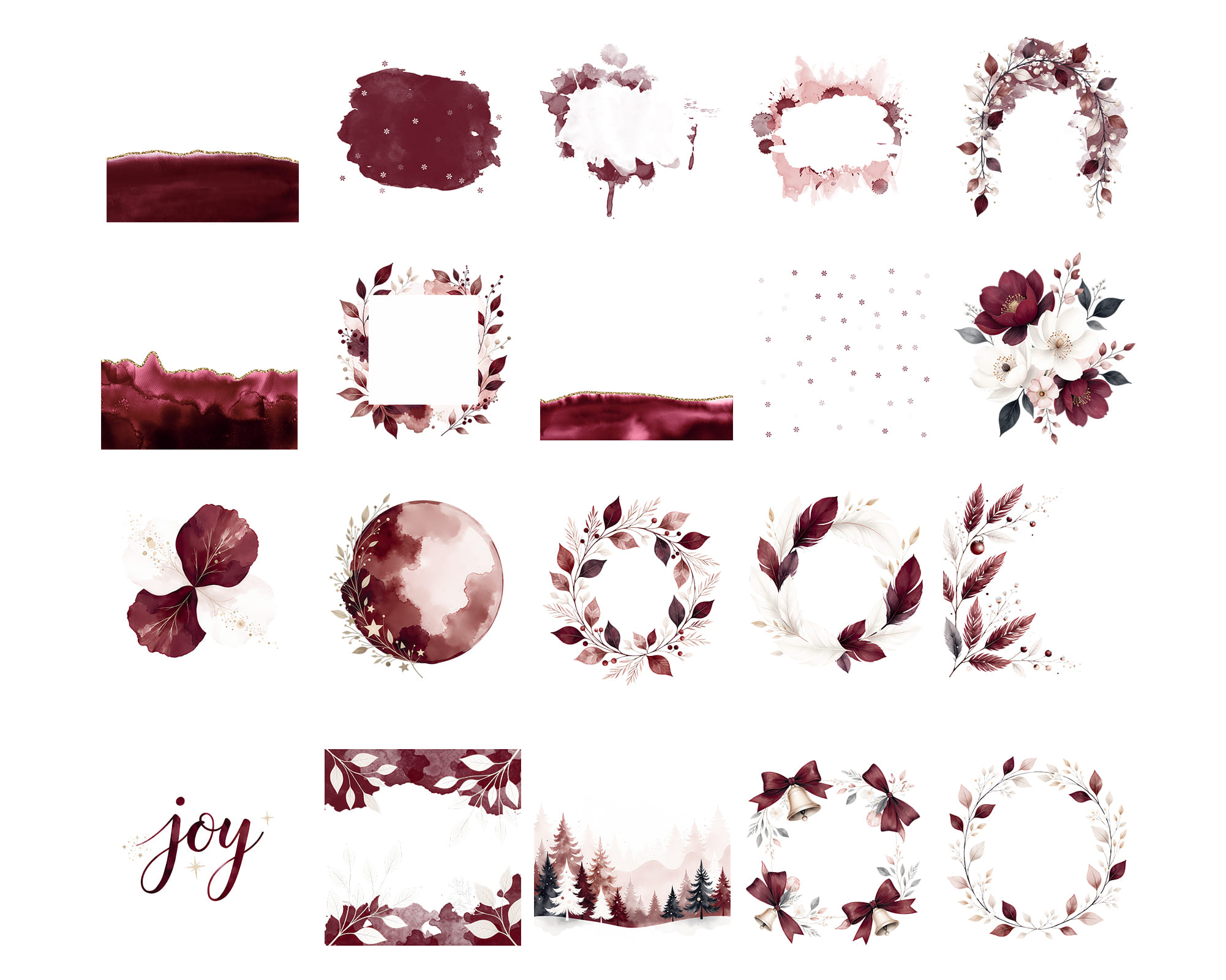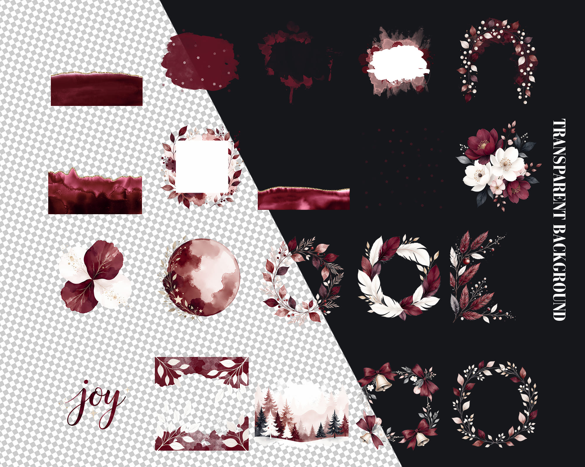 A cozy Burgundy Christmas Backgrounds collection featuring 50 JPG and PNG files in warm wine-red tones. This set includes seamless patterns, snowy landscapes, watercolor splashes, wreaths, branches, baubles, snowflakes, lettering and frames perfect for elegant festive designs. Ideal for holiday cards, wrapping paper, invitations, planners, sublimation, wall art and printable decor. All graphics come as high-quality JPG and transparent PNG files.