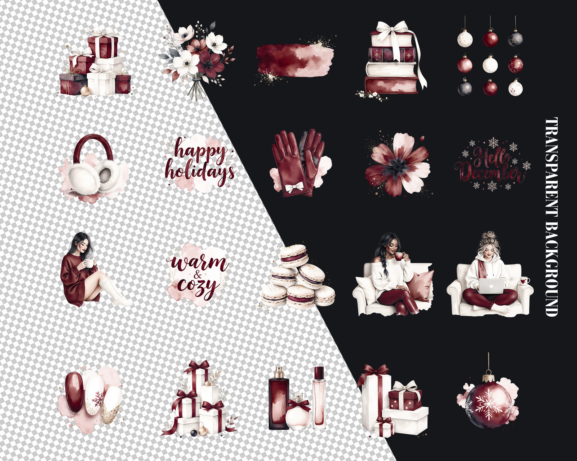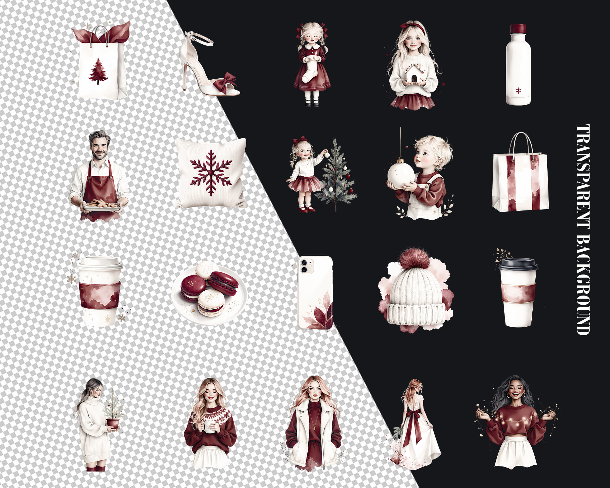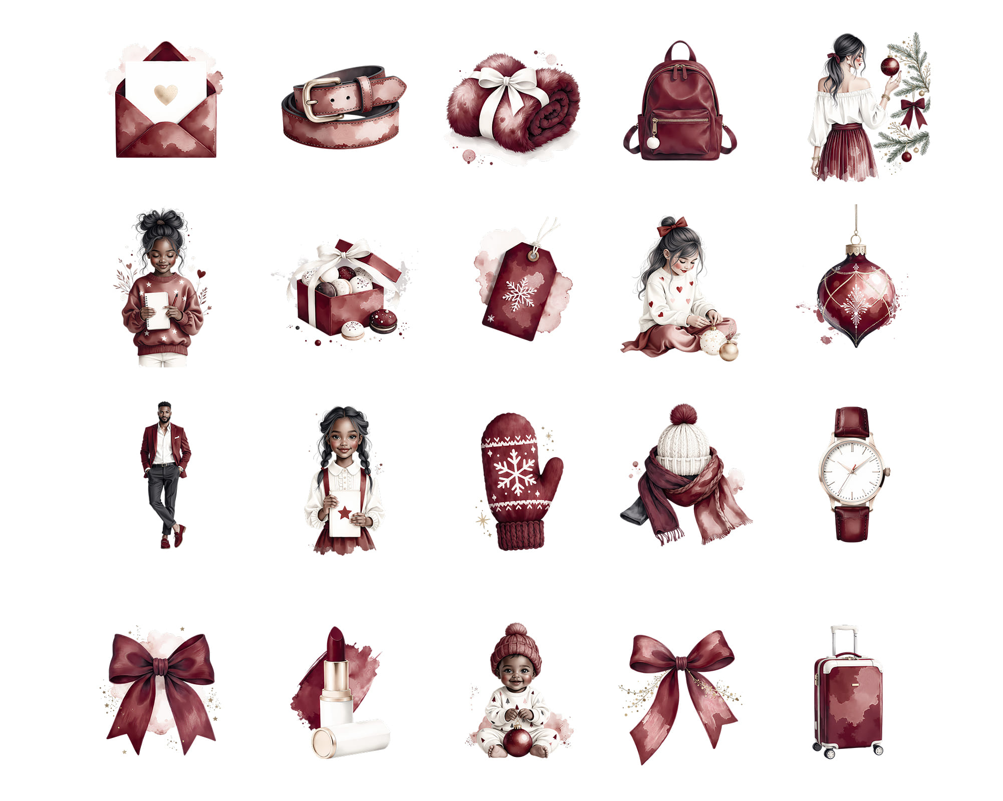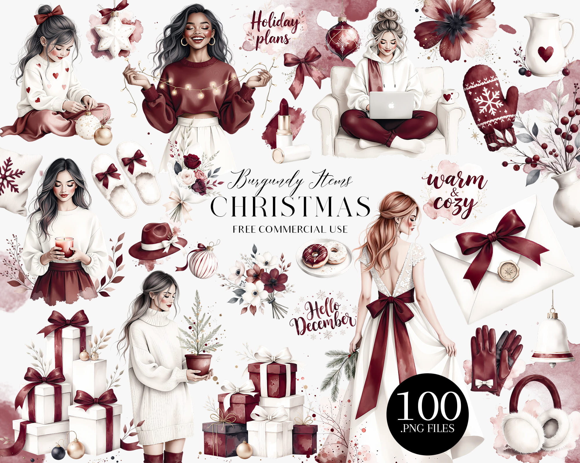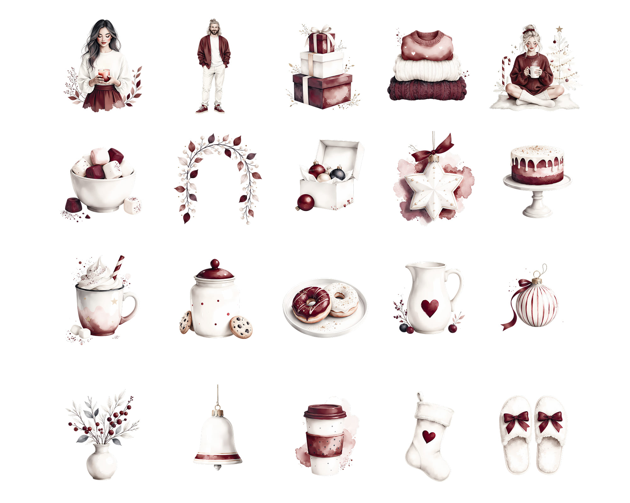 A warm Burgundy Christmas clipart collection featuring 100 PNG illustrations in soft cream and deep wine tones. This set includes cozy girls, gifts, boxes, mugs, mittens, slippers, envelopes, florals, ornaments, treats and festive lettering perfect for modern holiday designs. Ideal for greeting cards, planners, stickers, invitations, sublimation, wall art and printable decor. All graphics come as high-quality transparent PNG files.