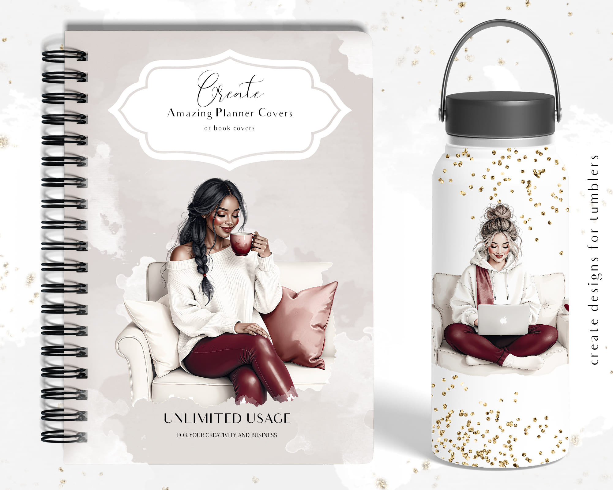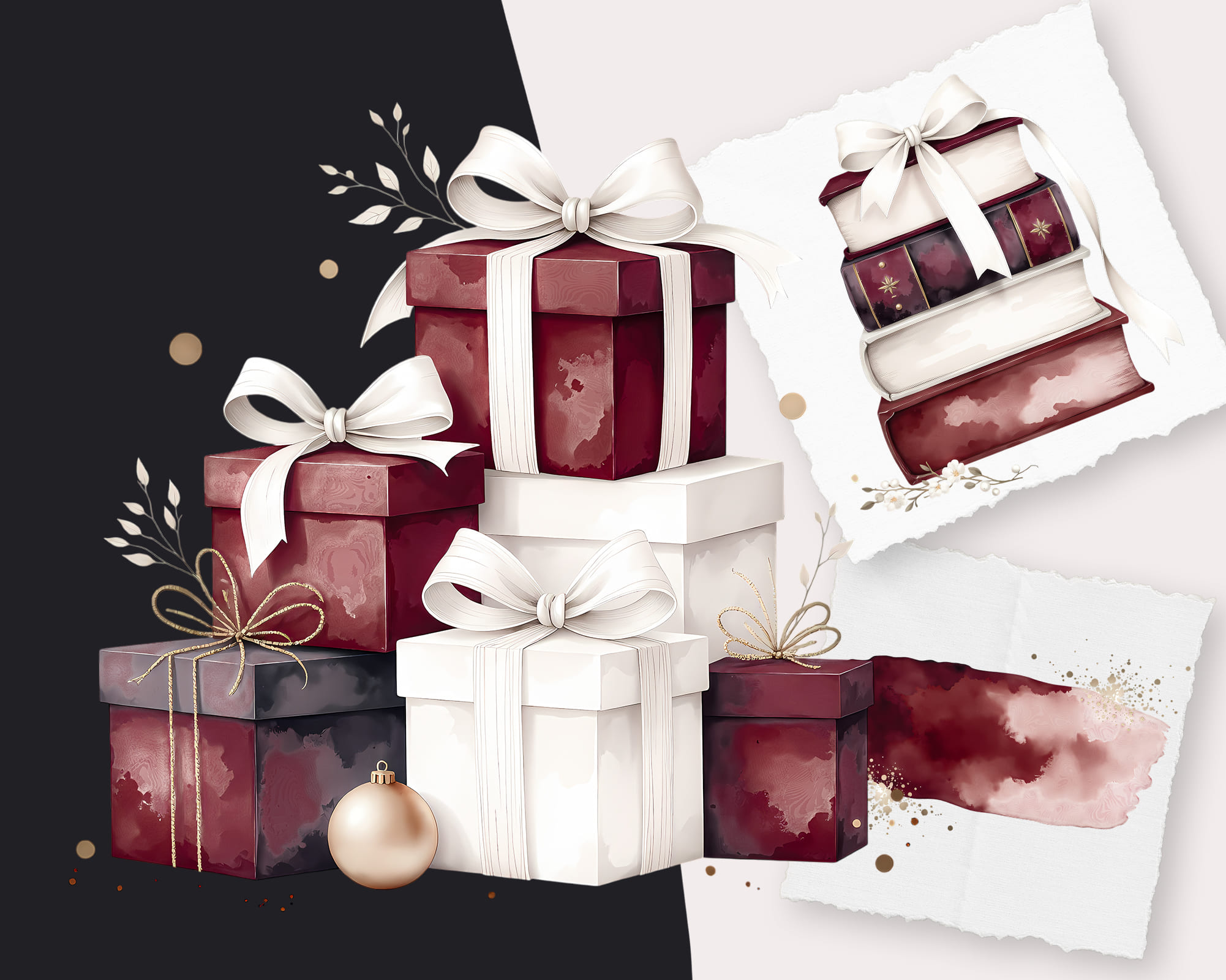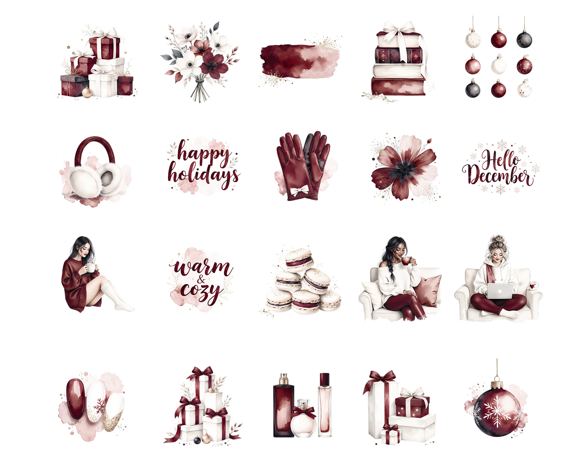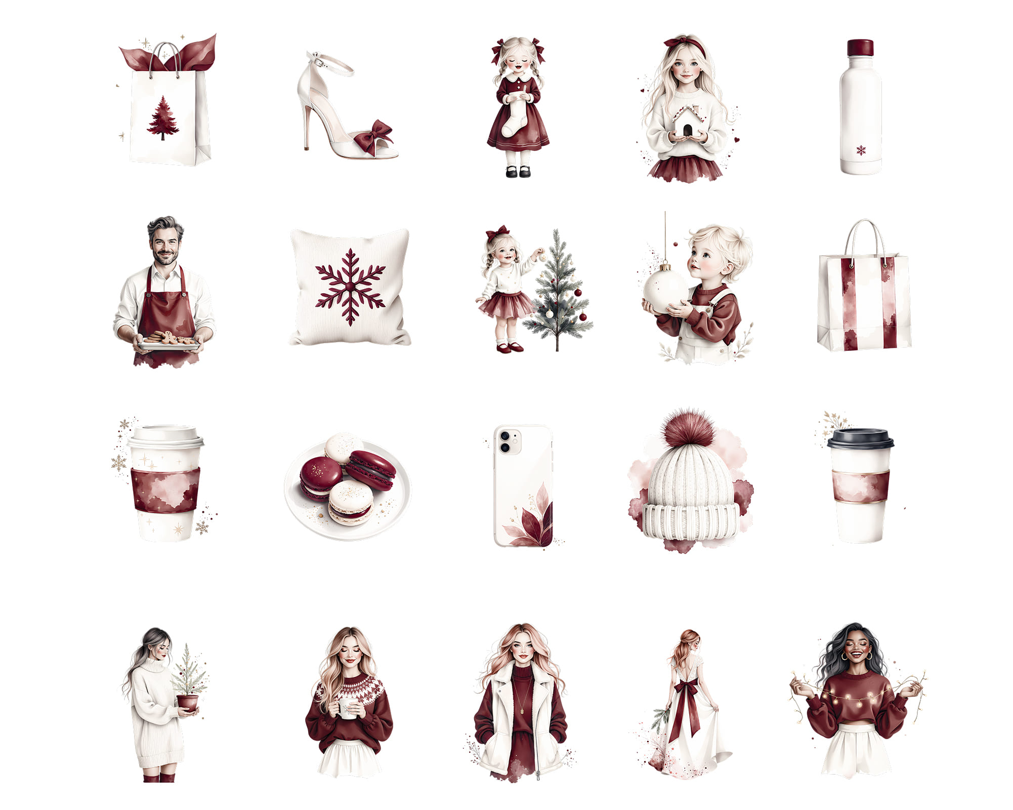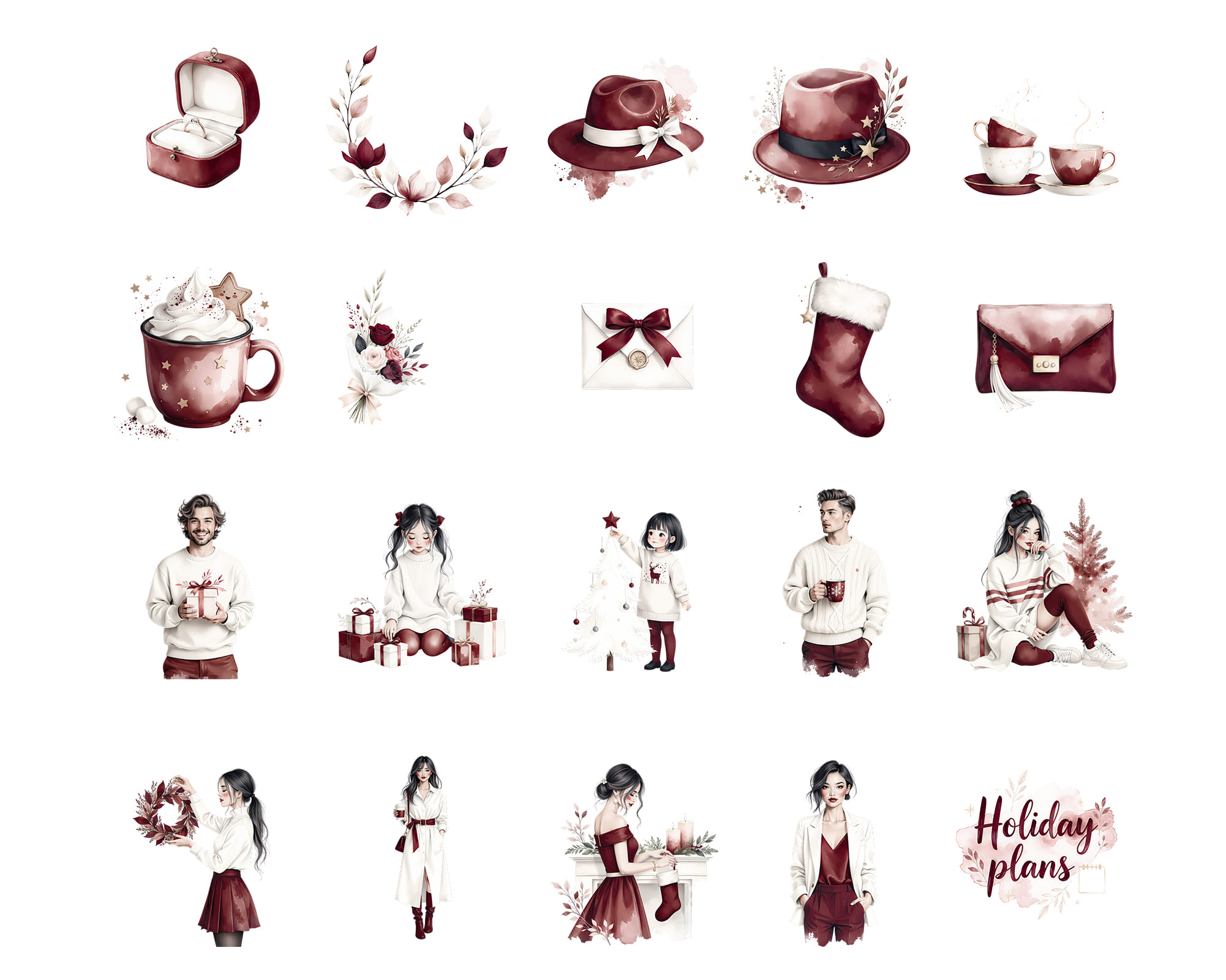 A warm Burgundy Christmas clipart collection featuring 100 PNG illustrations in soft cream and deep wine tones. This set includes cozy girls, gifts, boxes, mugs, mittens, slippers, envelopes, florals, ornaments, treats and festive lettering perfect for modern holiday designs. Ideal for greeting cards, planners, stickers, invitations, sublimation, wall art and printable decor. All graphics come as high-quality transparent PNG files.