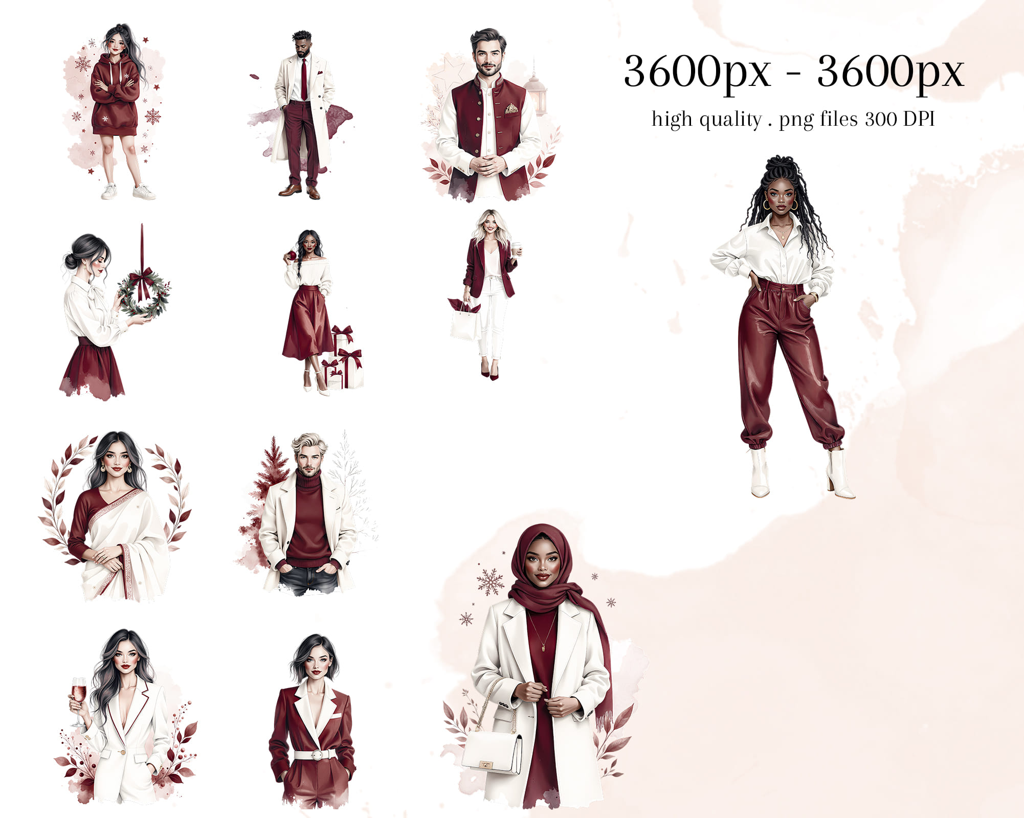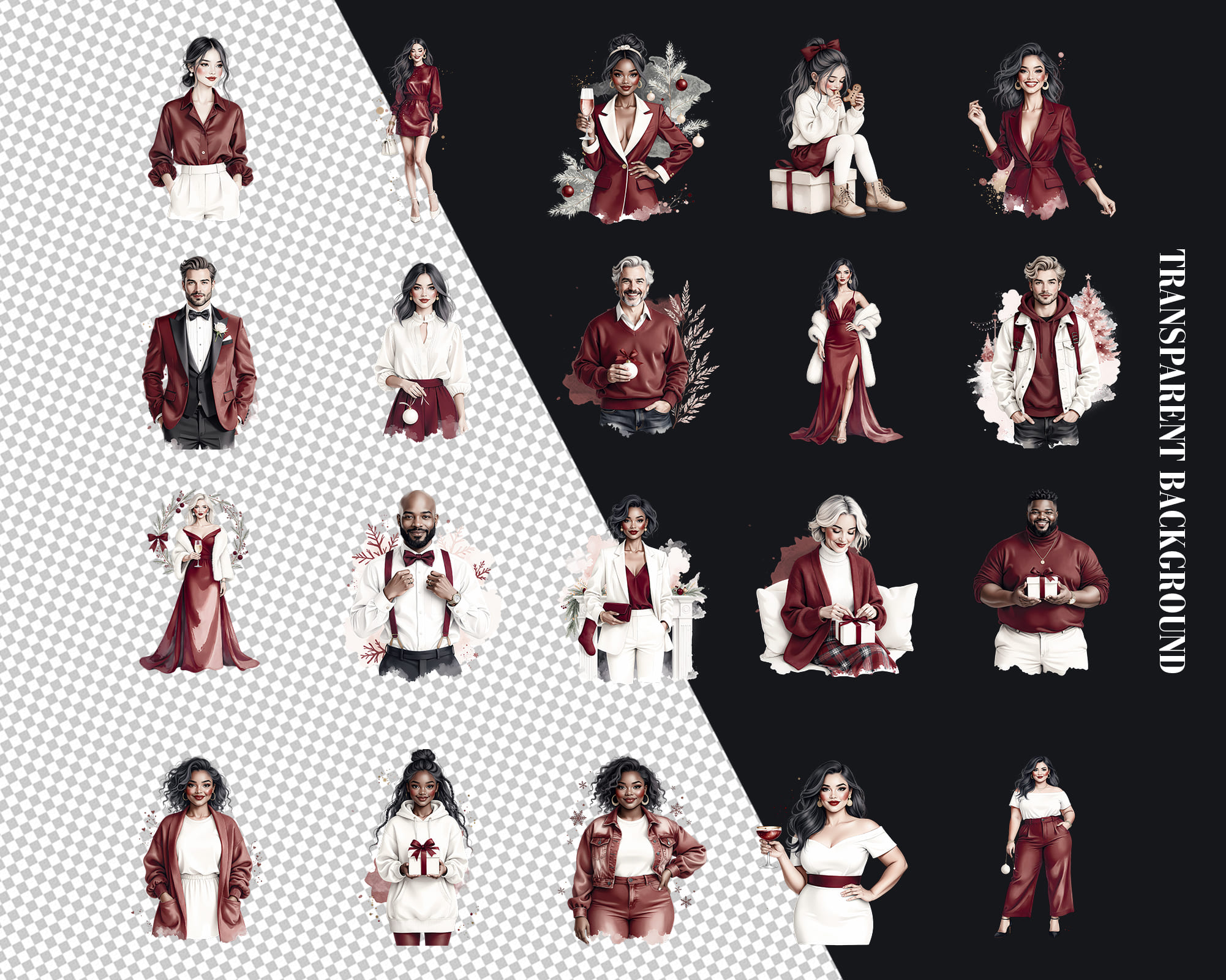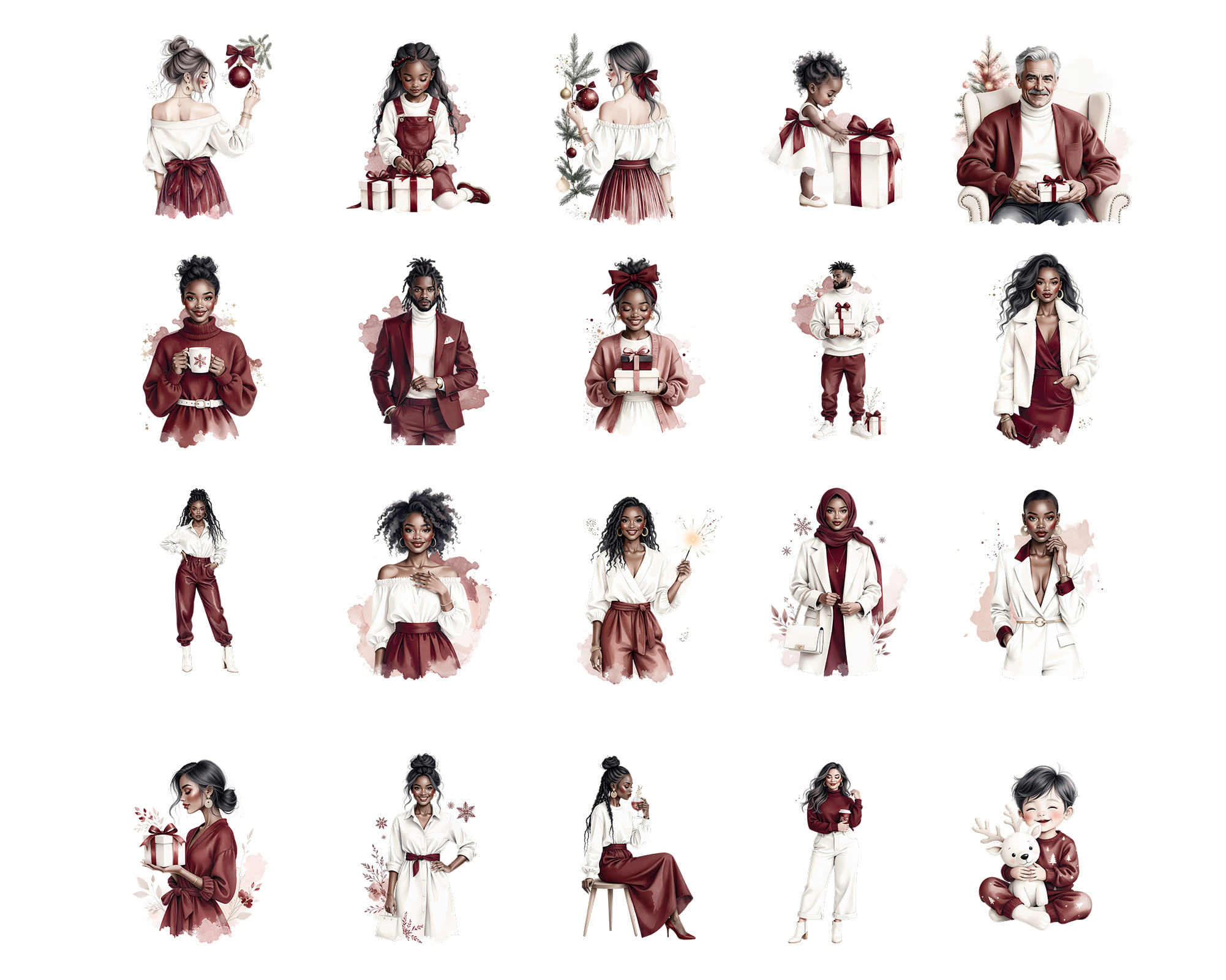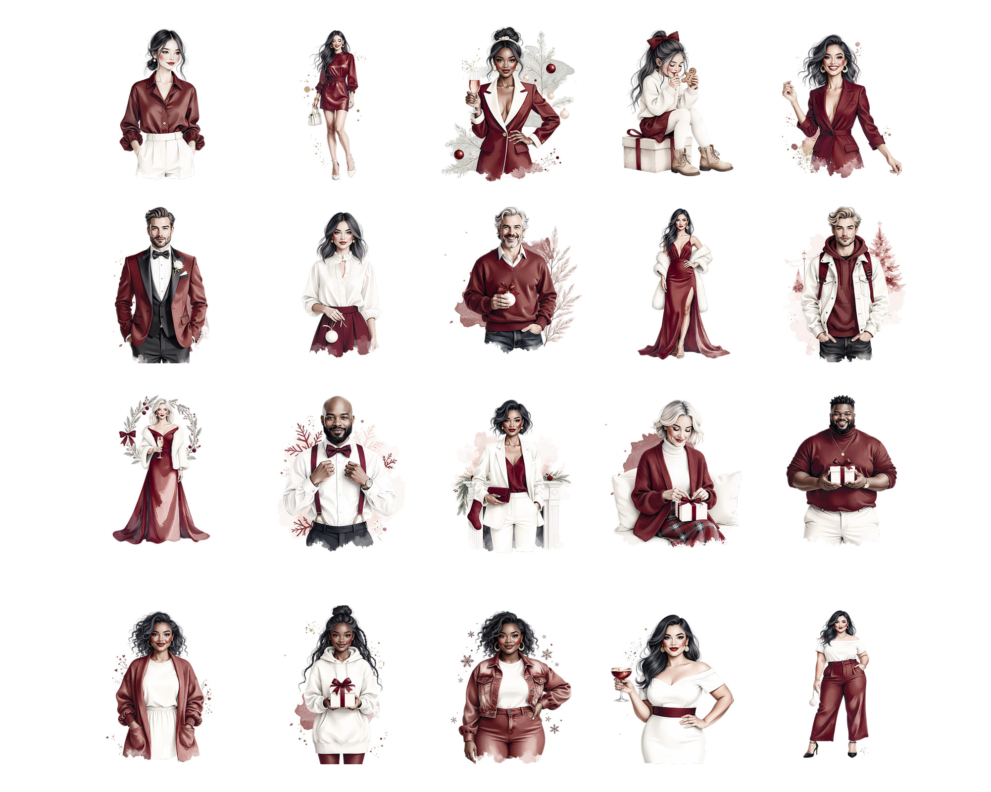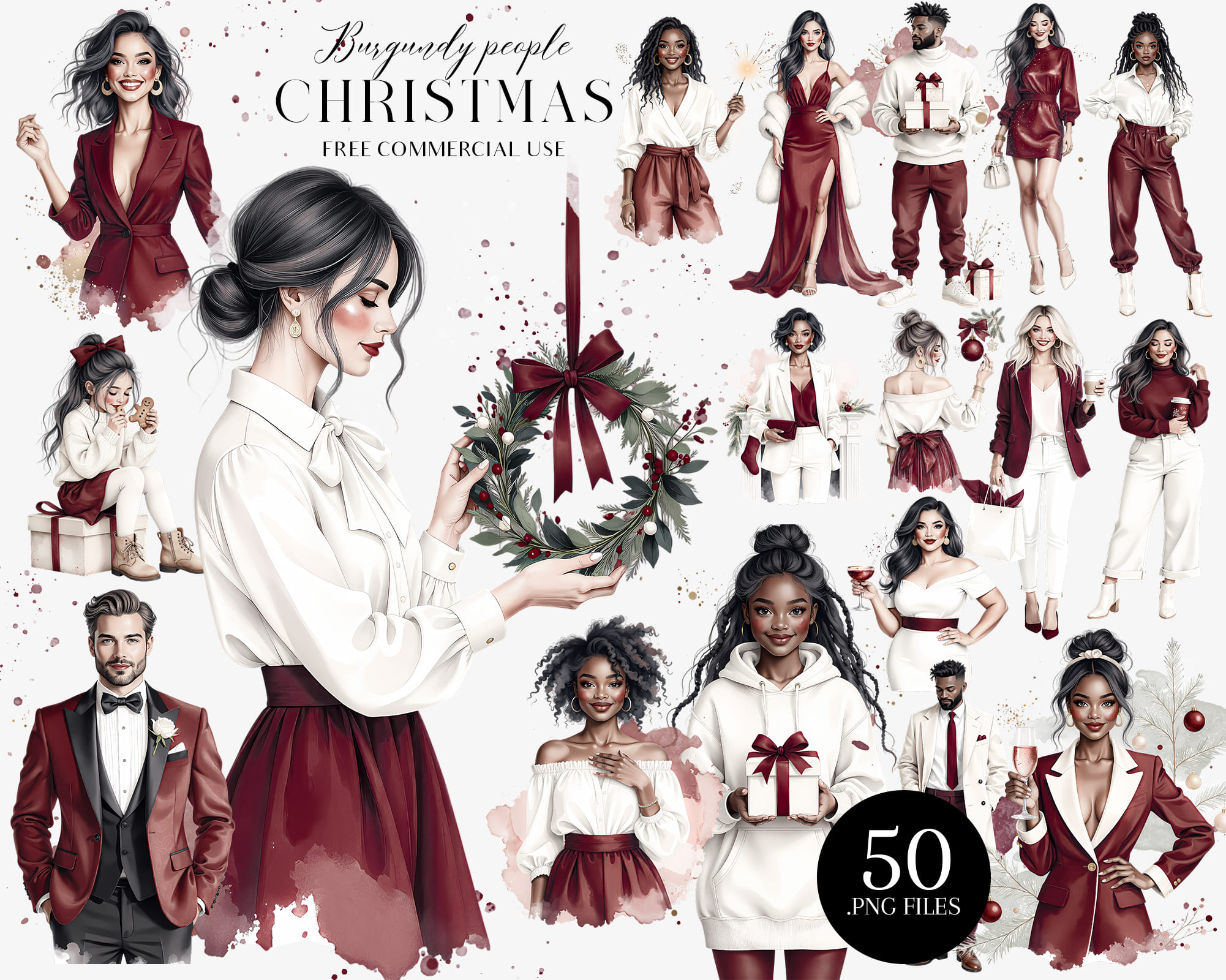 An elegant Burgundy Christmas People clipart collection featuring 50 PNG illustrations with stylish holiday characters. This set includes men and women in burgundy and cream outfits, wreaths, gifts, ornaments and cozy winter moments perfect for chic seasonal projects. Ideal for invitations, branding, planners, stickers, wall art, social media and printable decor. All graphics come as high-quality transparent PNG files.