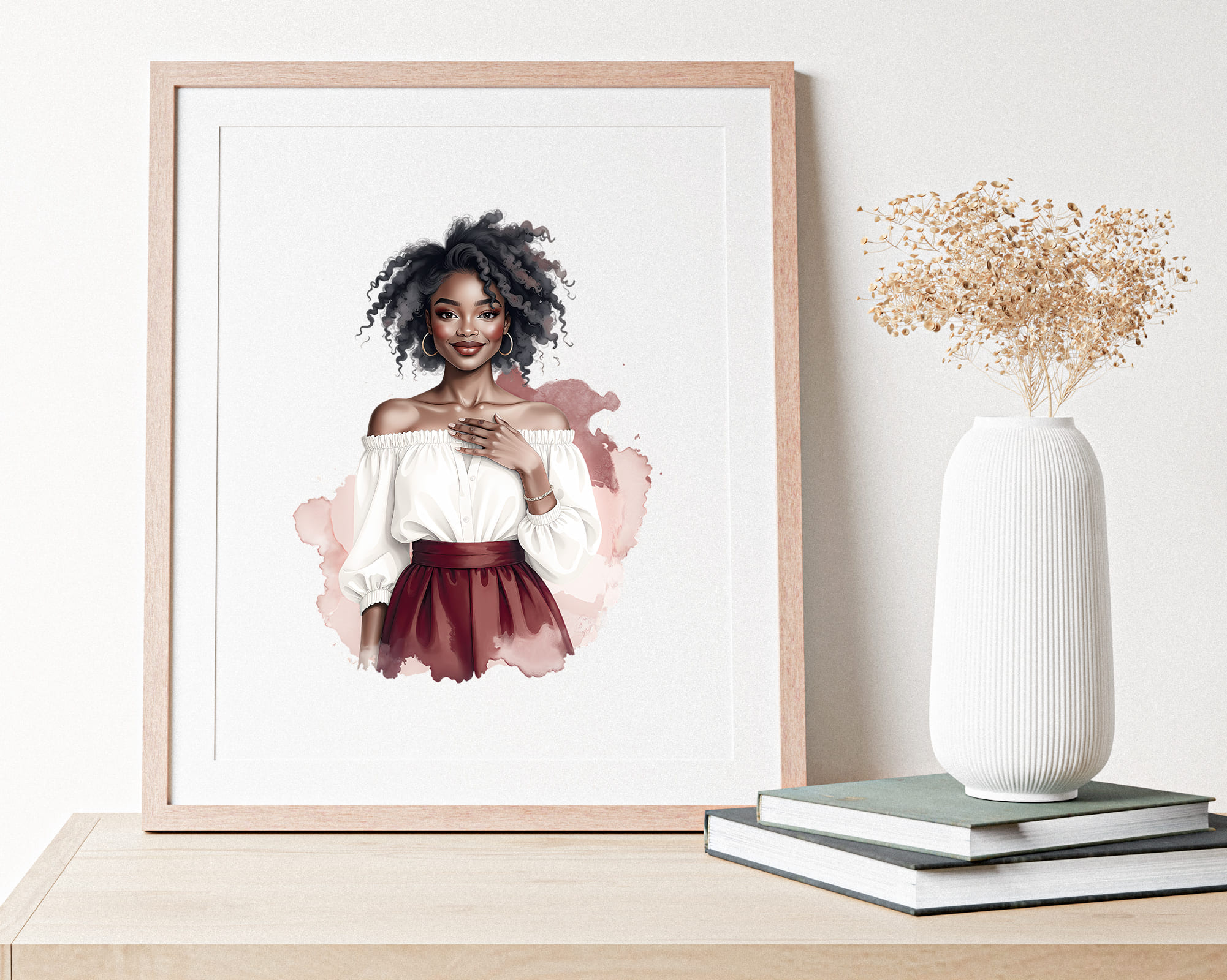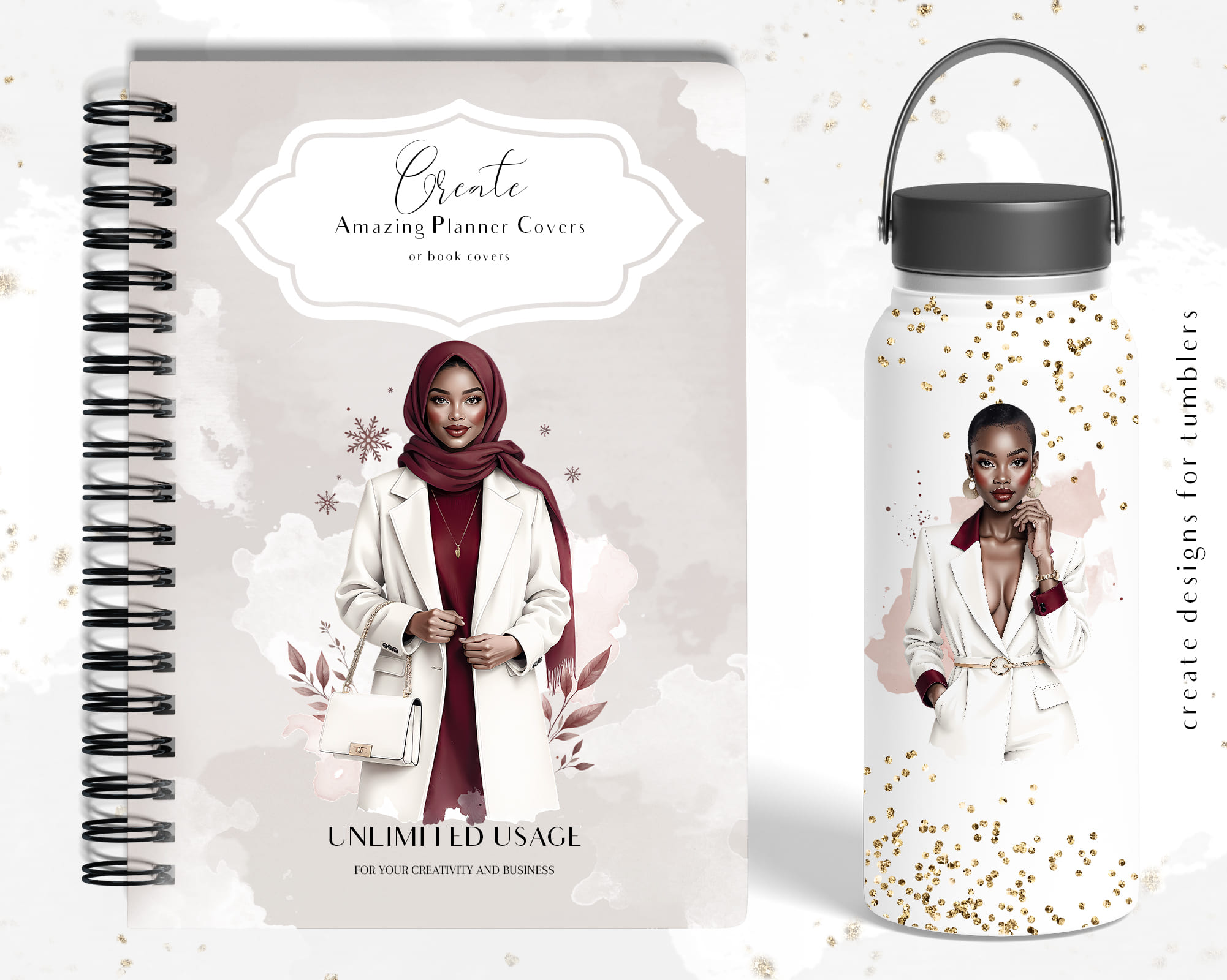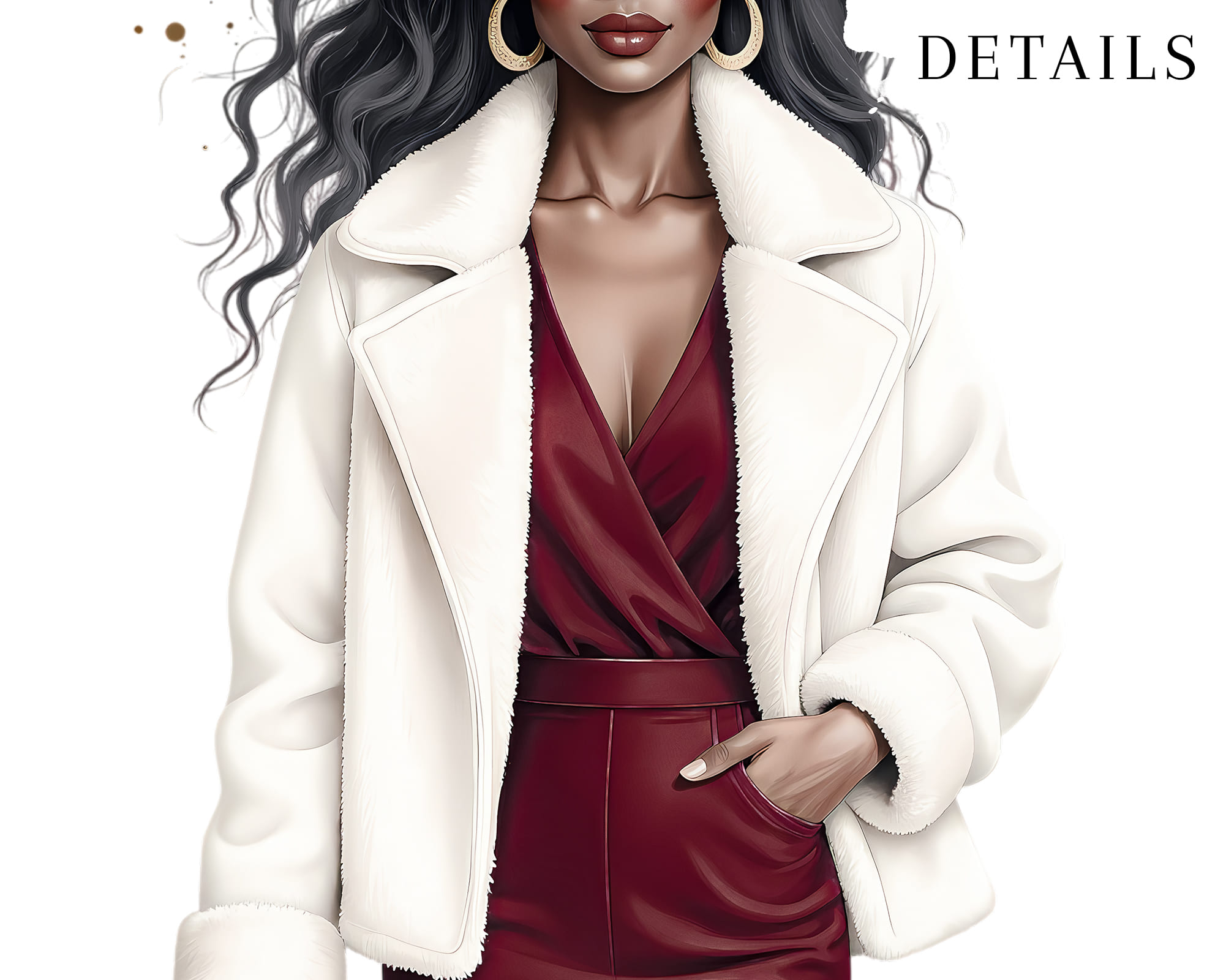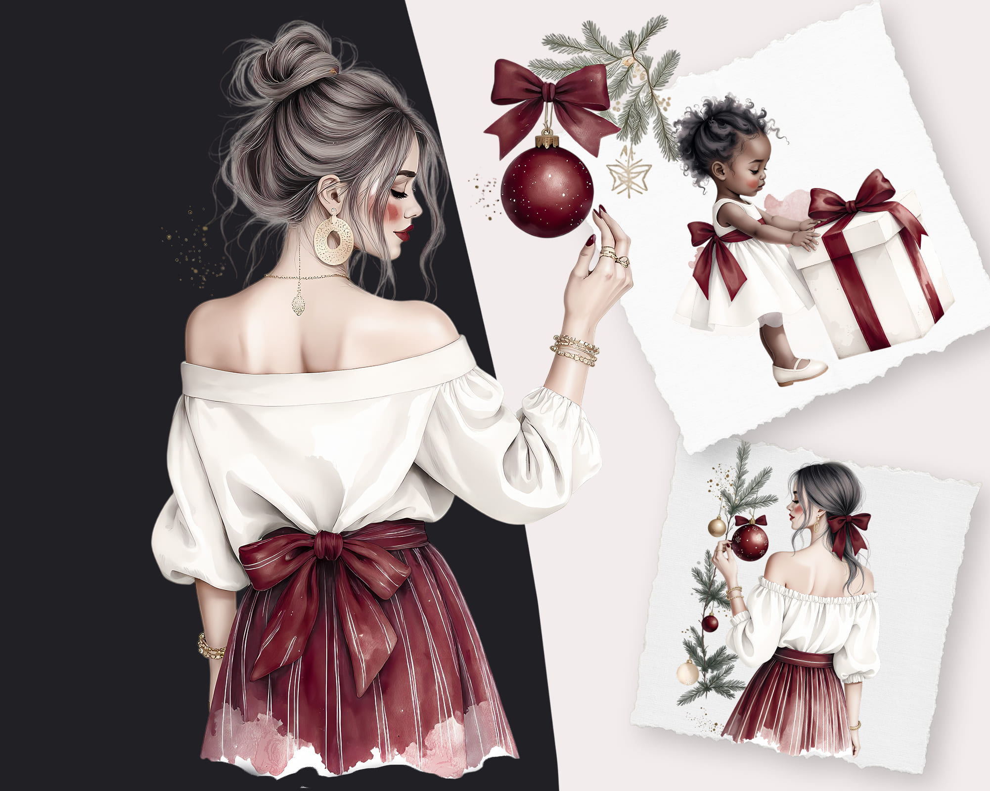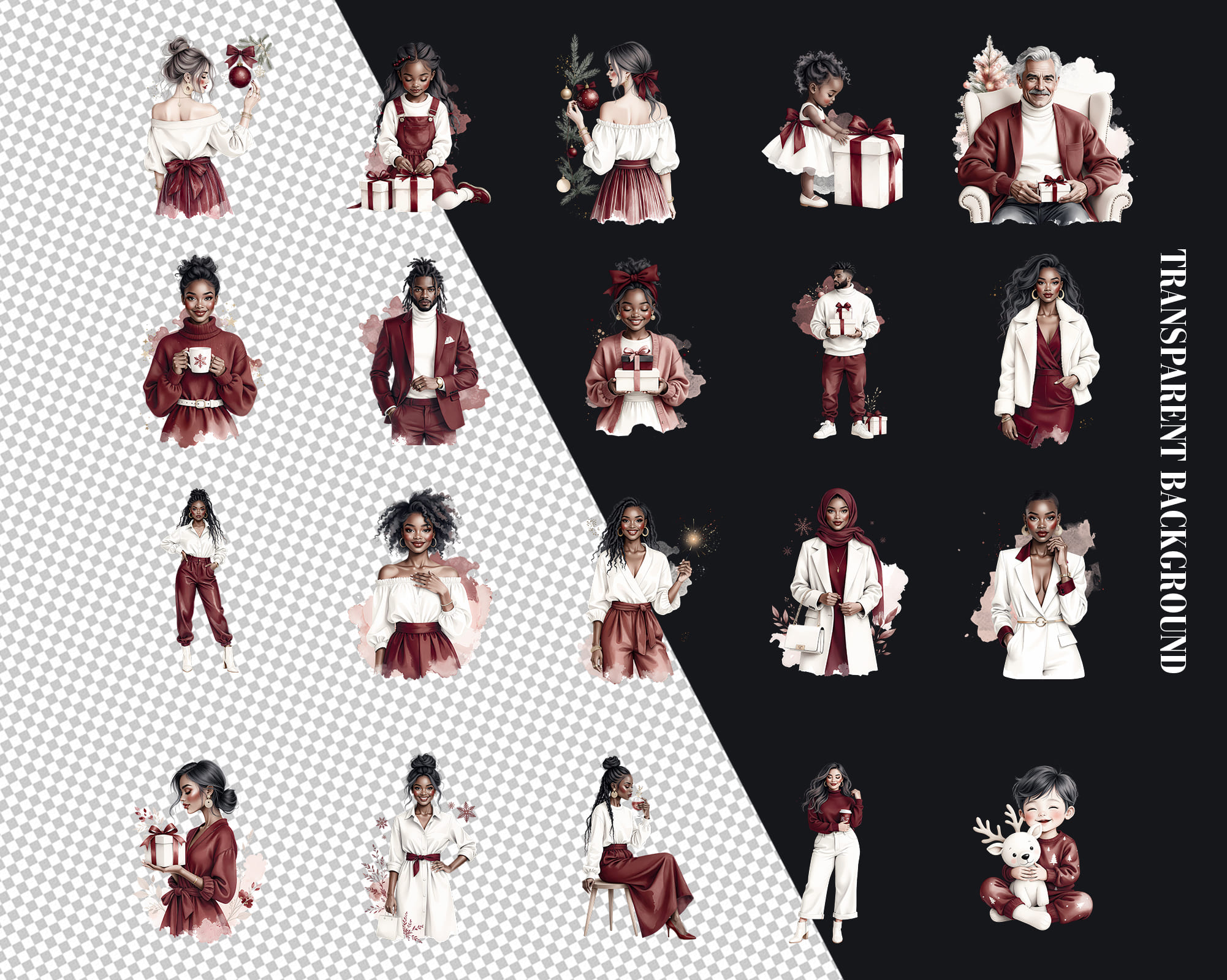 An elegant Burgundy Christmas People clipart collection featuring 50 PNG illustrations with stylish holiday characters. This set includes men and women in burgundy and cream outfits, wreaths, gifts, ornaments and cozy winter moments perfect for chic seasonal projects. Ideal for invitations, branding, planners, stickers, wall art, social media and printable decor. All graphics come as high-quality transparent PNG files.