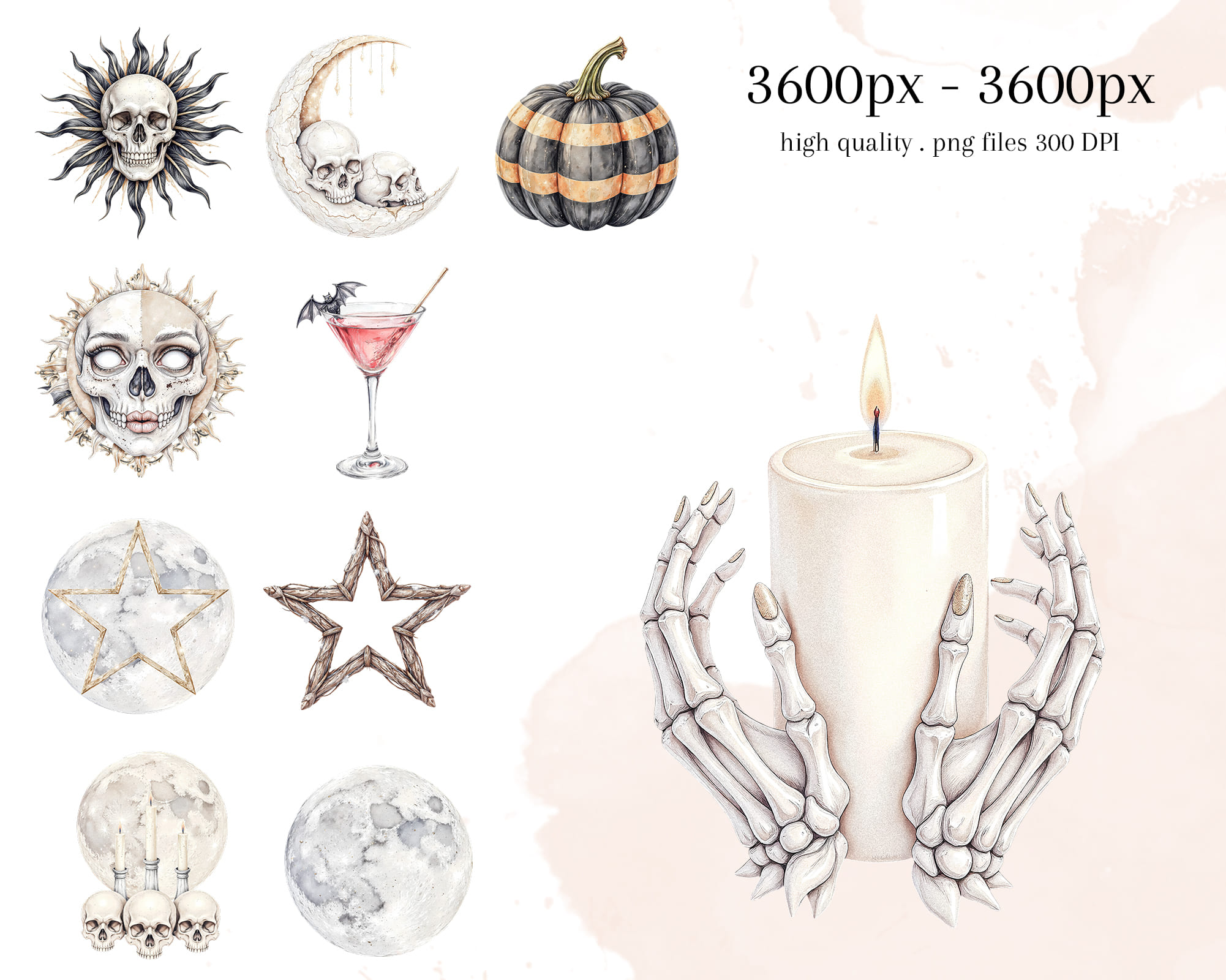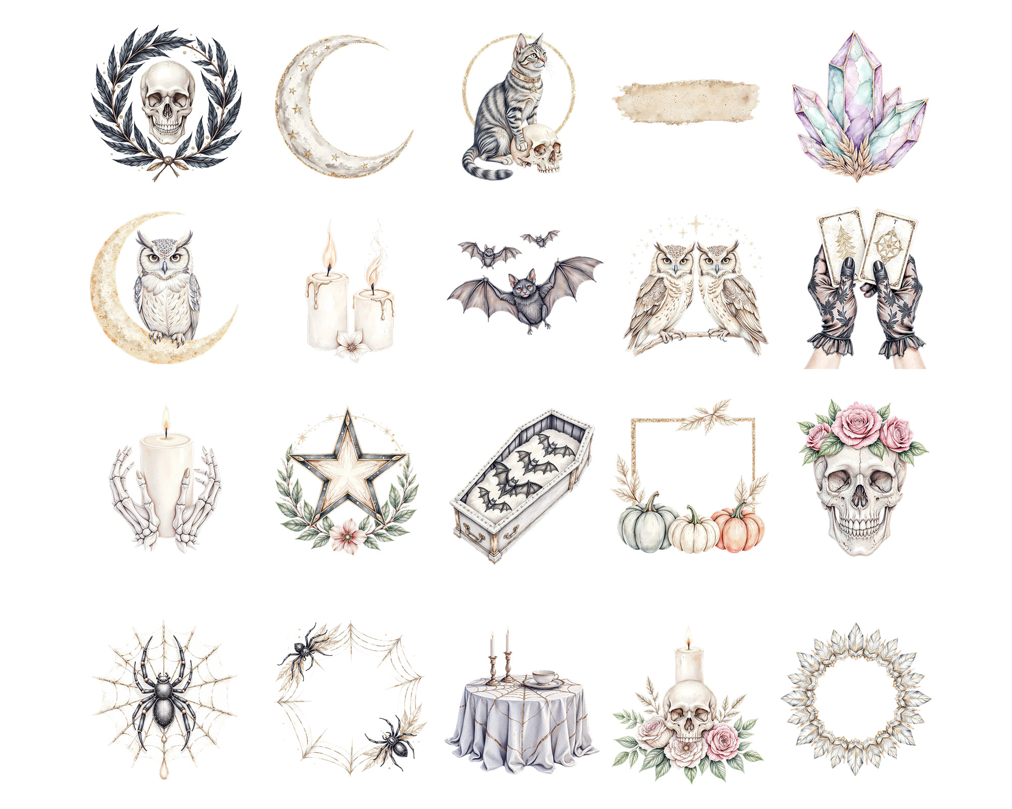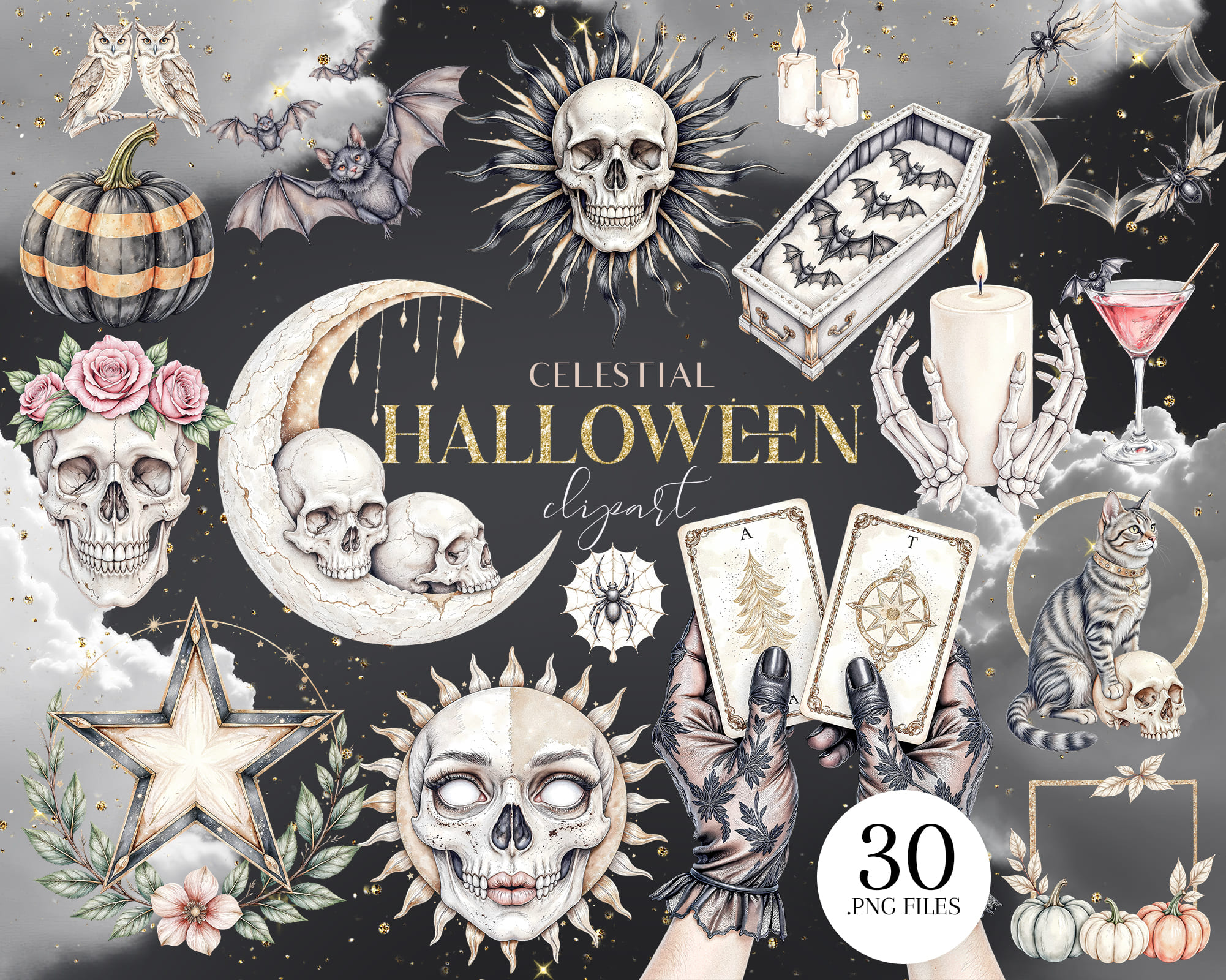 Celestial Halloween Clipart includes 30 mystical PNG illustrations: tarot cards, moons, crystals, owls, bats, and witchy details. High resolution, 300 DPI, transparent background.