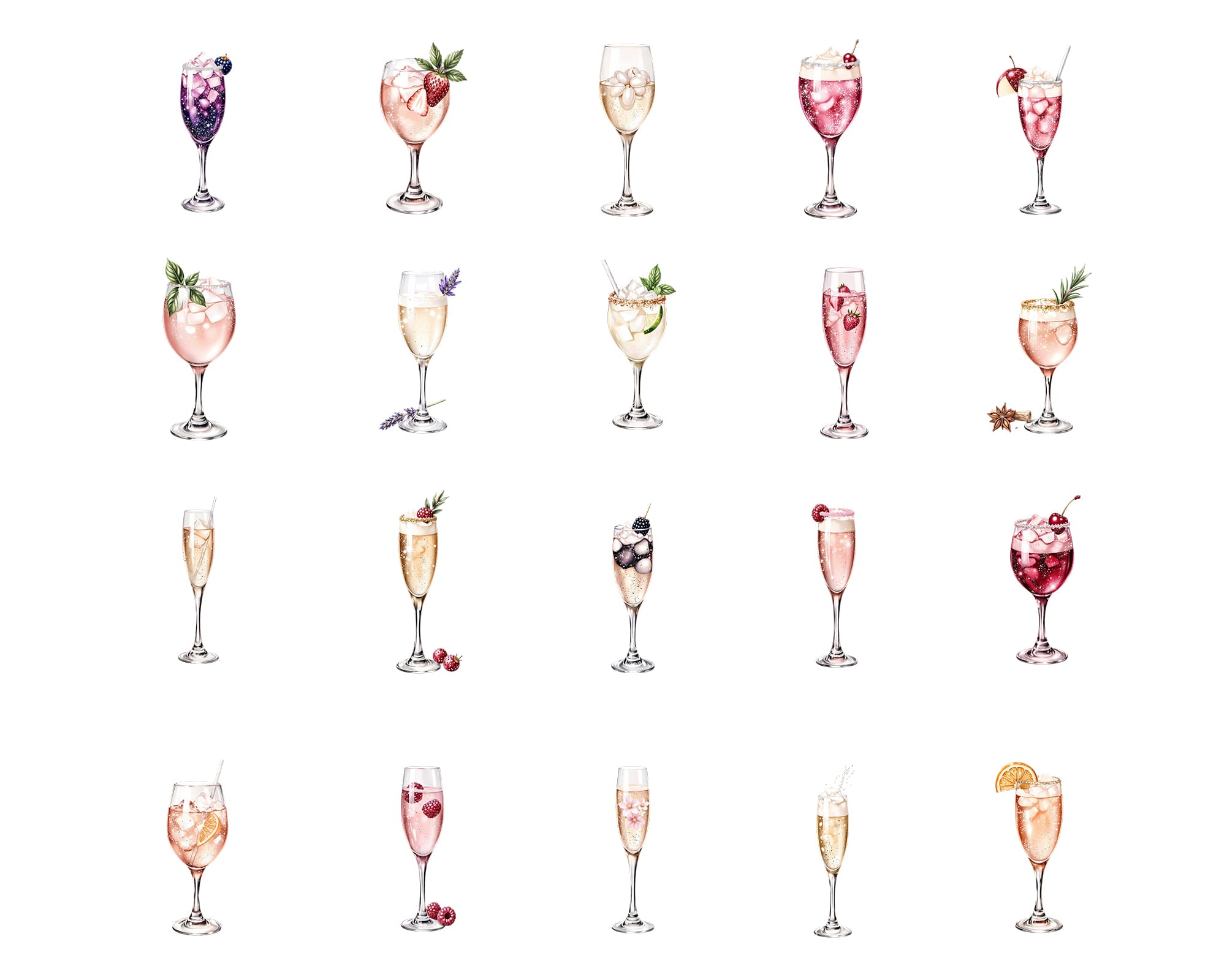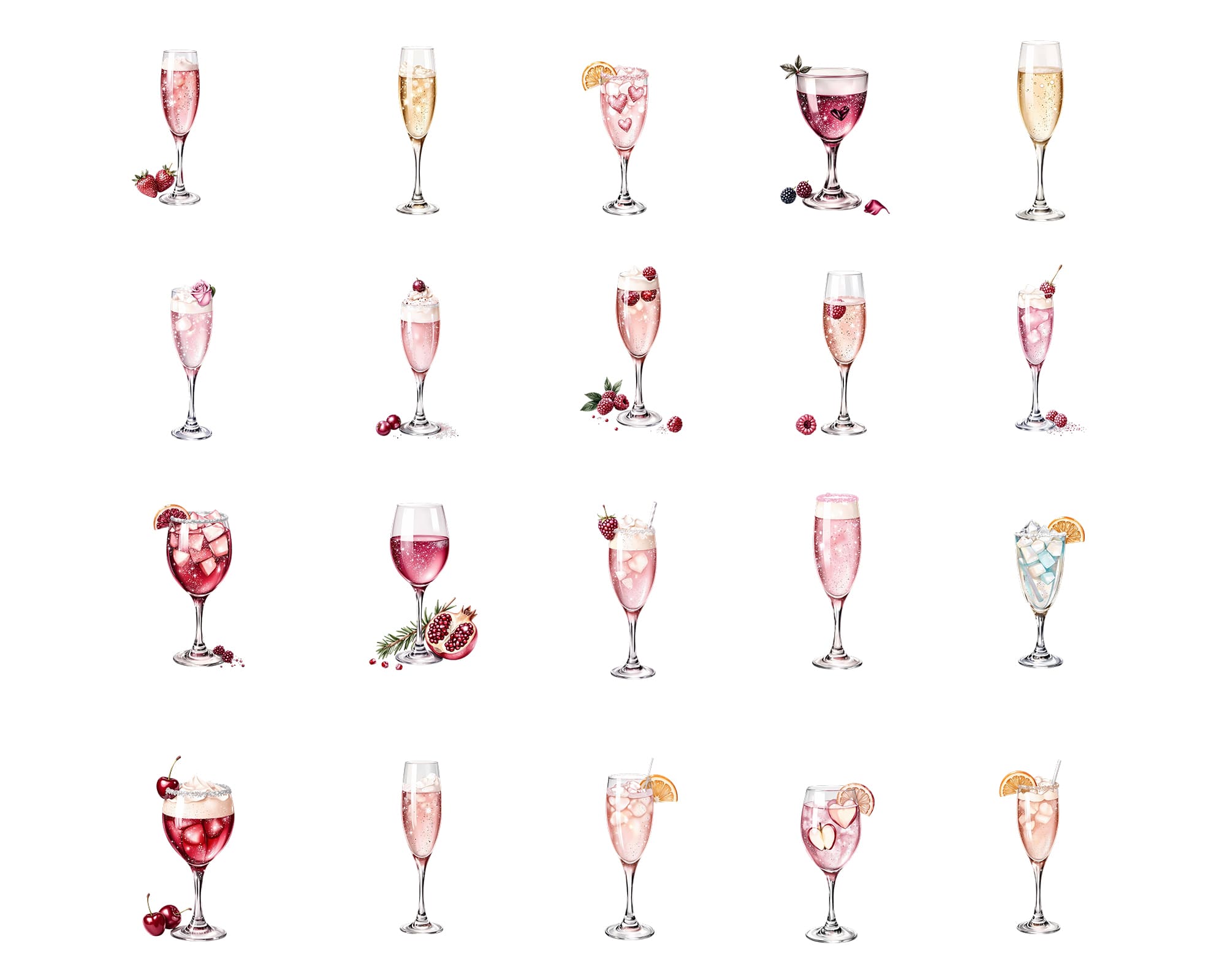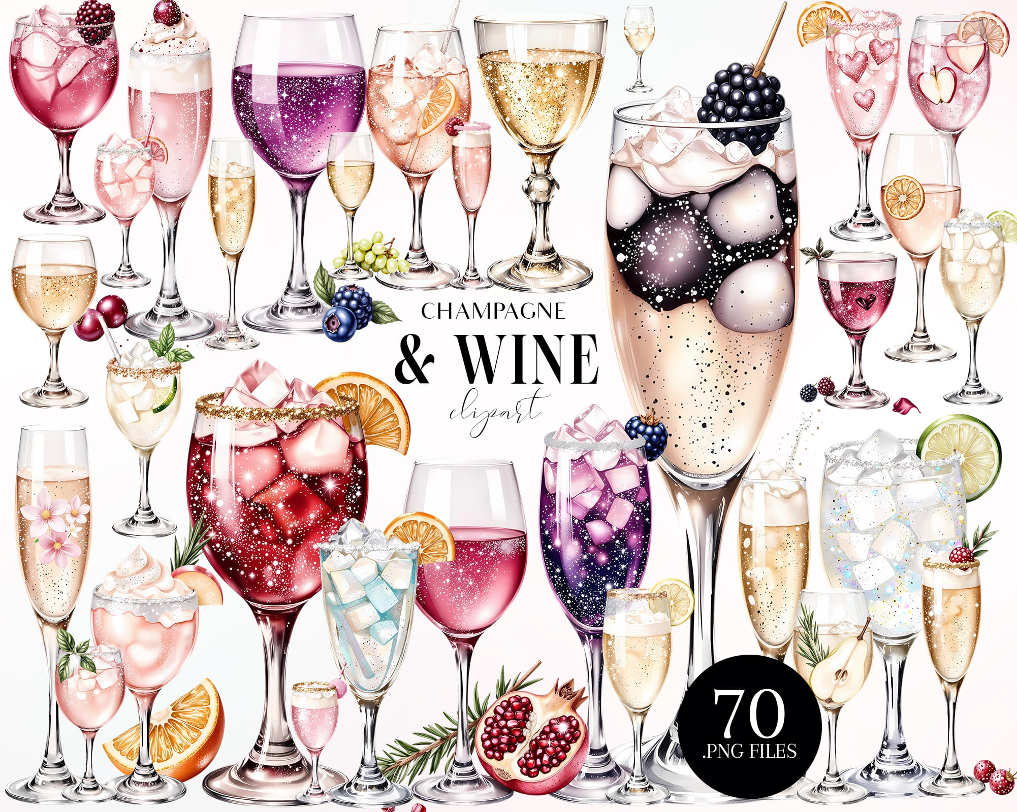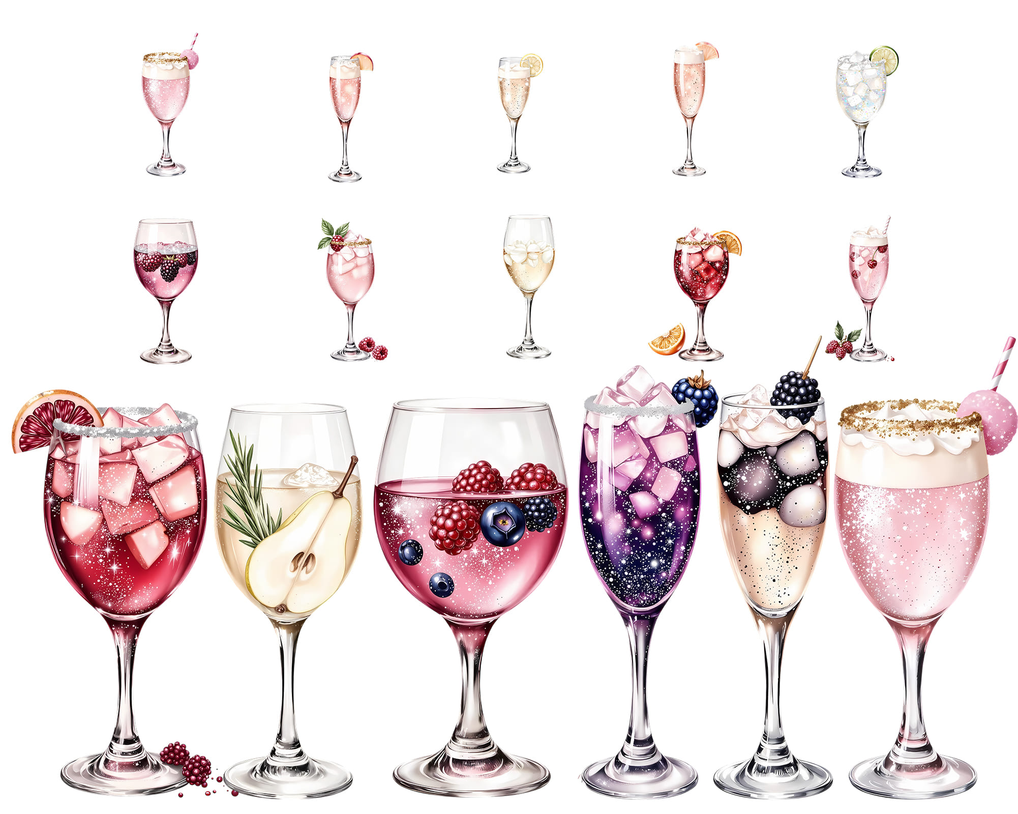 A beautiful 70-piece collection of champagne and wine PNG illustrations. Includes sparkling rosé, red wine, white wine, champagne flutes, berry garnishes, citrus slices, glitter rims, and elegant tall glasses. Great for wedding invitations, bar menus, New Year designs, stickers, and party décor.
