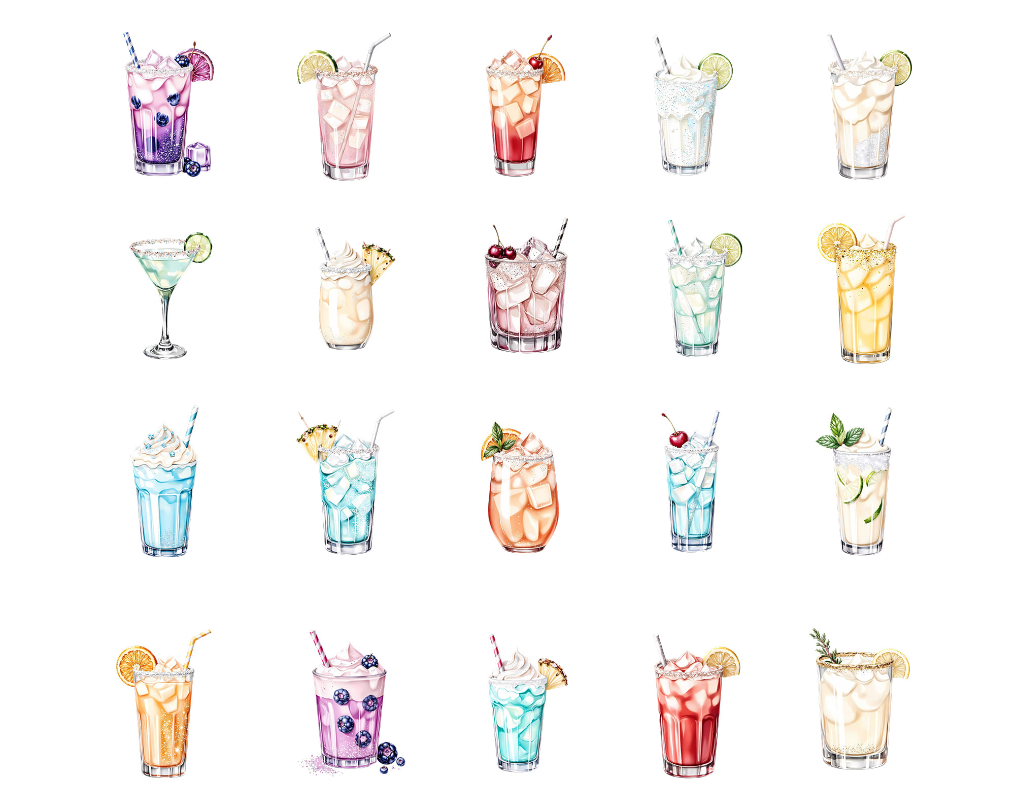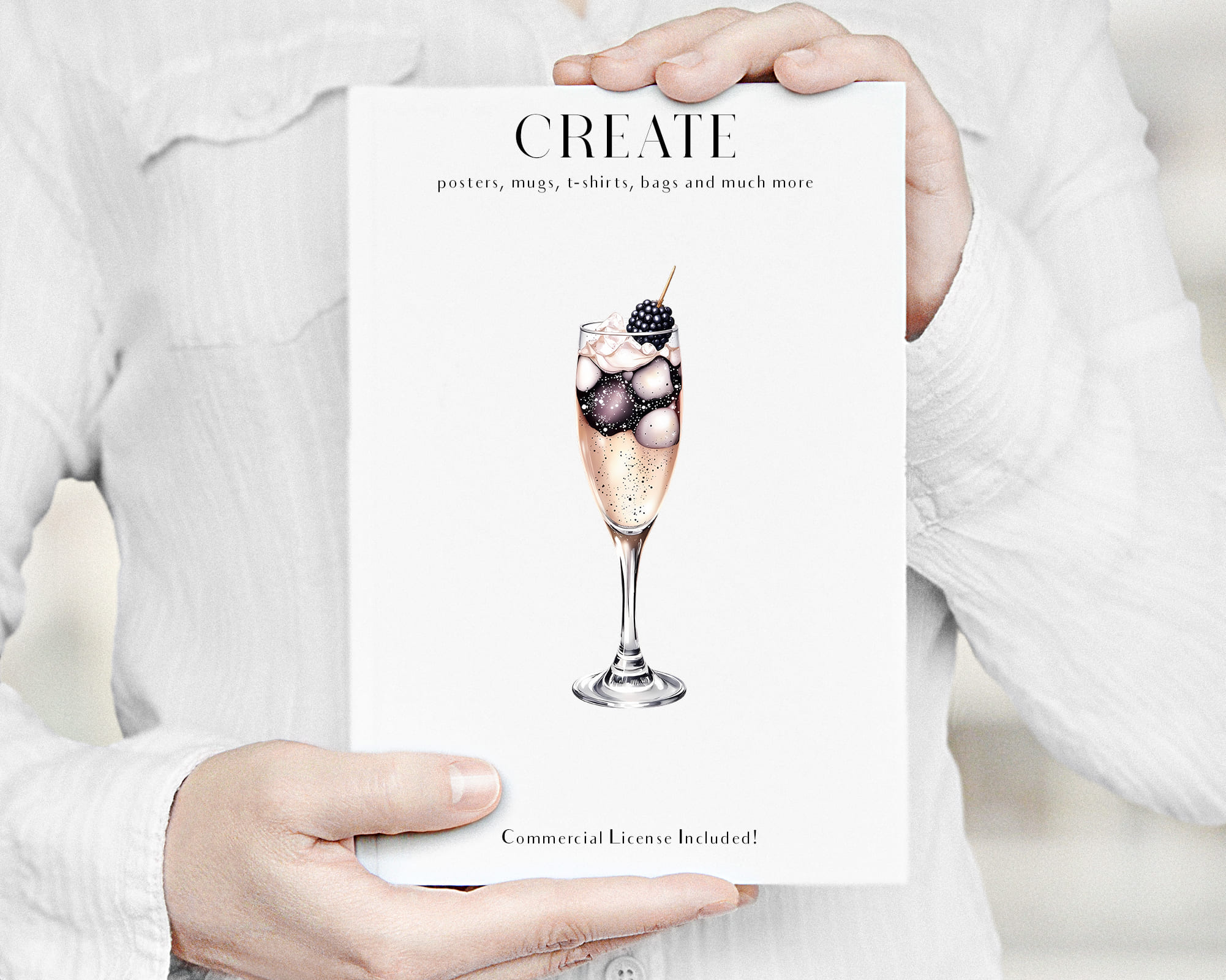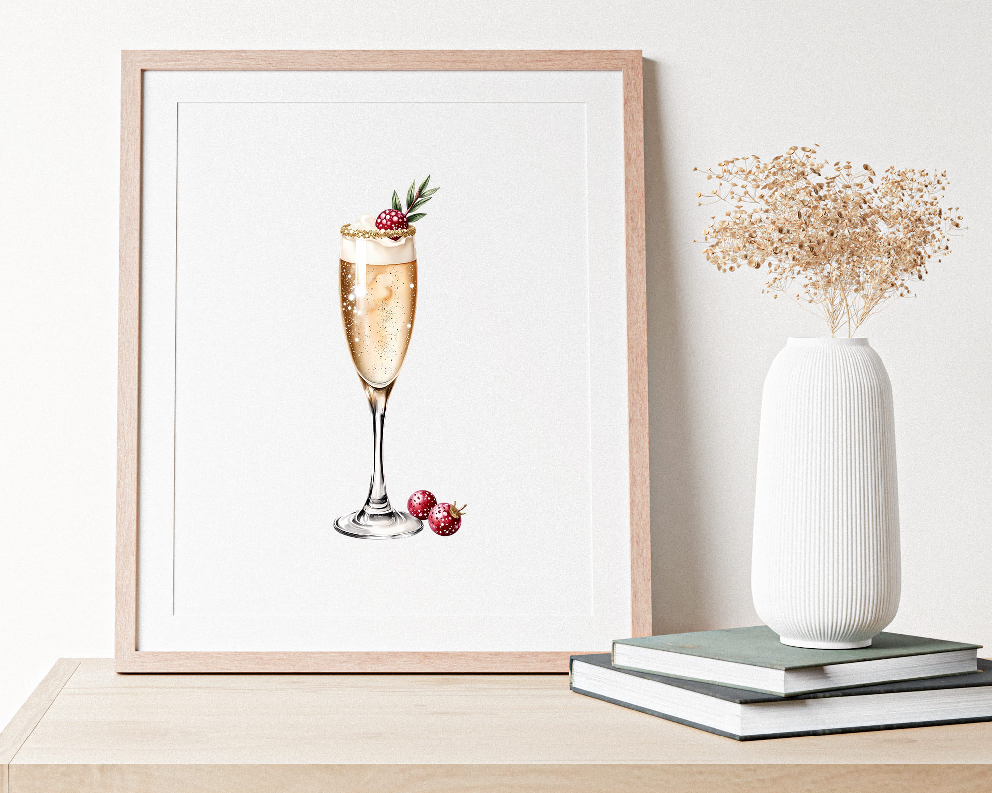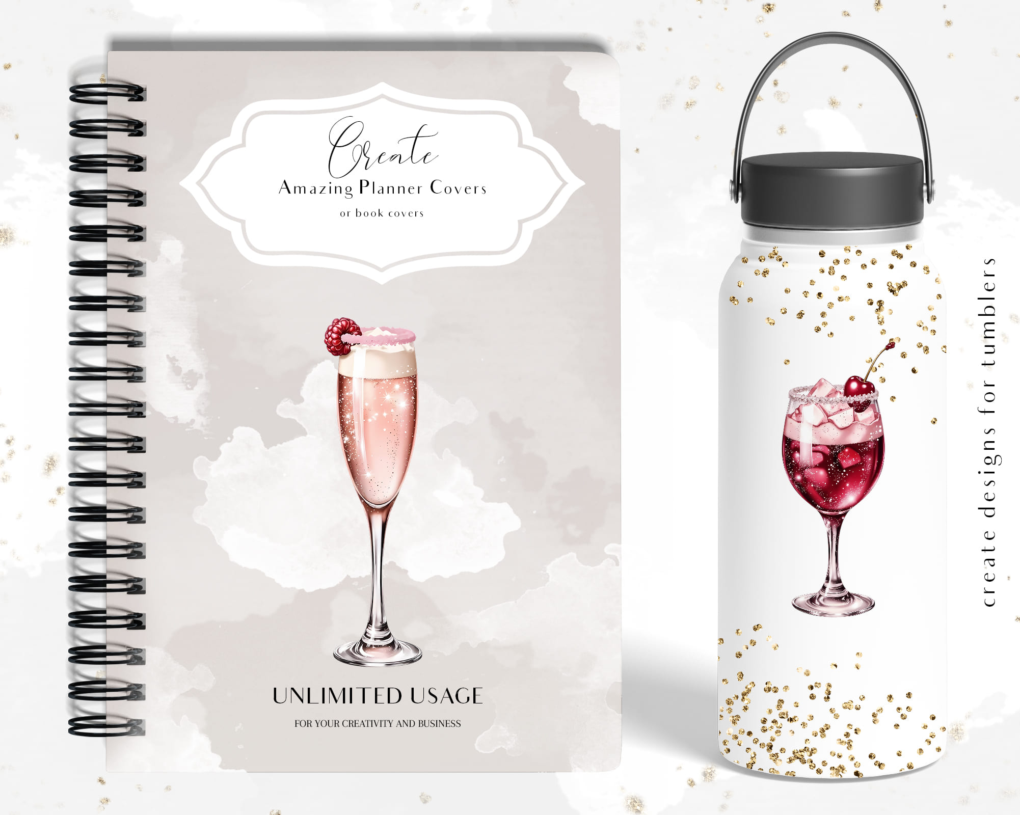 A beautiful 70-piece collection of champagne and wine PNG illustrations. Includes sparkling rosé, red wine, white wine, champagne flutes, berry garnishes, citrus slices, glitter rims, and elegant tall glasses. Great for wedding invitations, bar menus, New Year designs, stickers, and party décor.