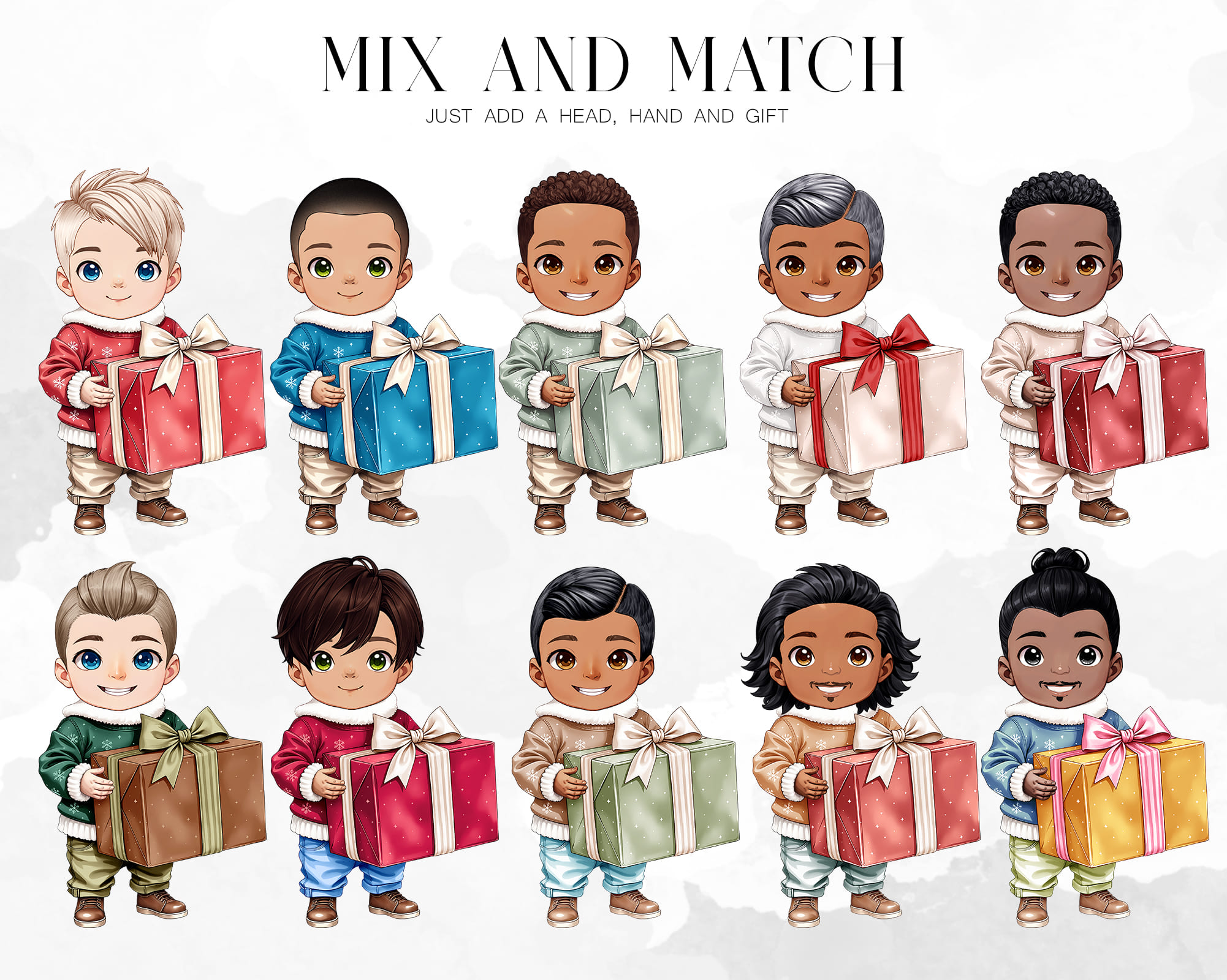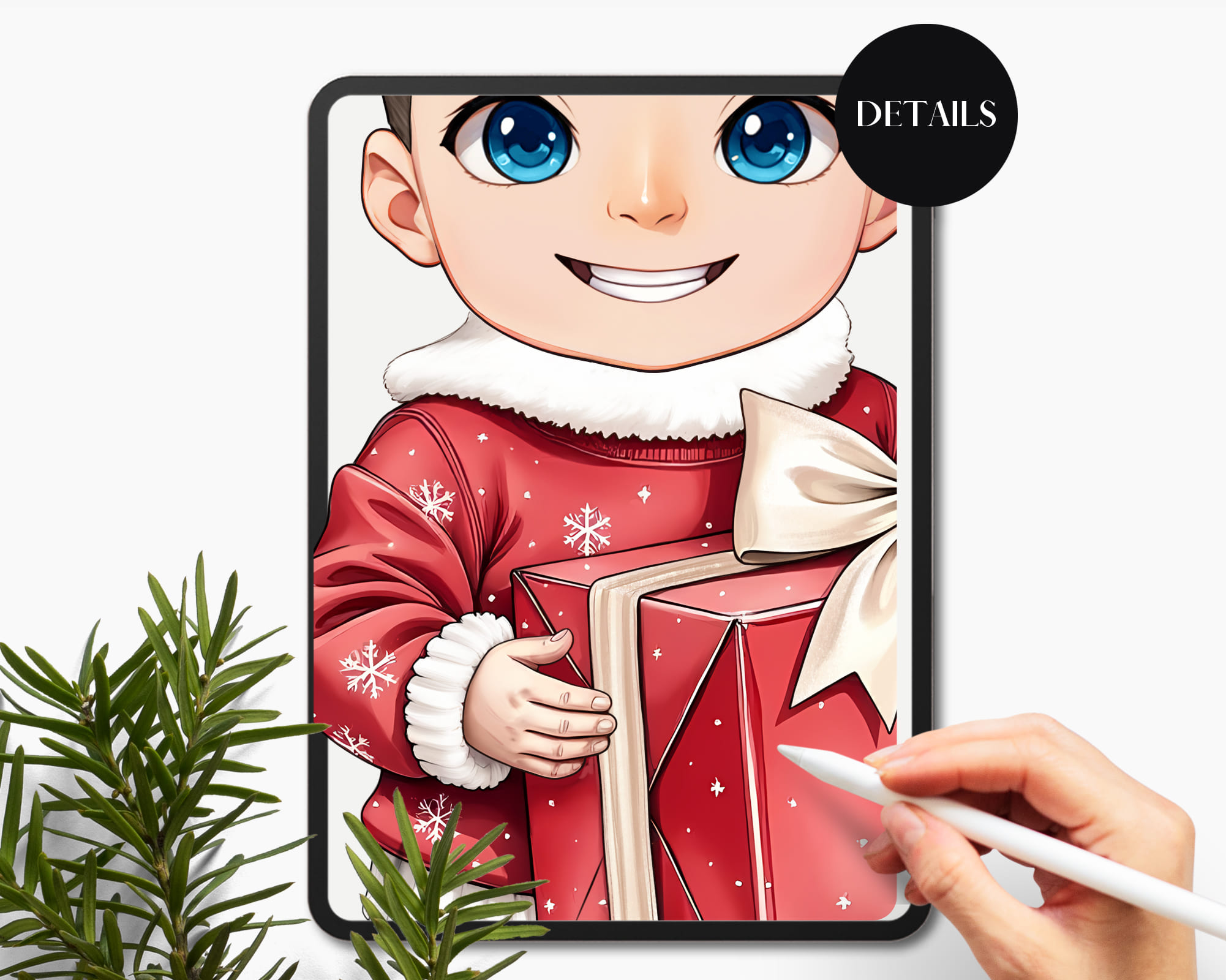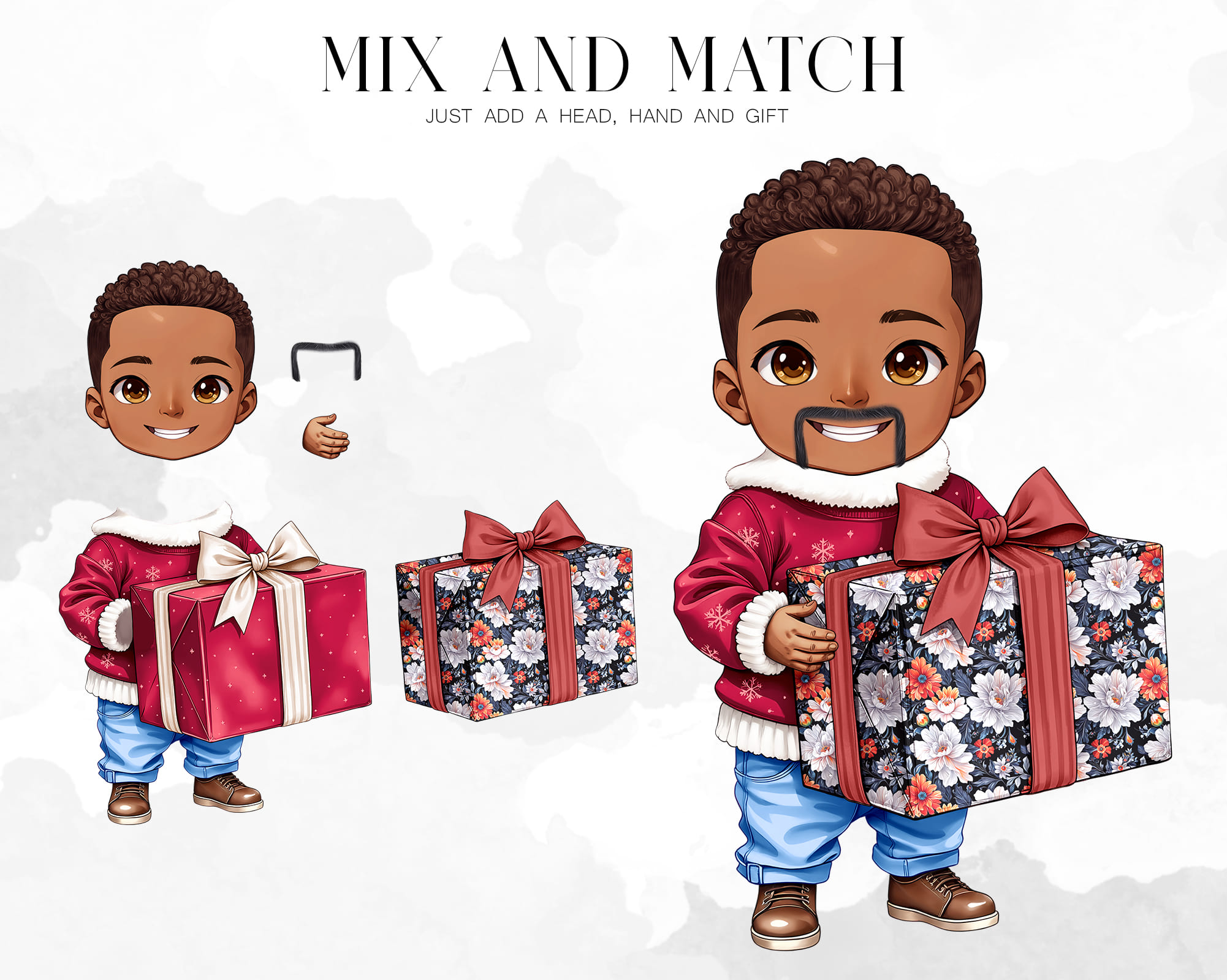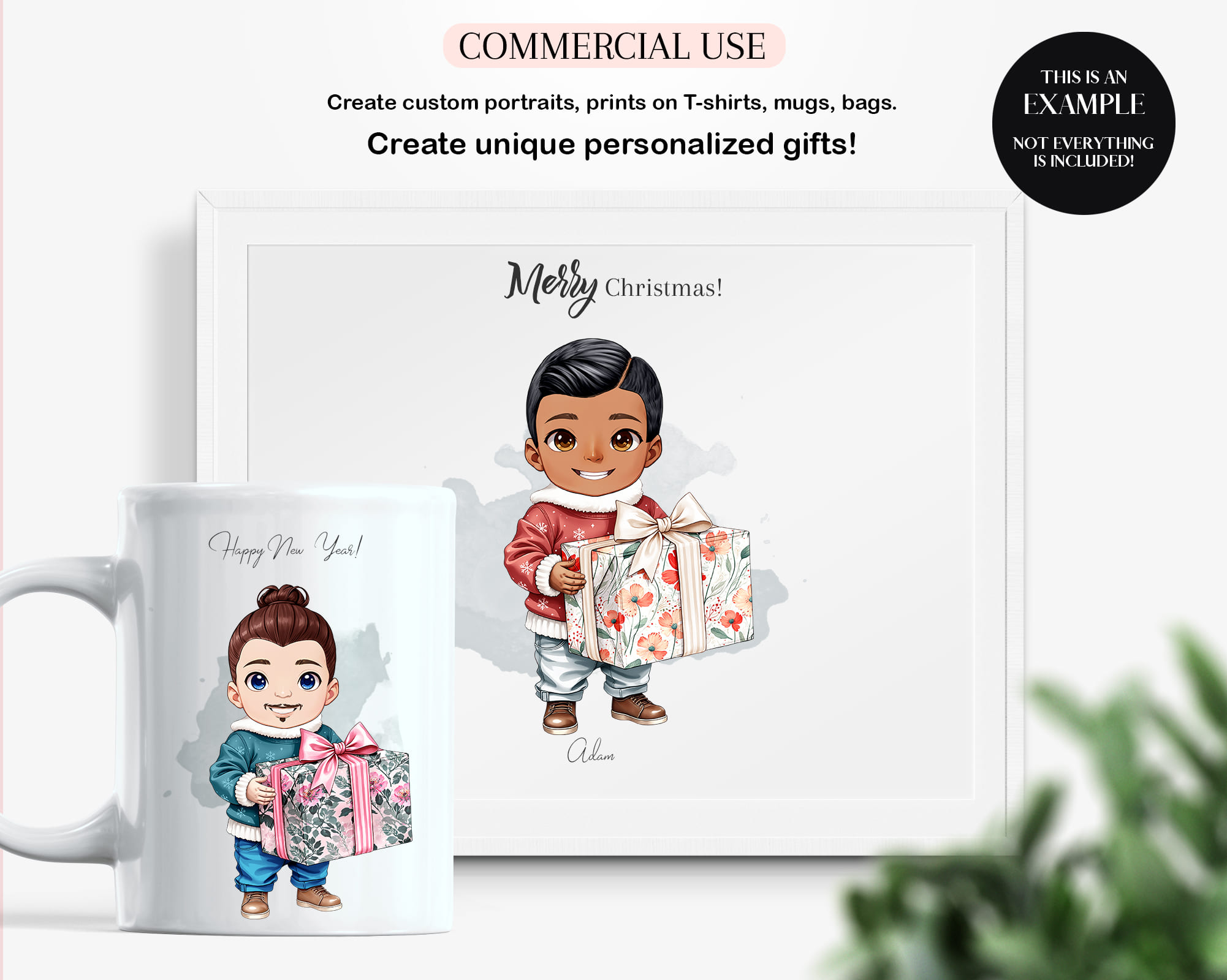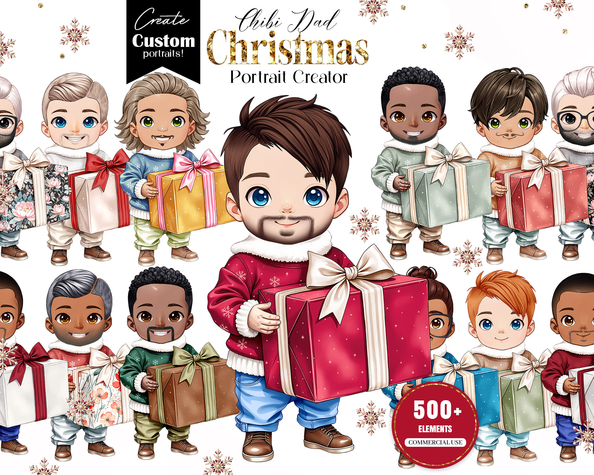 Create charming custom holiday portraits with this Chibi Dad Christmas Portrait Creator — a festive illustration kit featuring adorable dads and men holding Christmas gifts. Perfect for family portraits, holiday cards, ornaments, stickers, planners, invitations, and personalized Christmas artwork.