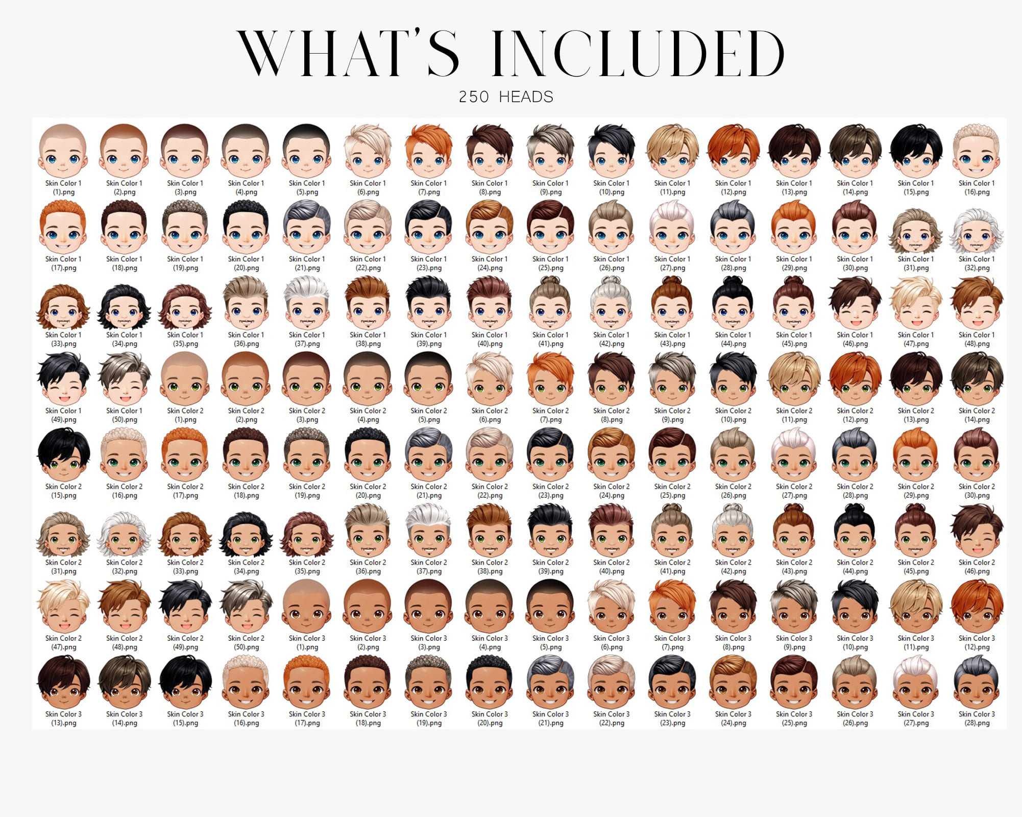 This bundle includes 500+ elements, with 21 male bodies, 13 gift designs, 5 hand options, 250 male heads in diverse hairstyles and expressions, plus beards, caps, sunglasses, and eye variations for full customization.