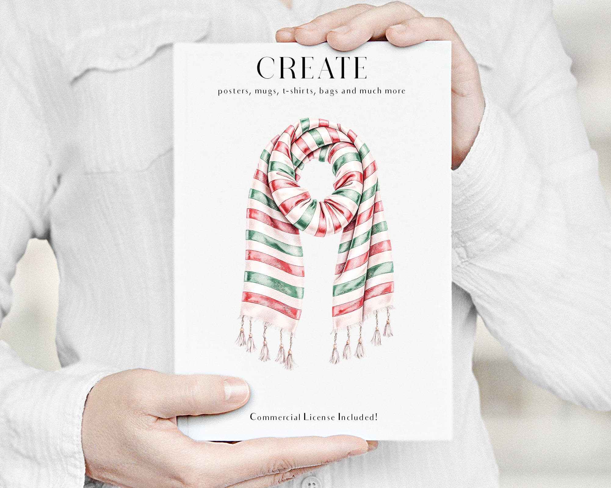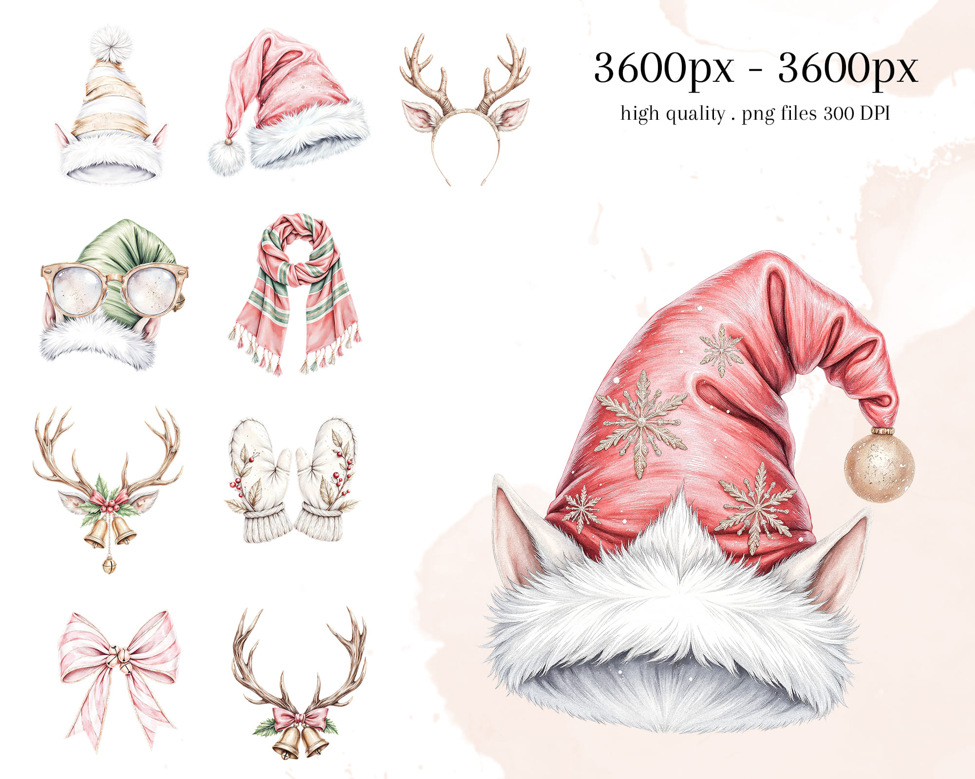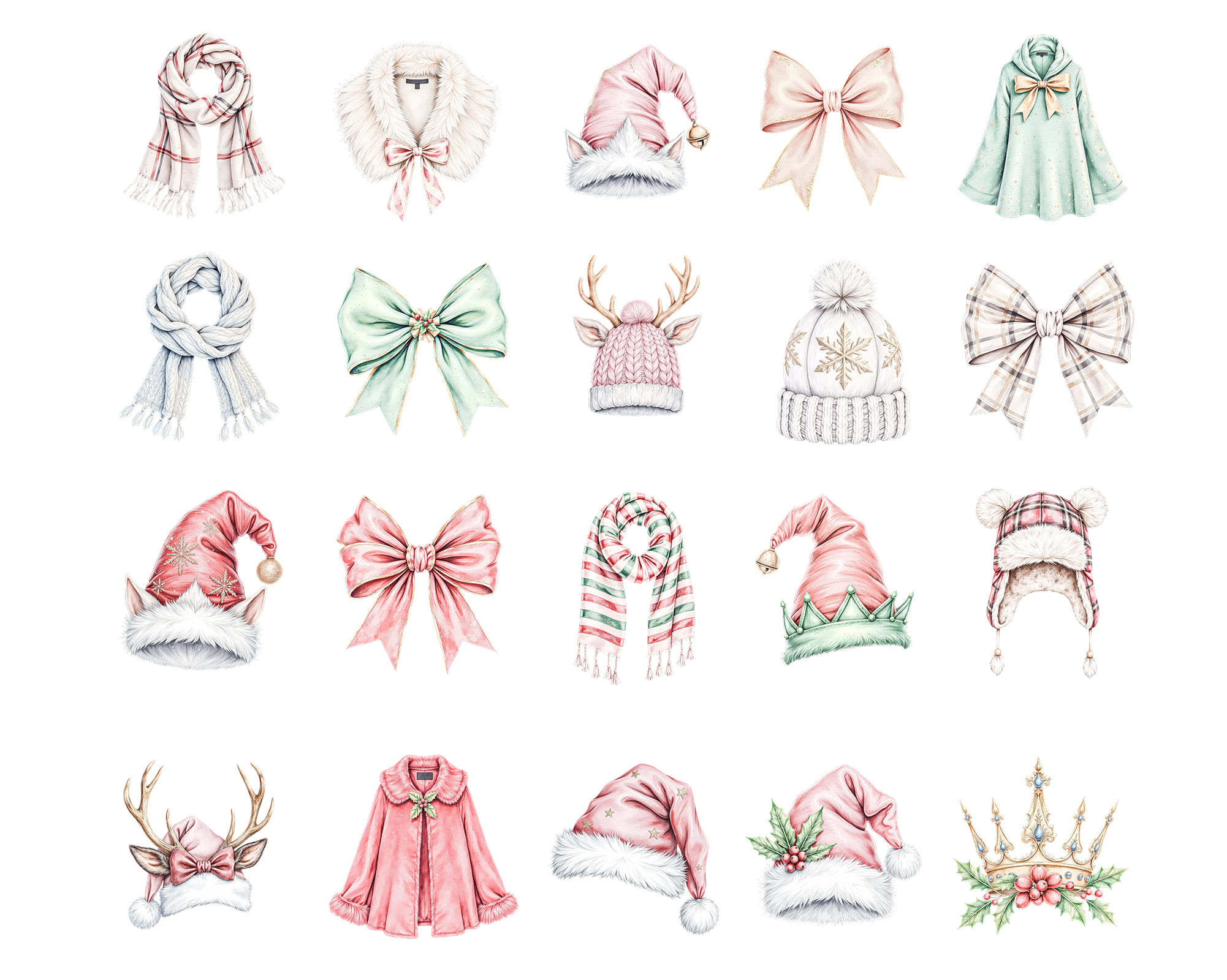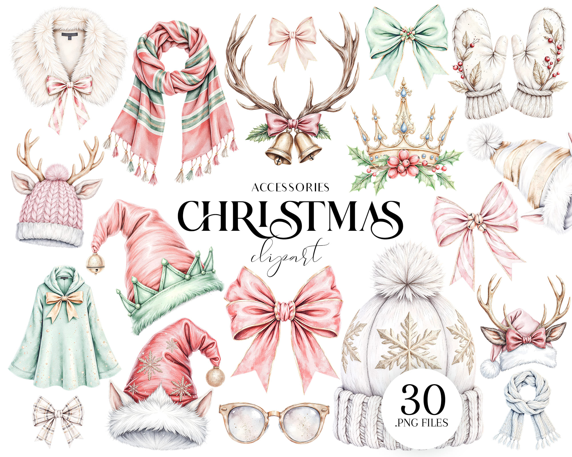 Christmas Accessories Clipart features 30 elegant holiday accessories such as Santa hats, scarves, bows, and winter clothing. Each PNG is high resolution (300 DPI) with transparent background.