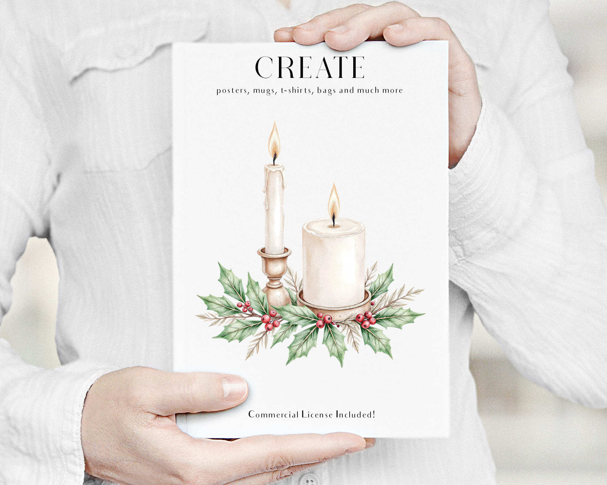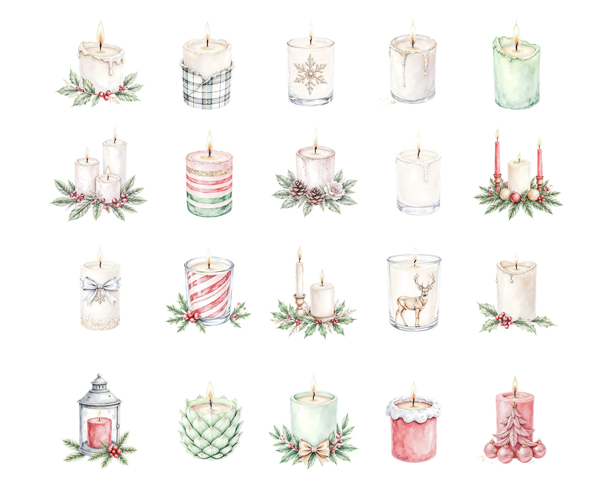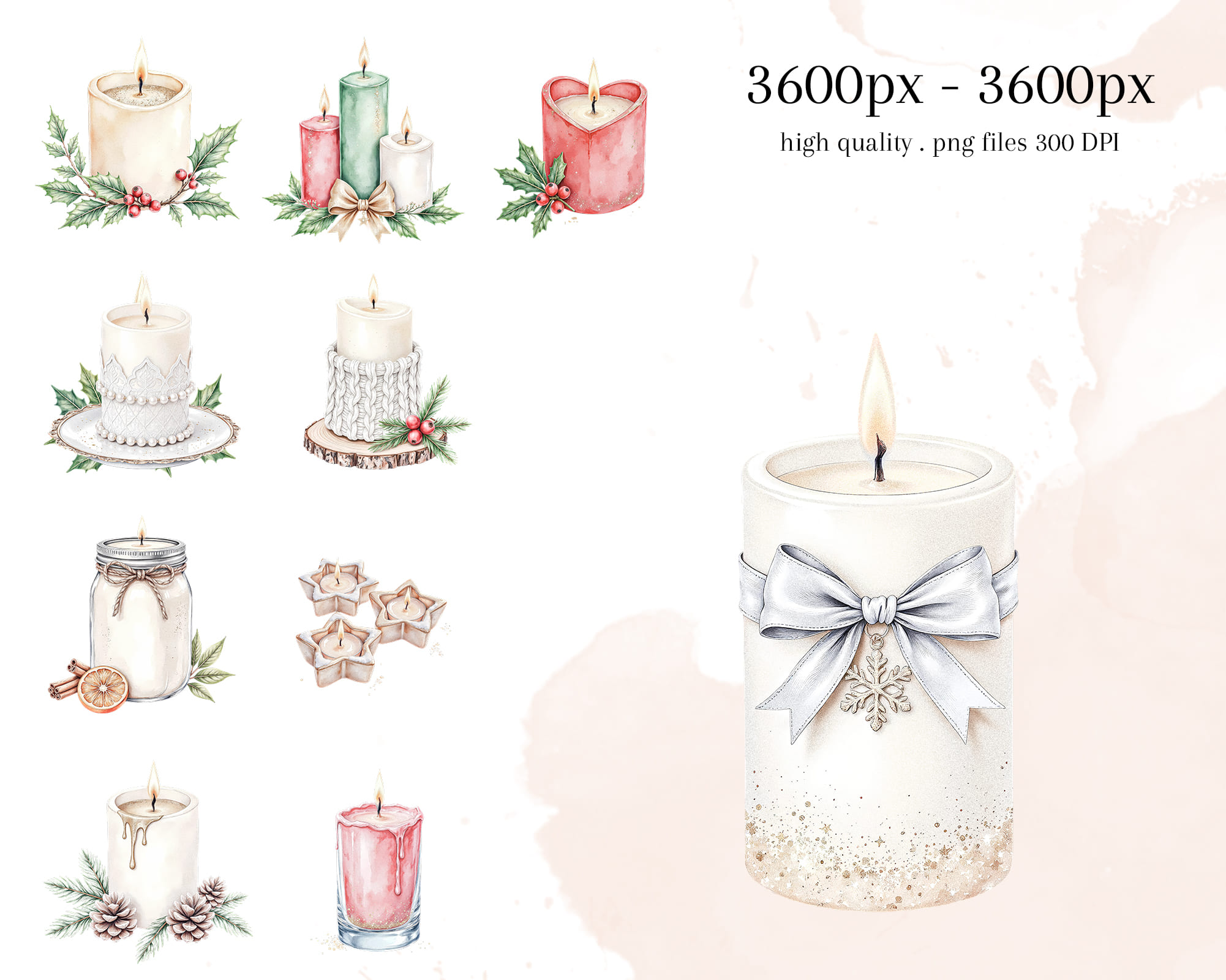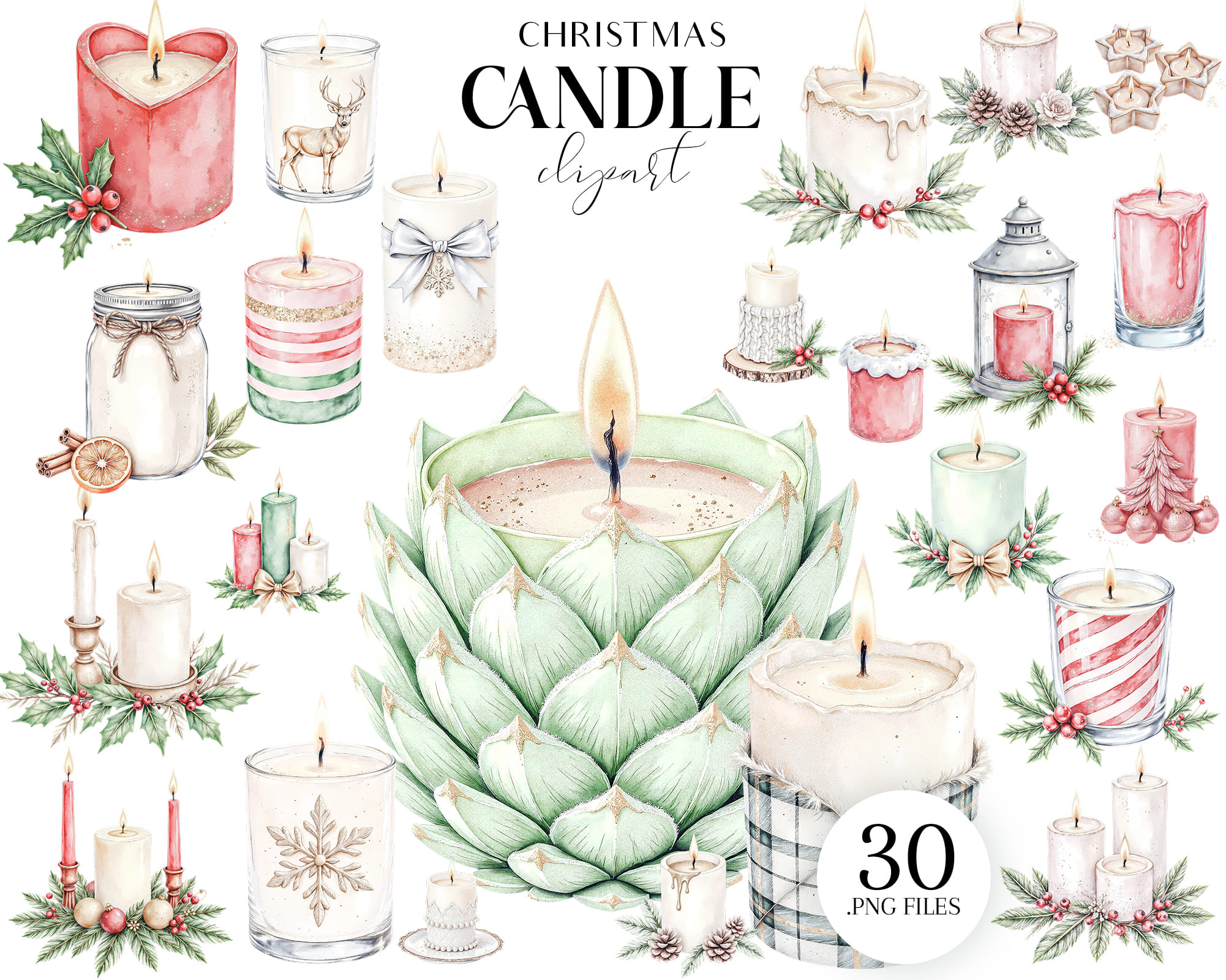 Christmas Candle Clipart includes 30 festive candle illustrations in PNG format. Each file is high resolution (300 DPI) with transparent background.