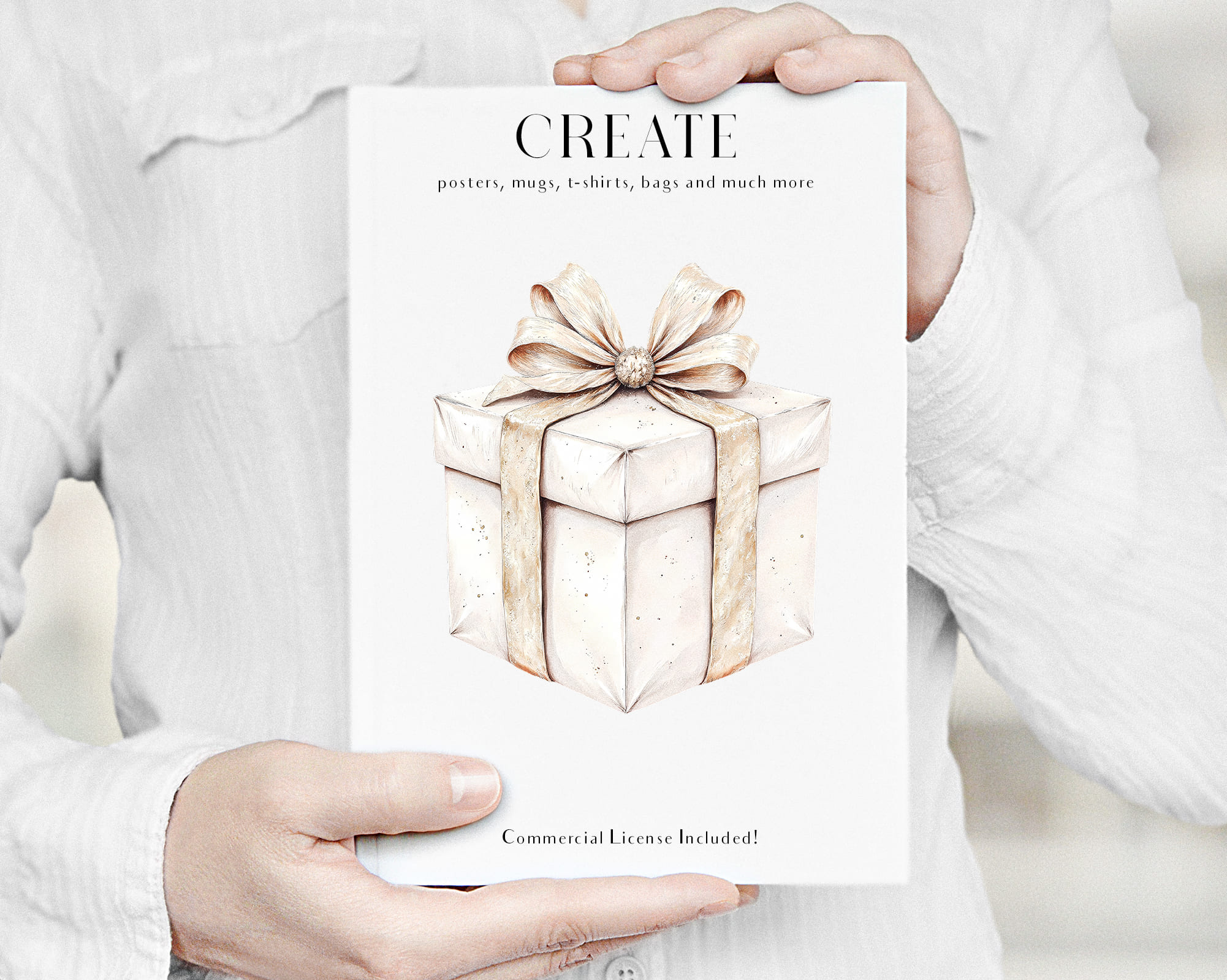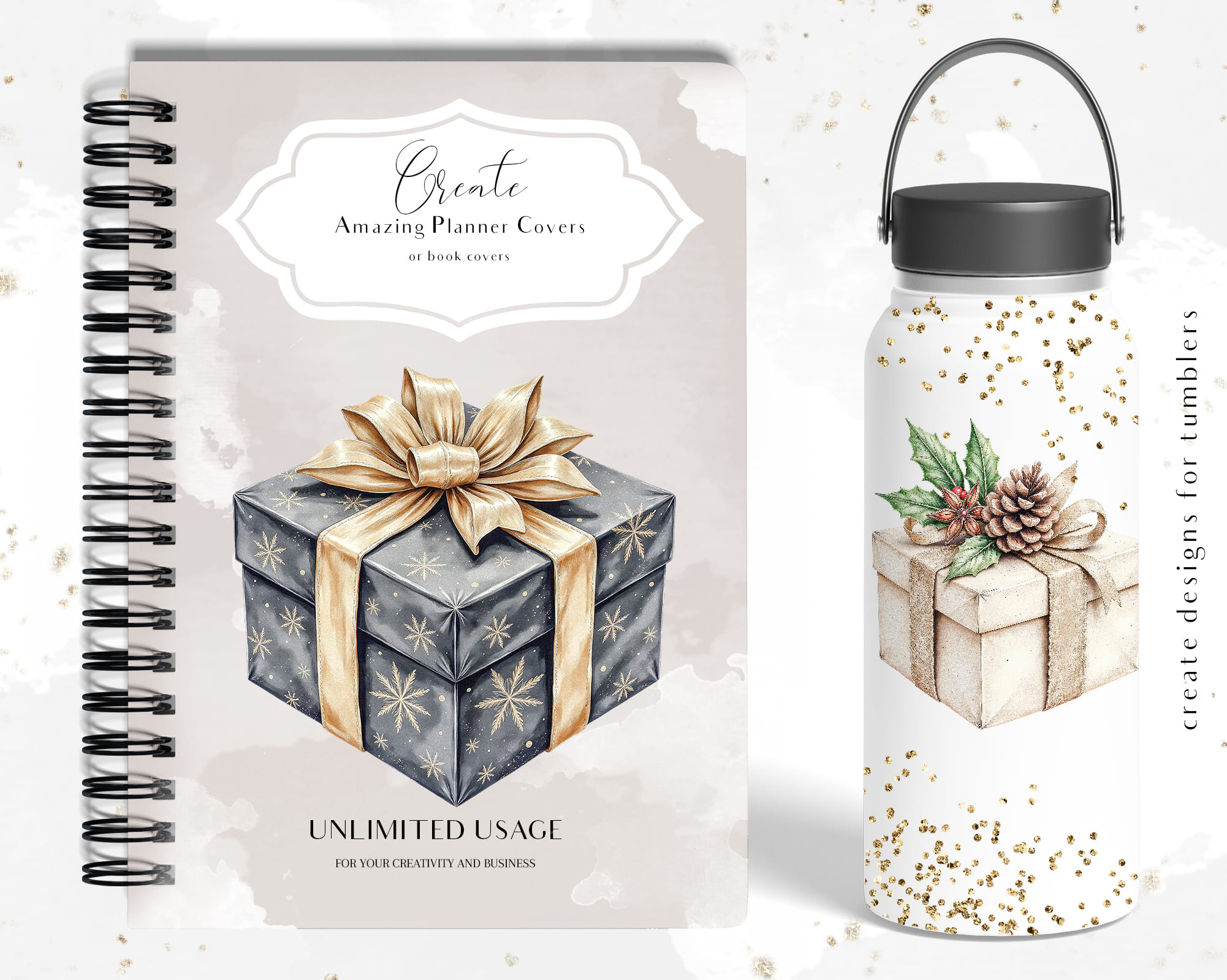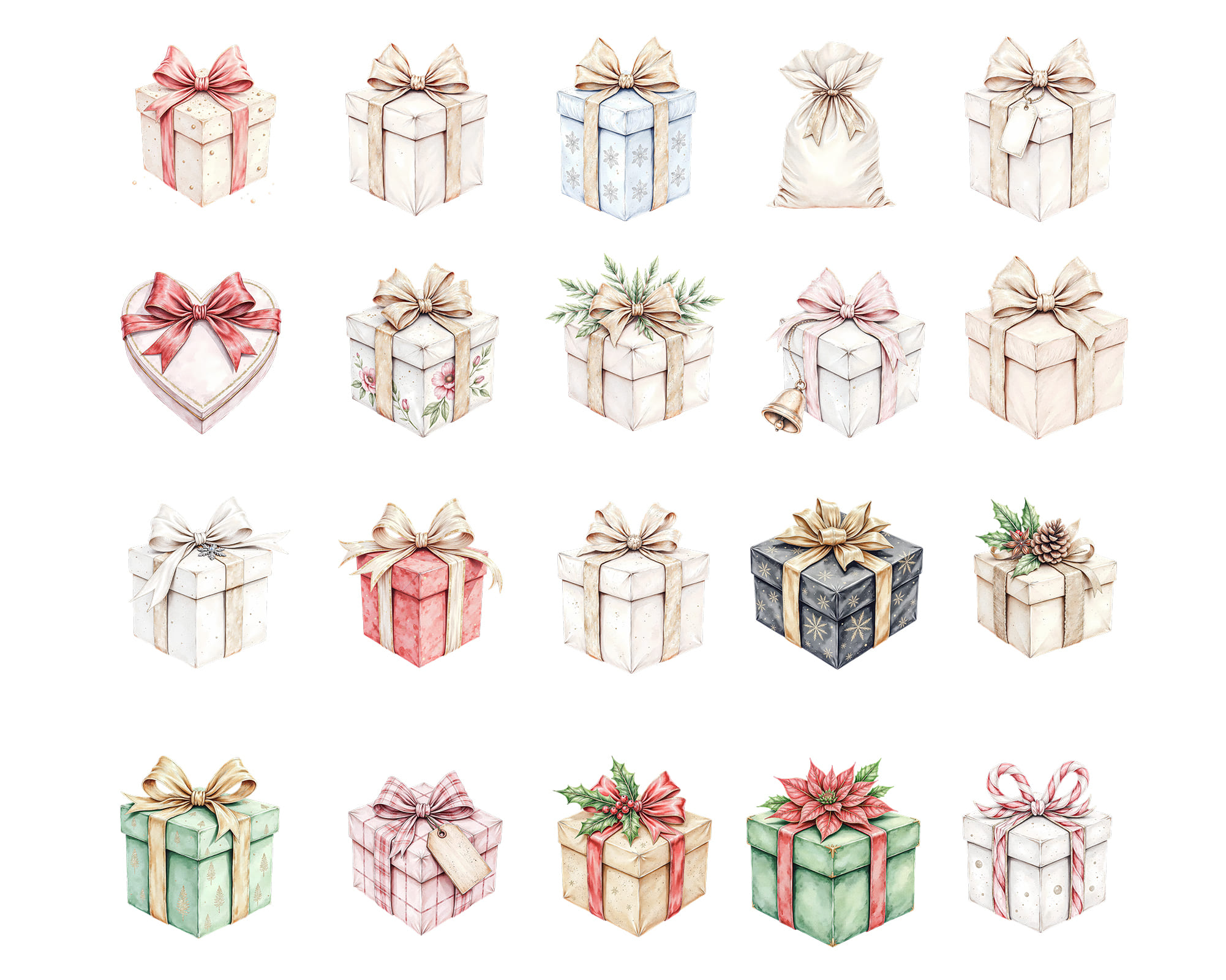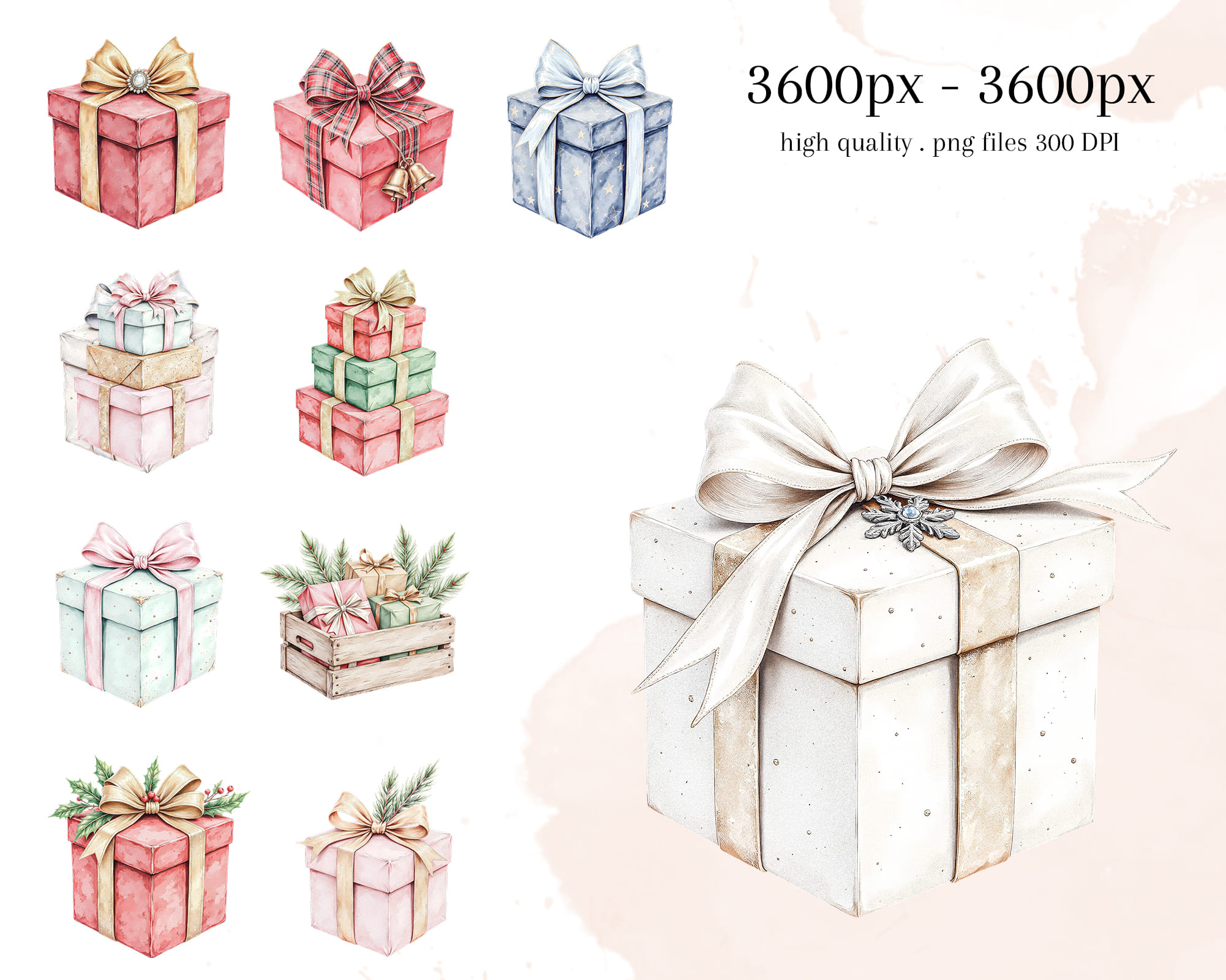 Christmas Gifts Clipart includes 30 festive gift box illustrations in PNG format. All images are 300 DPI with transparent backgrounds.