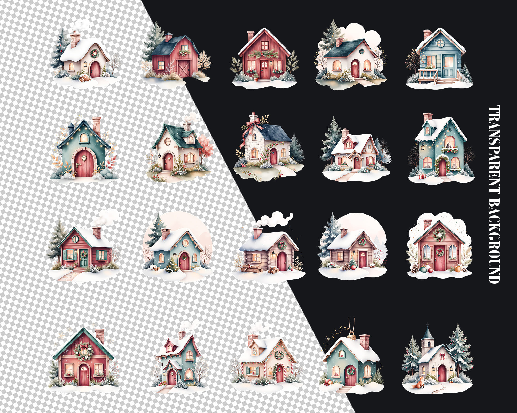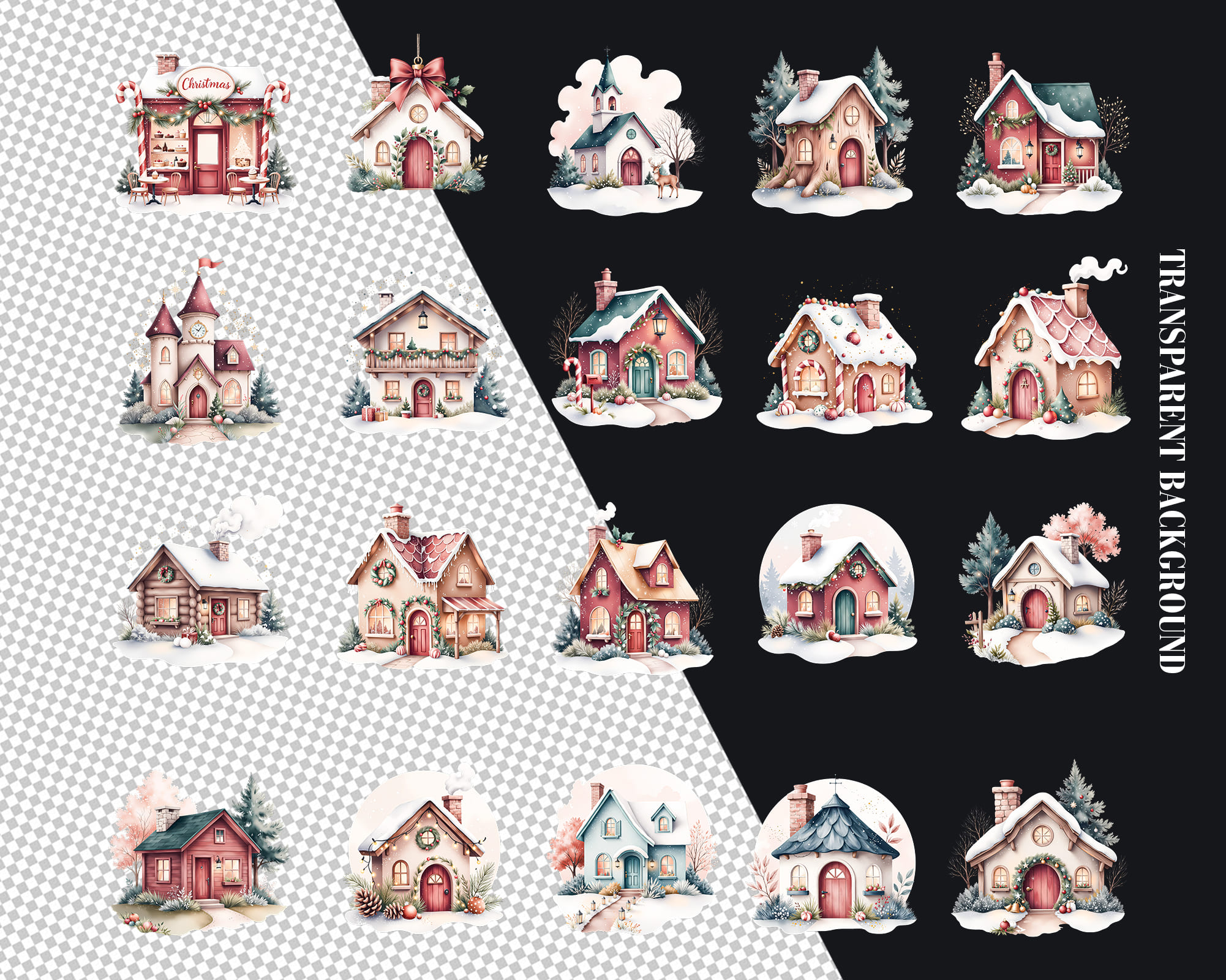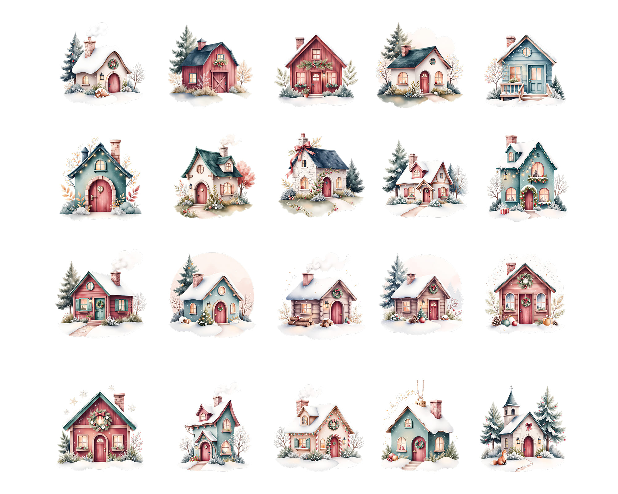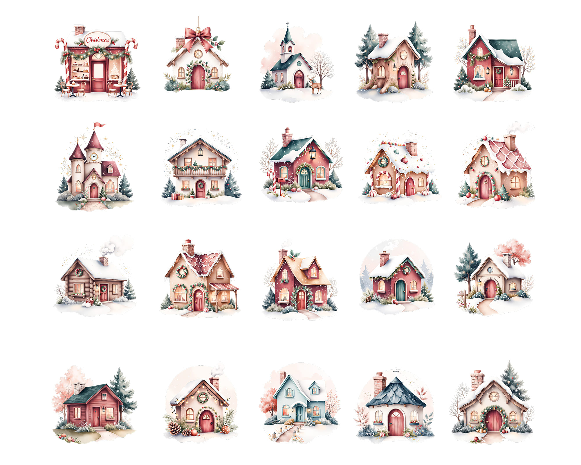 A dreamy Christmas Houses clipart bundle featuring 50 PNG illustrations of snowy cottages and festive village buildings. The set includes cozy homes, churches, cafes, cabins, decorated doors, trees, wreaths, lights and charming winter landscapes. Perfect for cards, wall art, planners, stickers, wrapping paper, advent calendars, sublimation and branding for holiday shops and bakeries. All graphics are provided as high‑quality transparent PNG files.