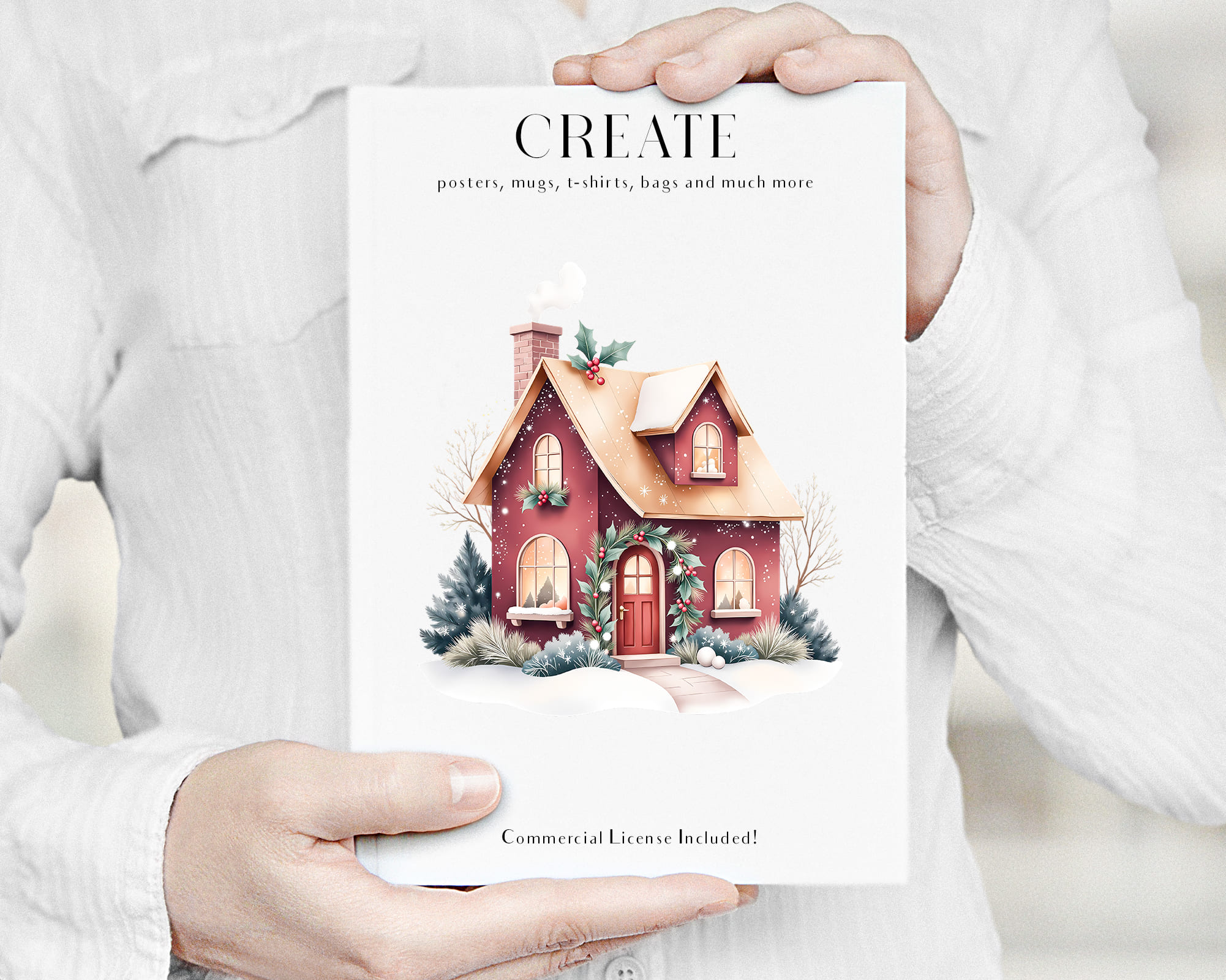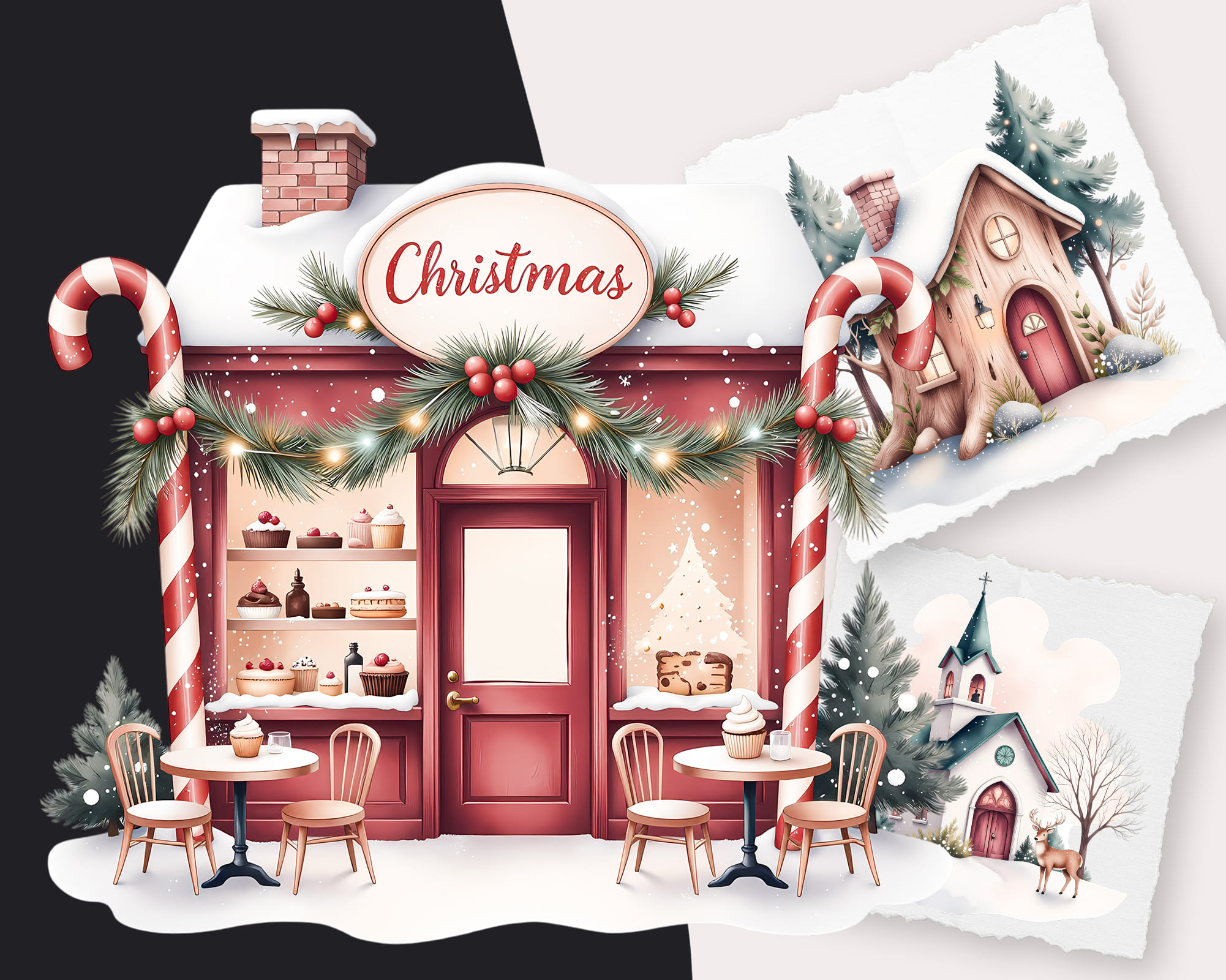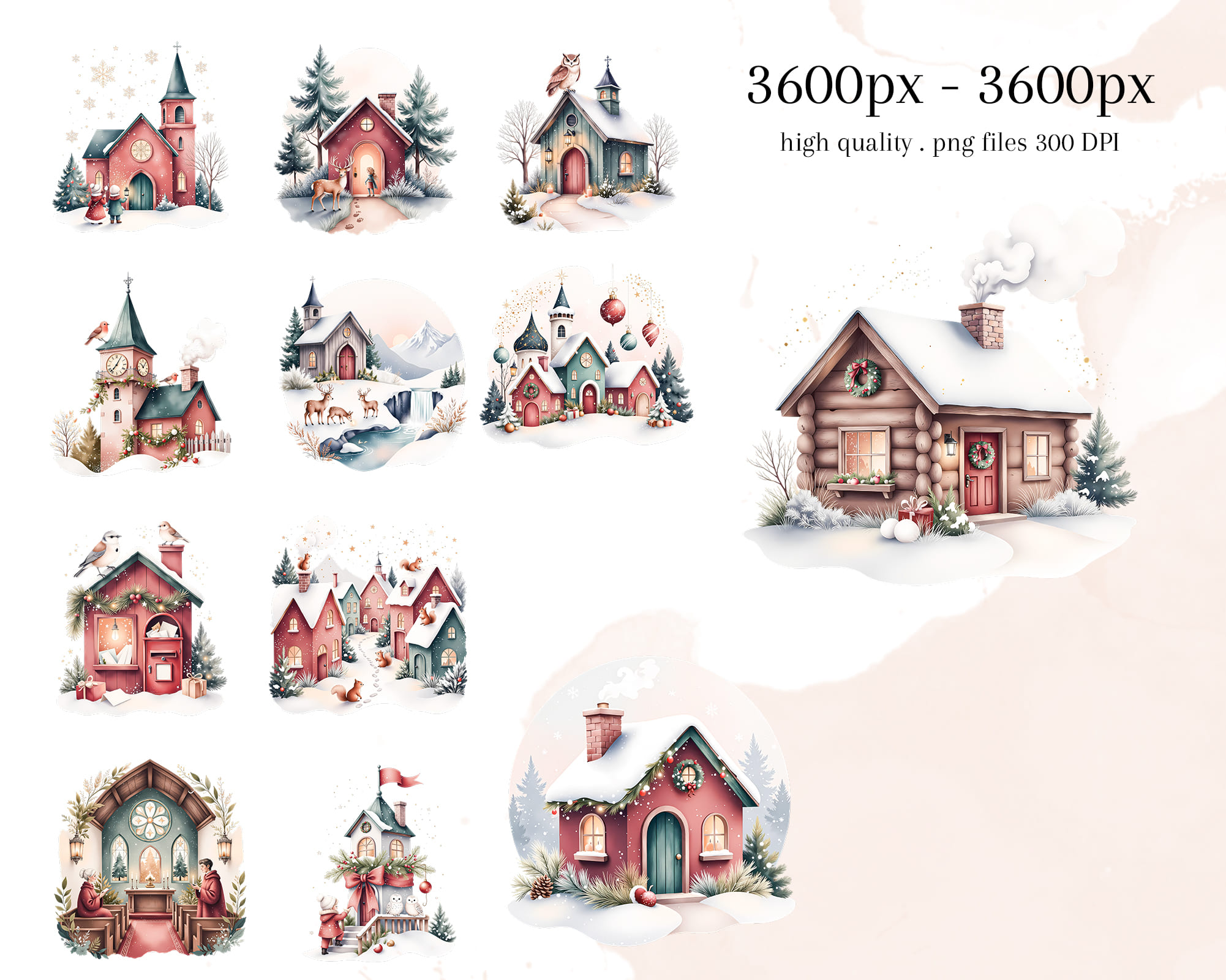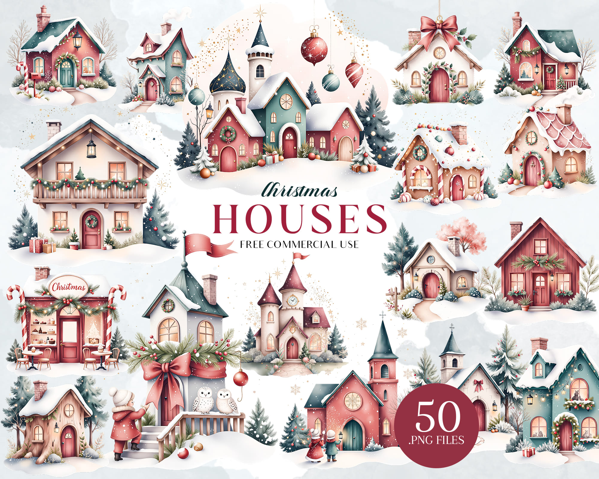 A dreamy Christmas Houses clipart bundle featuring 50 PNG illustrations of snowy cottages and festive village buildings. The set includes cozy homes, churches, cafes, cabins, decorated doors, trees, wreaths, lights and charming winter landscapes. Perfect for cards, wall art, planners, stickers, wrapping paper, advent calendars, sublimation and branding for holiday shops and bakeries. All graphics are provided as high‑quality transparent PNG files.
