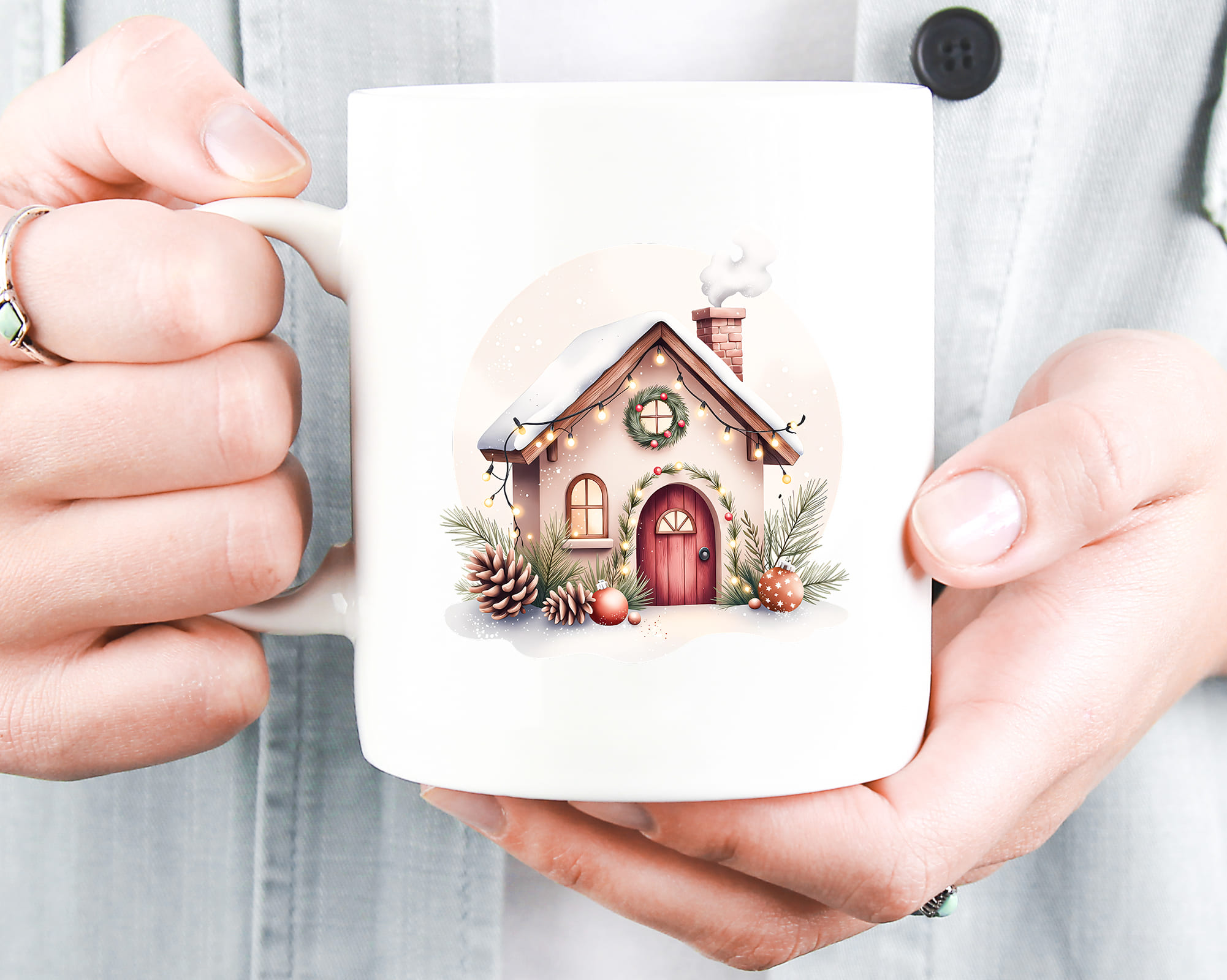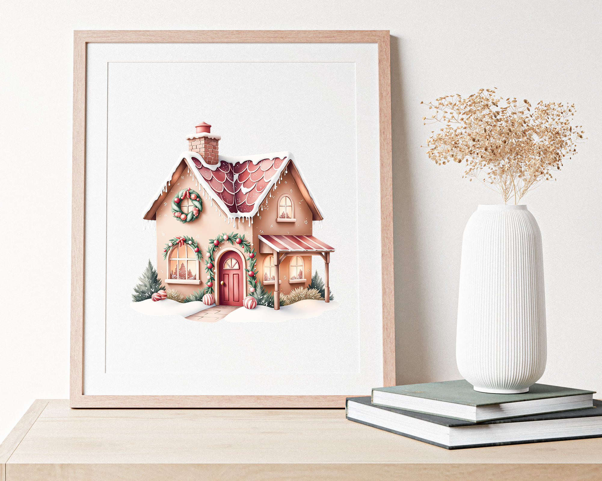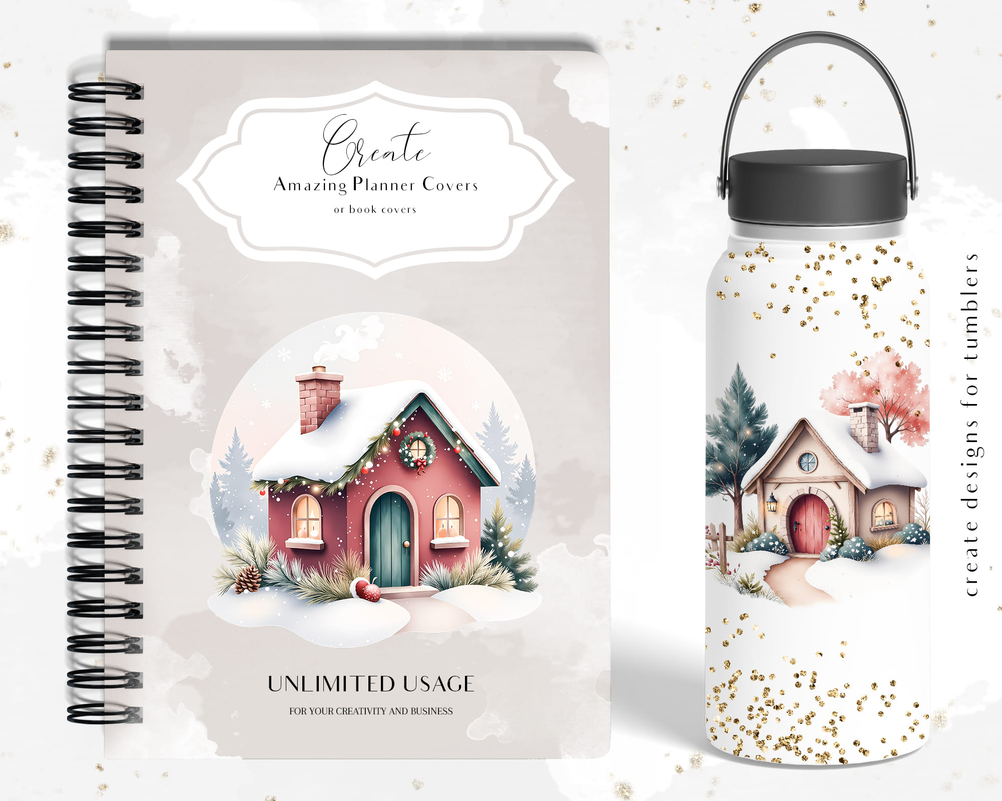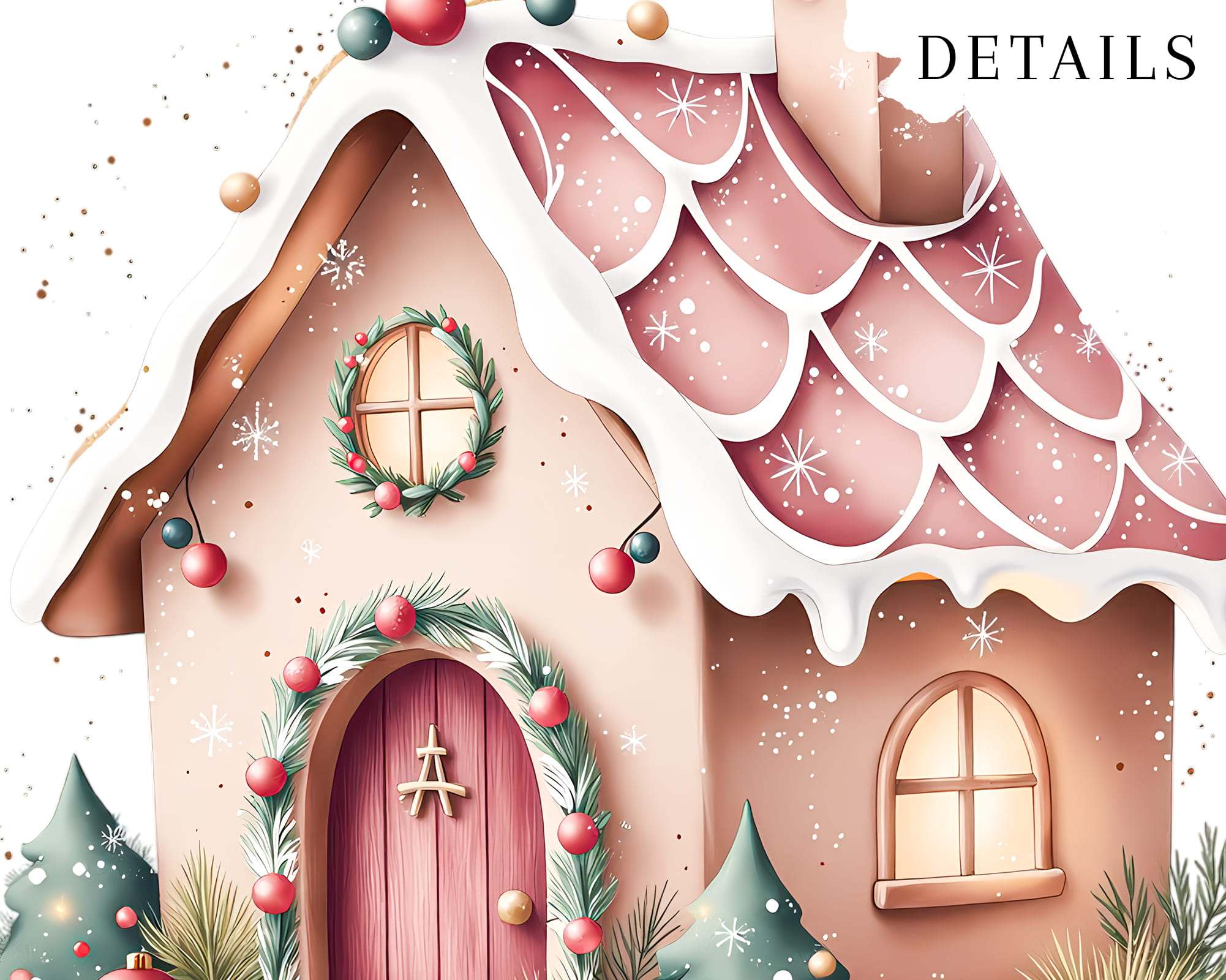 A dreamy Christmas Houses clipart bundle featuring 50 PNG illustrations of snowy cottages and festive village buildings. The set includes cozy homes, churches, cafes, cabins, decorated doors, trees, wreaths, lights and charming winter landscapes. Perfect for cards, wall art, planners, stickers, wrapping paper, advent calendars, sublimation and branding for holiday shops and bakeries. All graphics are provided as high‑quality transparent PNG files.
