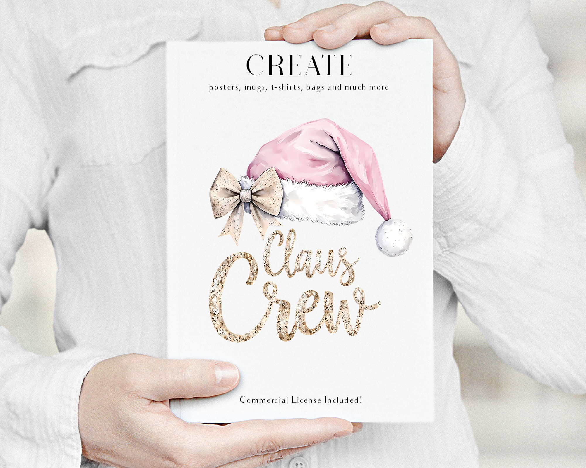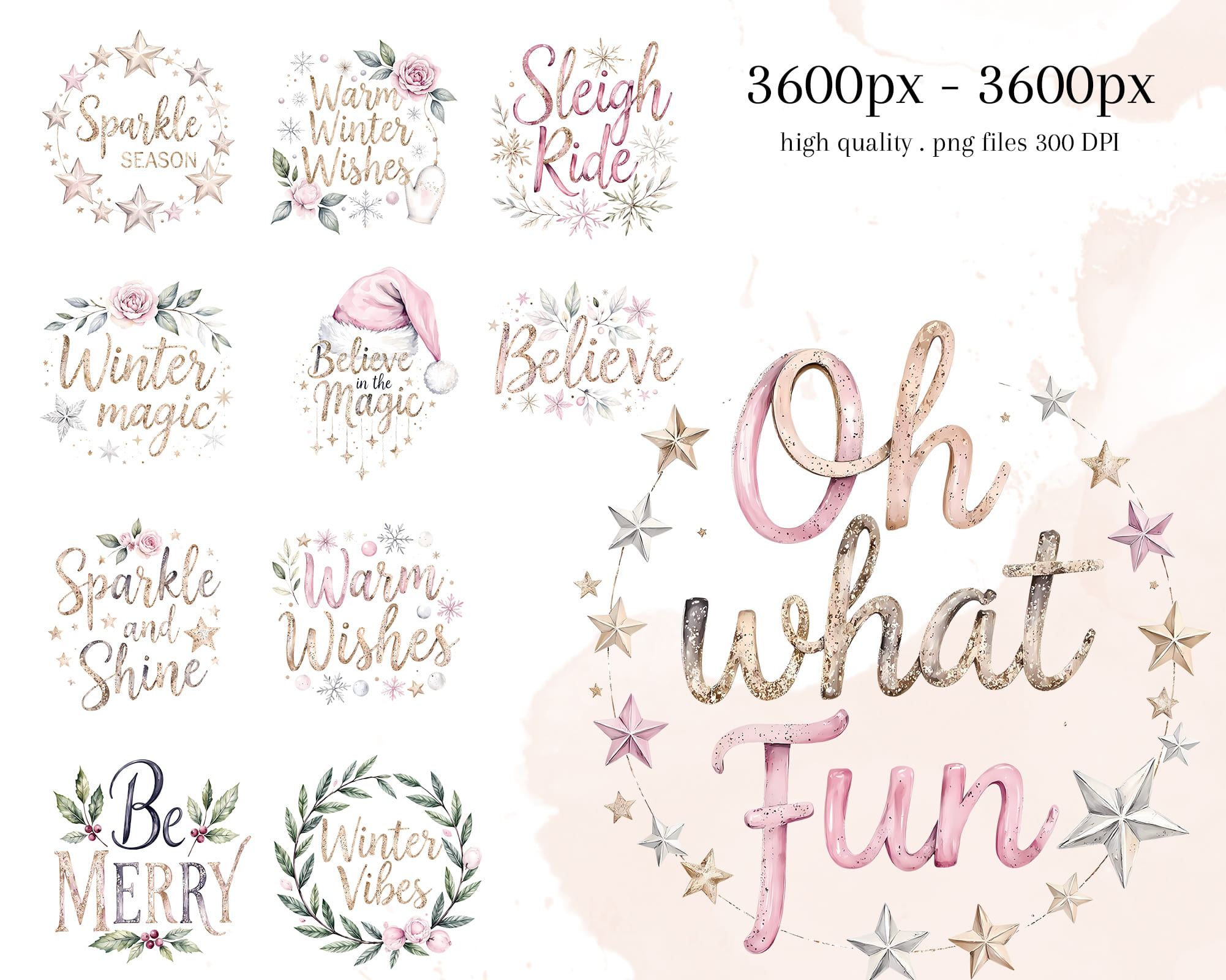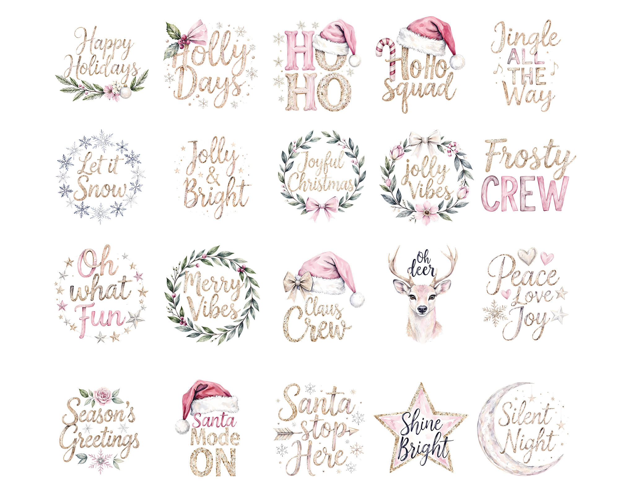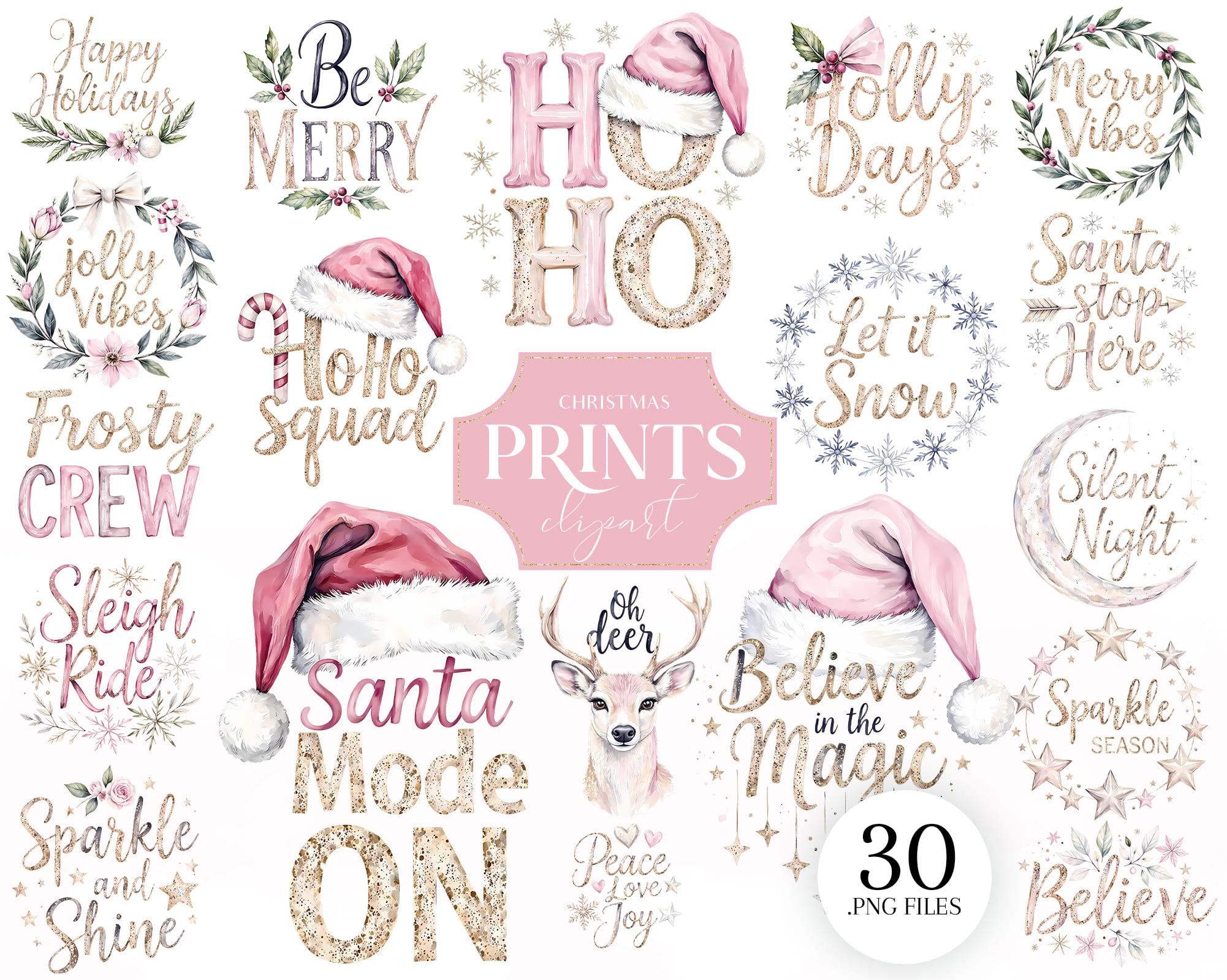 Festive pastel Christmas Prints clipart set with Ho Ho Ho letters, Santa hats, wreaths, snowflakes, and holiday quotes like Jolly Vibes and Jingle All the Way. Perfect for Christmas cards, mugs, t-shirts, scrapbooking, and winter crafts. Includes 30 PNG files with transparent backgrounds.