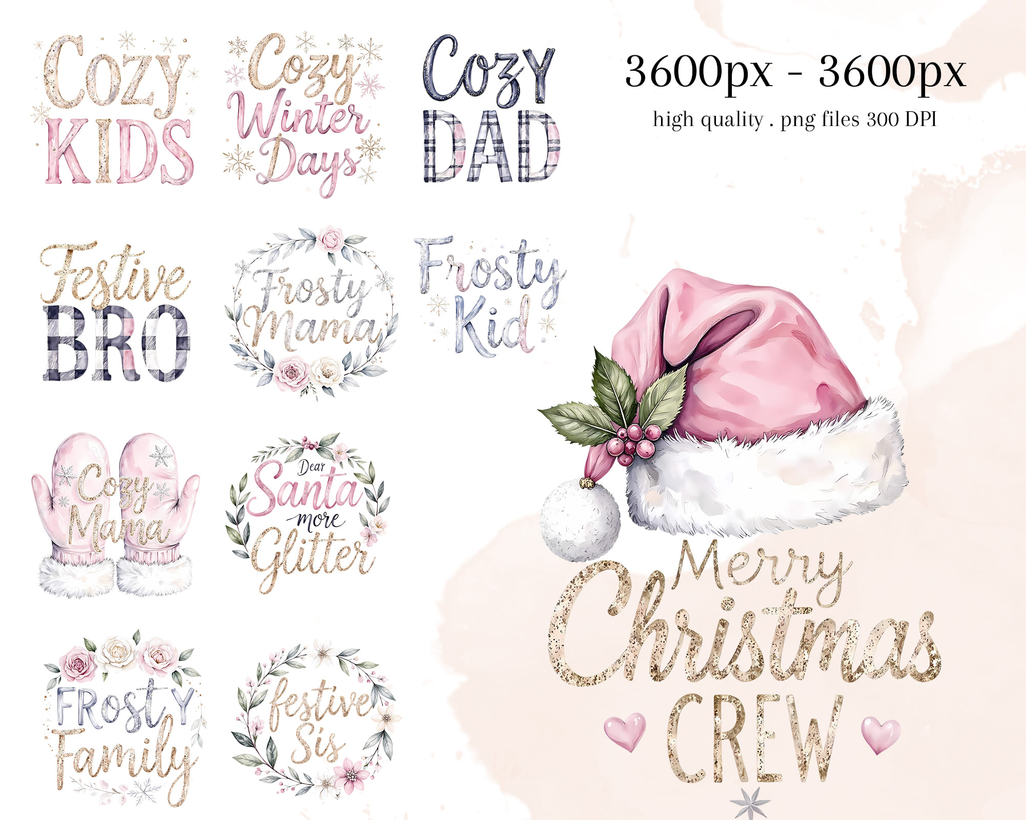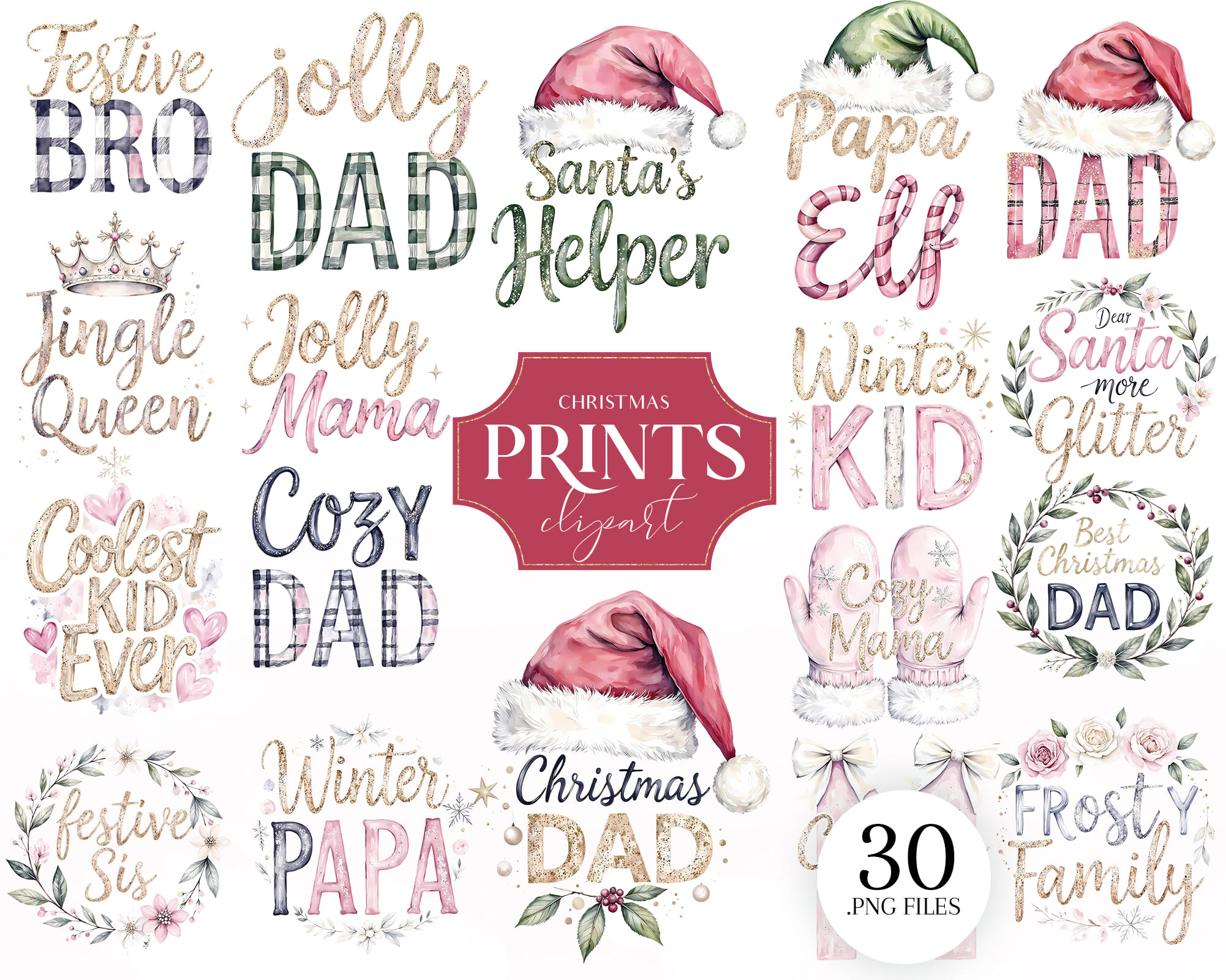 Festive Christmas Dad clipart set with Santa hats, family quotes like Jolly Dad, Jolly Mama, Jolly Kid, and Papa Elf. Includes wreaths, lettering, and pastel winter elements. Perfect for holiday cards, mugs, shirts, and family Christmas projects. Includes 30 PNG files with transparent backgrounds.