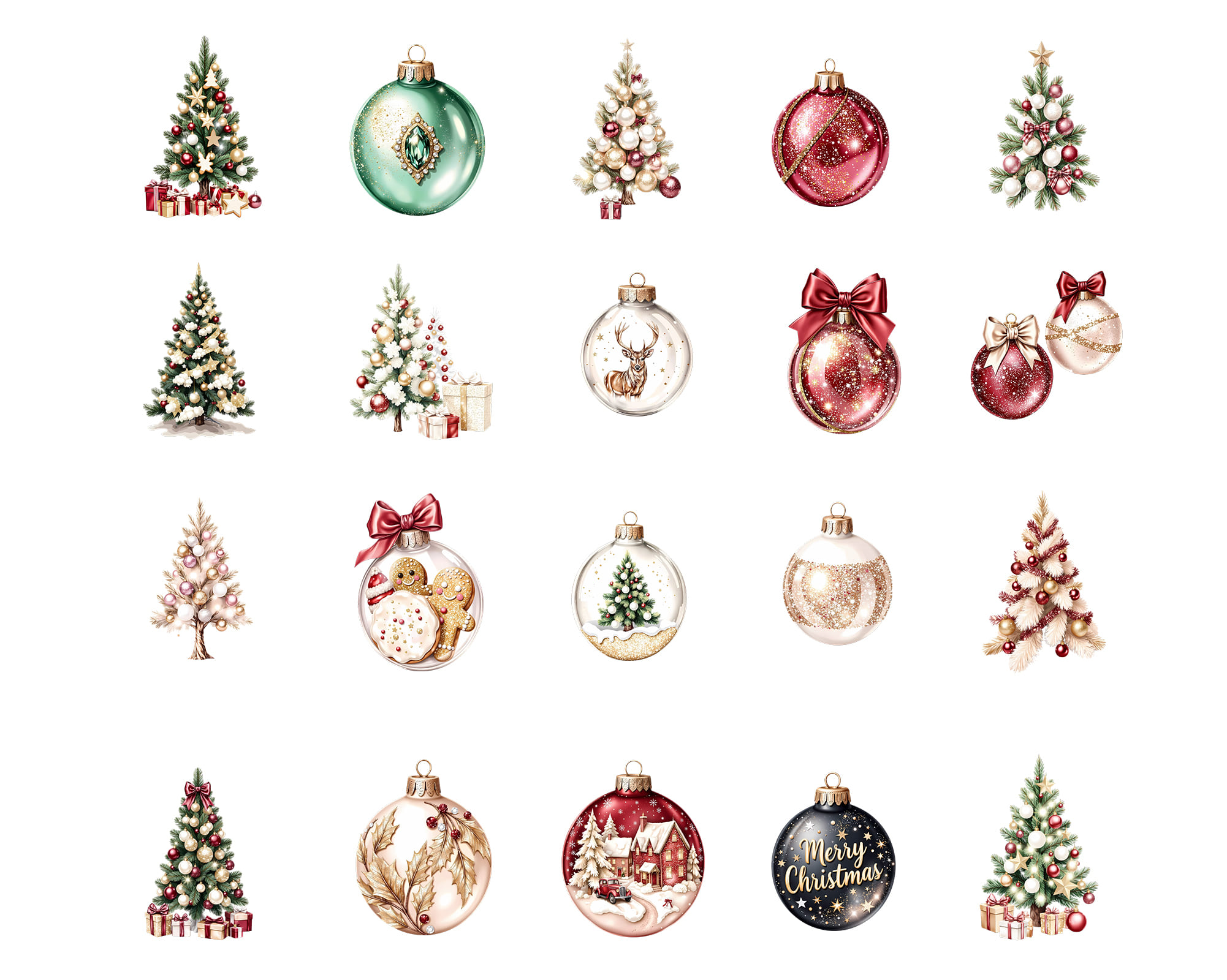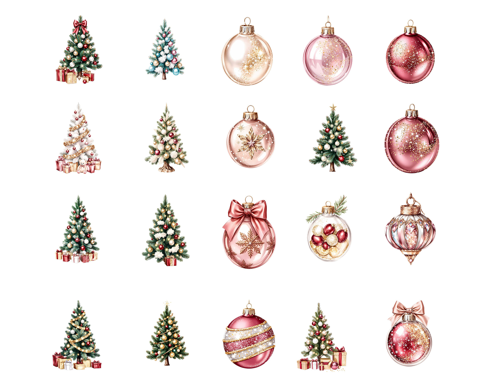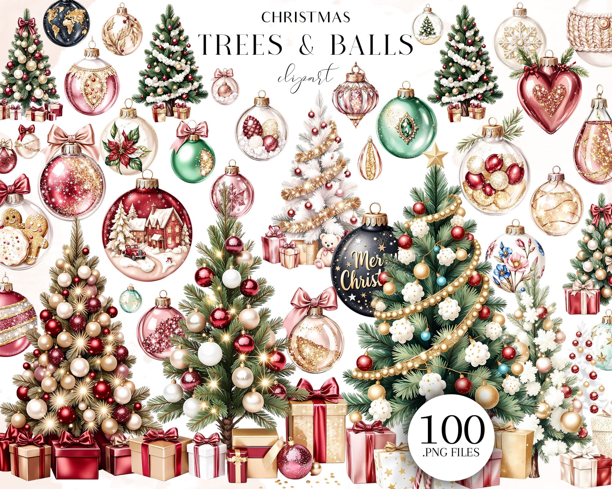 This elegant Christmas clipart set features beautifully decorated Christmas trees, festive baubles, glass ornaments, holiday gifts, sparkling bows, gingerbread accents, and cozy winter decorations. Each element comes as a high-resolution PNG with a transparent background, making it easy to layer, mix, and use in both digital and print projects.
