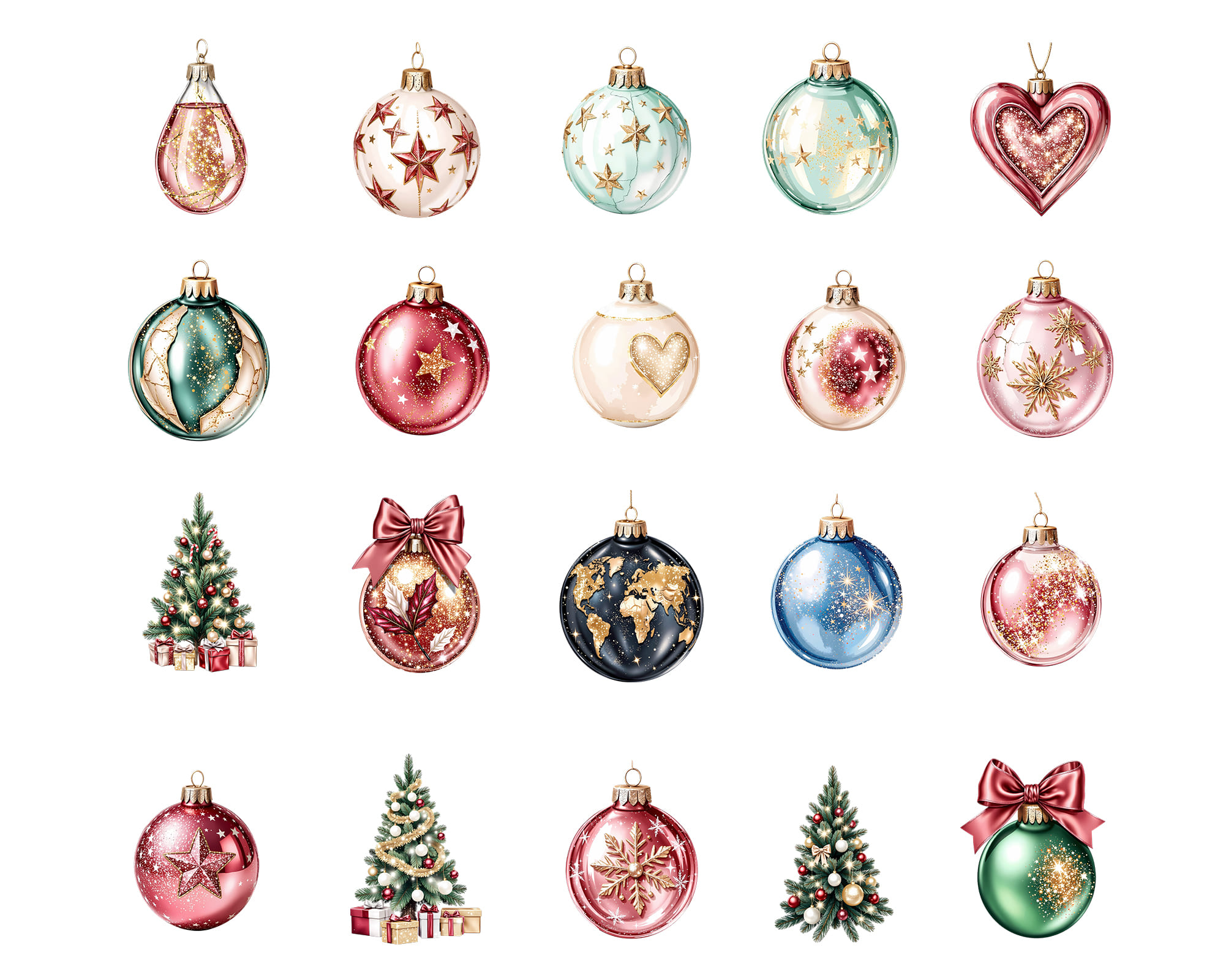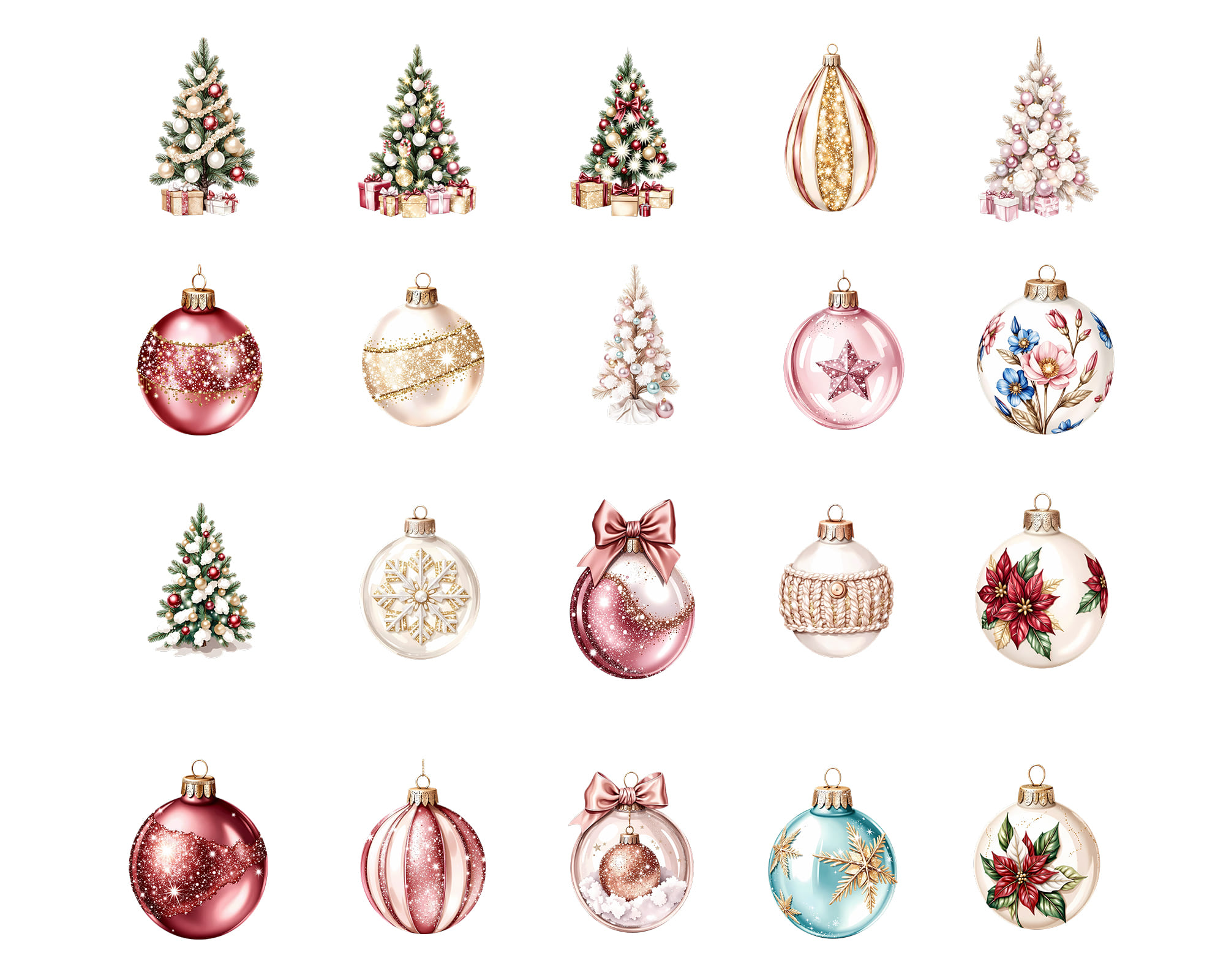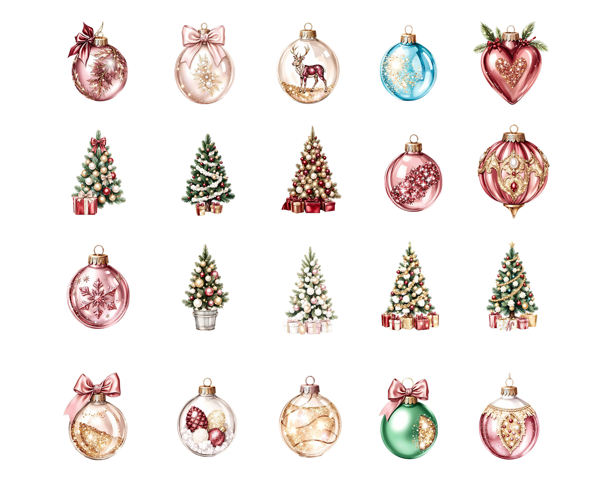 This elegant Christmas clipart set features beautifully decorated Christmas trees, festive baubles, glass ornaments, holiday gifts, sparkling bows, gingerbread accents, and cozy winter decorations. Each element comes as a high-resolution PNG with a transparent background, making it easy to layer, mix, and use in both digital and print projects.