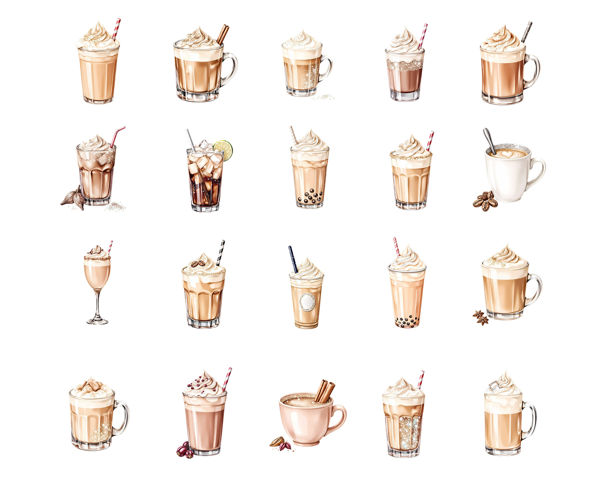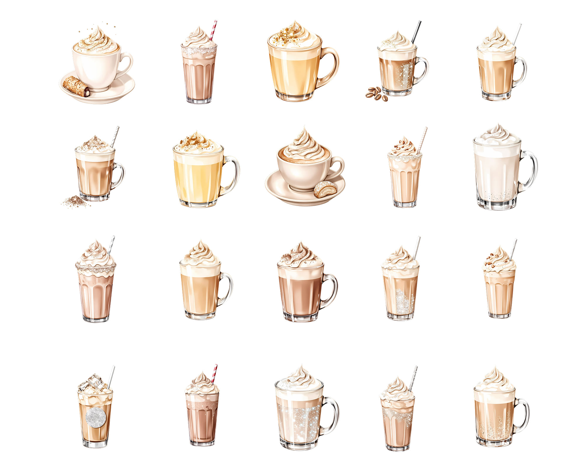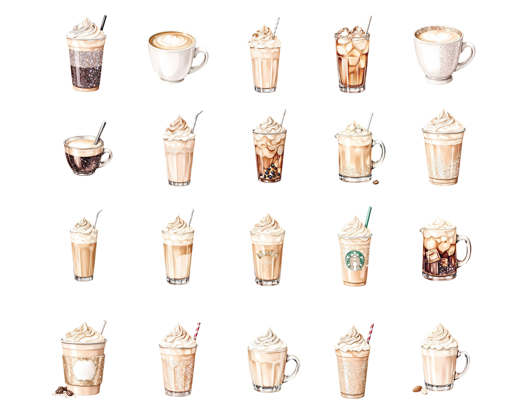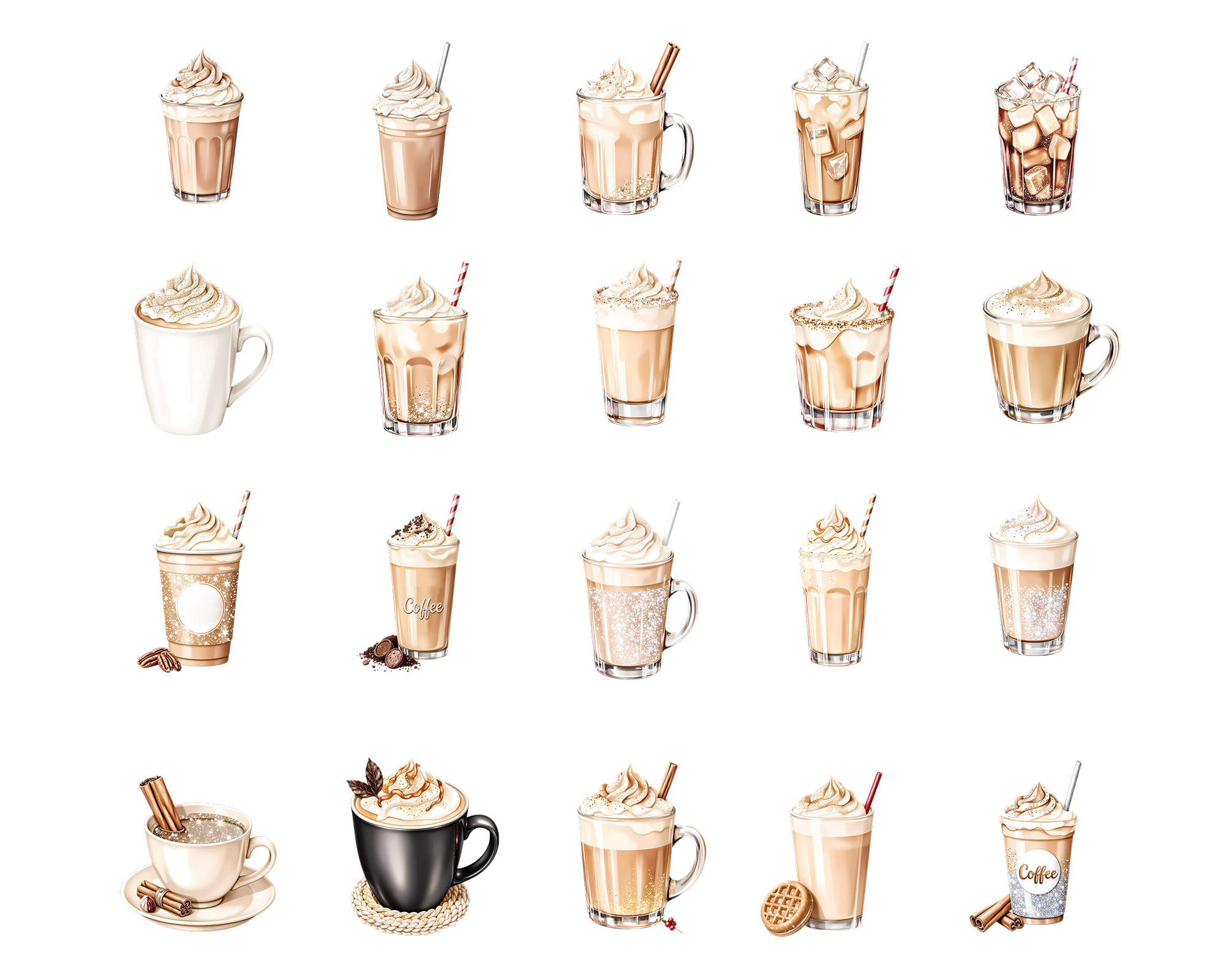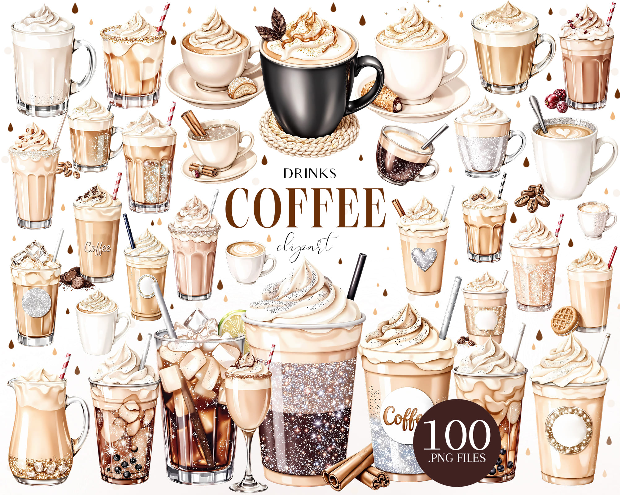 A premium collection of 100 PNG coffee illustrations featuring lattes, iced coffee, cappuccino, espresso, mocha, frappes, and whipped toppings. Perfect for café menus, branding, stickers, recipe cards, sublimation, and minimalist kitchen wall art.