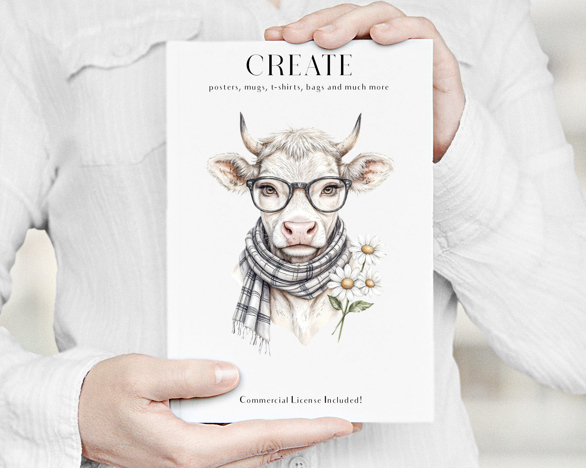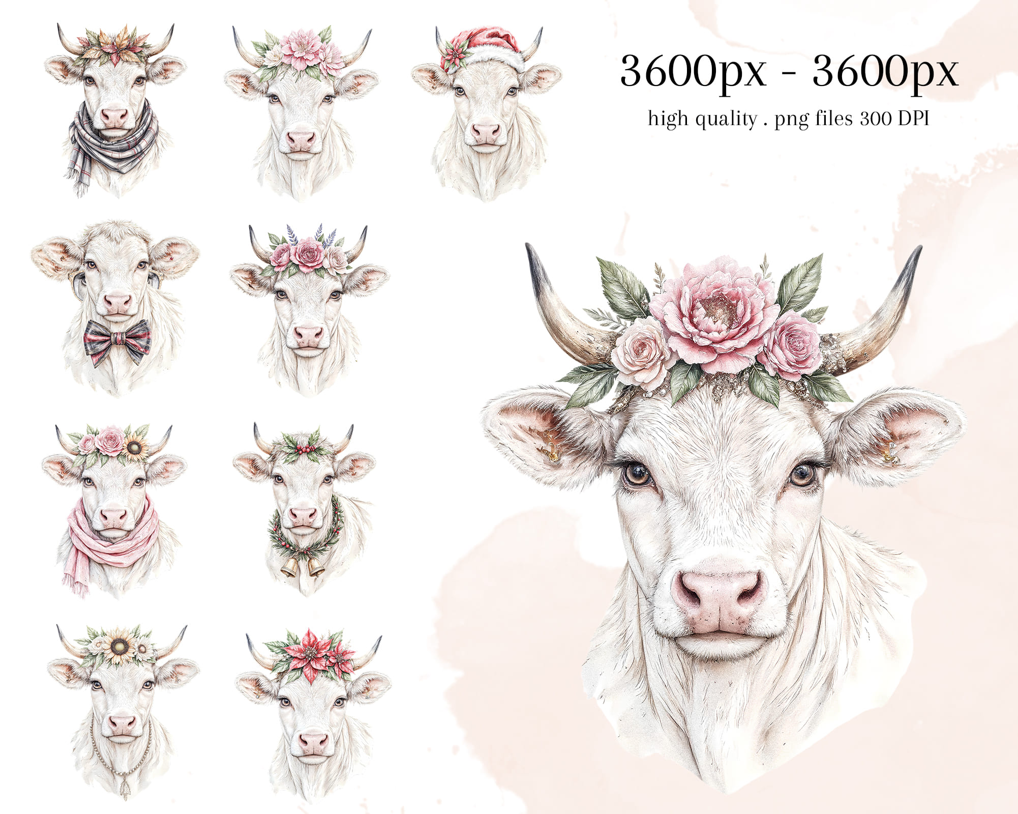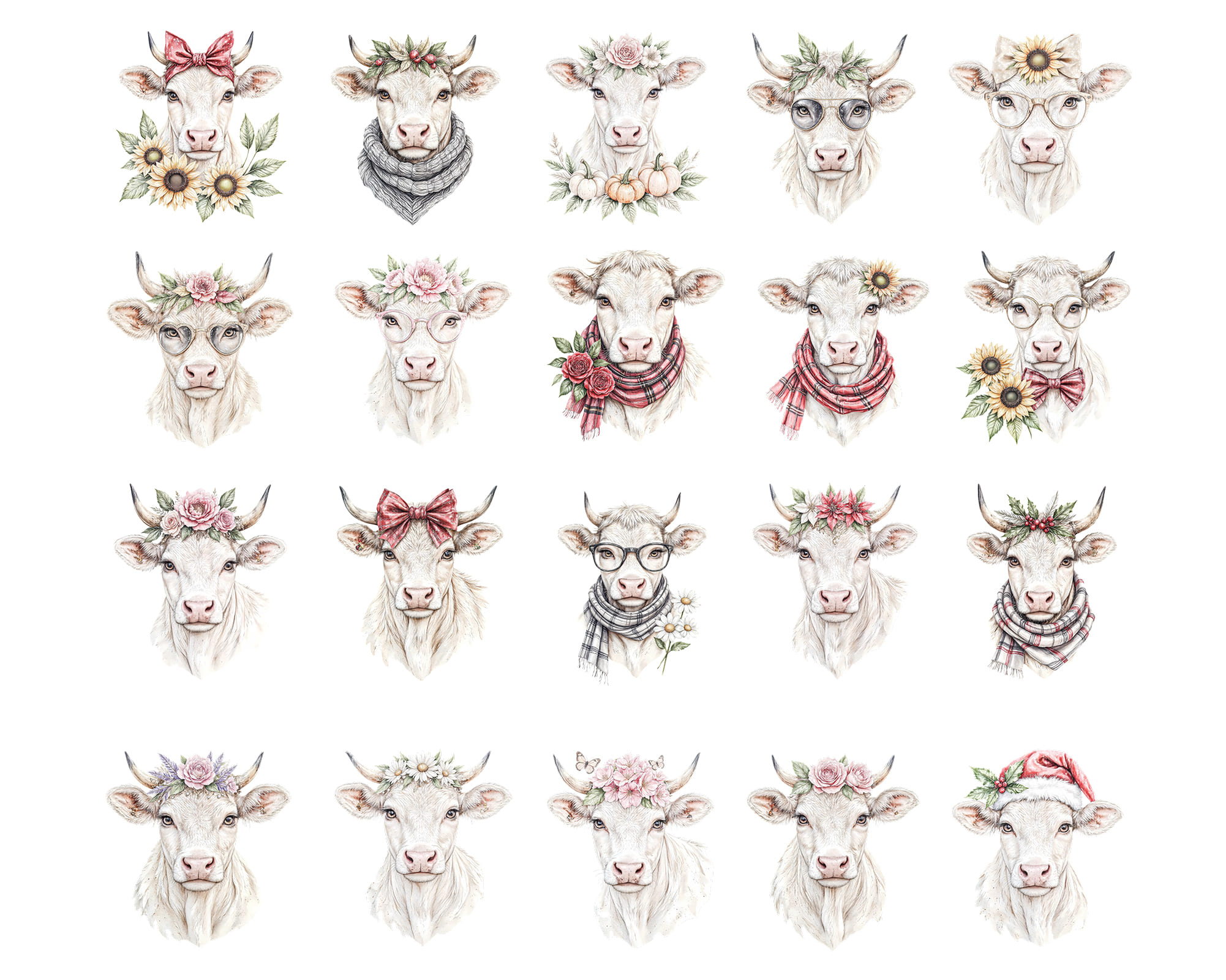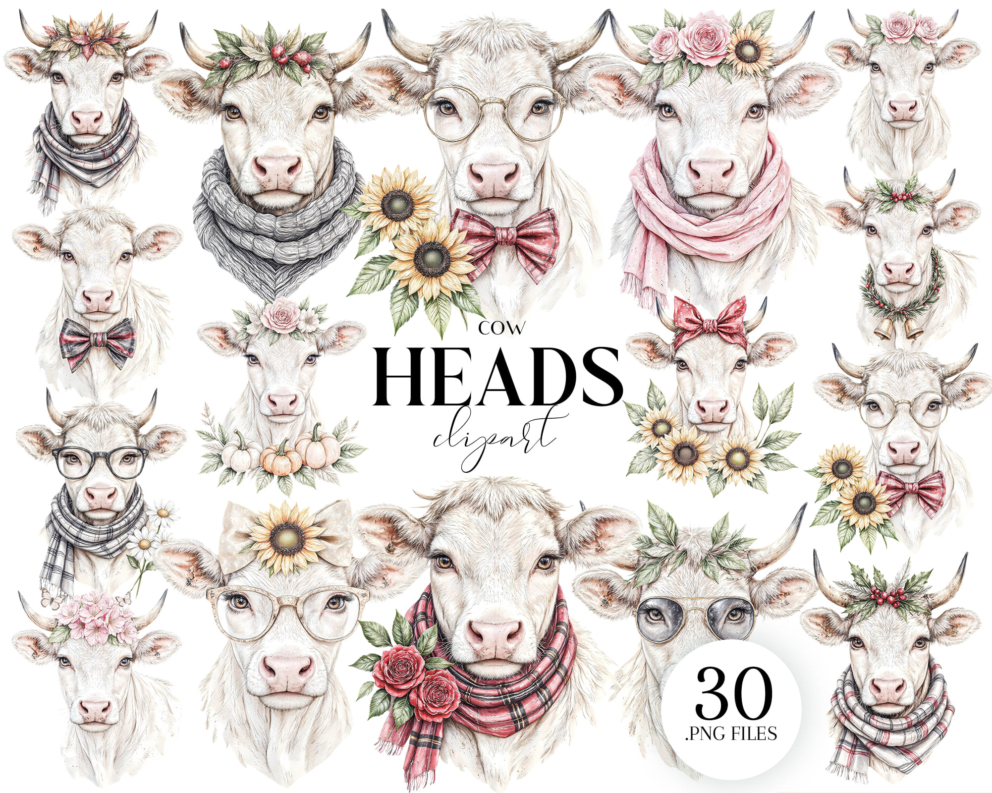 Decorate your projects with this Cow Heads Watercolor Clipart Set 🐮🌸. Featuring 30 stylish cow portraits with glasses, scarves, and floral details, this collection is ideal for farmhouse decor, nursery prints, stickers, t-shirts, and digital designs. Each file is high quality with transparent background for easy use.