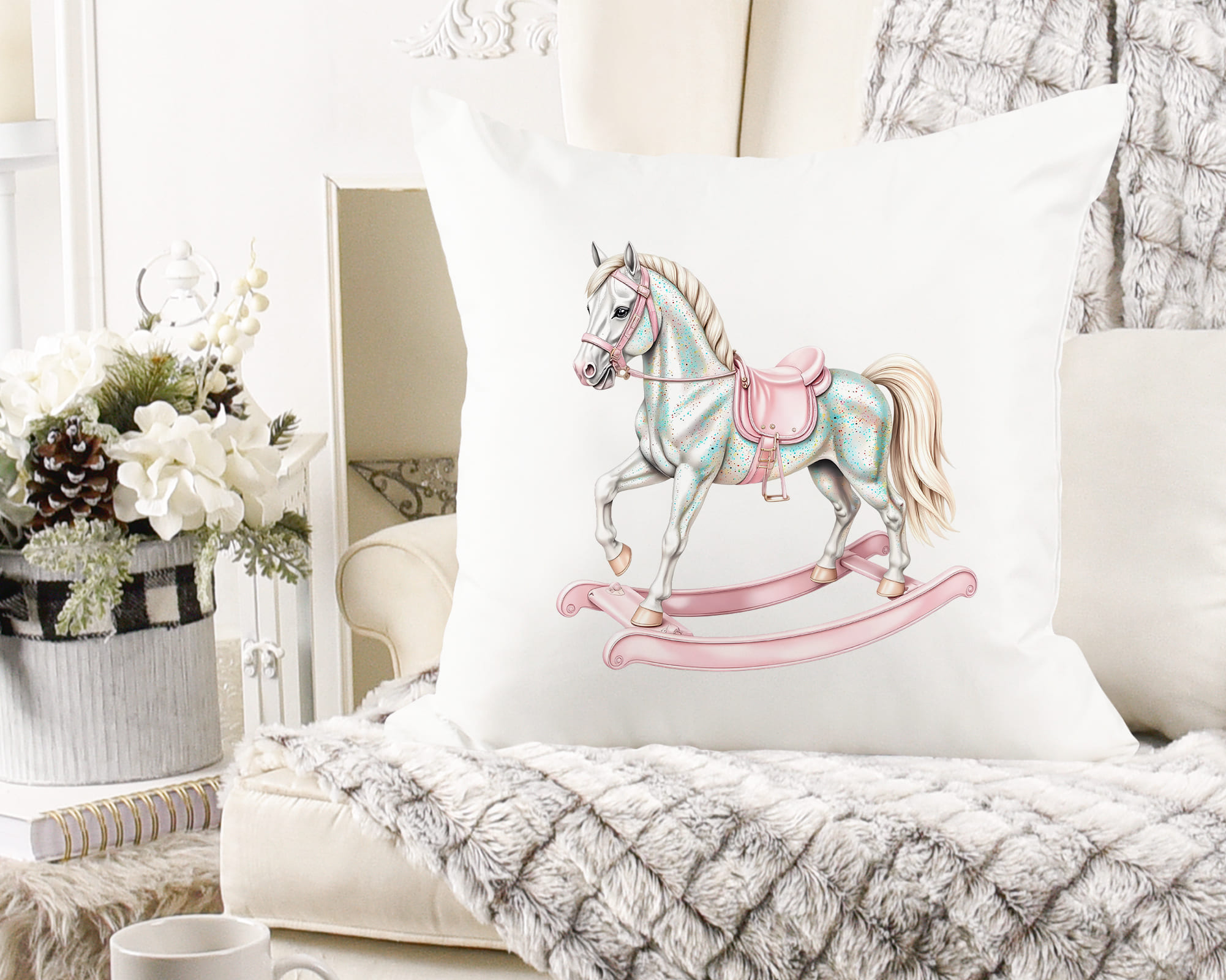 Baby room decor, toys, rocking horse, cushions, crib, baby accessories