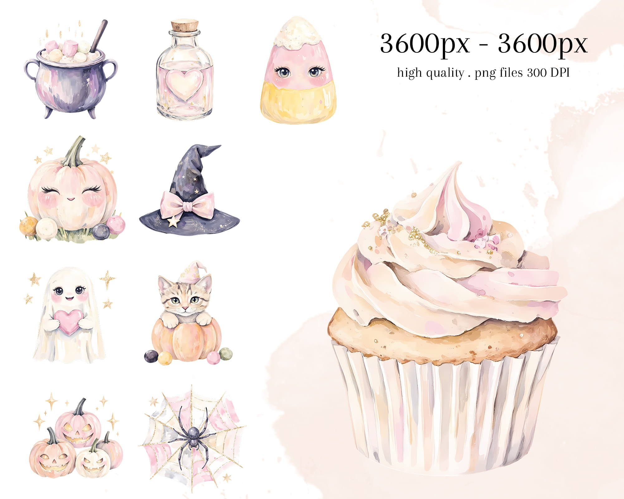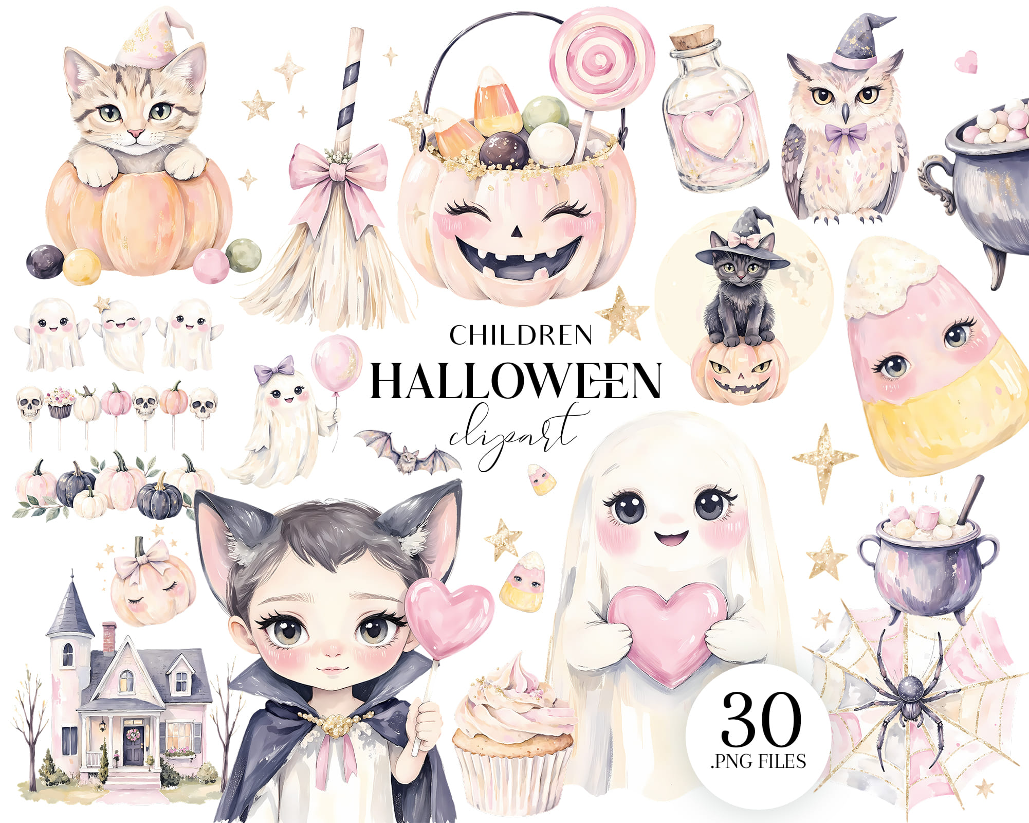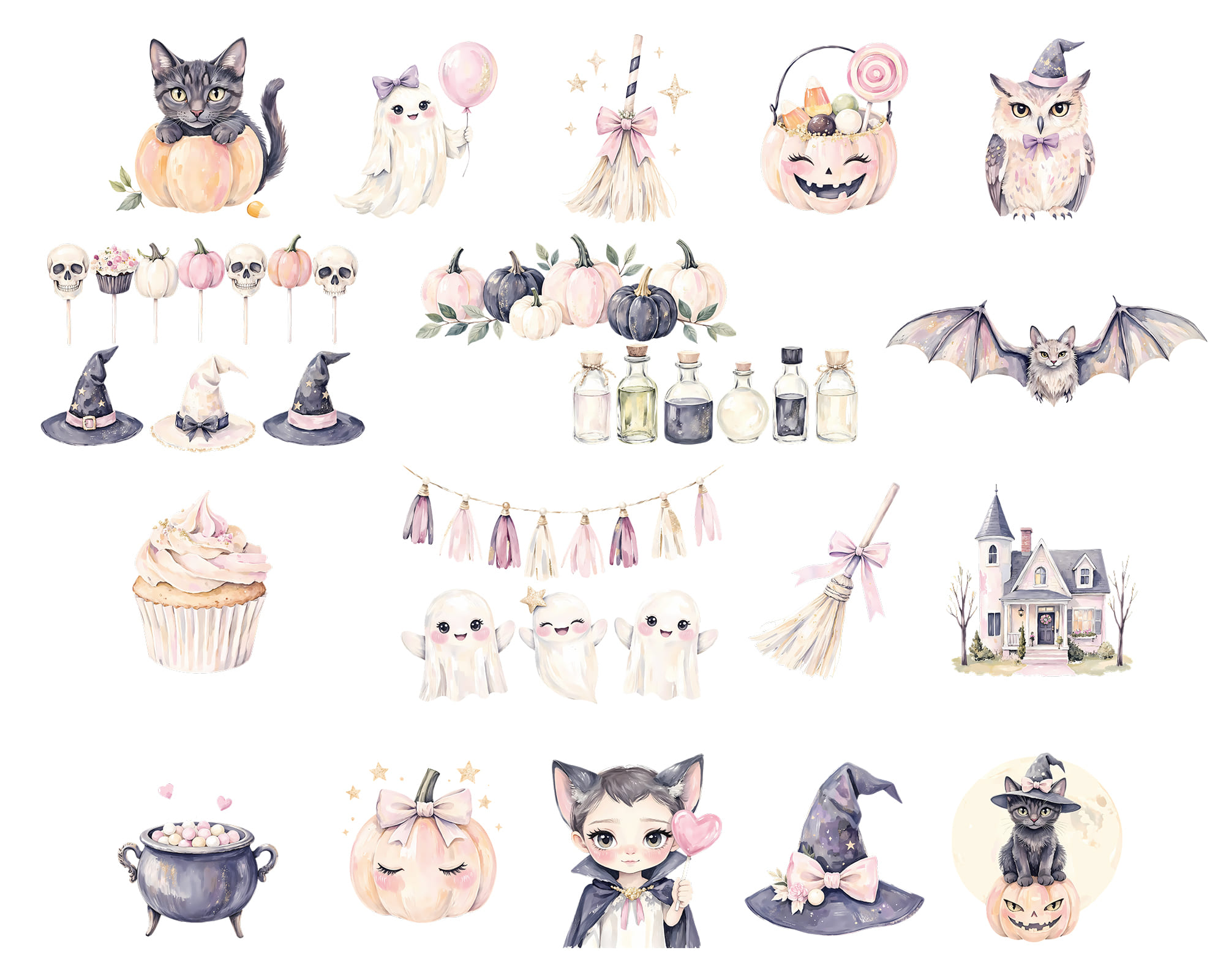 Spooky yet adorable, this Children’s Halloween Clipart Set 🎃👻 includes 30 pastel PNG illustrations of ghosts, pumpkins, cats, owls, candy, and stars. Perfect for kids’ Halloween party invitations, stickers, sublimation, and fun seasonal crafts.