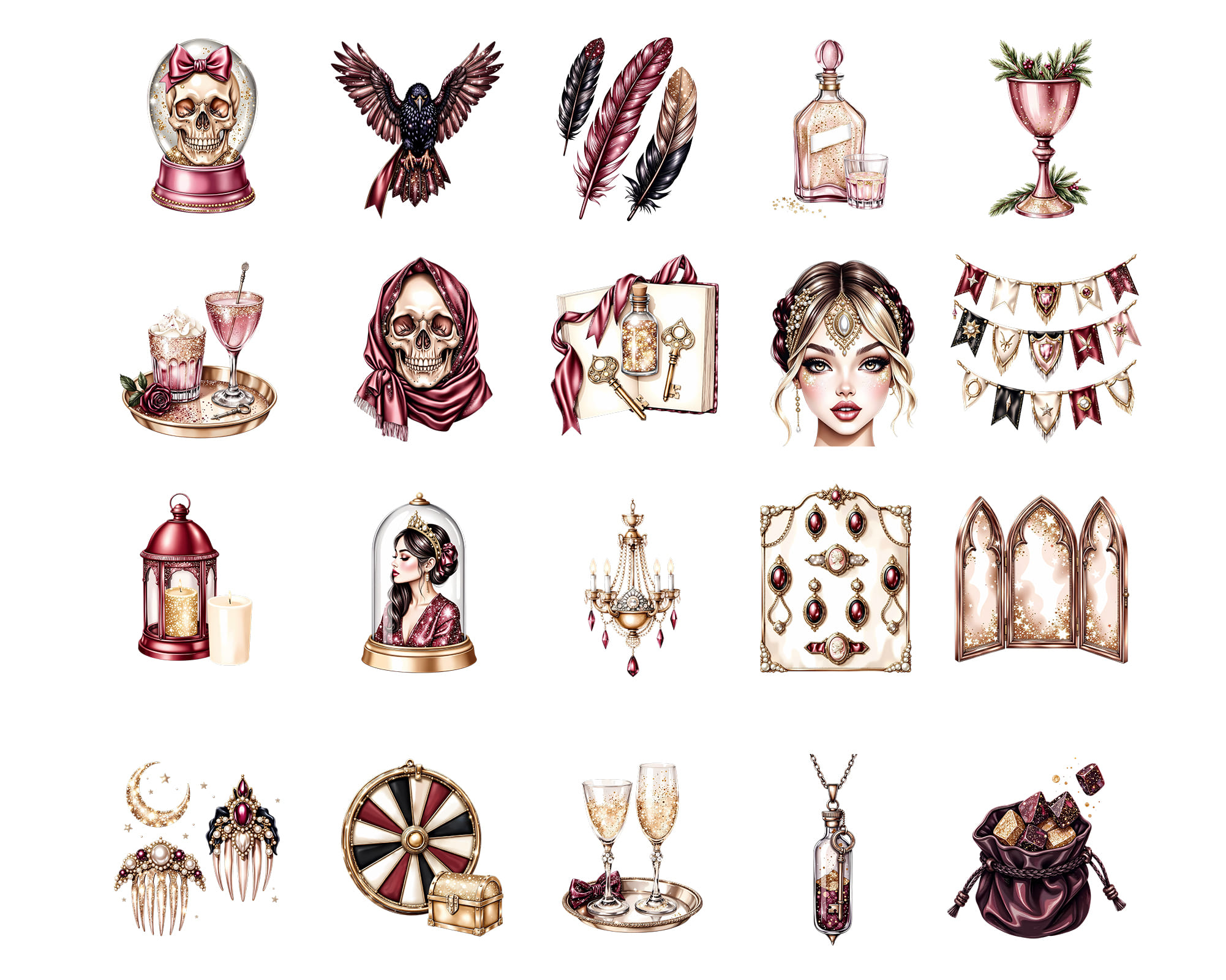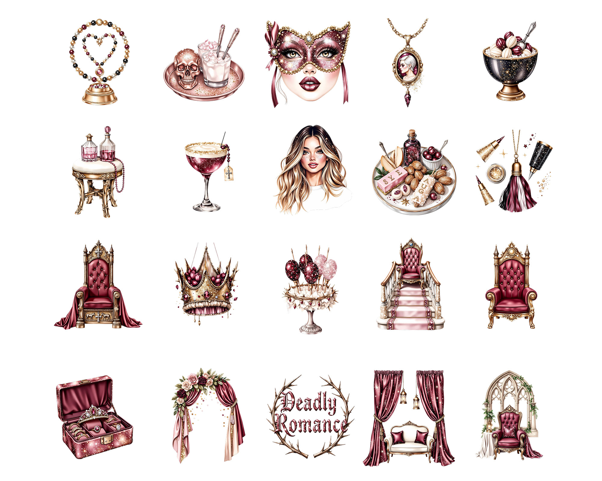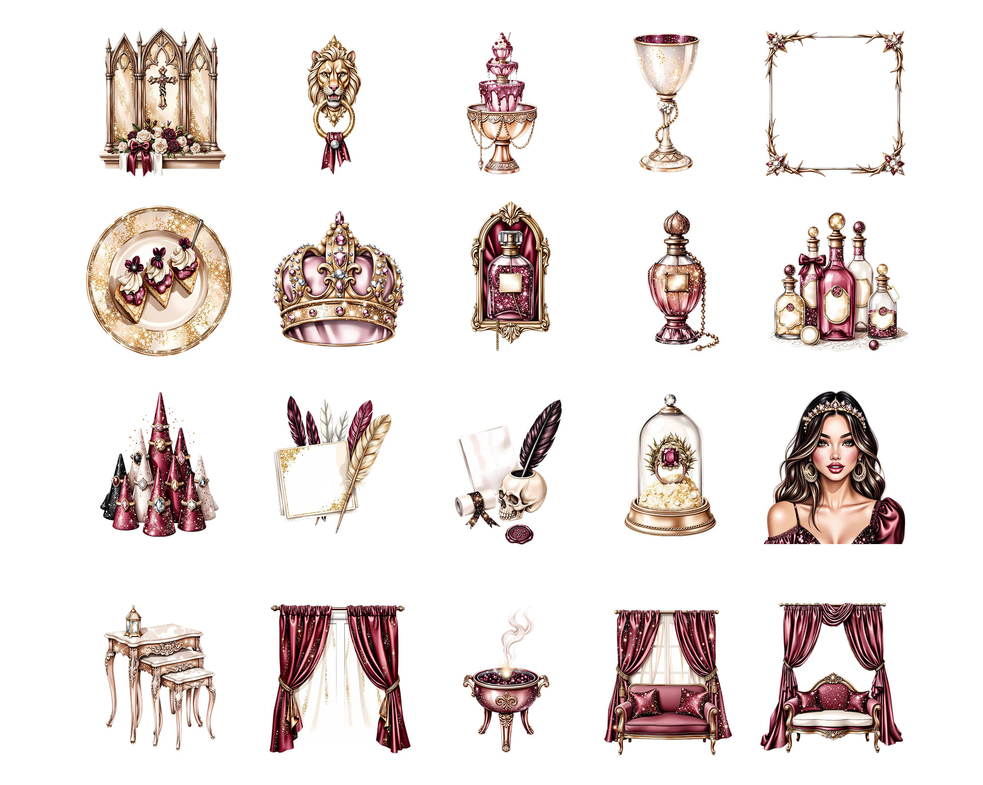 This dramatic and luxurious gothic romance clipart bundle features masked beauties, skull decor, dark florals, crowns, ravens, candles, gothic balloons, keys, chalices, perfume bottles, royal chairs, and rich velvet textures. Perfect for creating atmospheric, mysterious, and enchanting art with a glamorous dark twist.