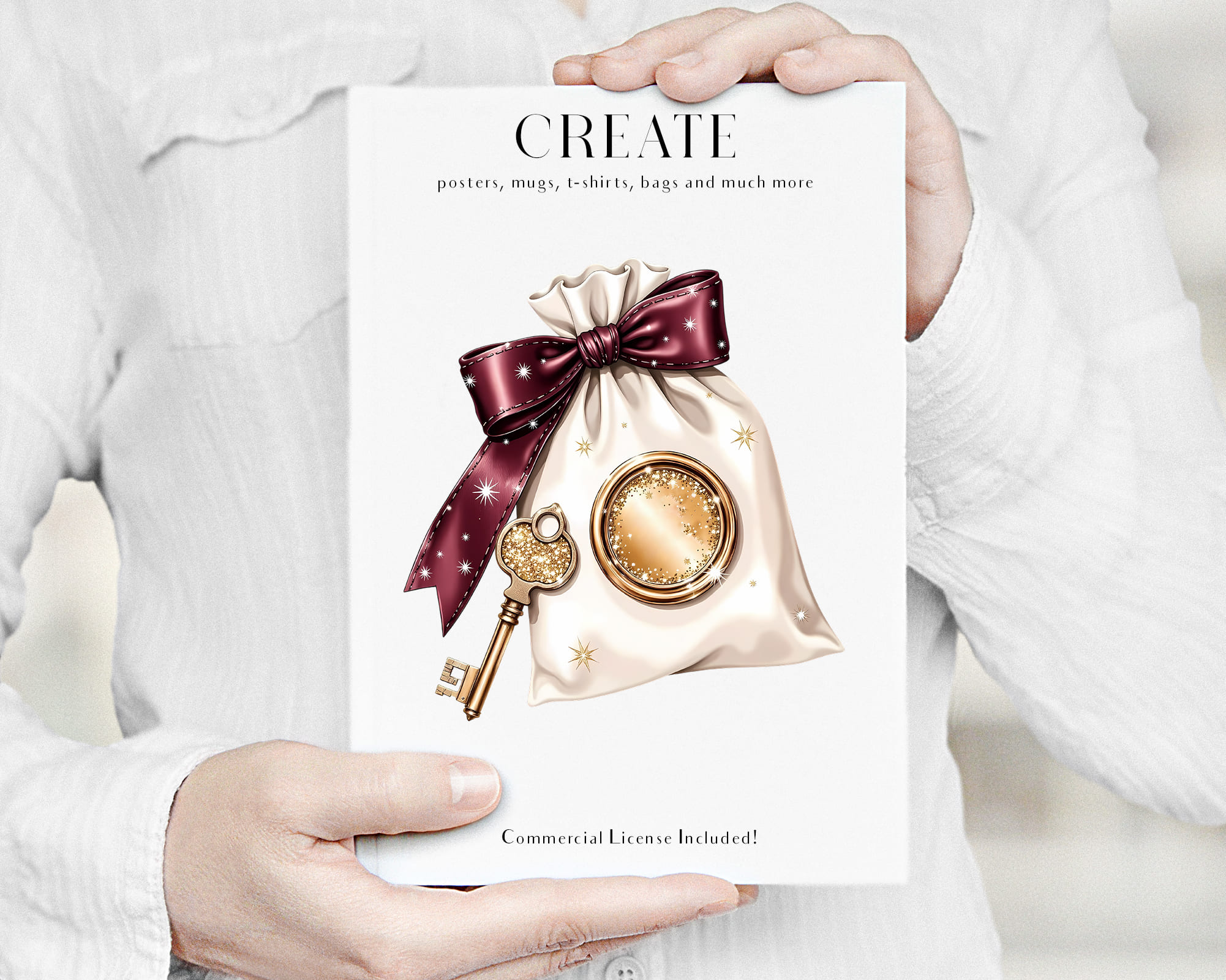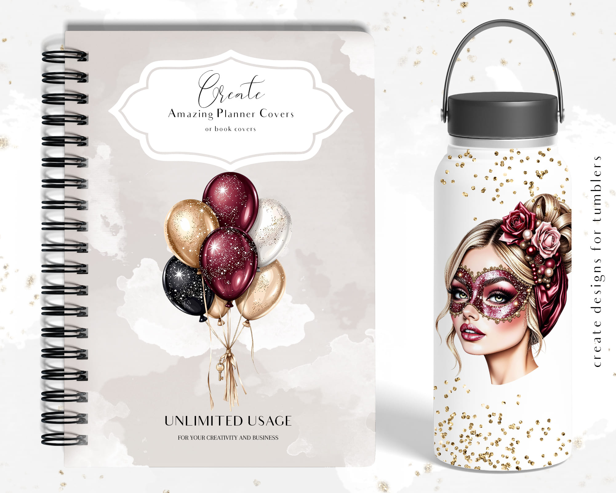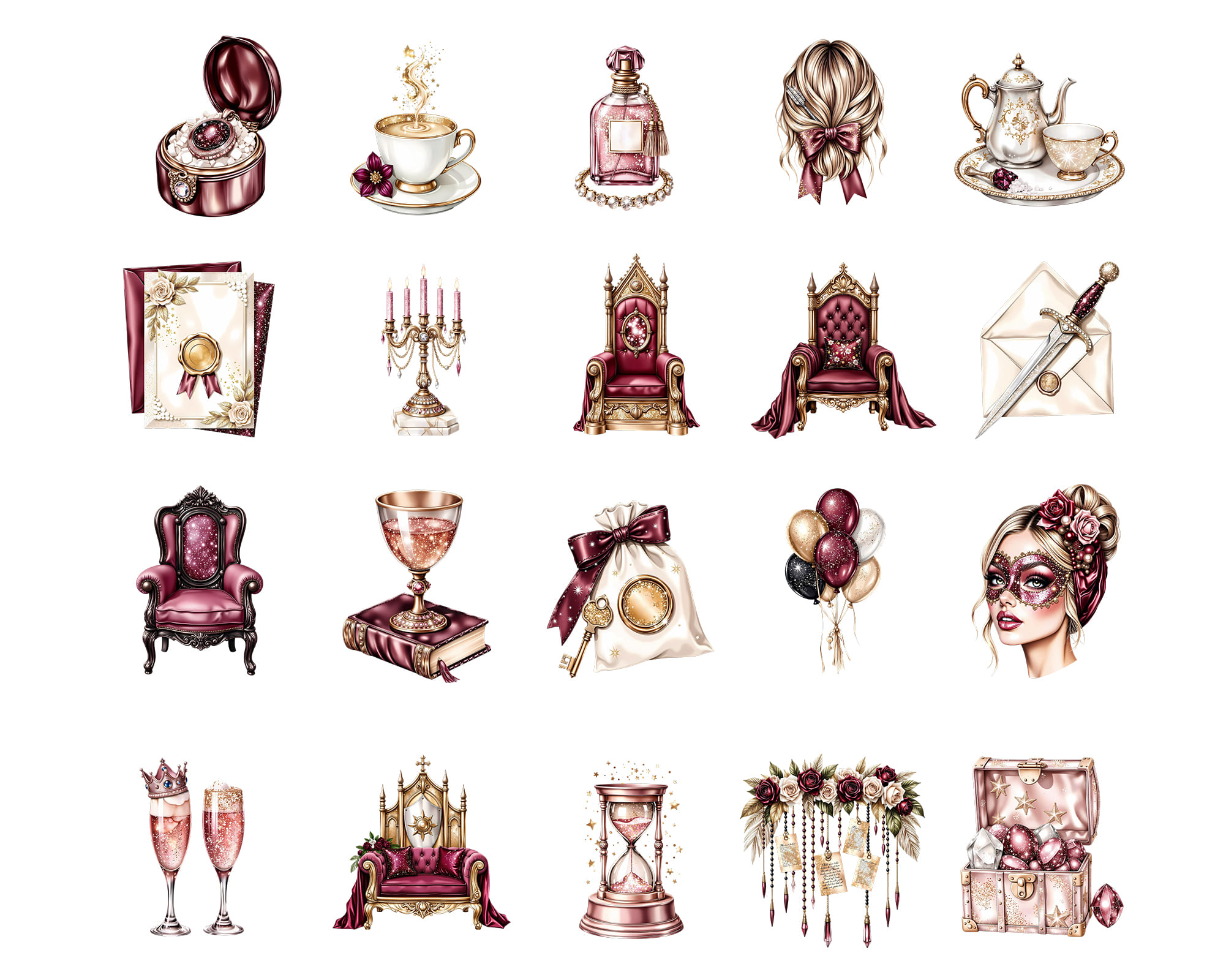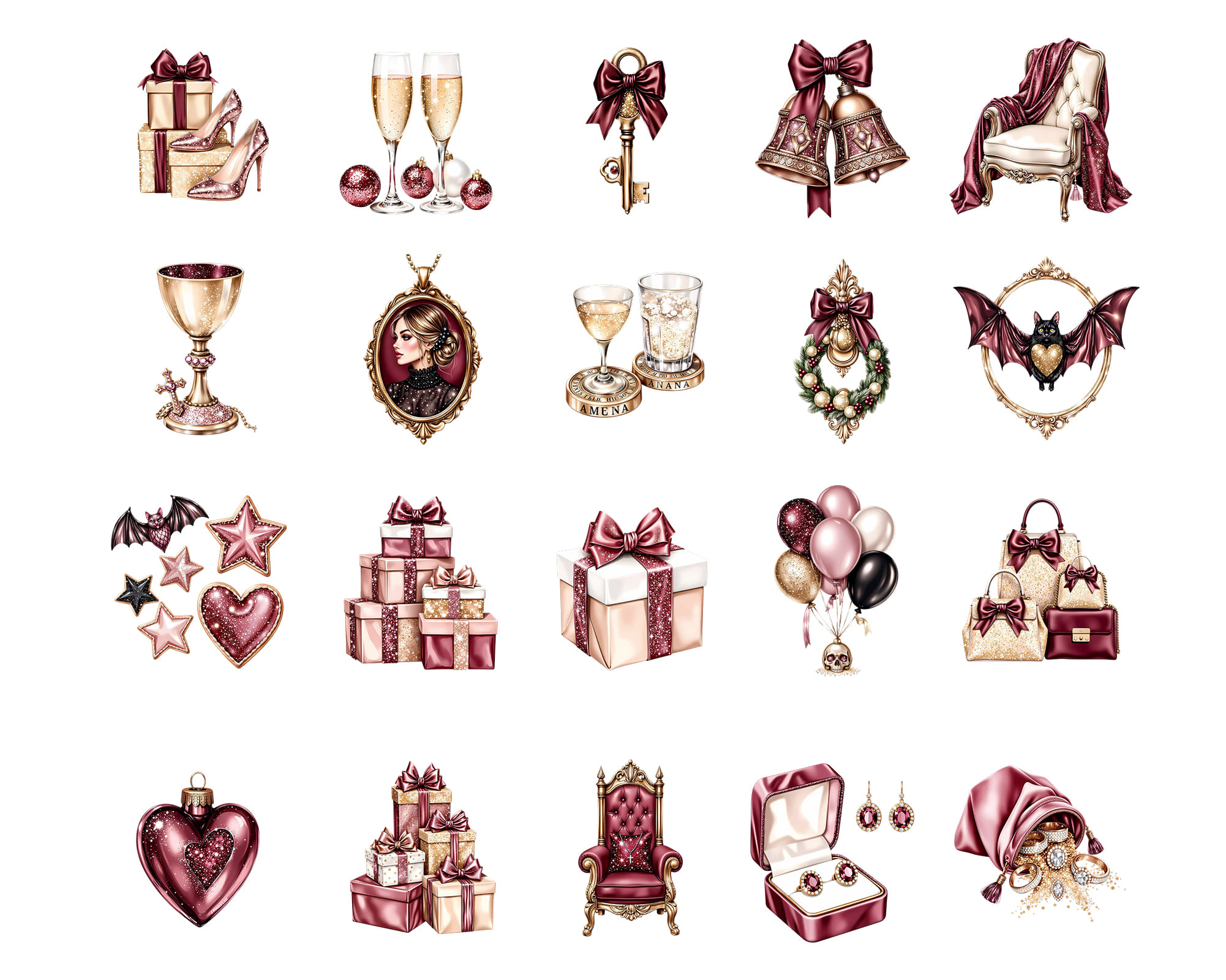 This dramatic and luxurious gothic romance clipart bundle features masked beauties, skull decor, dark florals, crowns, ravens, candles, gothic balloons, keys, chalices, perfume bottles, royal chairs, and rich velvet textures. Perfect for creating atmospheric, mysterious, and enchanting art with a glamorous dark twist.