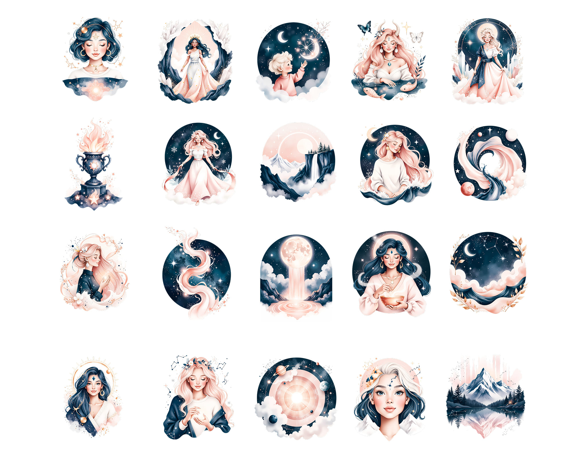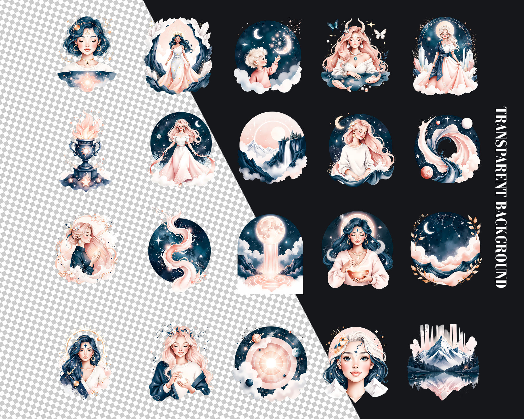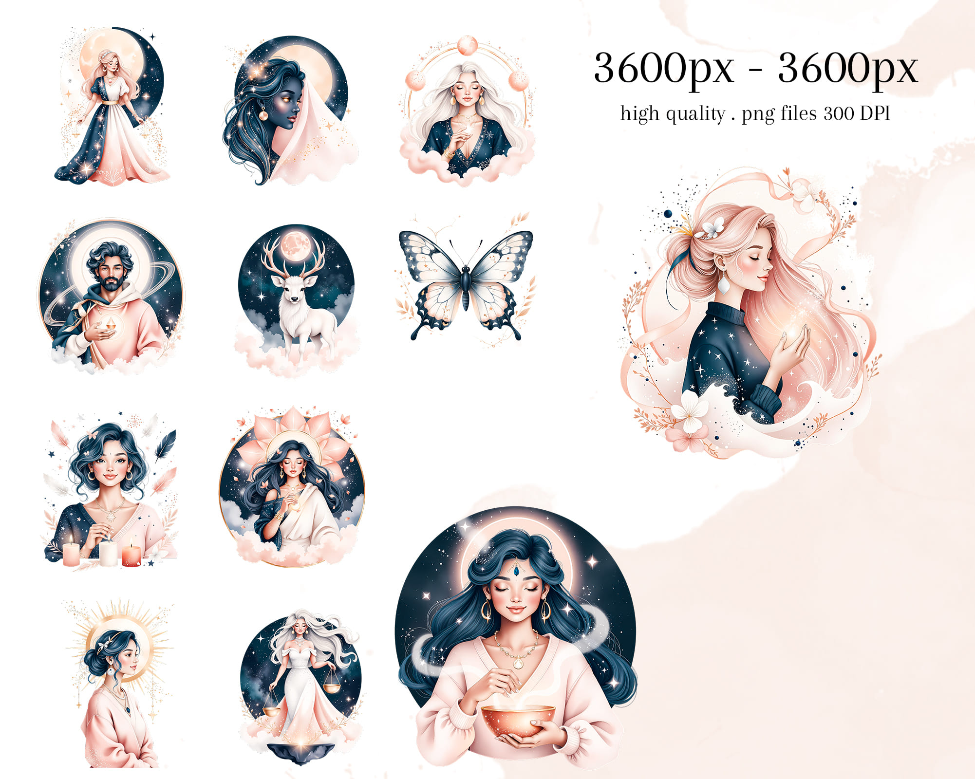 An enchanting Ethereal Astrology clipart set featuring 50 PNG illustrations with dreamy celestial energy. This collection includes mystical women, moons, stars, constellations, deer, mountains, butterflies and cosmic portals in soft pastel tones. Perfect for astrology journals, tarot projects, planners, stickers, phone wallpapers, branding, social media graphics and spiritual prints. All graphics are supplied as high‑quality transparent PNG files.