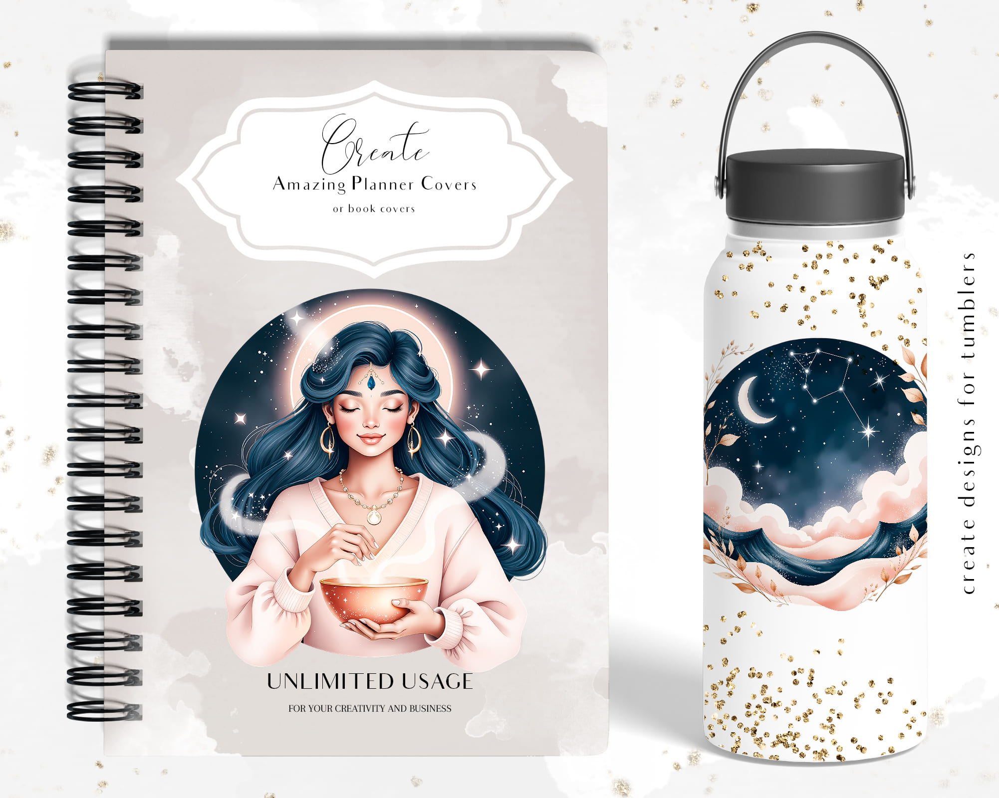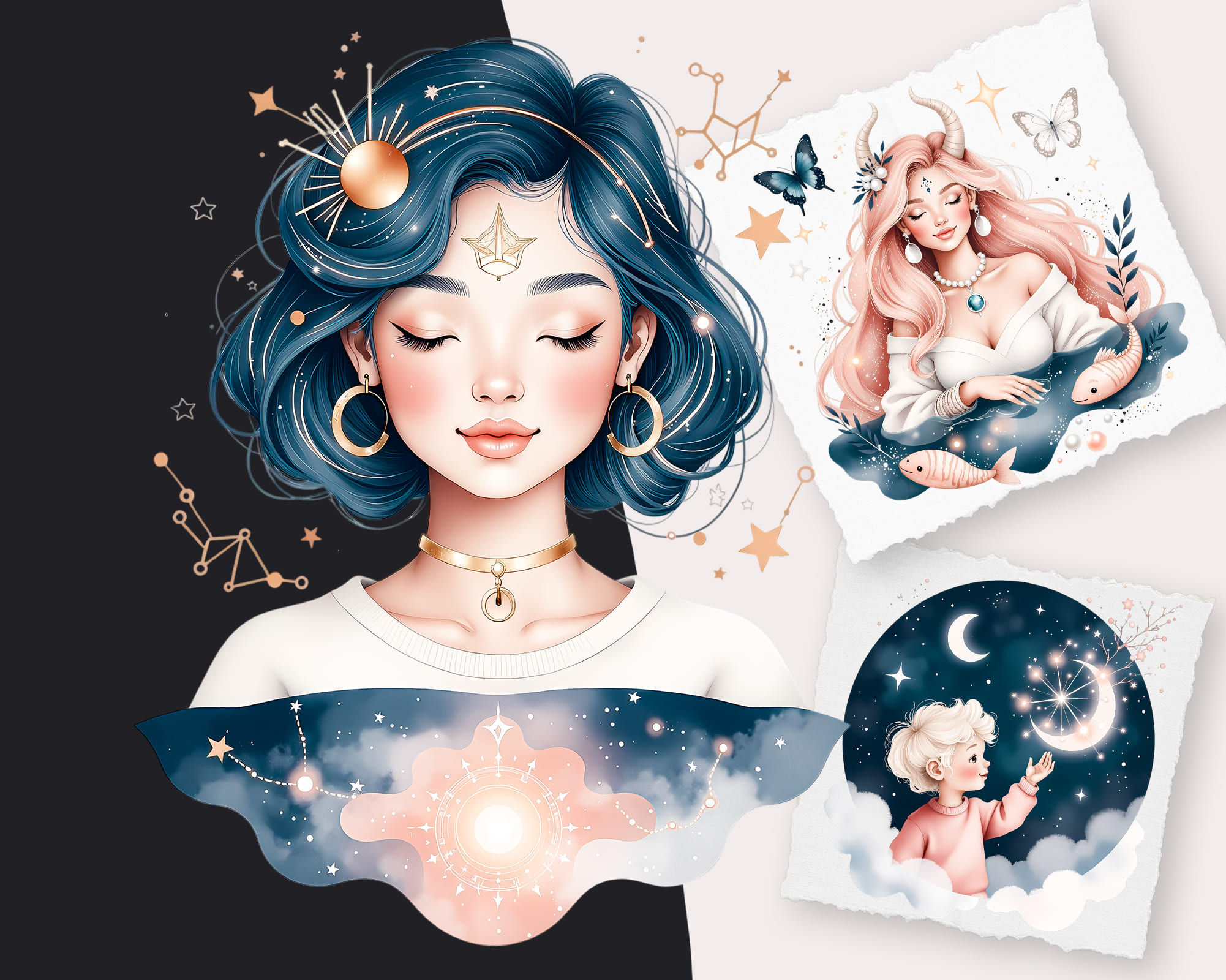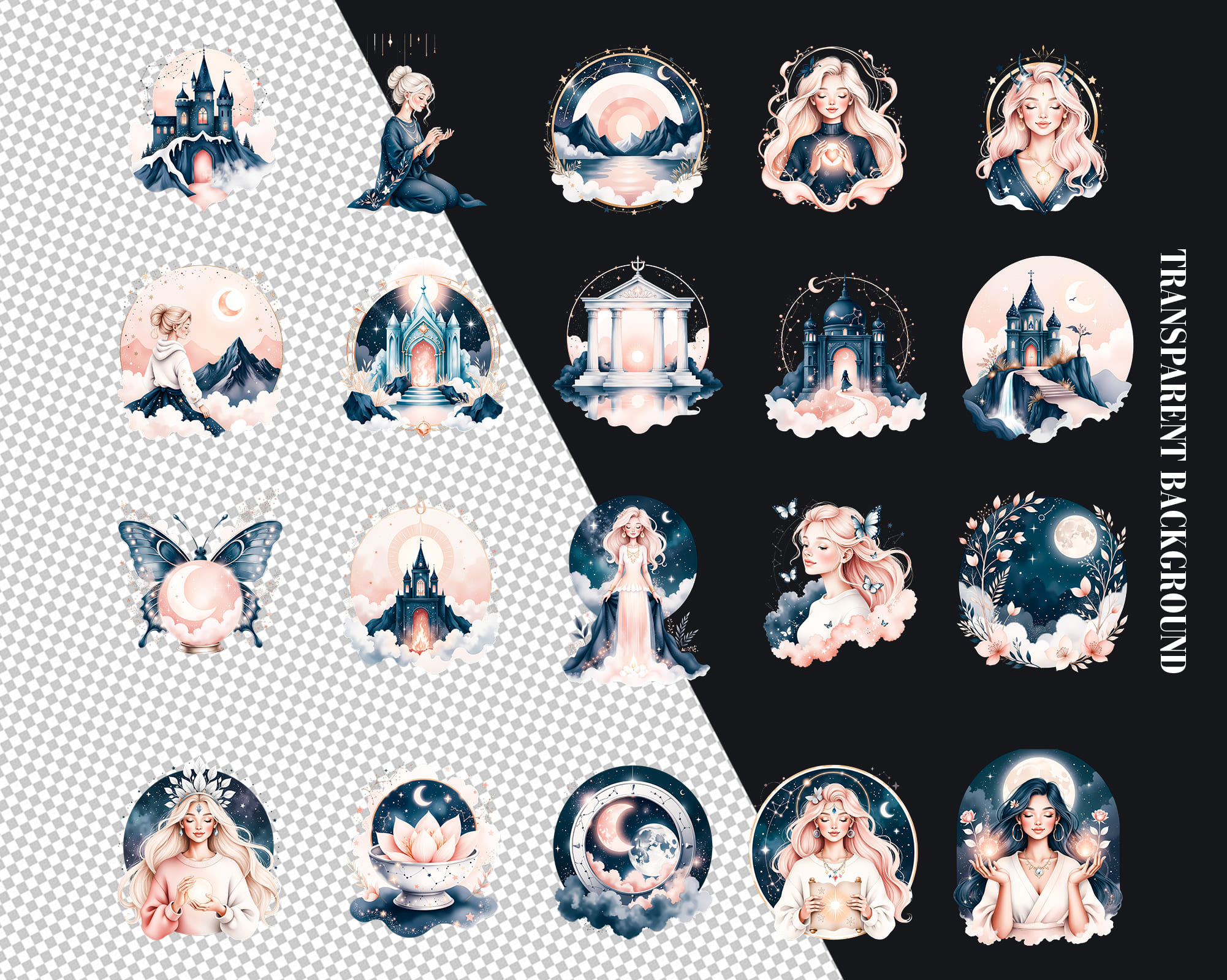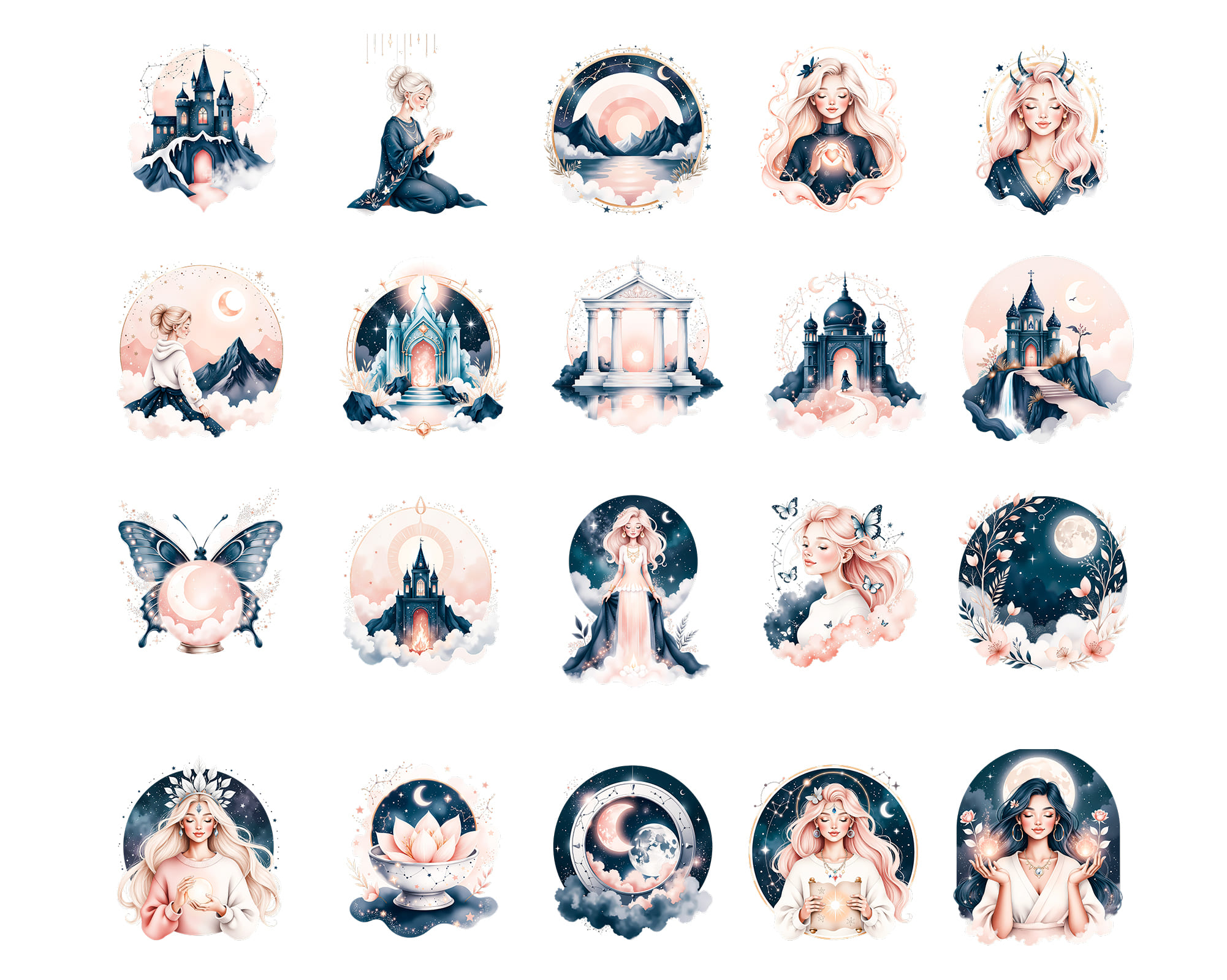 An enchanting Ethereal Astrology clipart set featuring 50 PNG illustrations with dreamy celestial energy. This collection includes mystical women, moons, stars, constellations, deer, mountains, butterflies and cosmic portals in soft pastel tones. Perfect for astrology journals, tarot projects, planners, stickers, phone wallpapers, branding, social media graphics and spiritual prints. All graphics are supplied as high‑quality transparent PNG files.