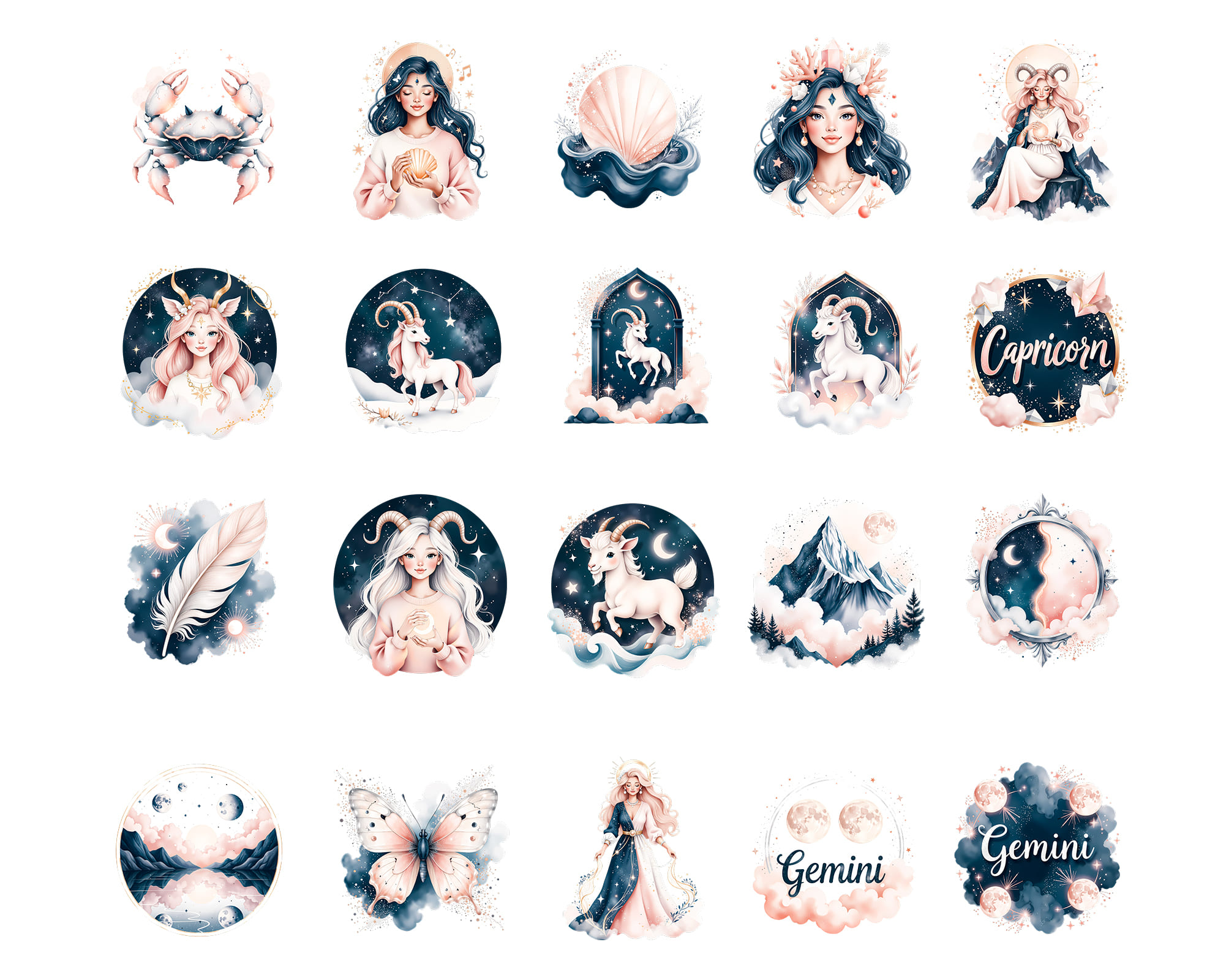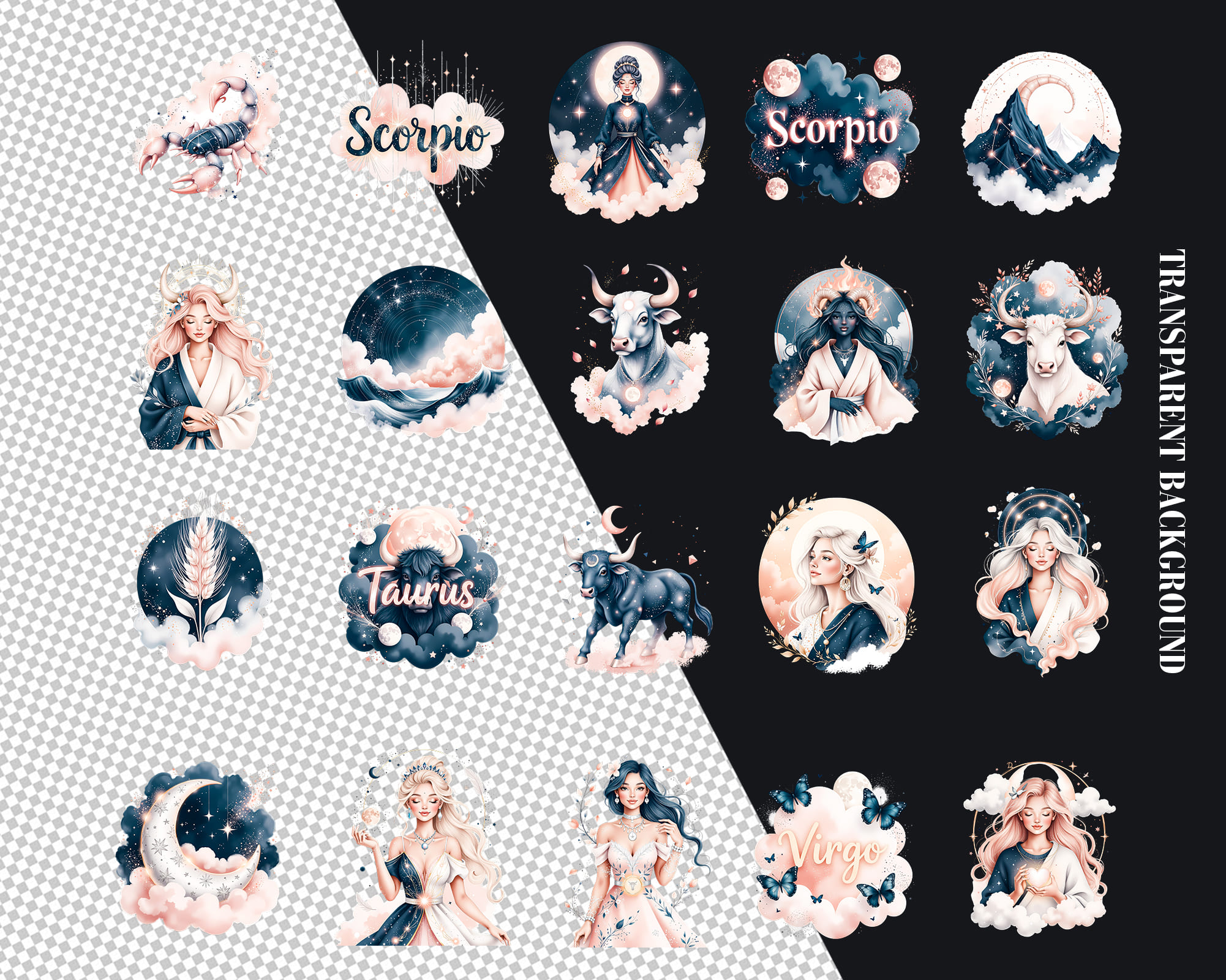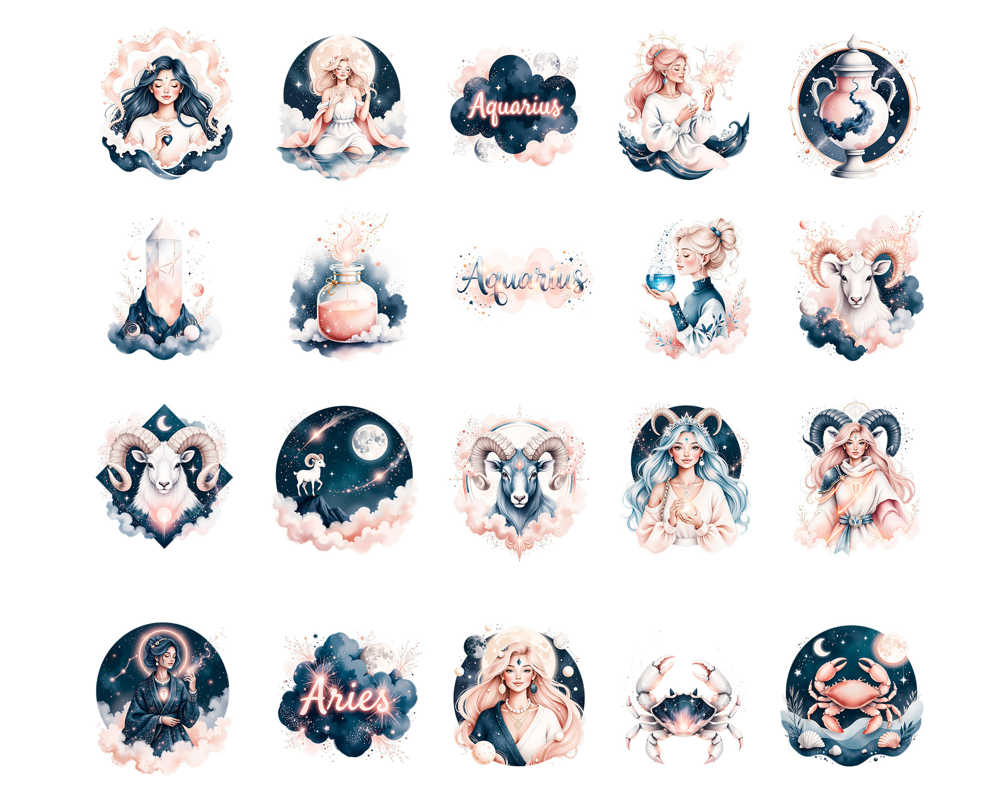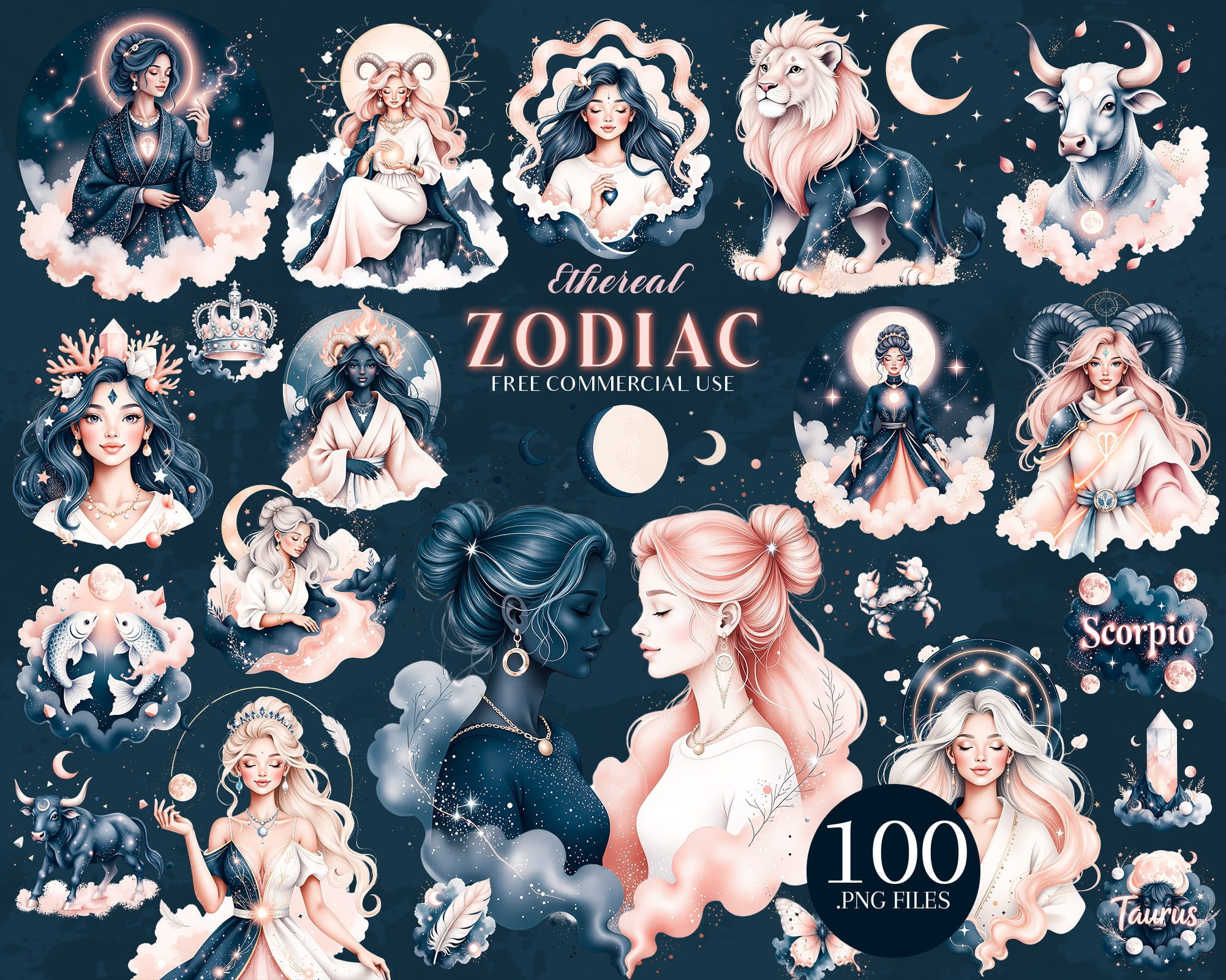 A luxurious Ethereal Zodiac clipart collection featuring 100 PNG illustrations of all horoscope signs in a dreamy celestial style. This set includes female and male zodiac characters, animals like lion, bull and fish, moons, crowns, crystals and constellation symbols in deep midnight tones with glowing accents. Perfect for astrology readings, tarot decks, planners, stickers, apps, posters and spiritual branding. All graphics are provided as high‑quality transparent PNG files.