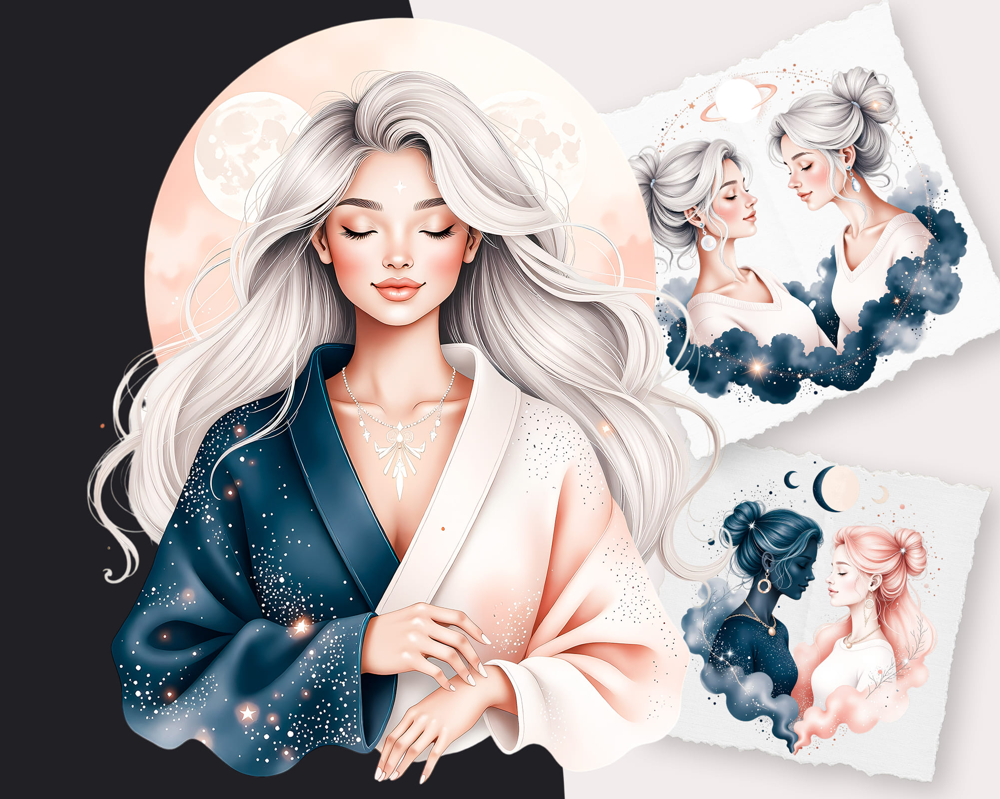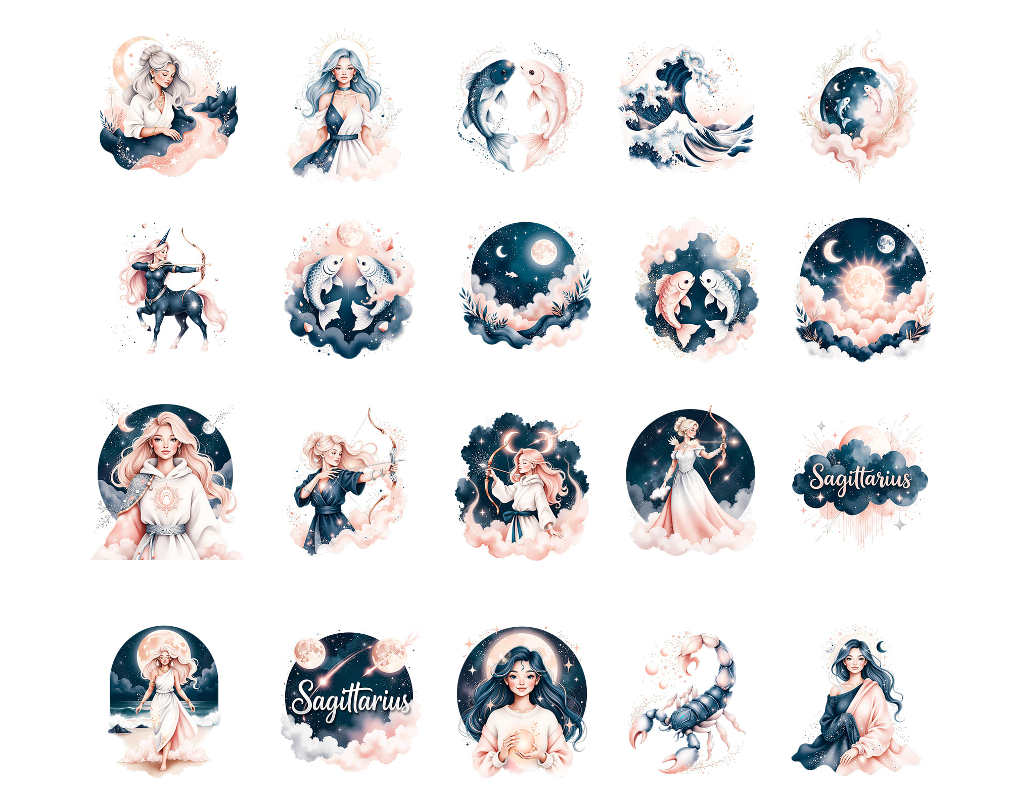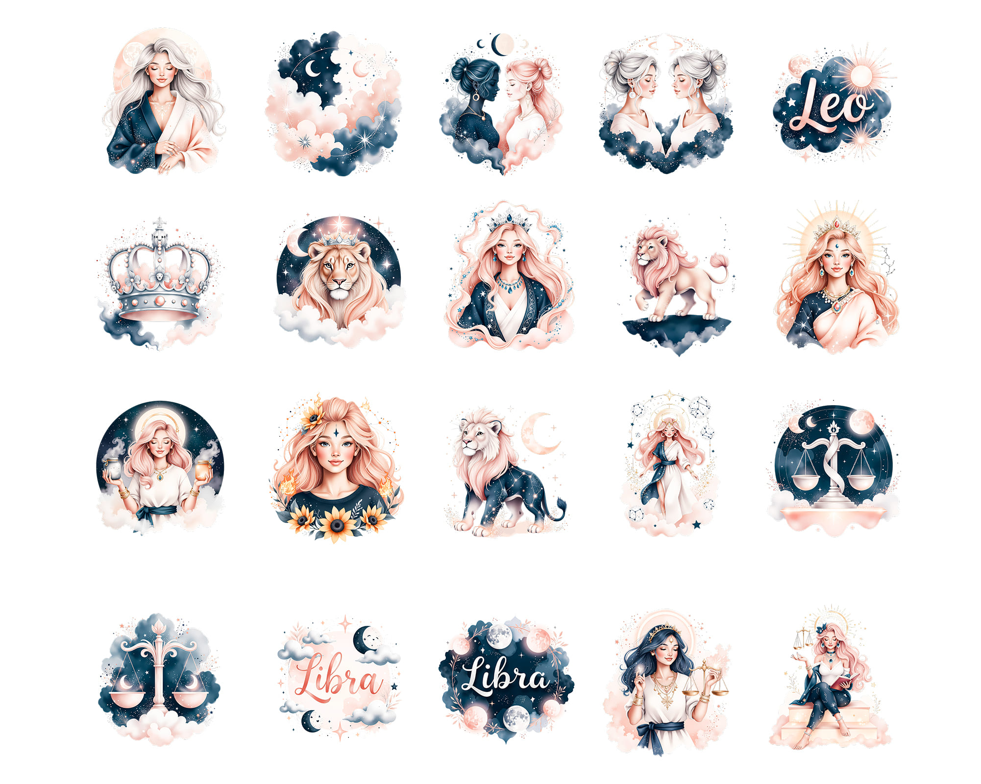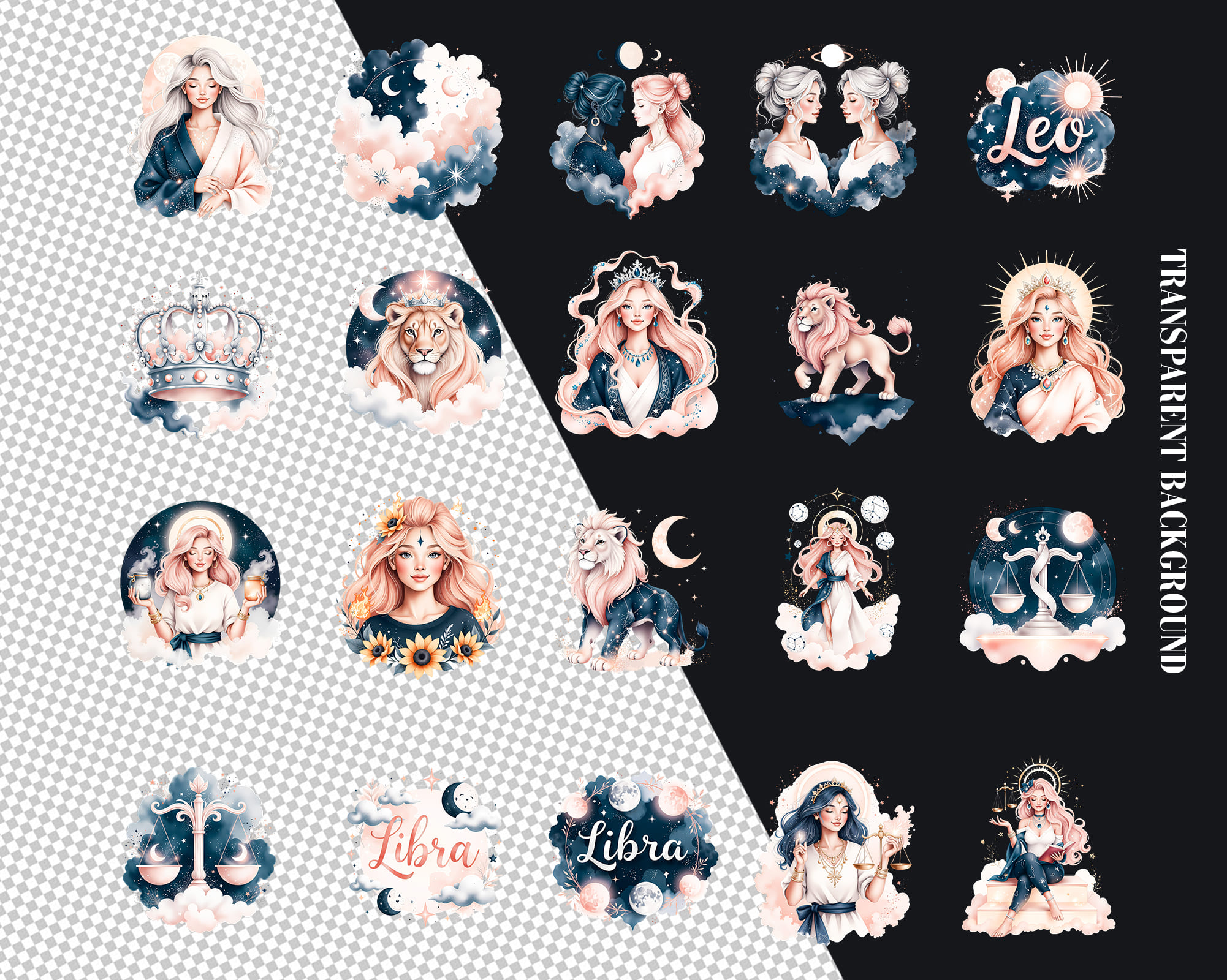 A luxurious Ethereal Zodiac clipart collection featuring 100 PNG illustrations of all horoscope signs in a dreamy celestial style. This set includes female and male zodiac characters, animals like lion, bull and fish, moons, crowns, crystals and constellation symbols in deep midnight tones with glowing accents. Perfect for astrology readings, tarot decks, planners, stickers, apps, posters and spiritual branding. All graphics are provided as high‑quality transparent PNG files.