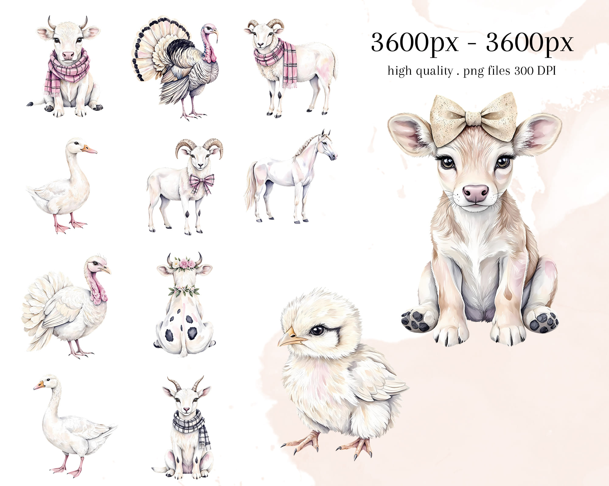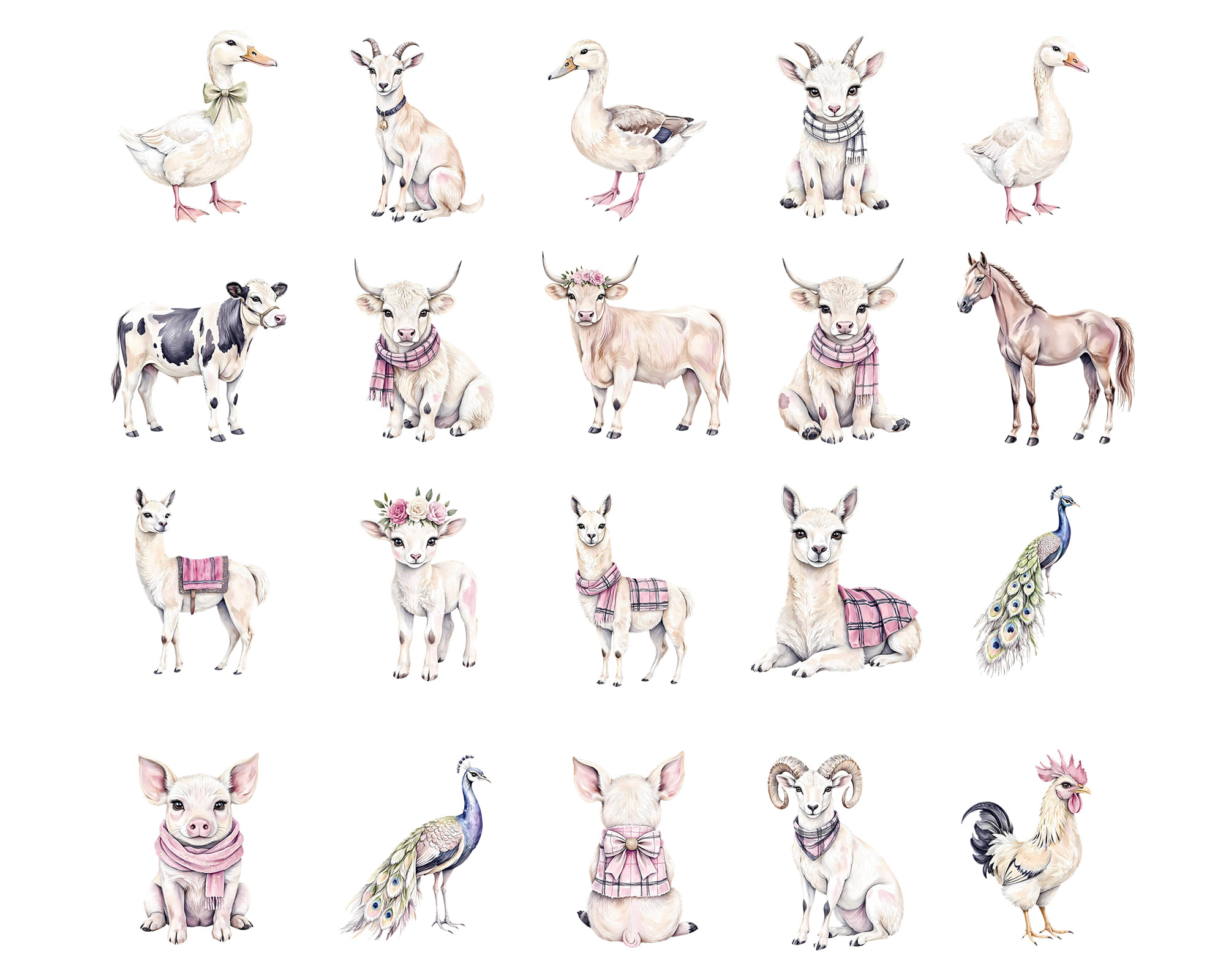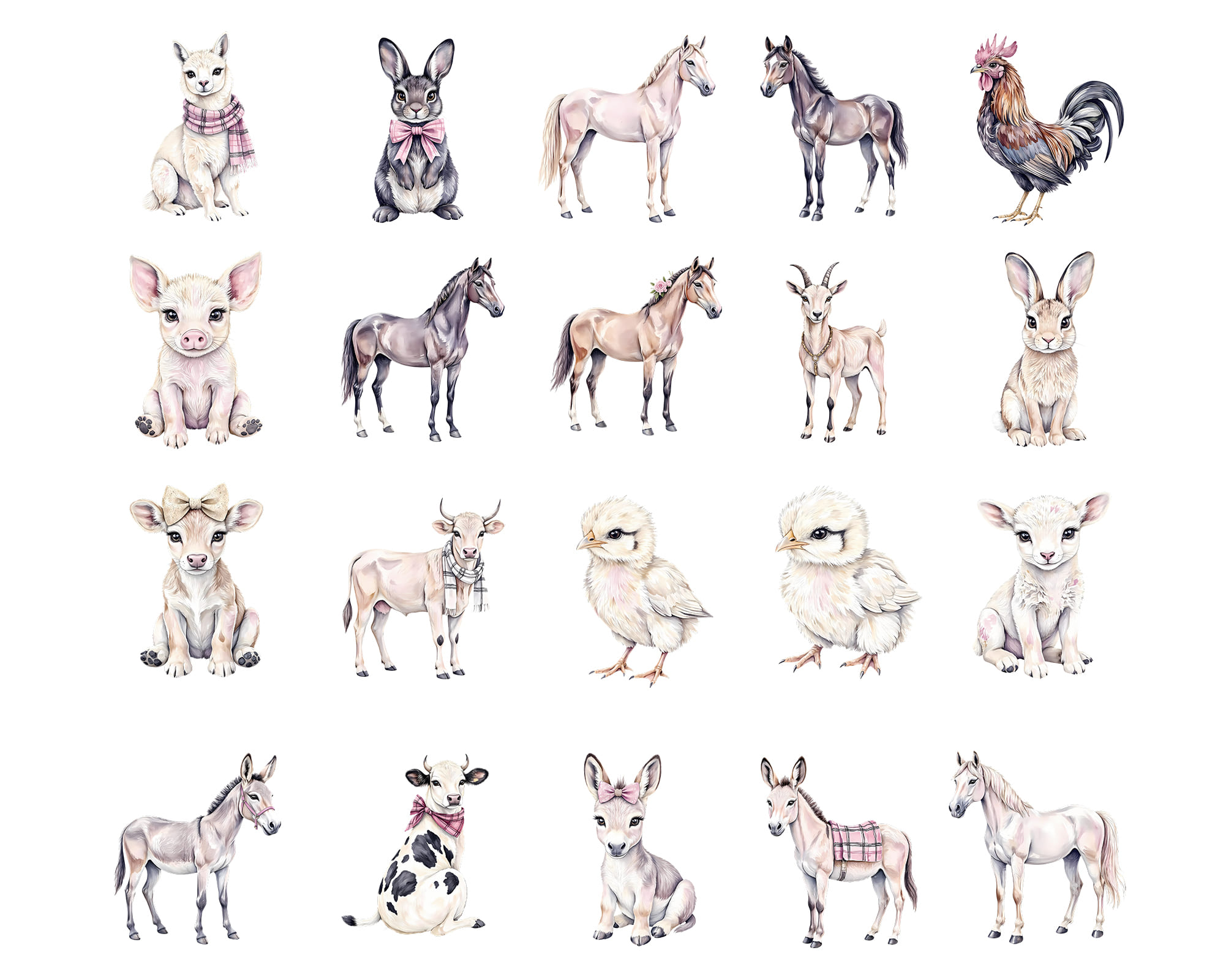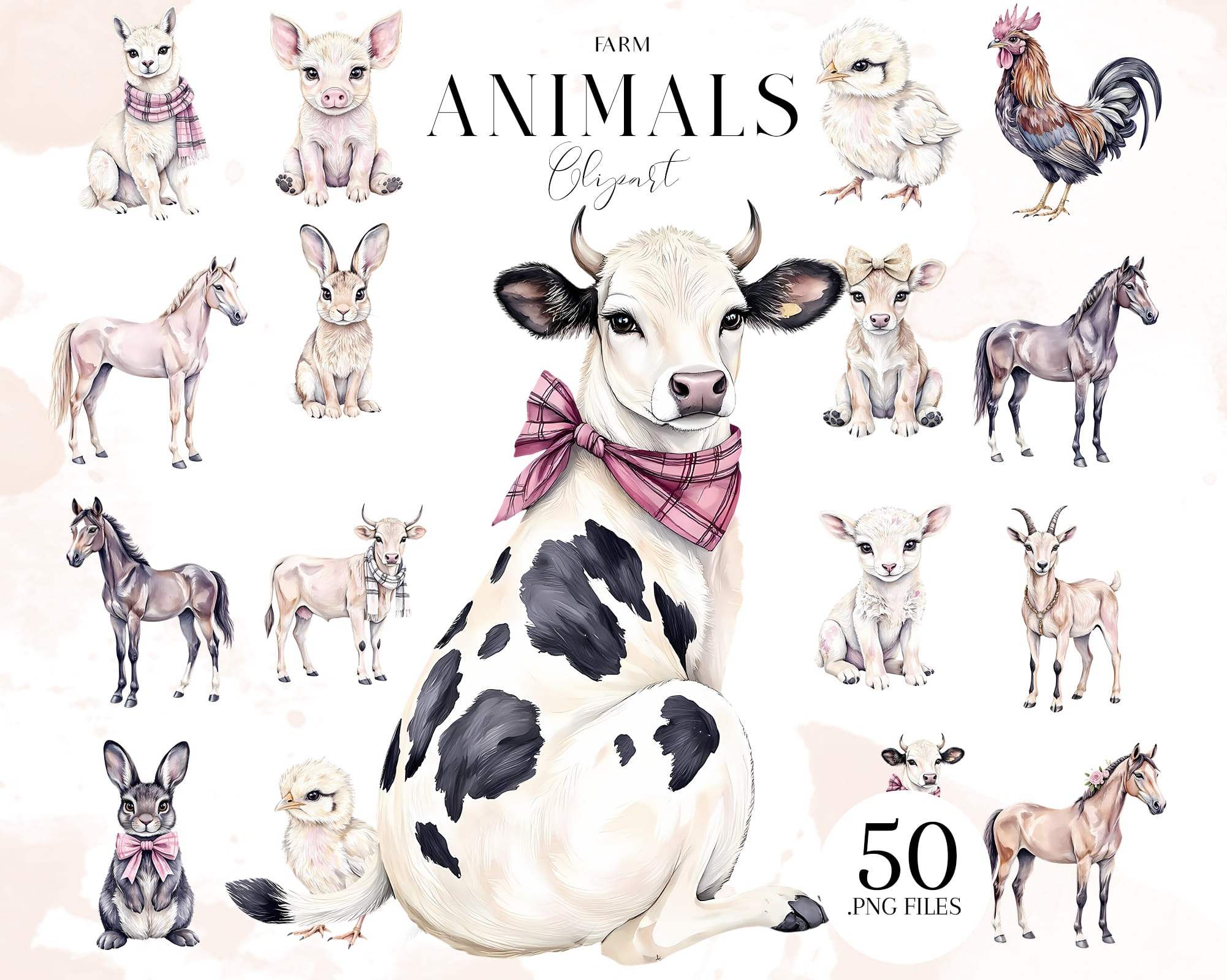 Adorable pastel Farm Animals clipart set featuring cows, pigs, horses, chickens, bunnies, goats, and lambs. Perfect for nursery prints, farm party decor, kids’ projects, scrapbooking, and educational crafts. Includes 50 PNG files with transparent backgrounds.