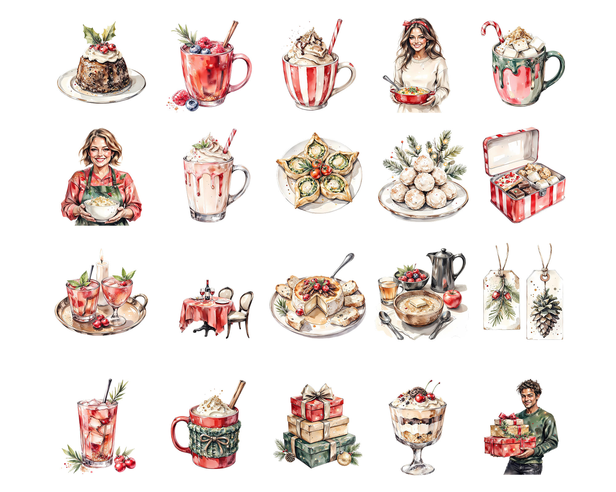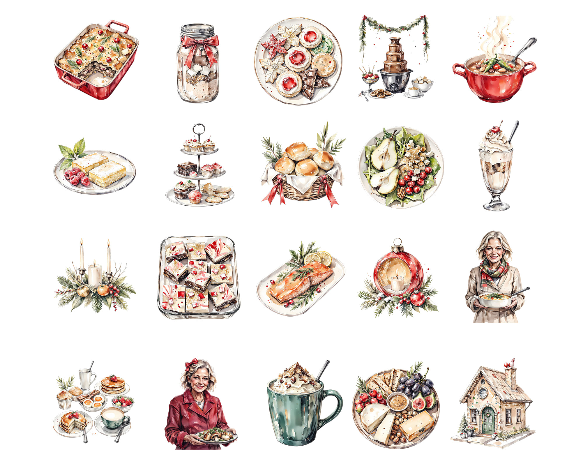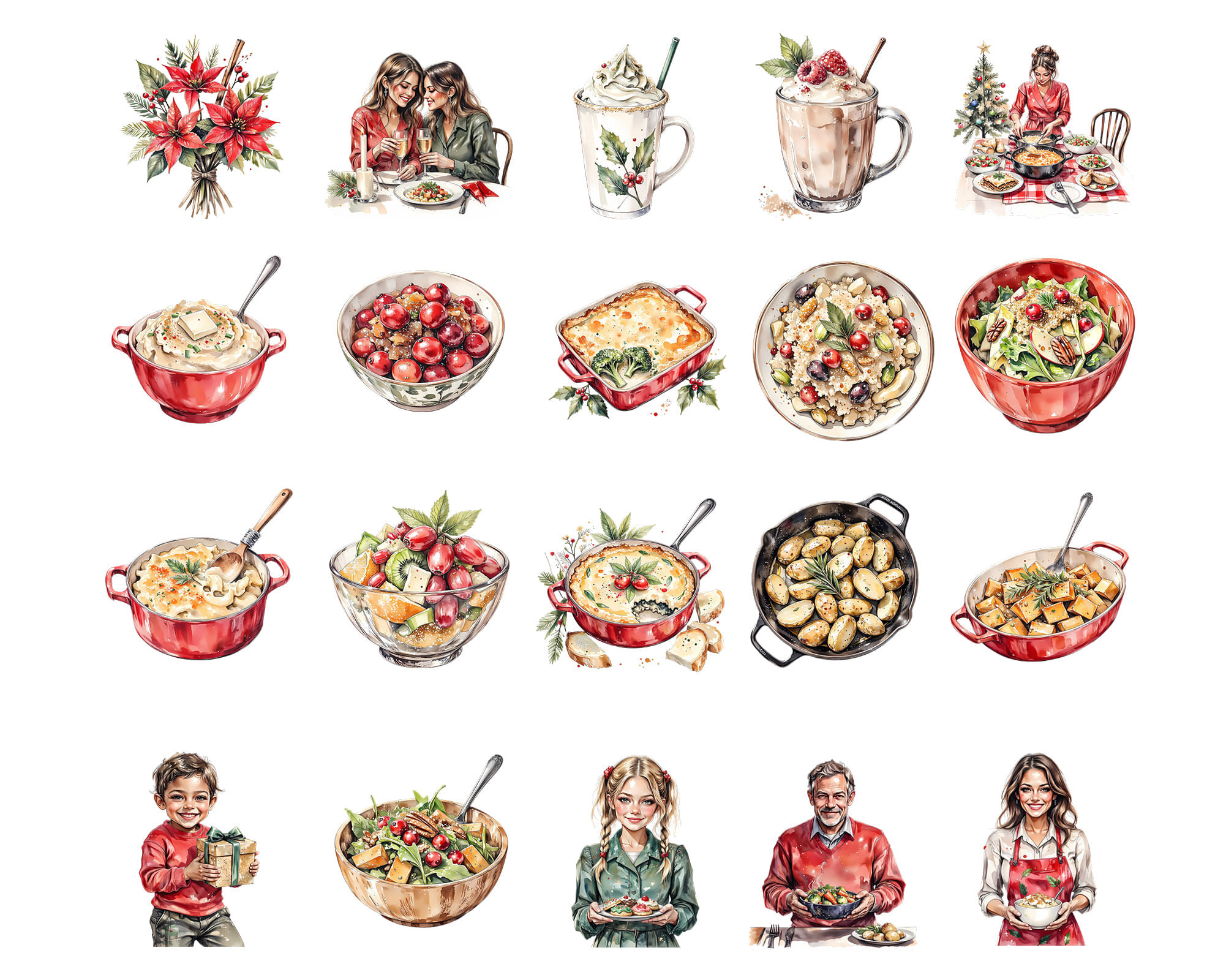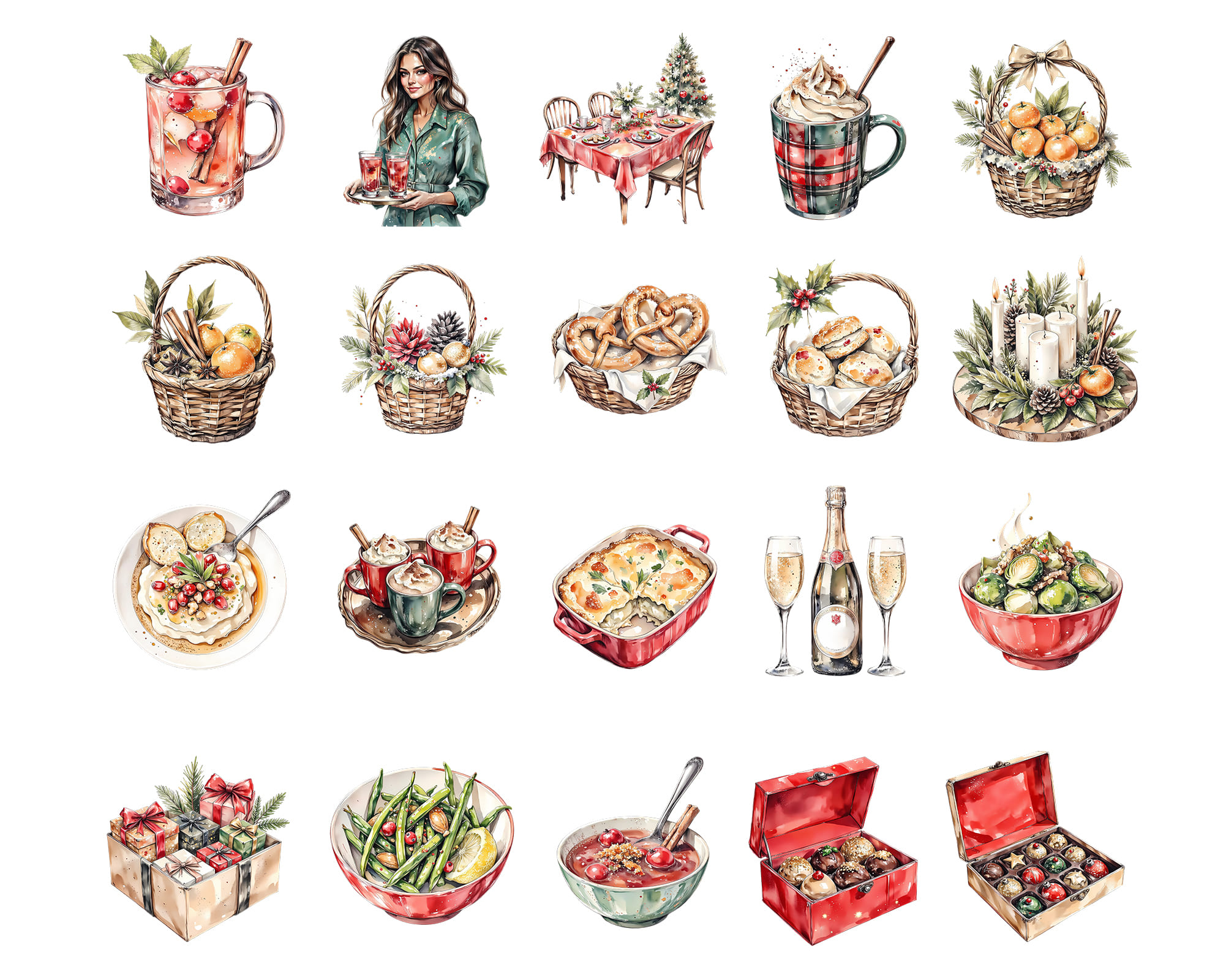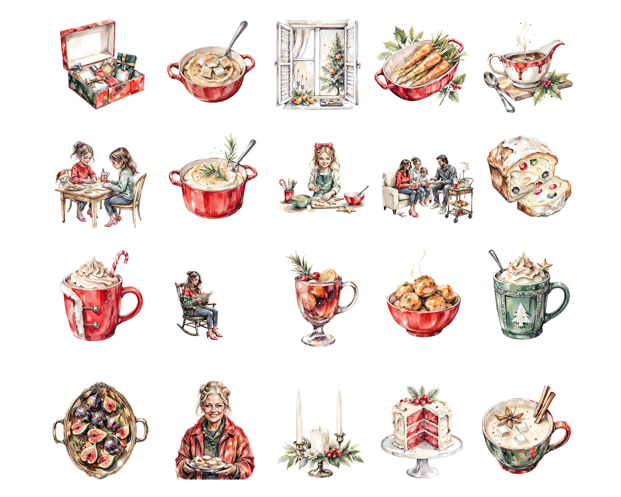 A charming Christmas Cooking clipart set with 100 cozy kitchen and holiday meal illustrations. Inside you’ll find festive characters, warm family moments, Christmas baking scenes, seasonal ingredients, desserts, drinks, and beautifully decorated kitchens. Perfect for recipe books, planners, scrapbooking, holiday cards, food blogs, and festive branding. All items are transparent PNG files.