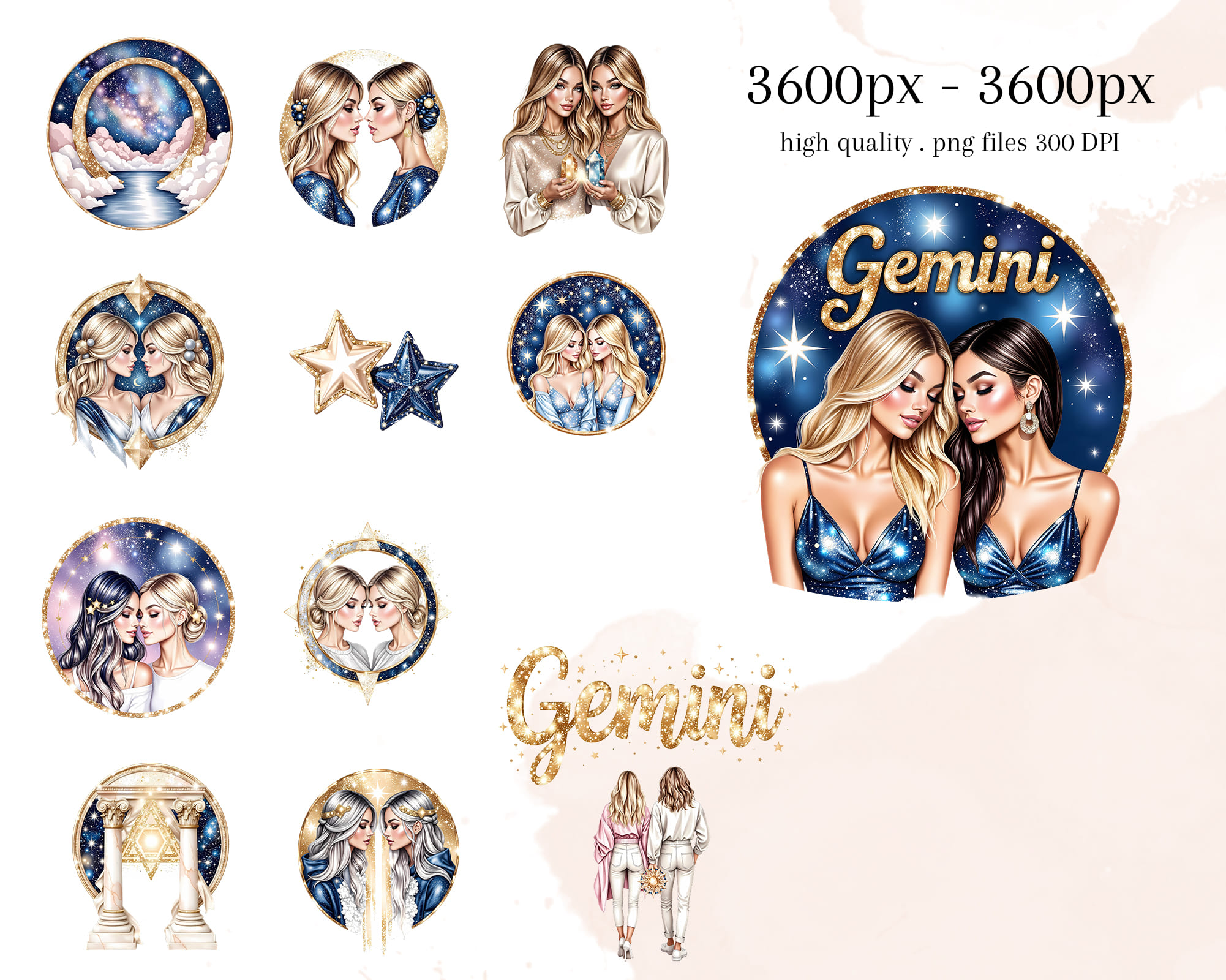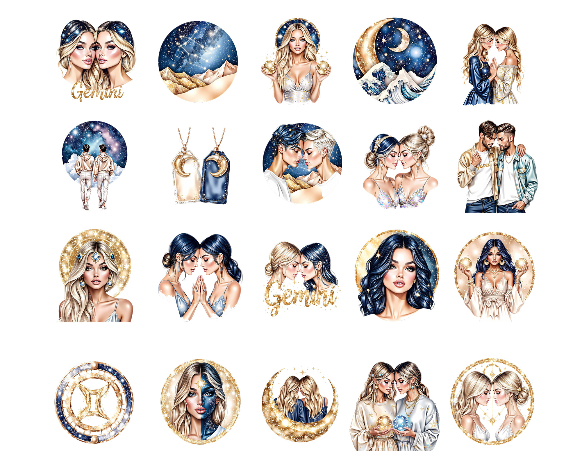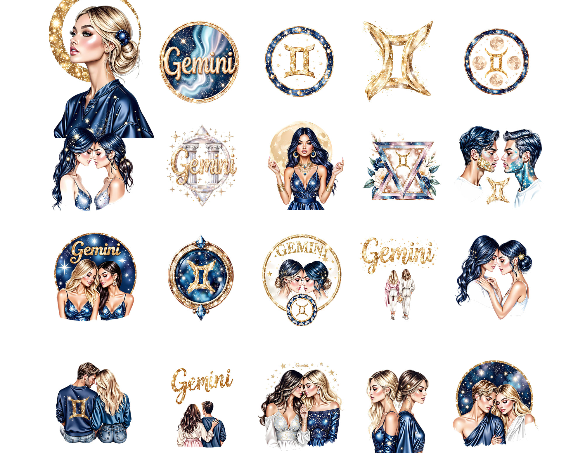 A luxurious 50-piece Gemini zodiac clipart set featuring celestial twins, cosmic backgrounds, gold glitter symbols, moon phases, starry elements, and elegant characters. Perfect for astrology journals, zodiac stickers, tarot projects, apparel, wall art, and spiritual branding.