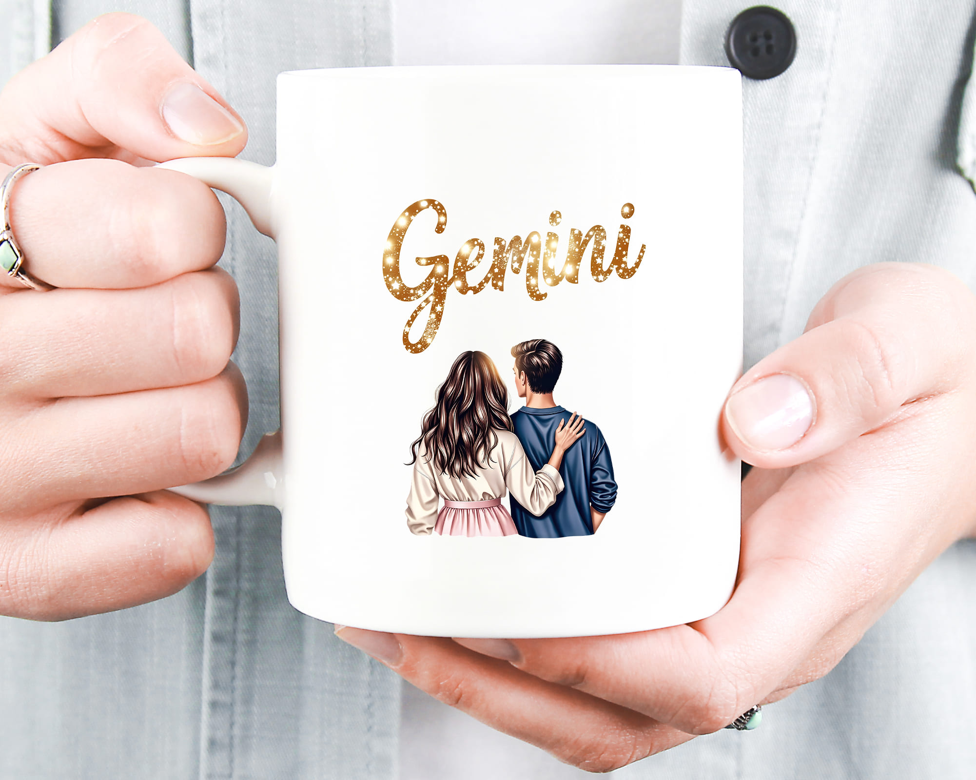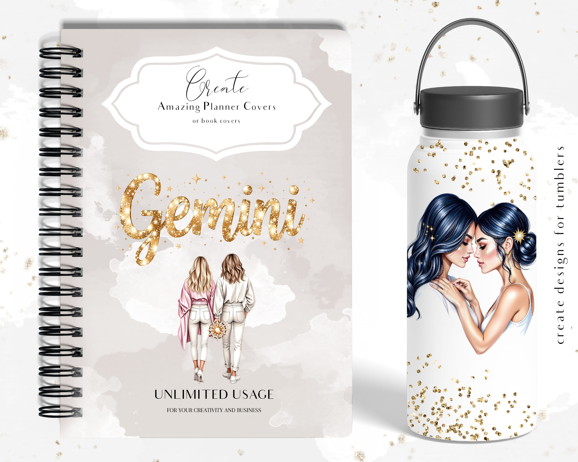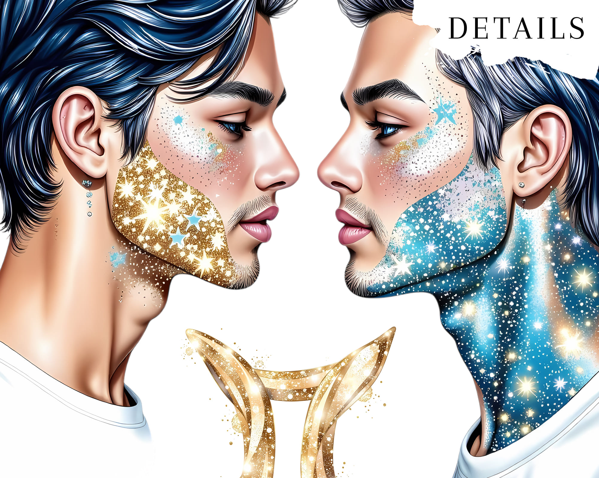 A luxurious 50-piece Gemini zodiac clipart set featuring celestial twins, cosmic backgrounds, gold glitter symbols, moon phases, starry elements, and elegant characters. Perfect for astrology journals, zodiac stickers, tarot projects, apparel, wall art, and spiritual branding.