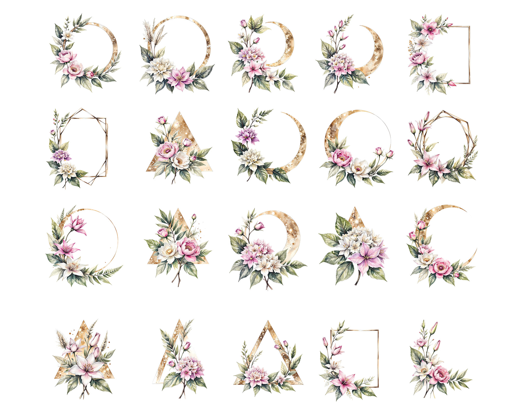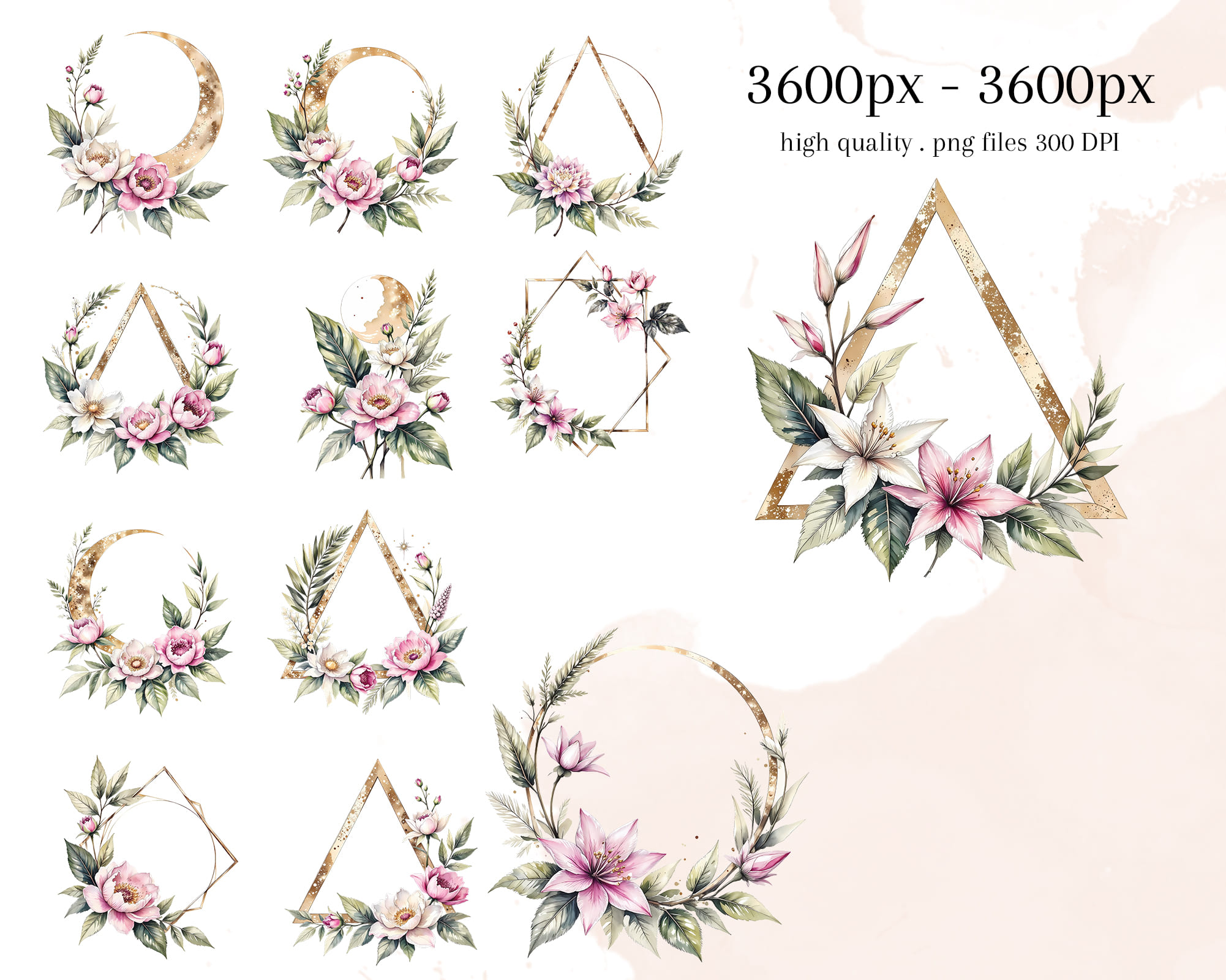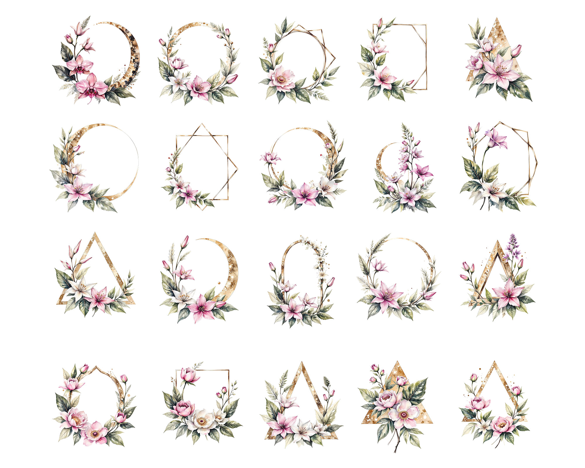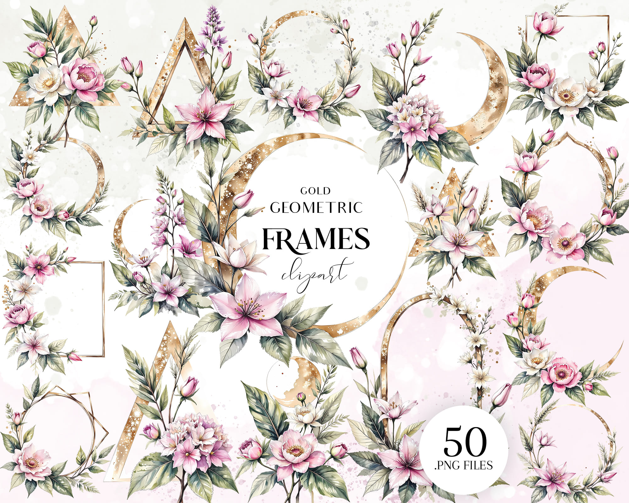 A luxurious set of 50 PNG geometric frames decorated with soft pink florals, gold accents, and botanical details. Ideal for elegant wedding suites, branding, sublimation projects, stationery, and printable decor.
