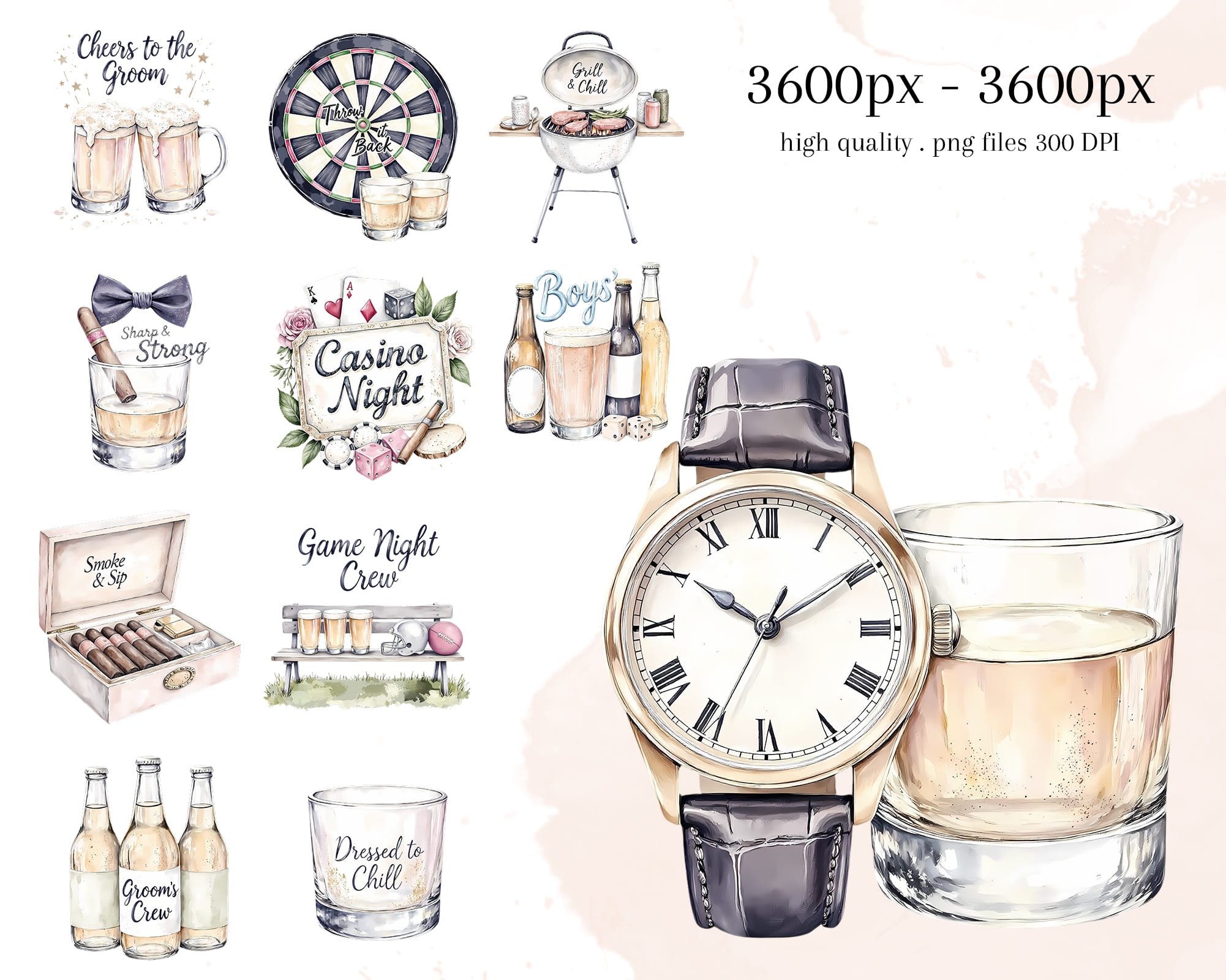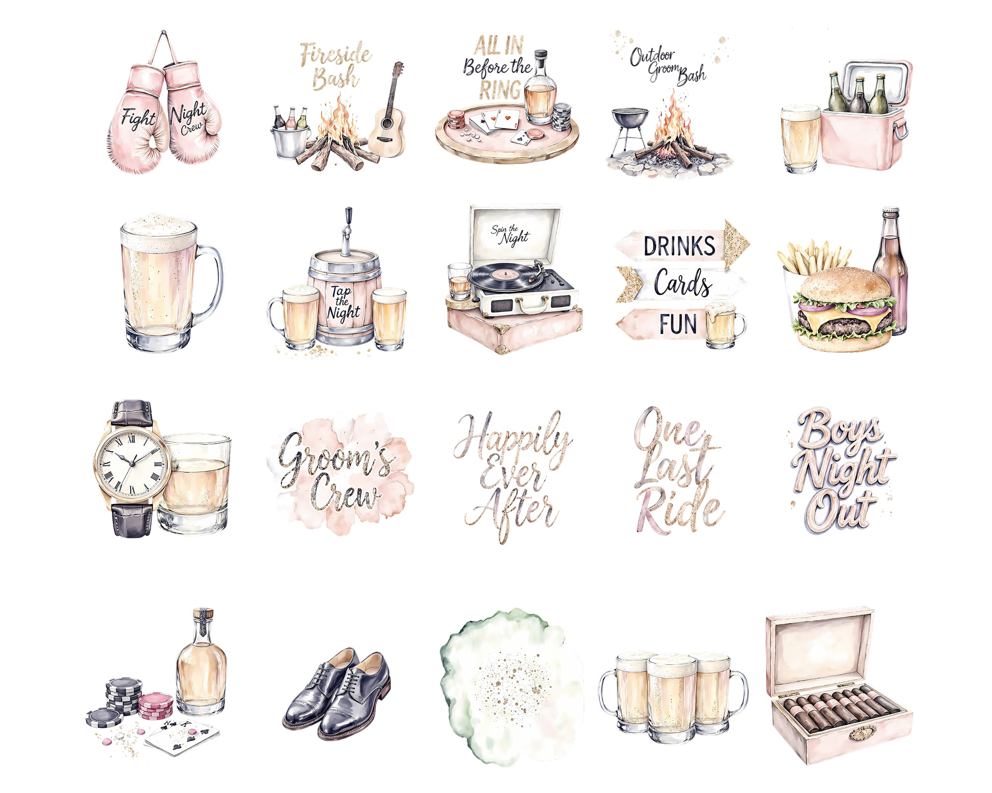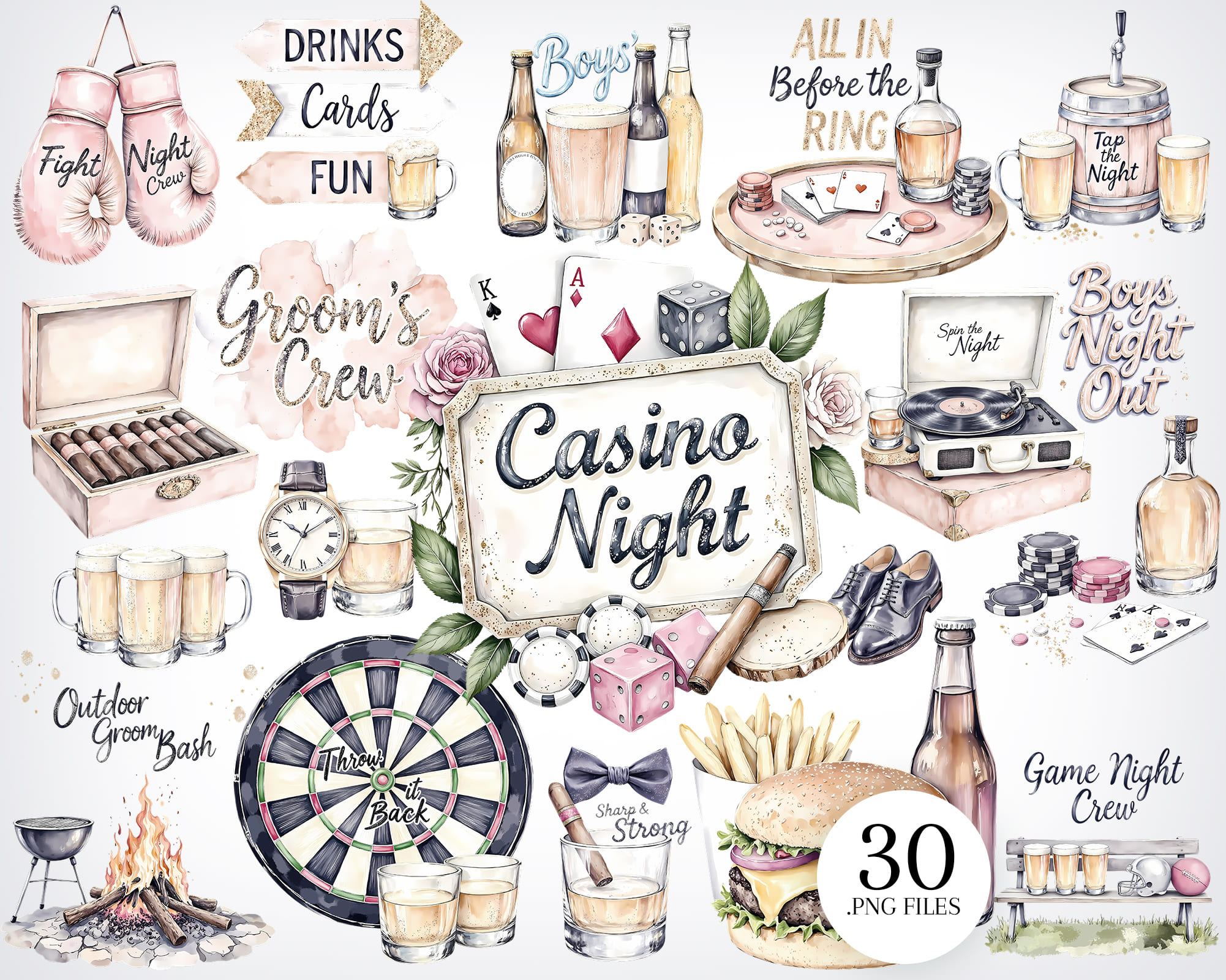 Celebrate in style with this fun groom’s bash clipart set! Includes casino cards, dice, poker chips, cigars, drinks, BBQ, boxing gloves, firepit, and party quotes. Perfect for bachelor party invitations, casino night decor, scrapbooking, and DIY crafts. Includes 30 PNG files with transparent background.