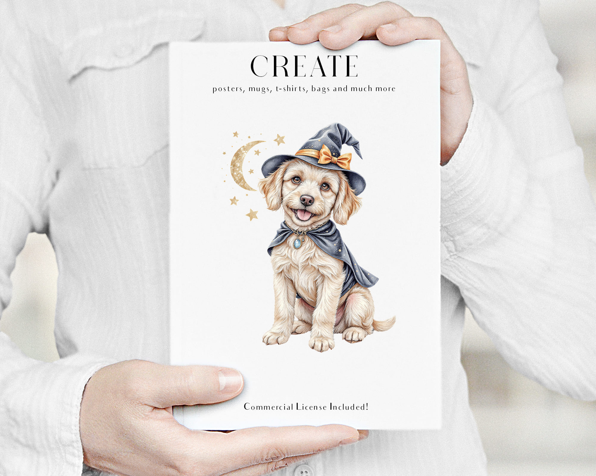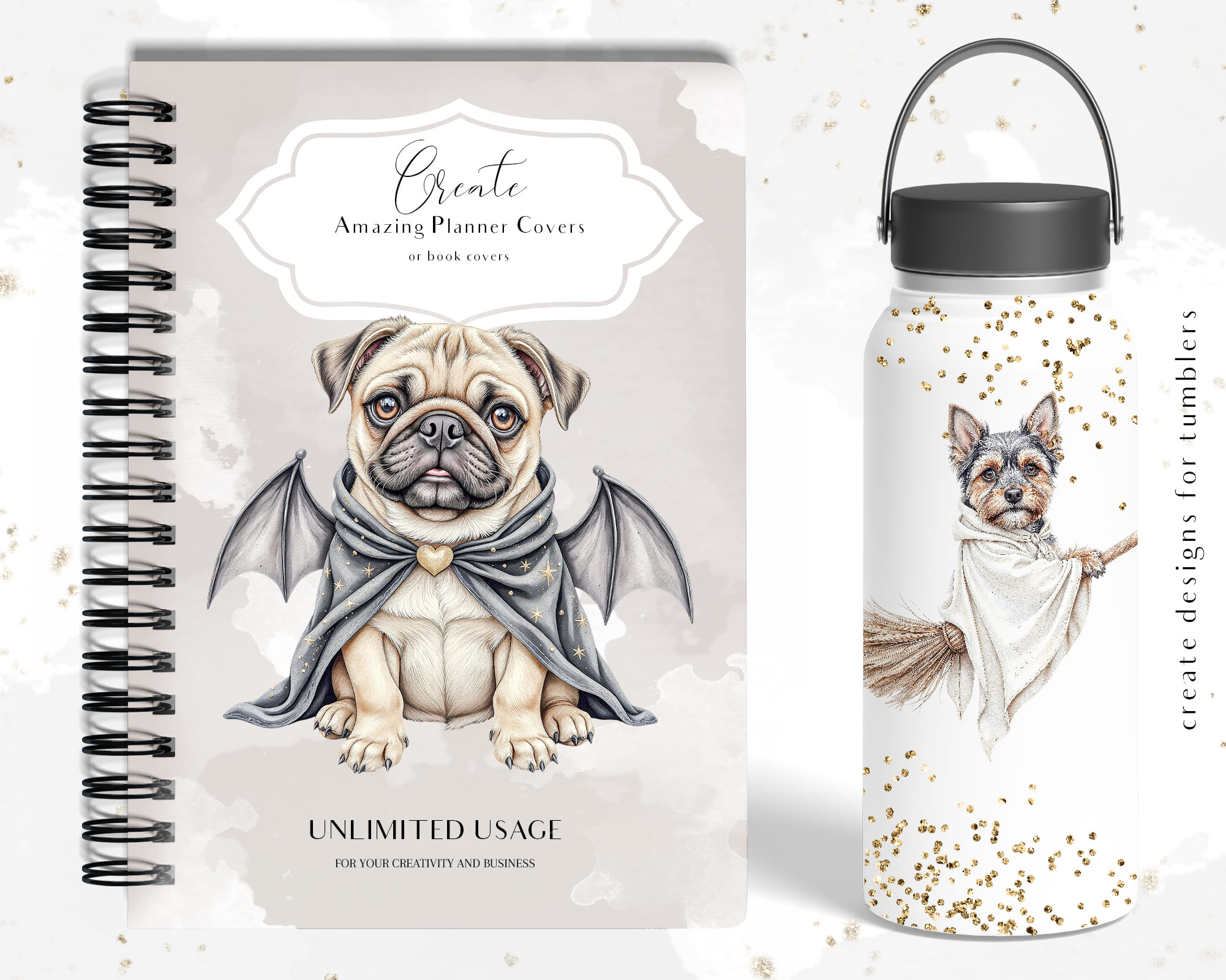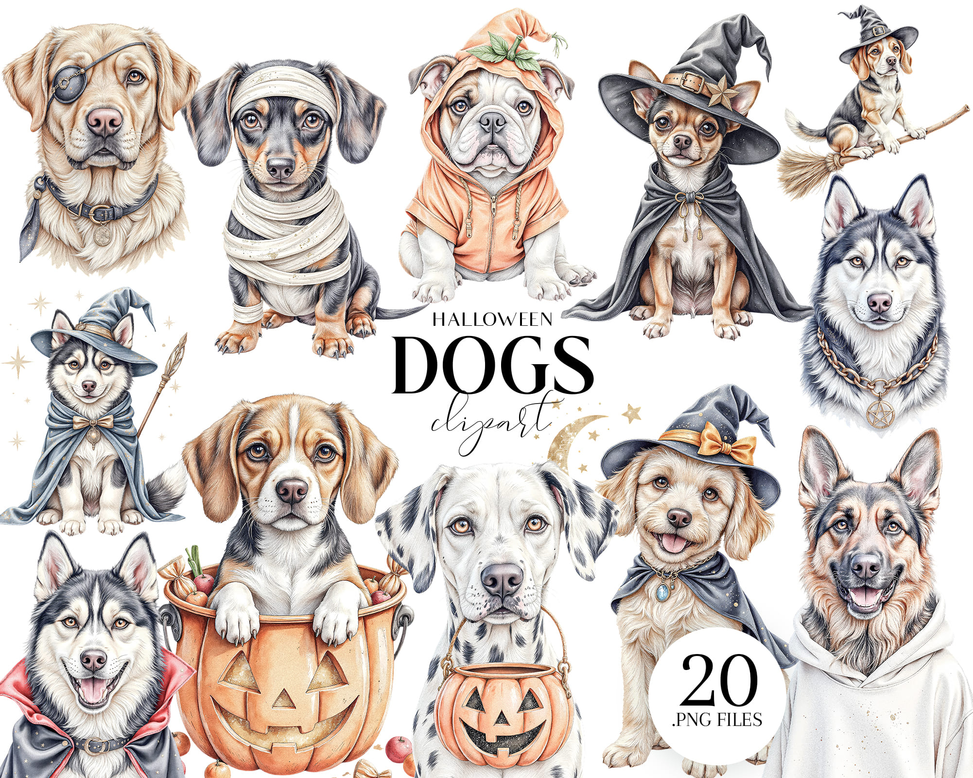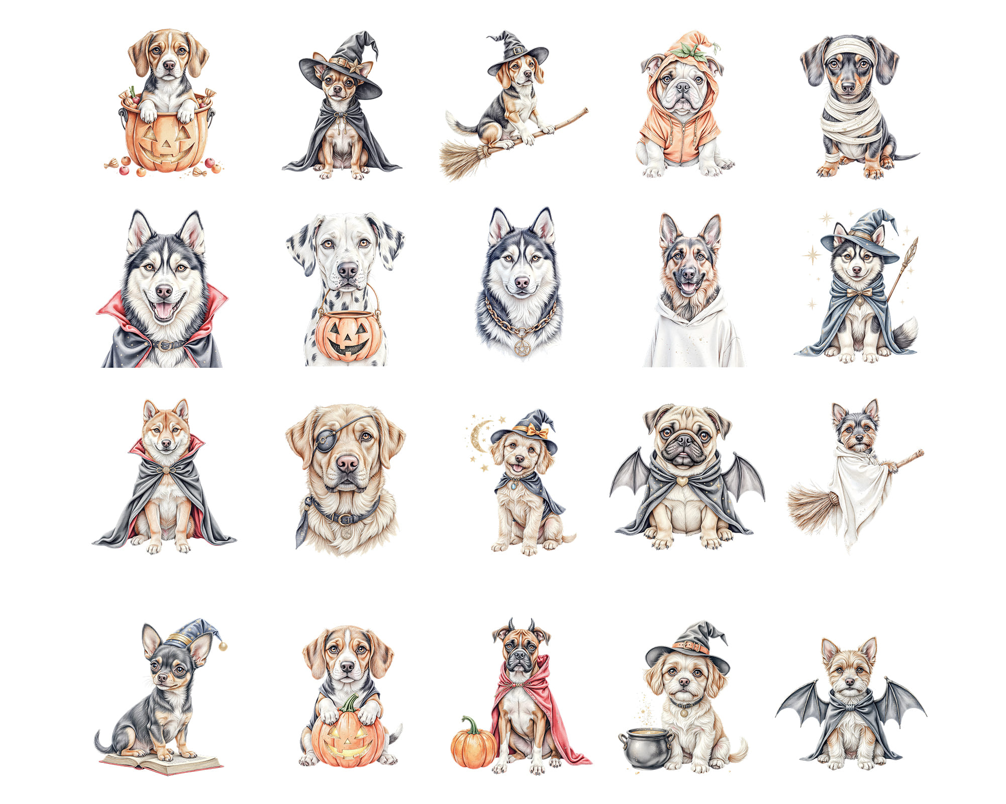 Halloween Dogs Clipart is a fun set of 20 PNG illustrations of dogs in Halloween costumes. High-resolution, transparent background, 300 DPI.