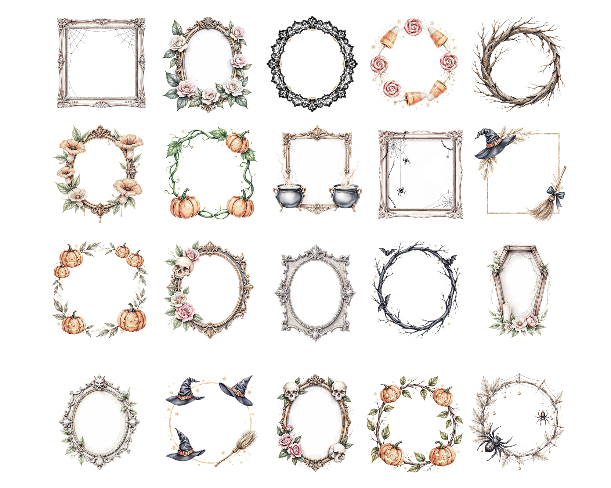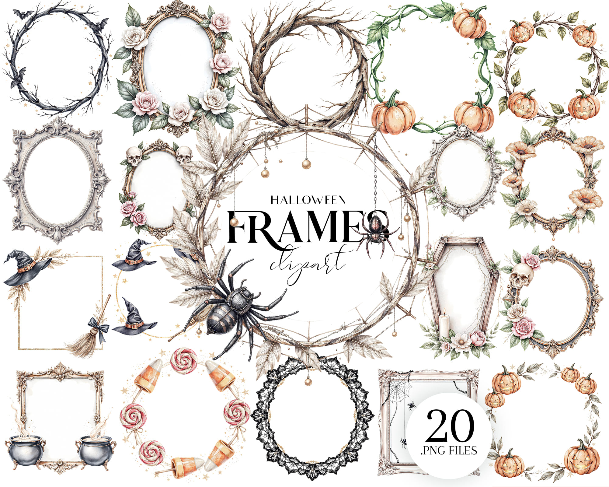 Halloween Frames Clipart includes 20 spooky frames decorated with spiders, pumpkins, webs, and gothic elements. All PNG files come with transparent background and 300 DPI quality.