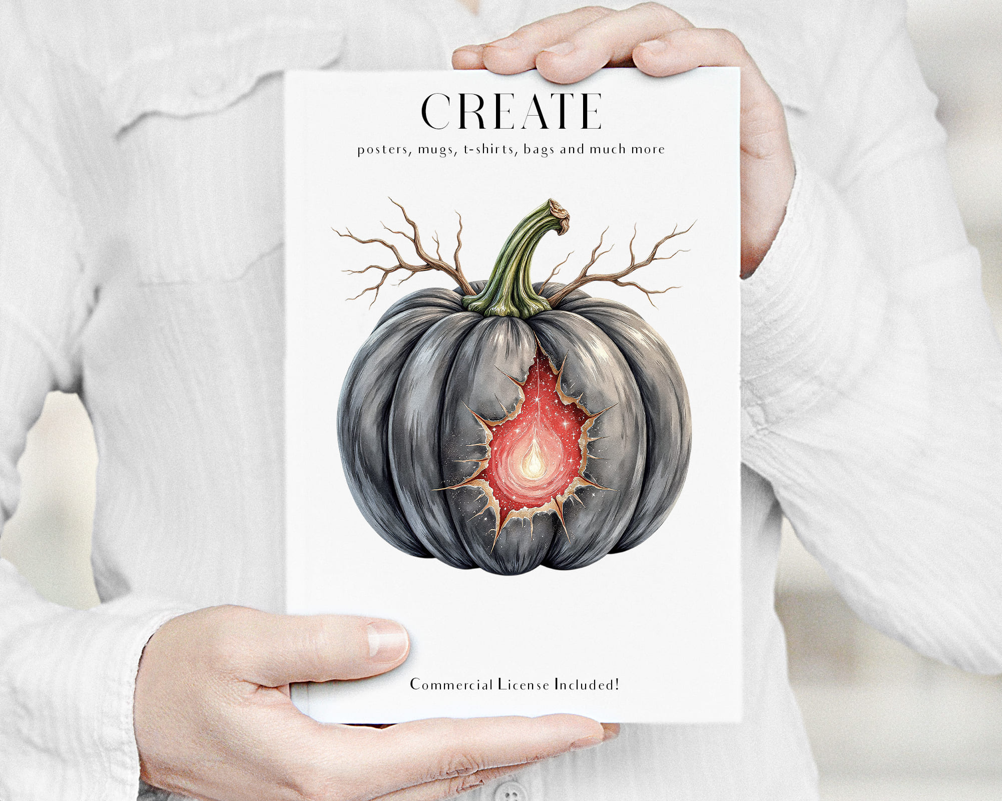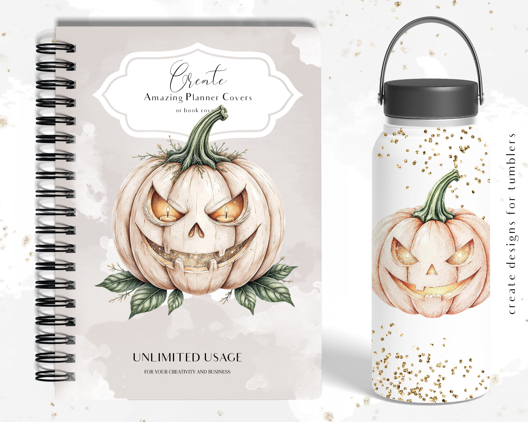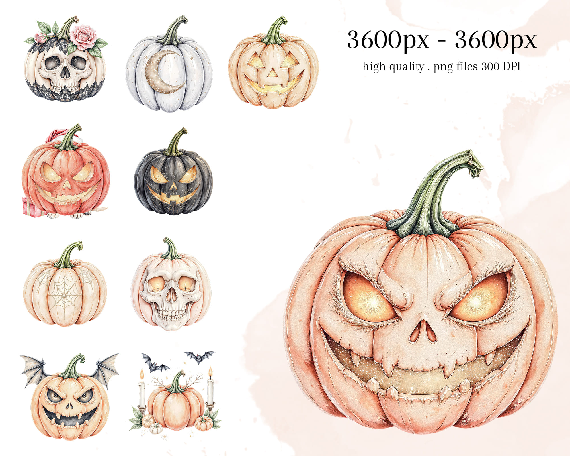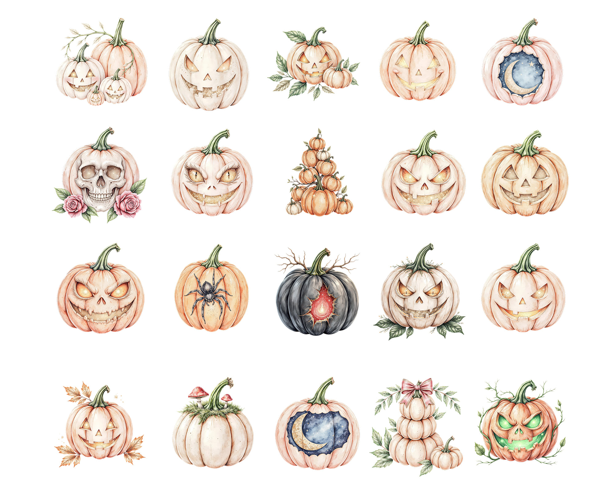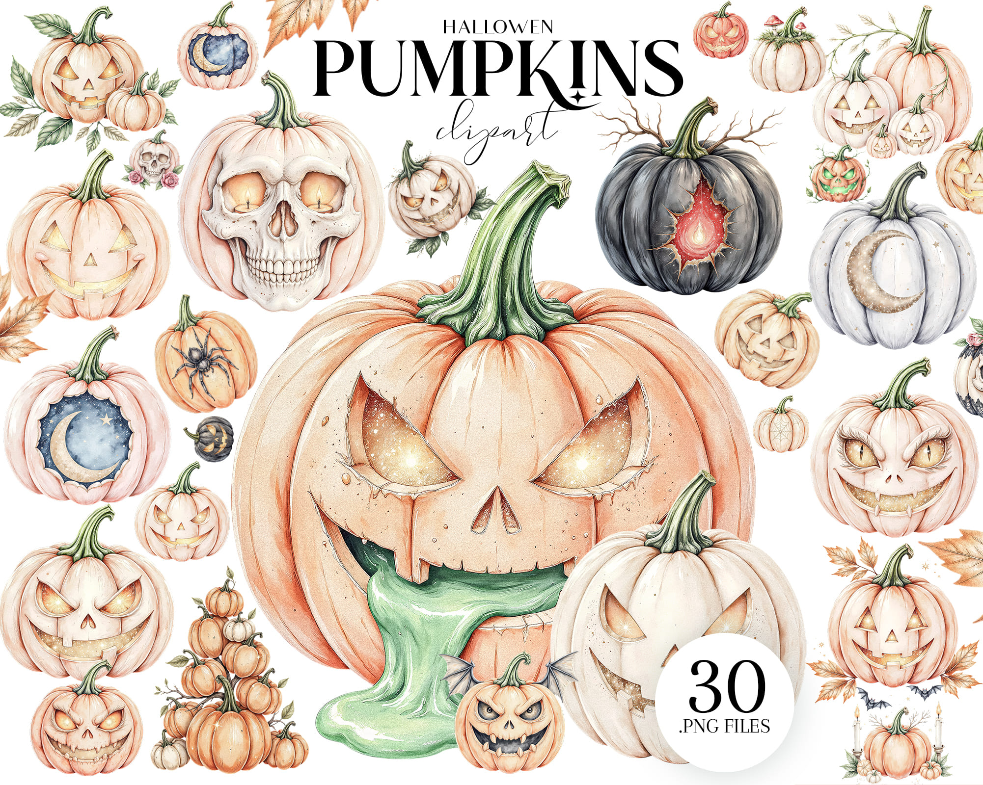 Halloween Pumpkins Clipart includes 30 spooky and fun pumpkin illustrations in PNG format. Transparent background and high resolution (300 DPI) make them perfect for print and digital projects.