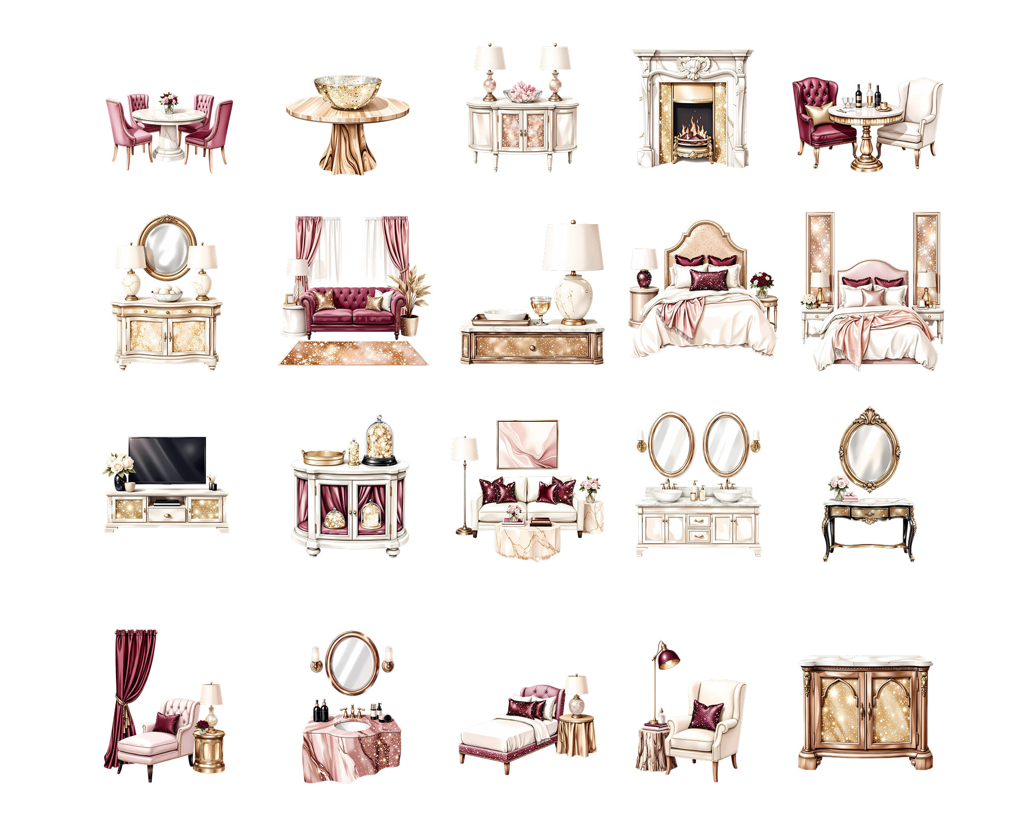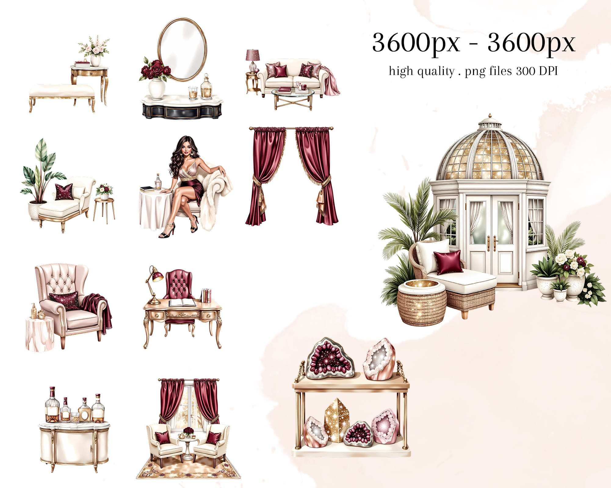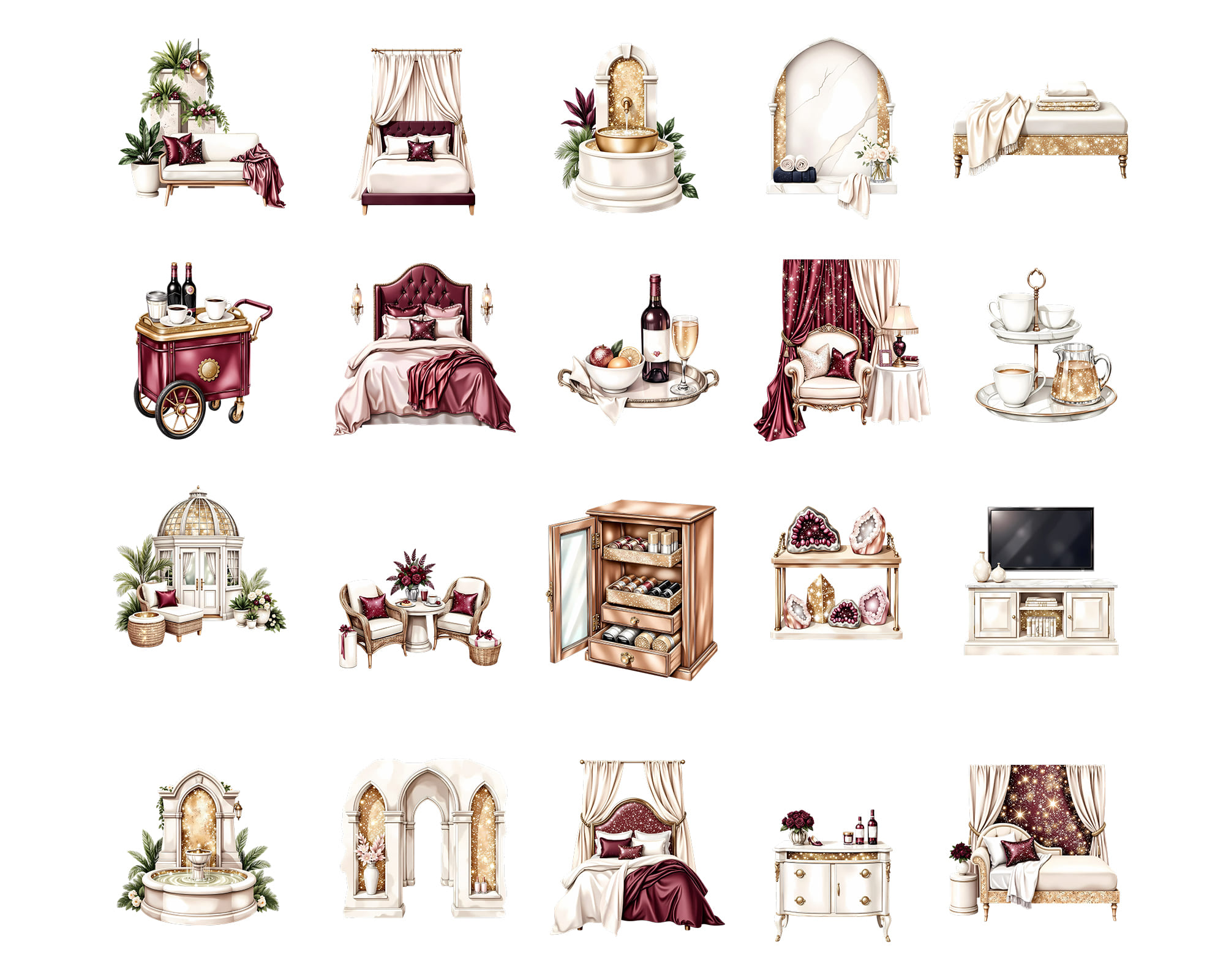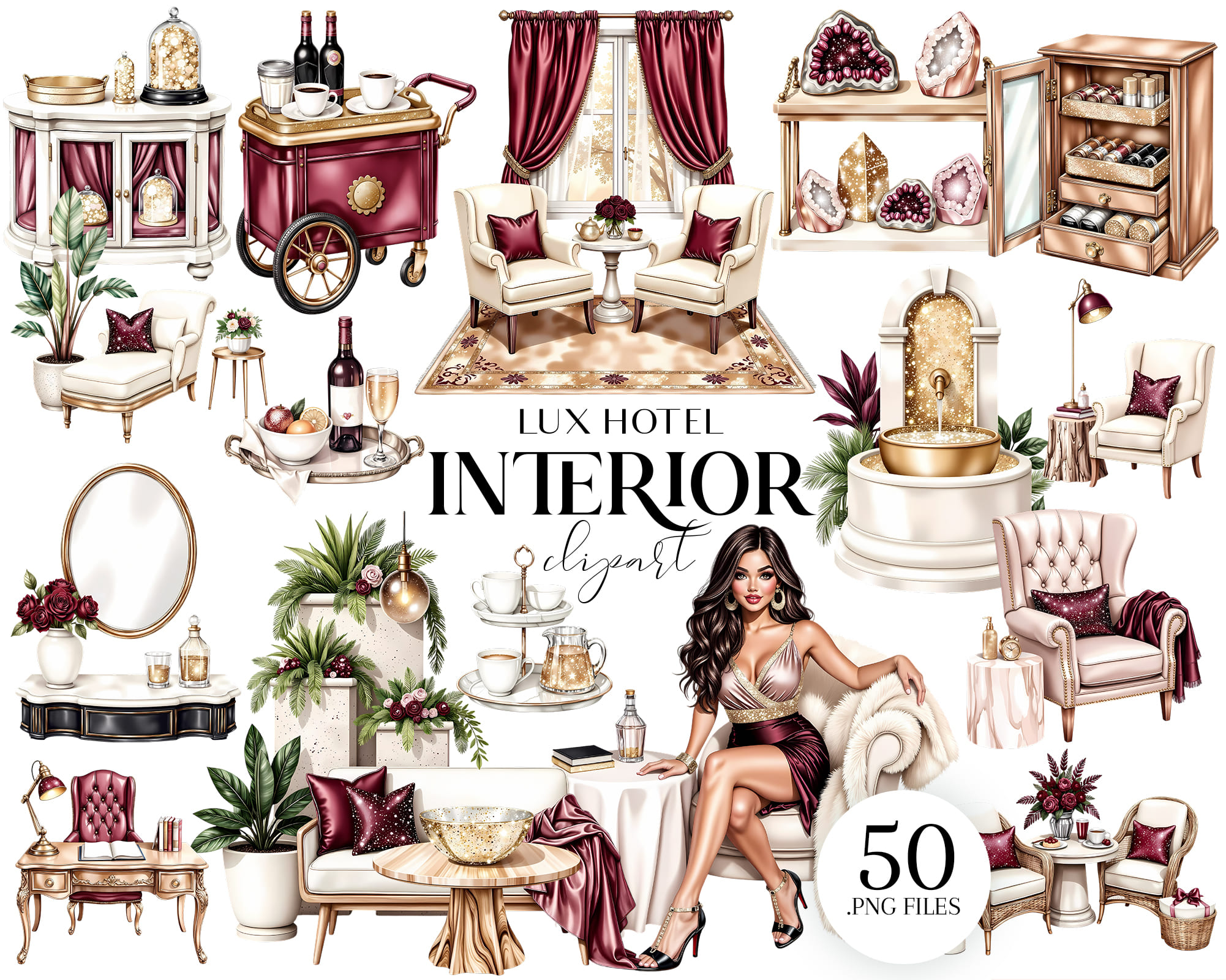 Create cozy, luxurious scenes with this Luxury Burgundy Hotel Interior Clipart collection ✨. Perfect for planners, journals, prints, and branding projects. Includes 50 PNG files with transparent backgrounds.